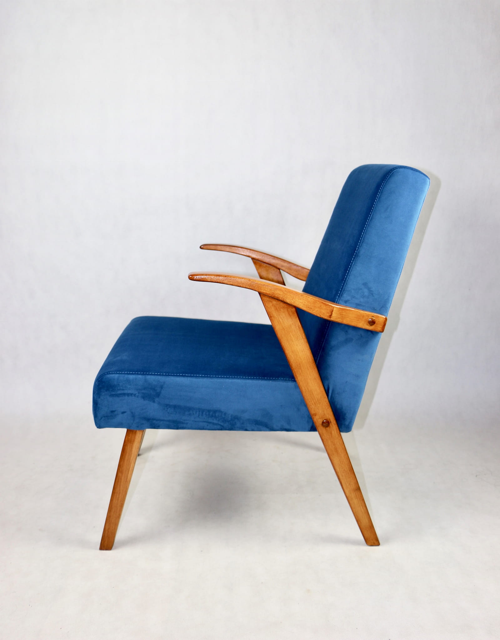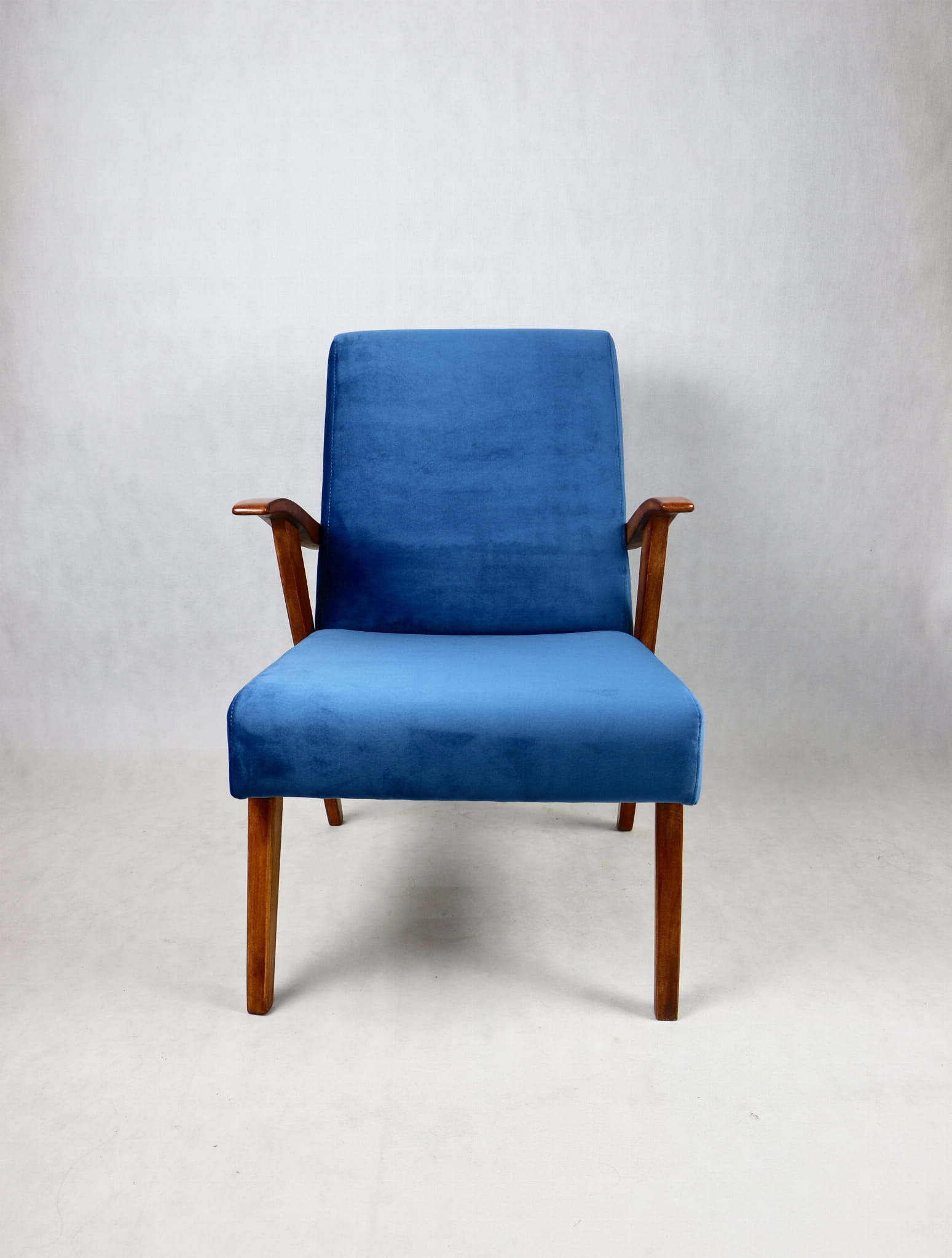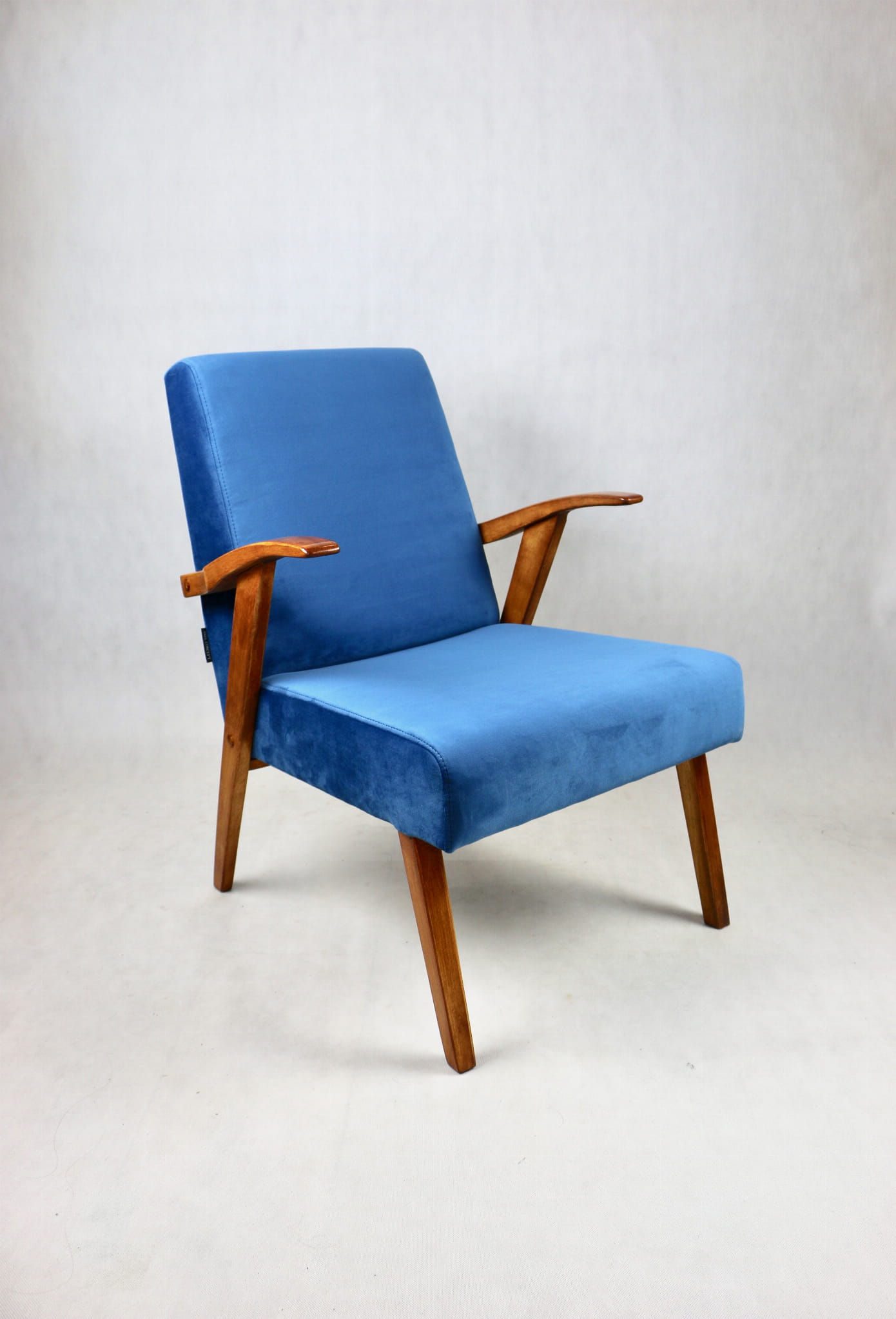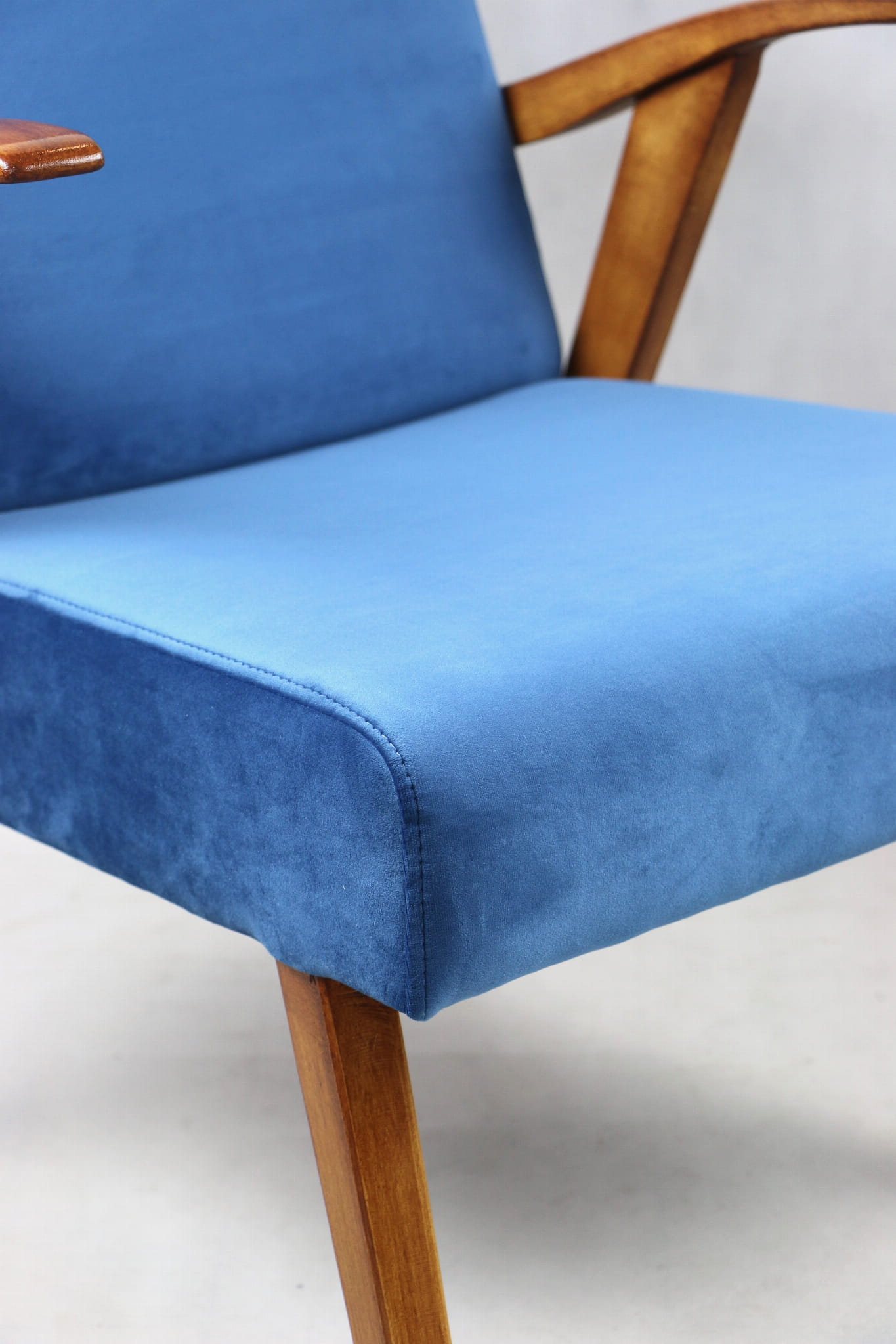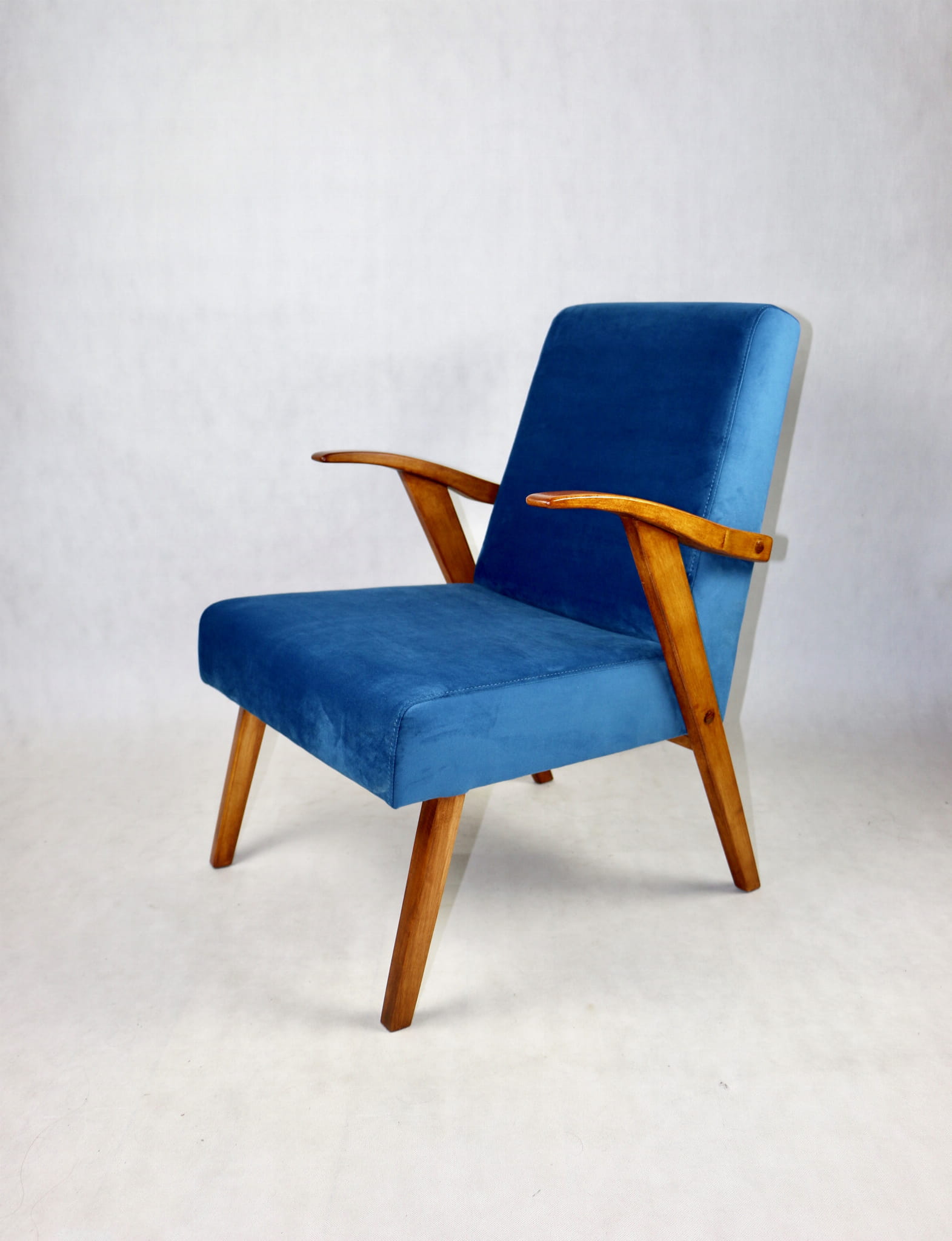 Fotel projektu jak M. Puchały kompletnie odrestaurowany. Nowe obicie pokryte najwyższej jakości materiałem tapicerskim w kolorze błękitnym morskim - z serii Paris. Siedzisko na pasach, stelaż drewniany połączony z podłokietnikami w kolorze naturalnego drewna.