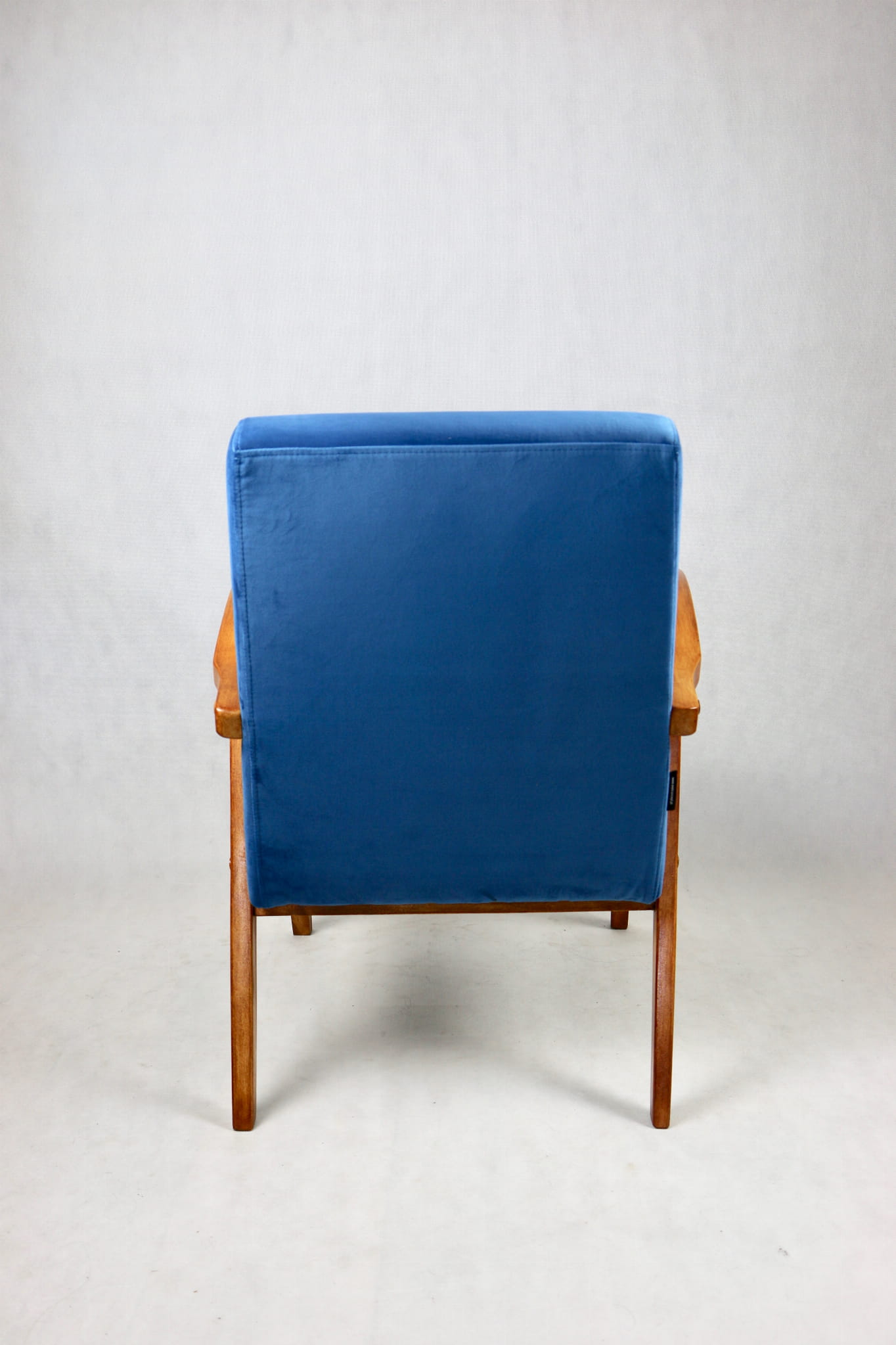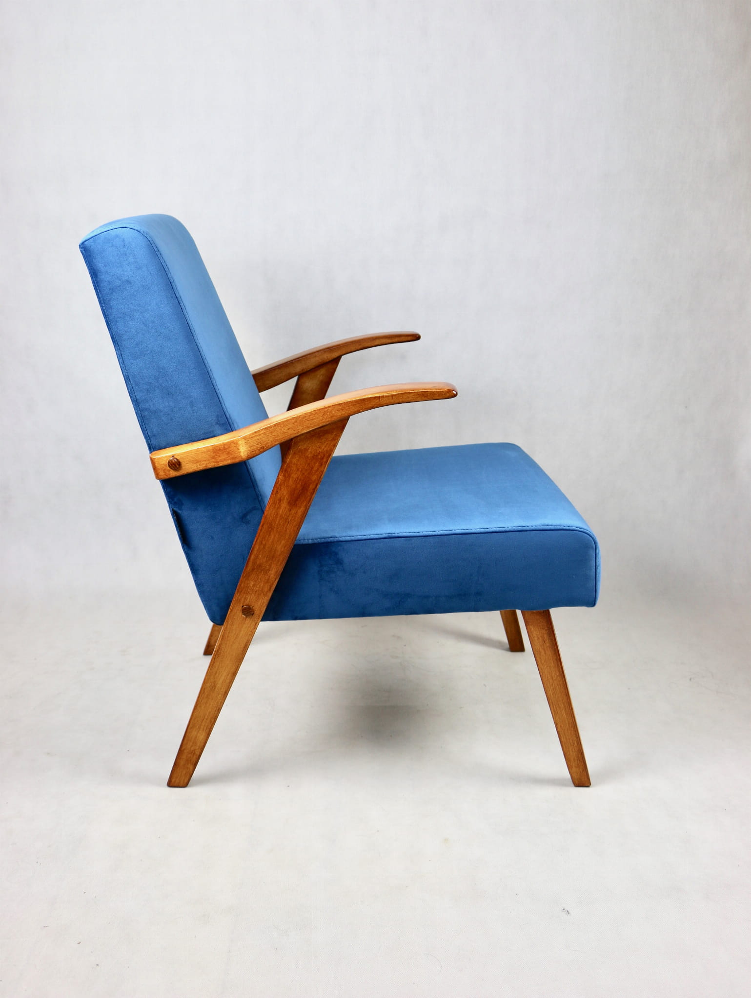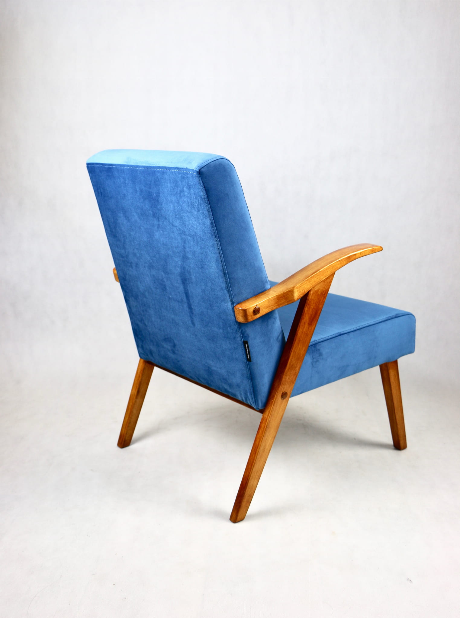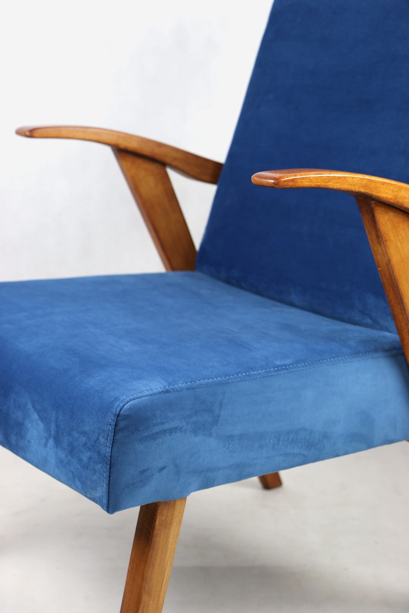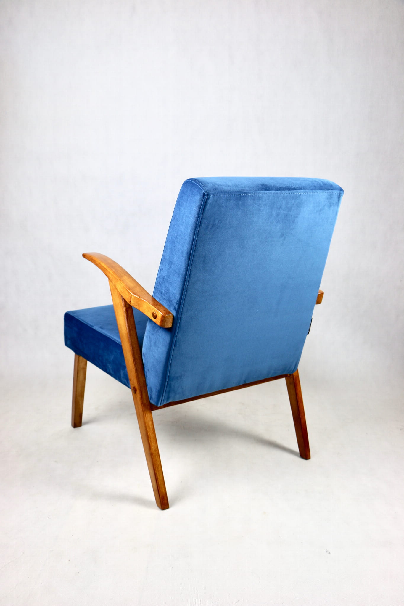 Fotel projektu jak M. Puchały kompletnie odrestaurowany. Nowe obicie pokryte najwyższej jakości materiałem tapicerskim w kolorze błękitnym morskim - z serii Paris. Siedzisko na pasach, stelaż drewniany połączony z podłokietnikami w kolorze naturalnego drewna.