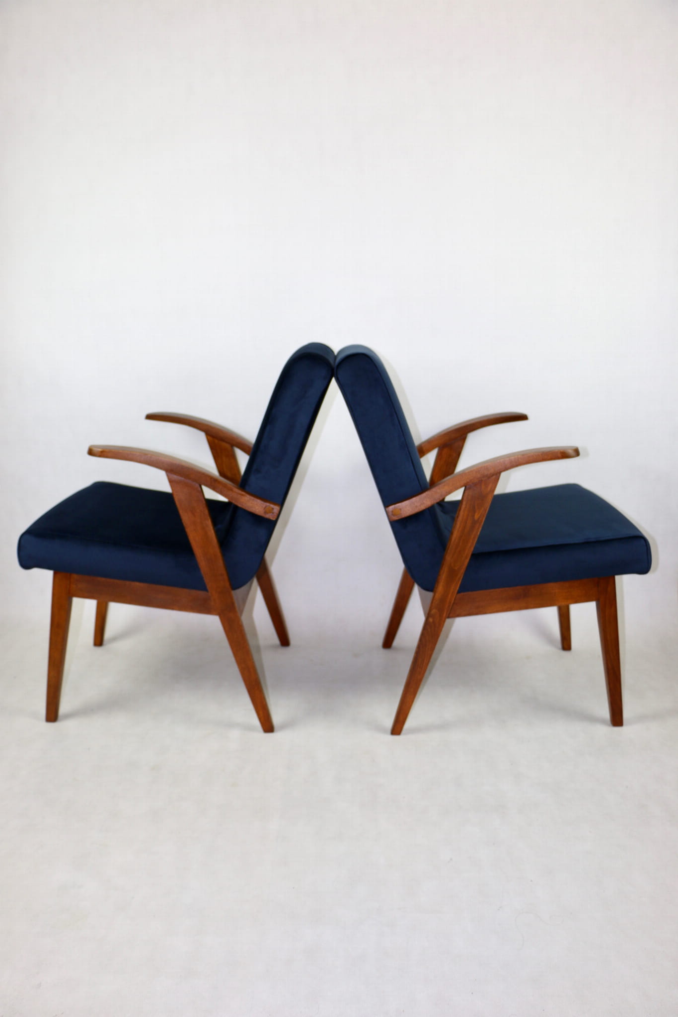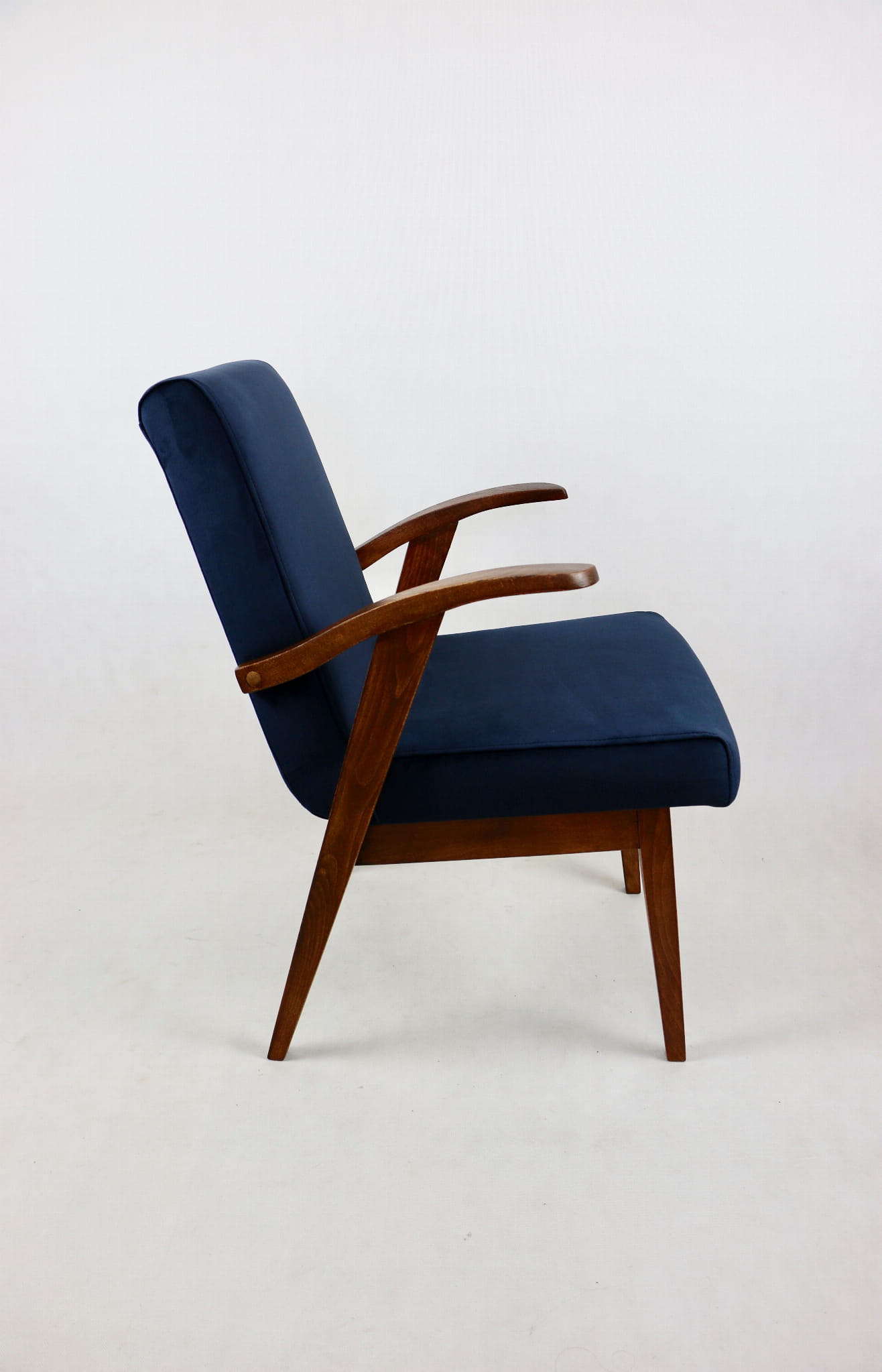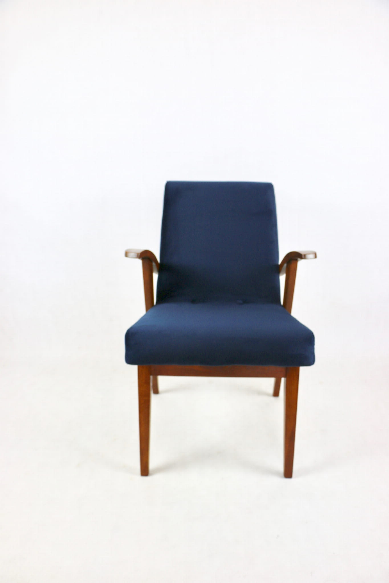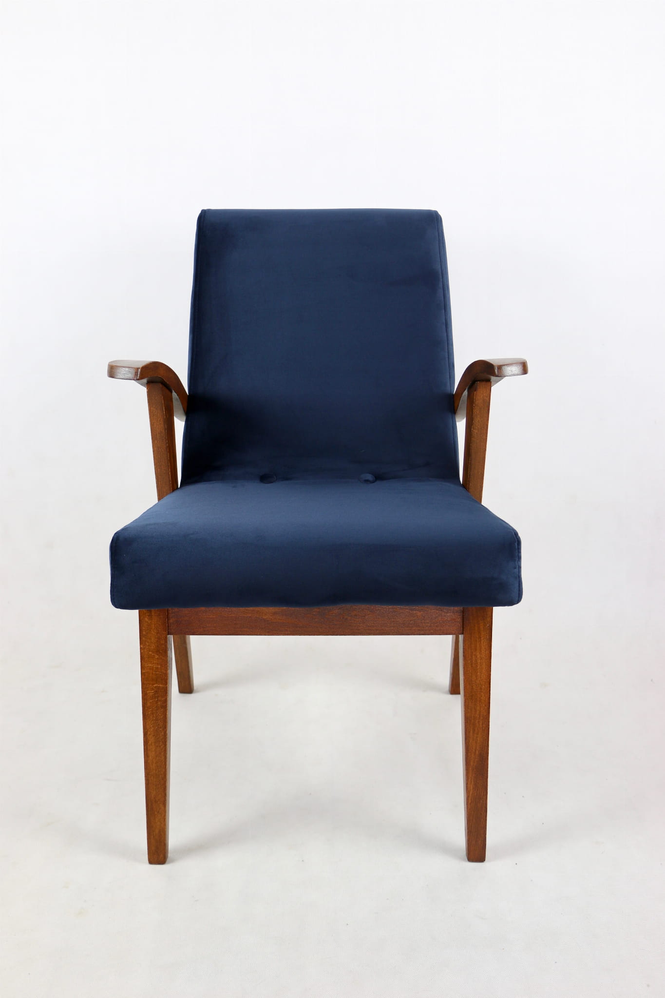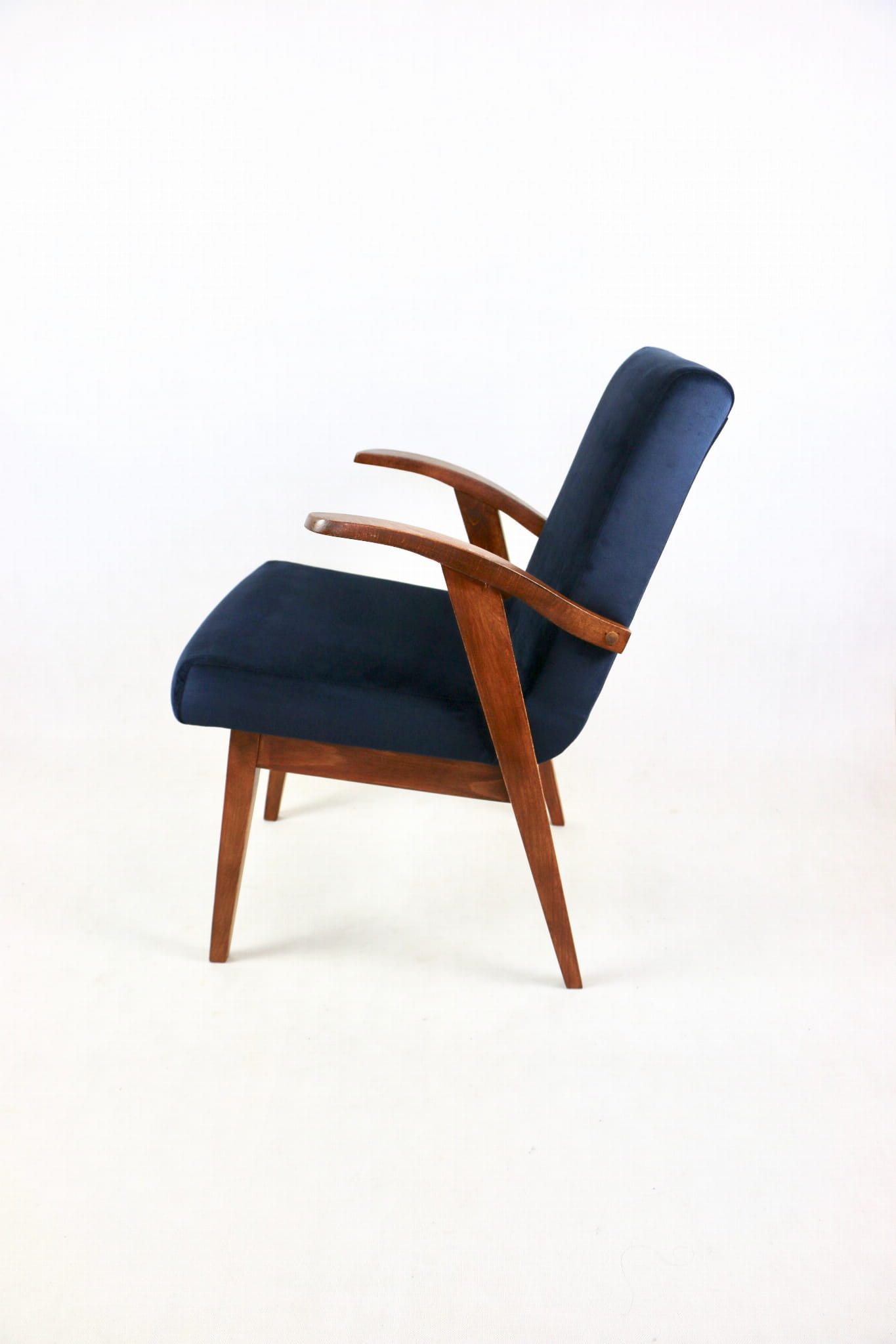 Fotel projektu M. Puchały kompletnie odrestaurowany. Nowe obicie pokryte najwyższej jakości materiałem tapicerskim w kolorze niebieskim - navy blue - Paris z serii velvet. Siedzisko na pasach, stelaż drewniany połączony z podłokietnikami w kolorze ciemnego drewna.