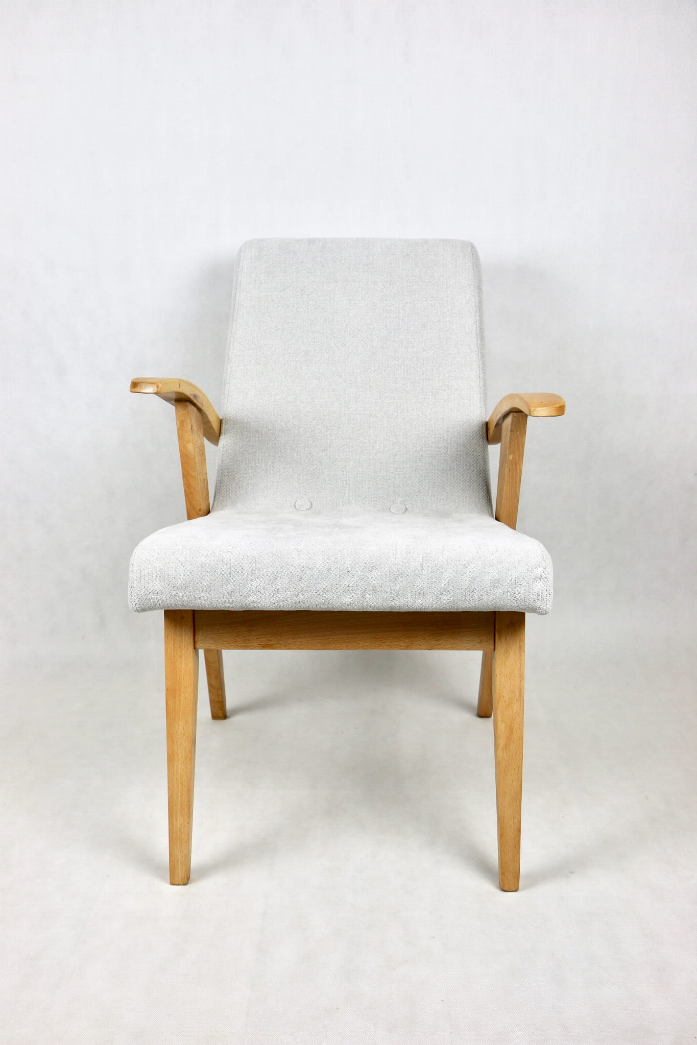 Fotel projektu M. Puchały. Kompletnie odrestaurowane. Nowe obicie pokryte najwyższej jakości naturalnym materiałem tapicerskim w kolorze szarym z serii Vienna. Siedzisko na pasach, stelaż drewniany połączony z podłokietnikami w kolorze jasnego drewna.
