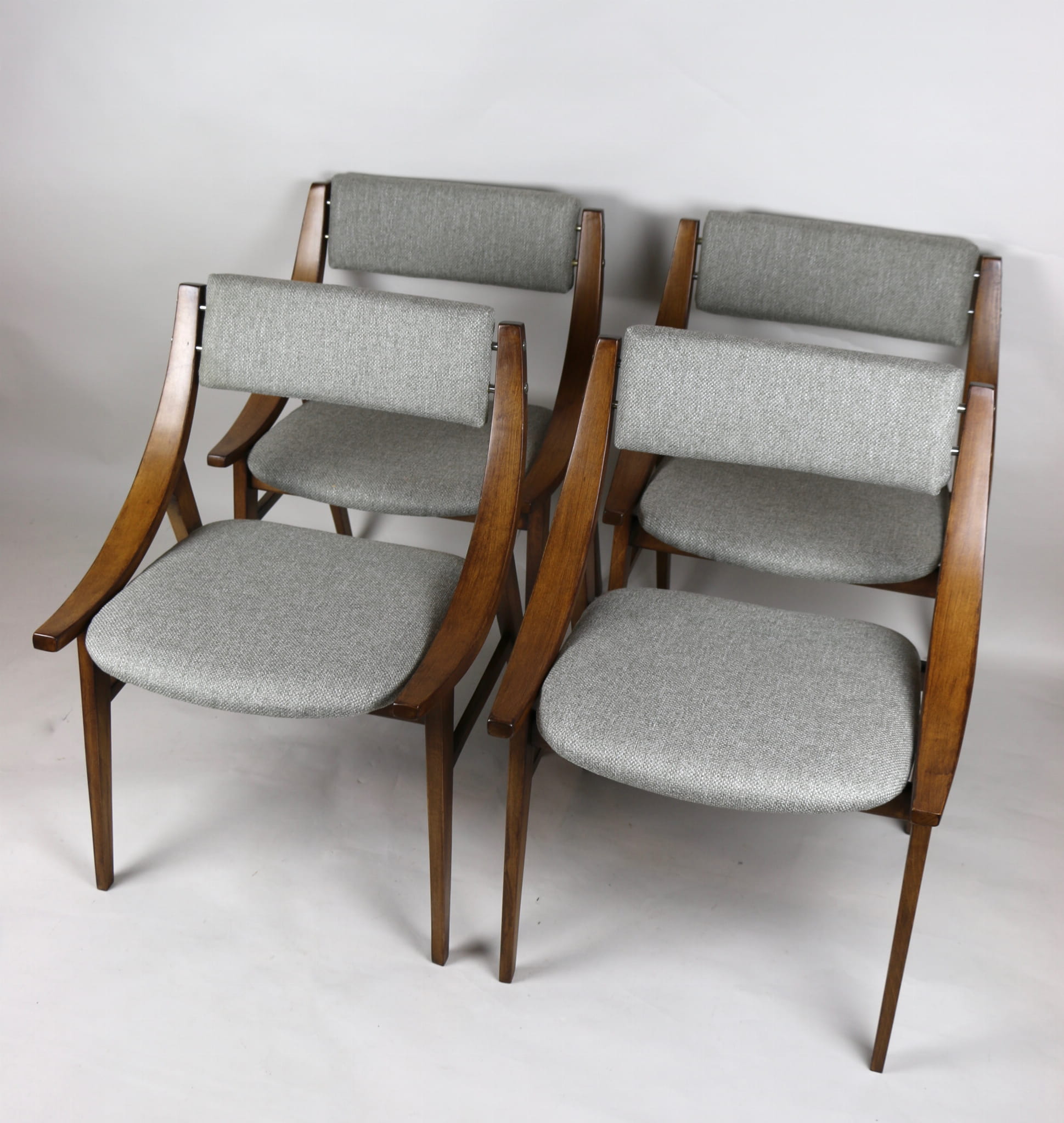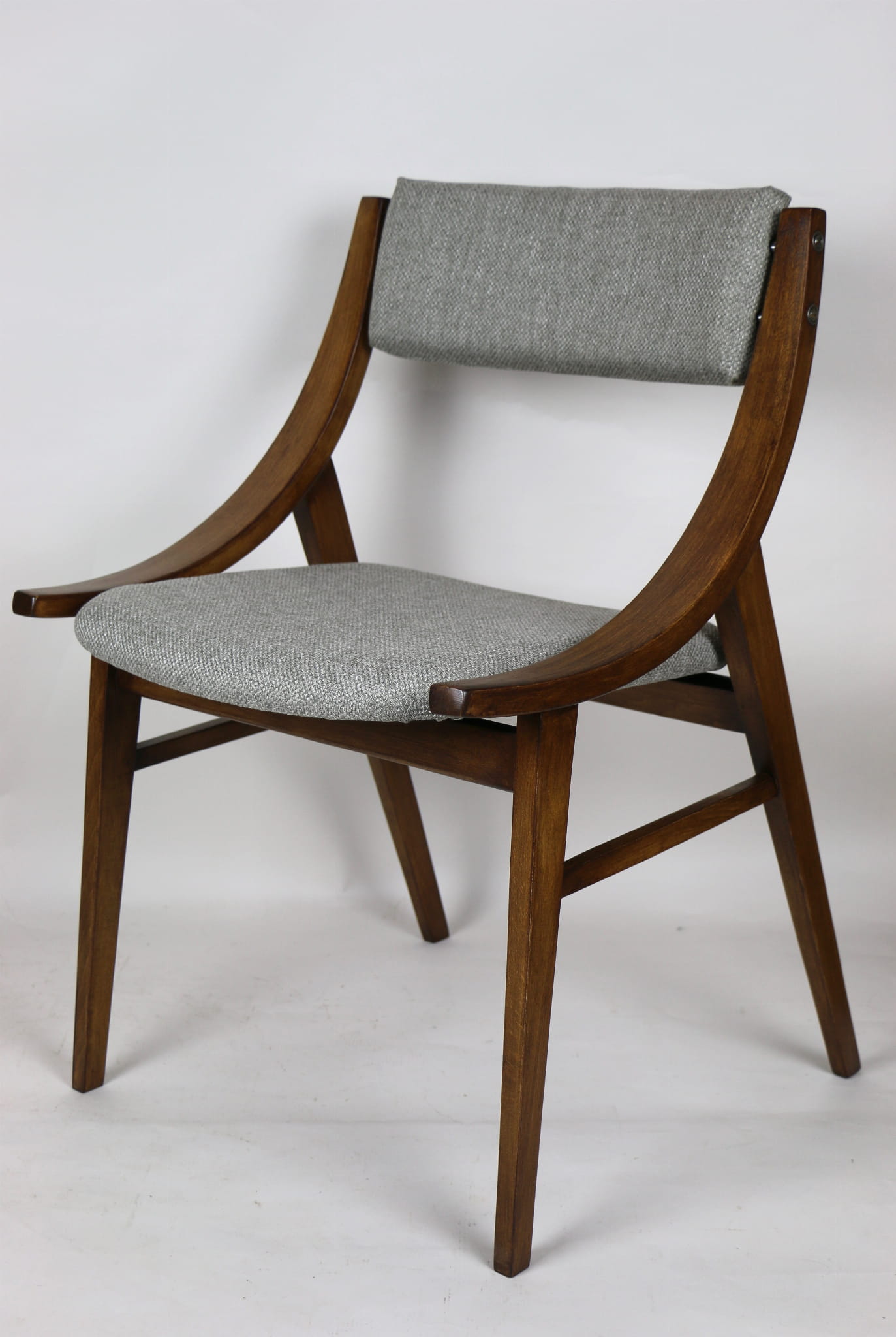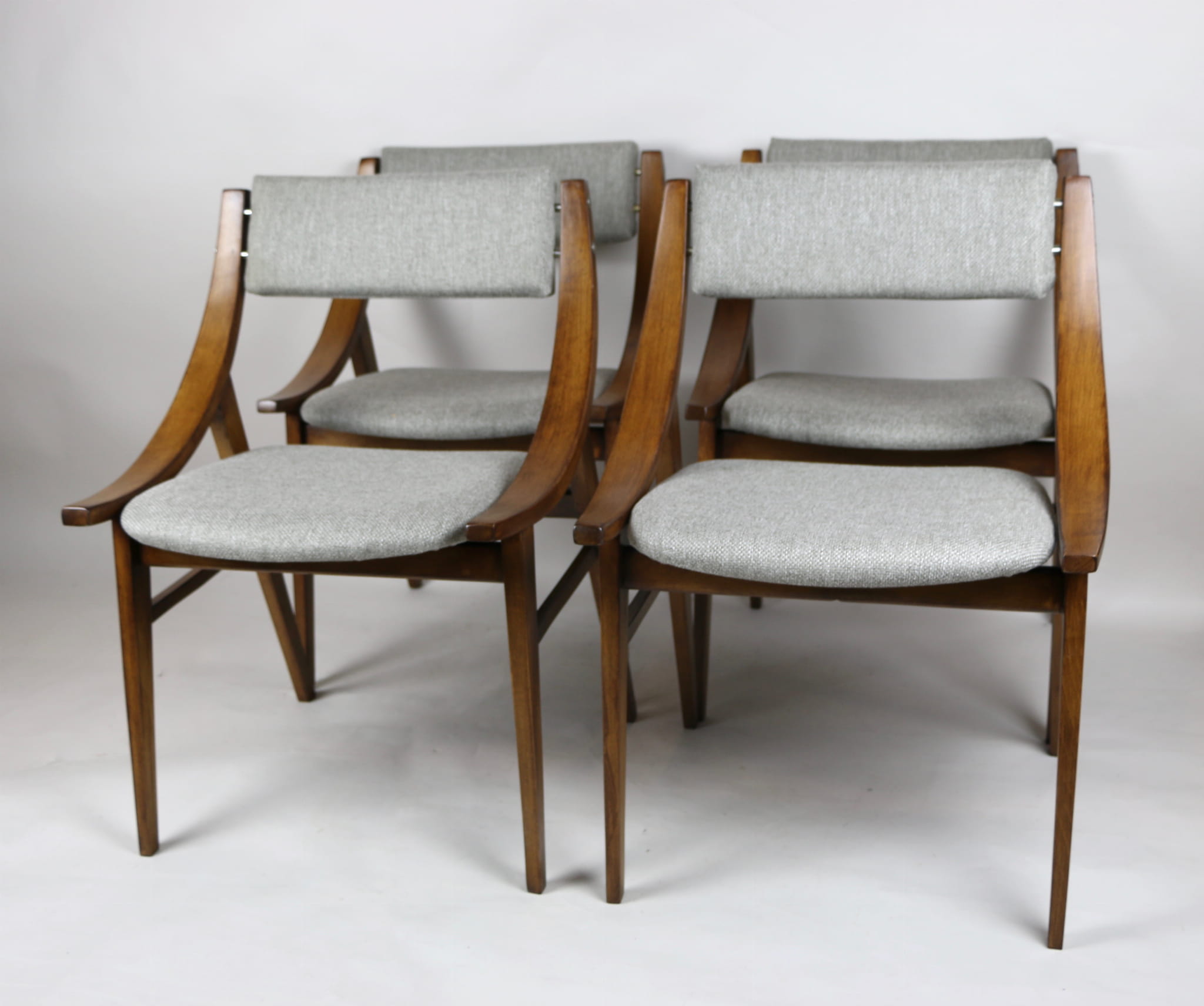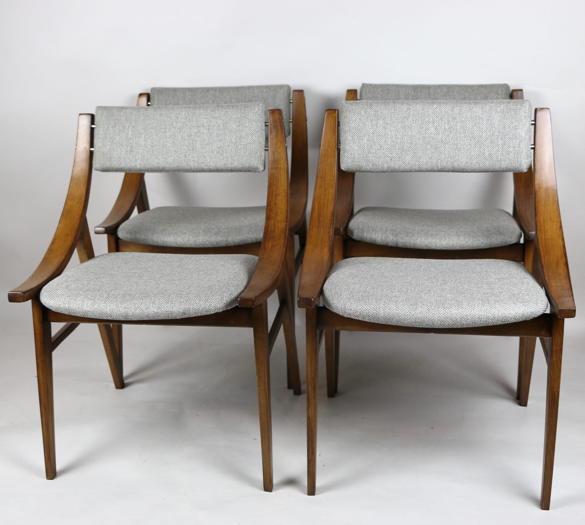 Całkowicie odrestaurowany komplet 4 krzeseł "Skoczek" z lat 70. Stelaż drewniany bukowy pokryty lakierem w kolorze orzecha. Siedzisko pokryte jest tkaniną strukturalną plecioną w kolorze szarym.