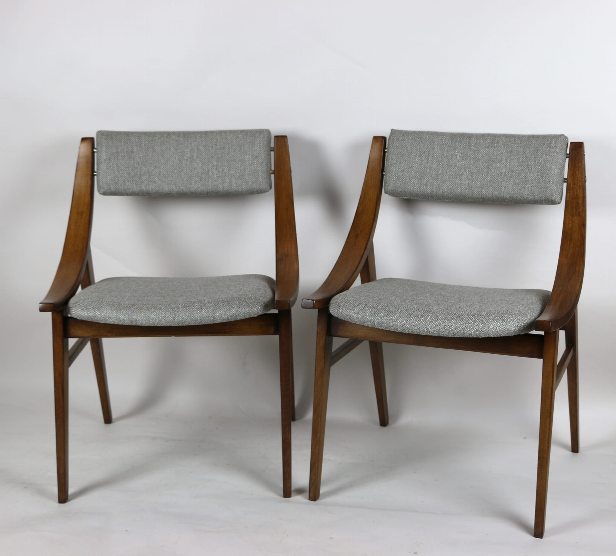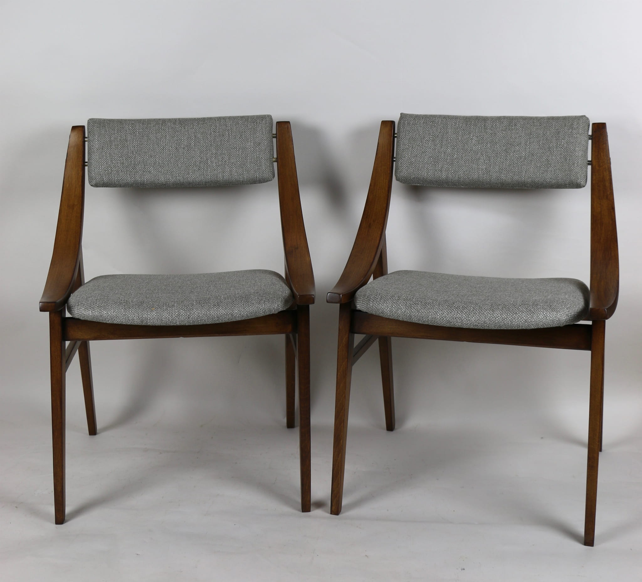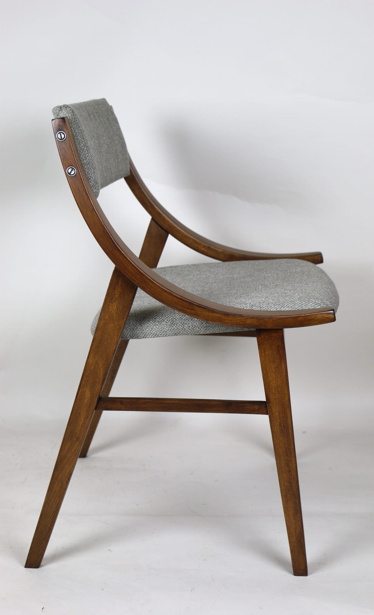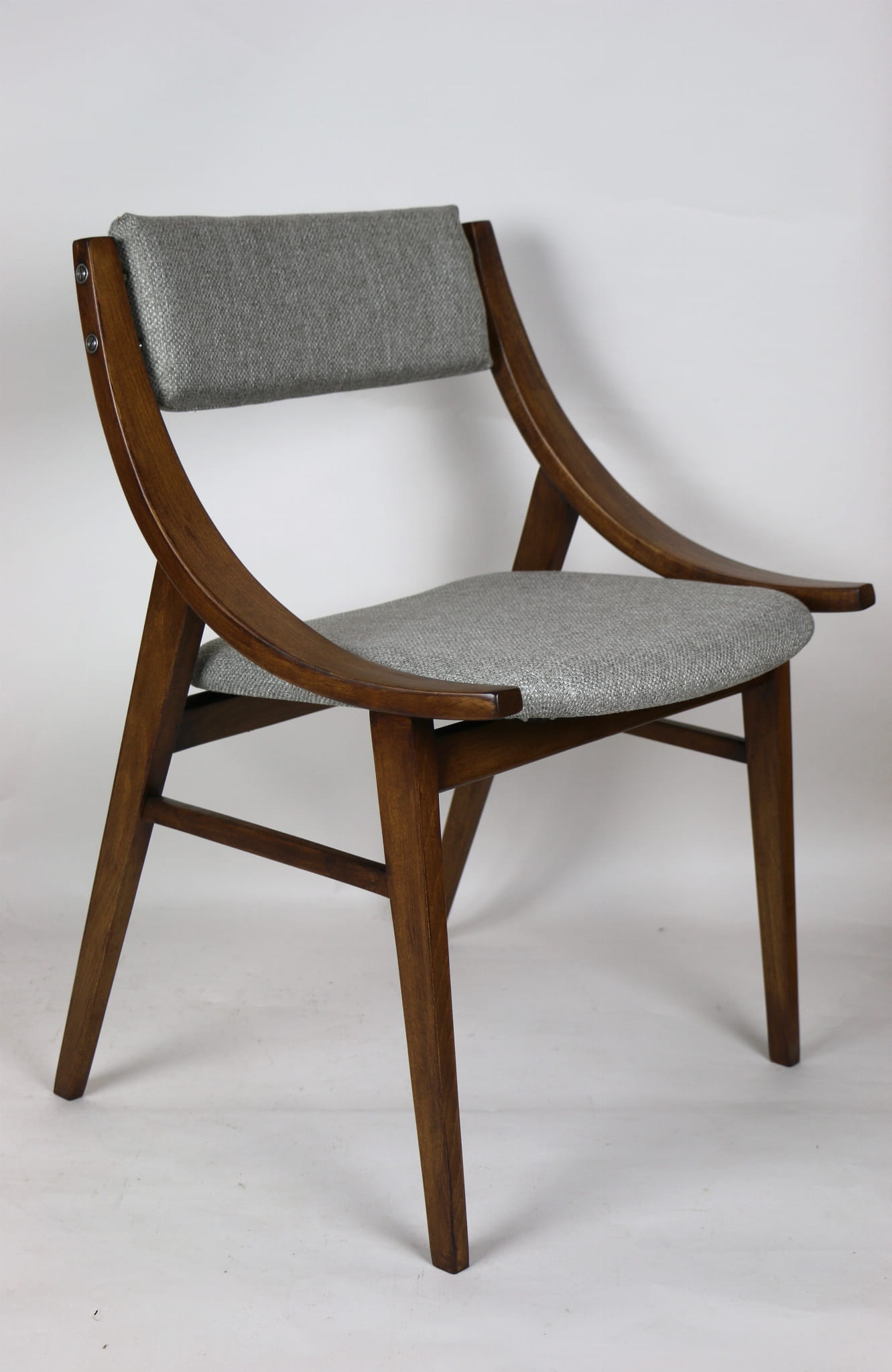 Całkowicie odrestaurowany komplet 4 krzeseł "Skoczek" z lat 70. Stelaż drewniany bukowy pokryty lakierem w kolorze orzecha. Siedzisko pokryte jest tkaniną strukturalną plecioną w kolorze szarym.