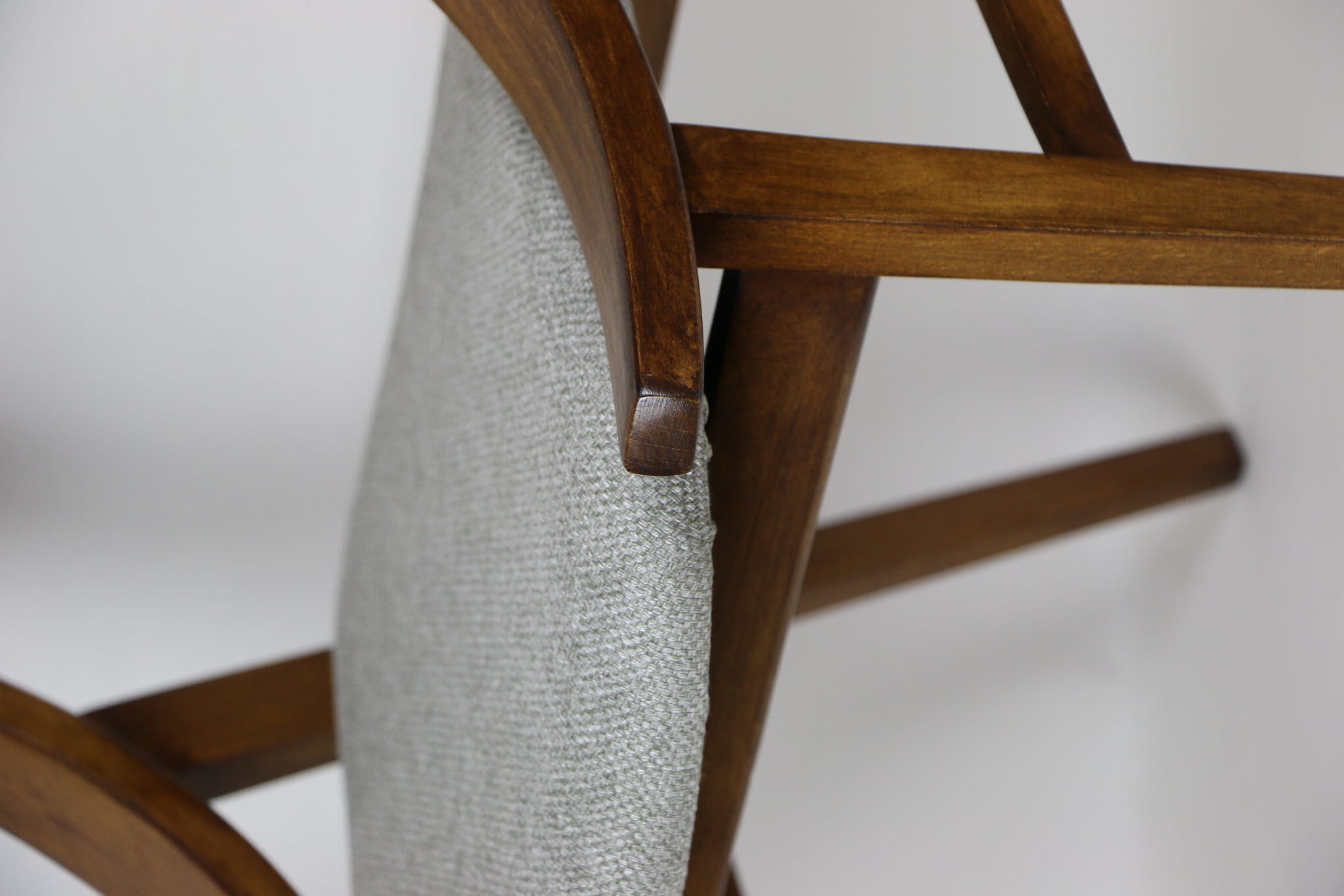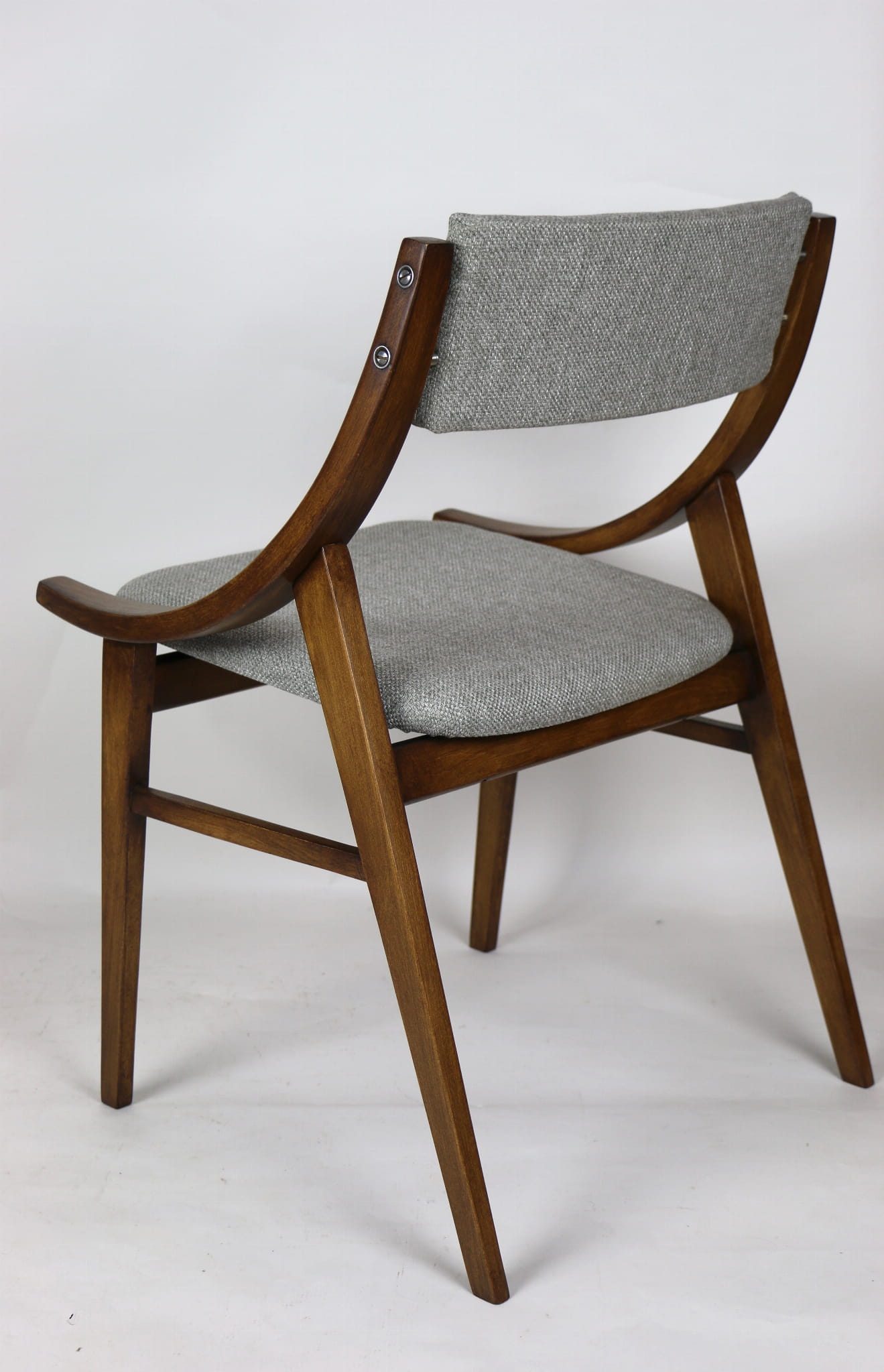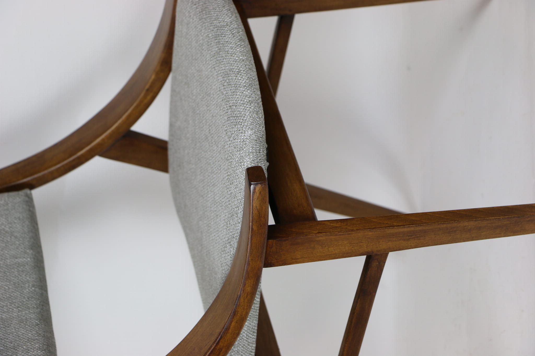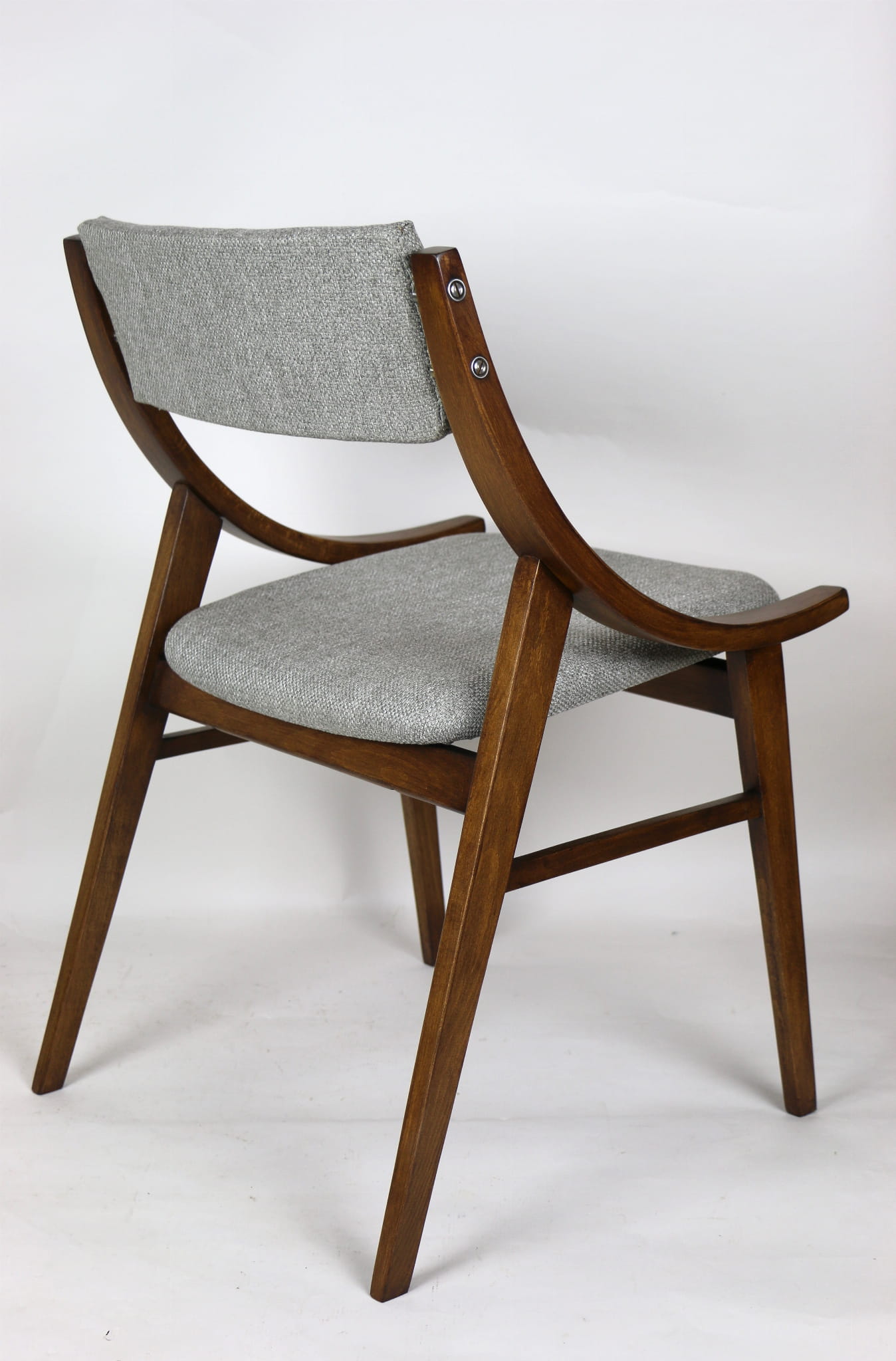 Całkowicie odrestaurowany komplet 4 krzeseł "Skoczek" z lat 70. Stelaż drewniany bukowy pokryty lakierem w kolorze orzecha. Siedzisko pokryte jest tkaniną strukturalną plecioną w kolorze szarym.