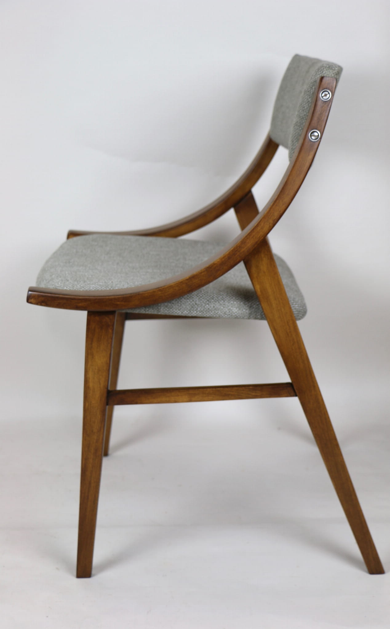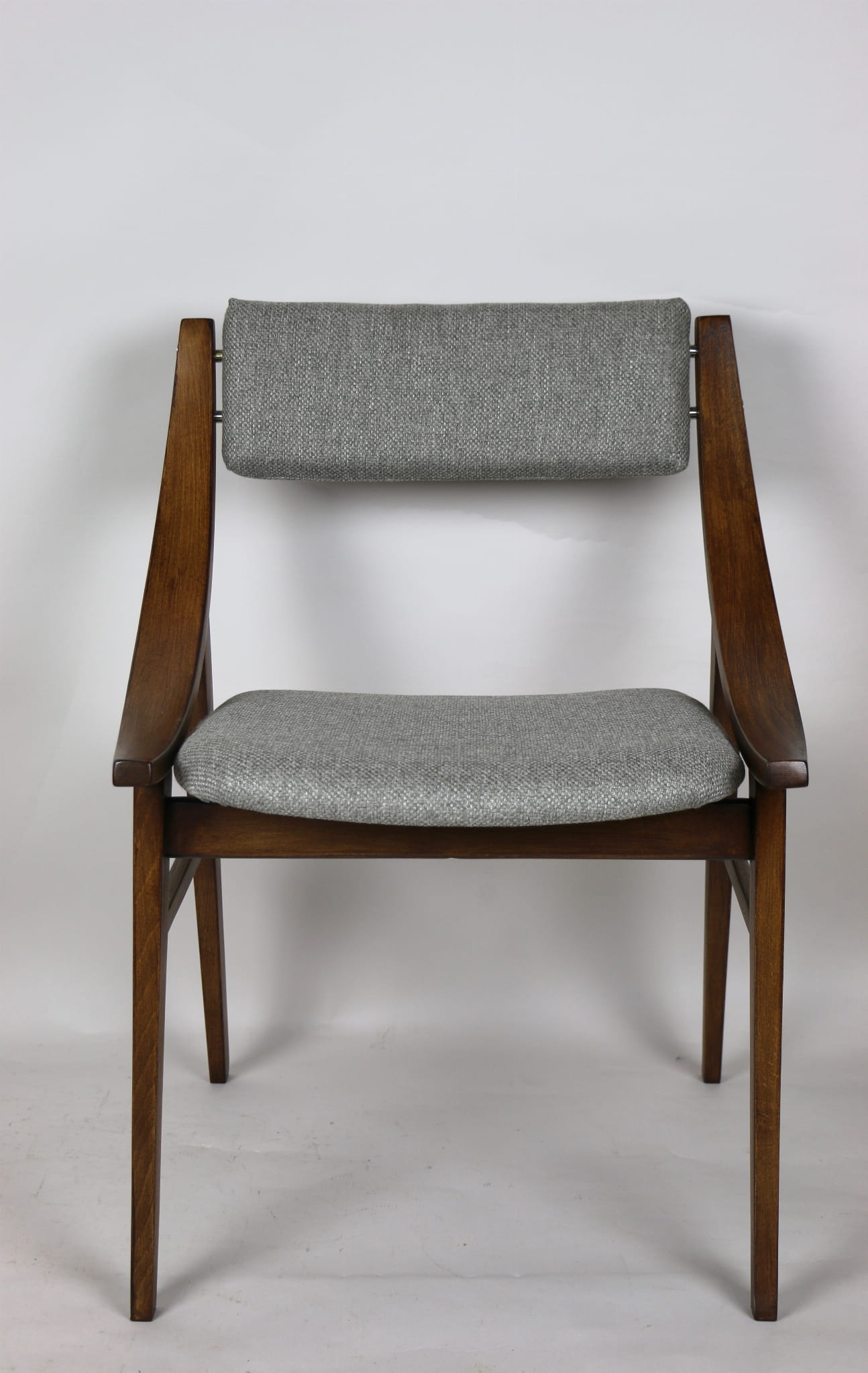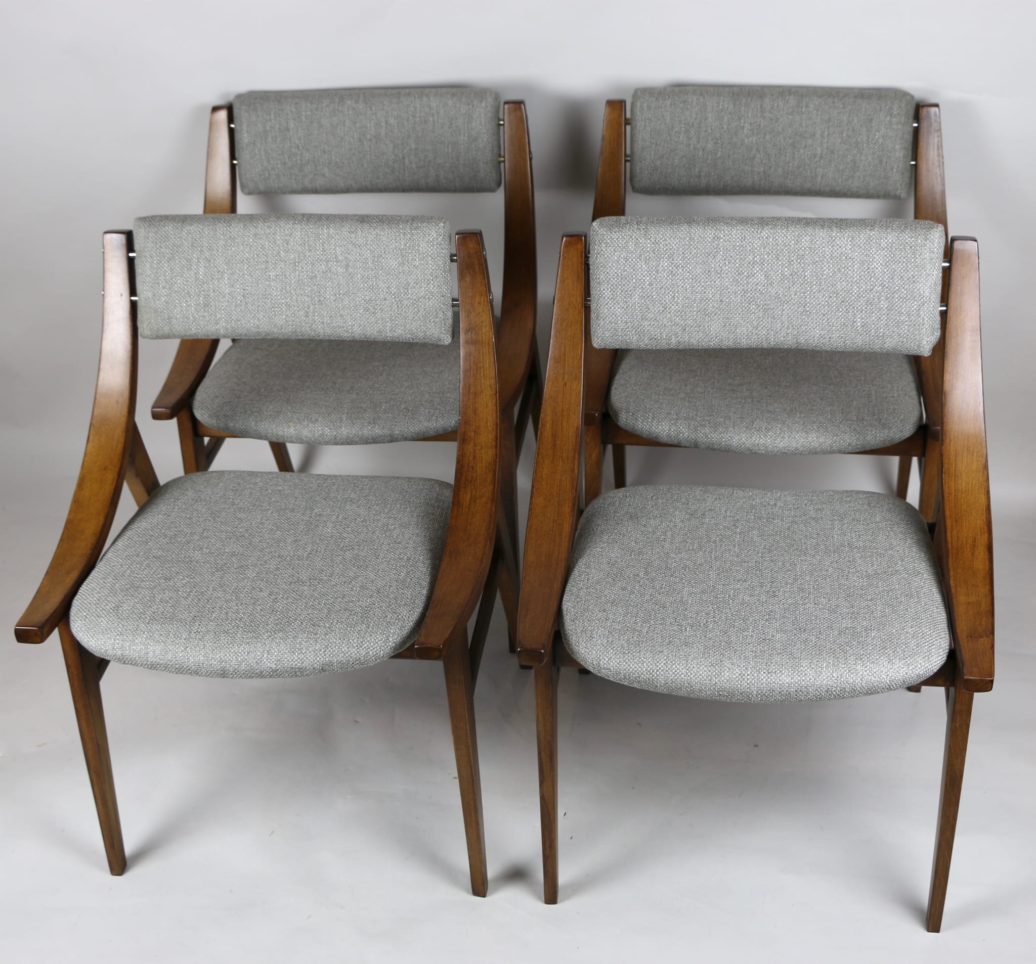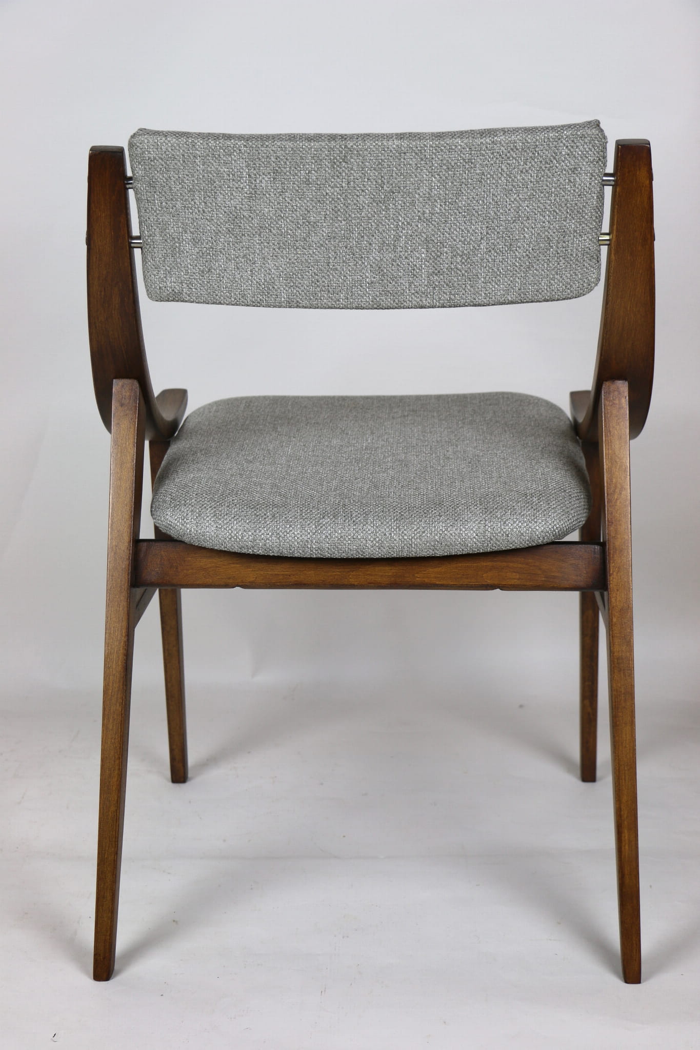 Całkowicie odrestaurowany komplet 4 krzeseł "Skoczek" z lat 70. Stelaż drewniany bukowy pokryty lakierem w kolorze orzecha. Siedzisko pokryte jest tkaniną strukturalną plecioną w kolorze szarym.