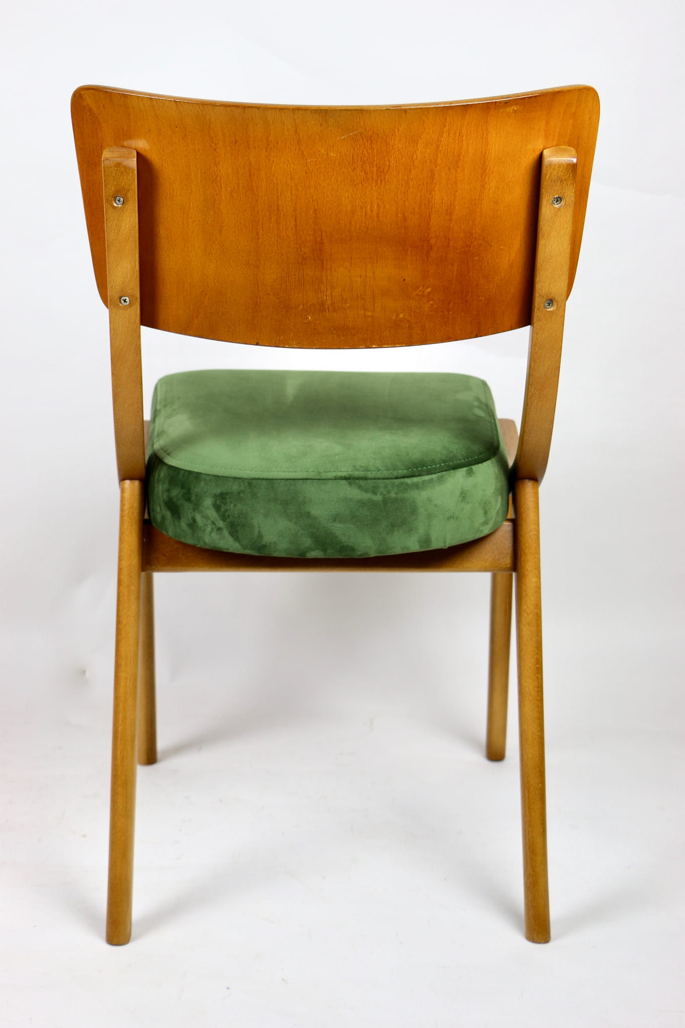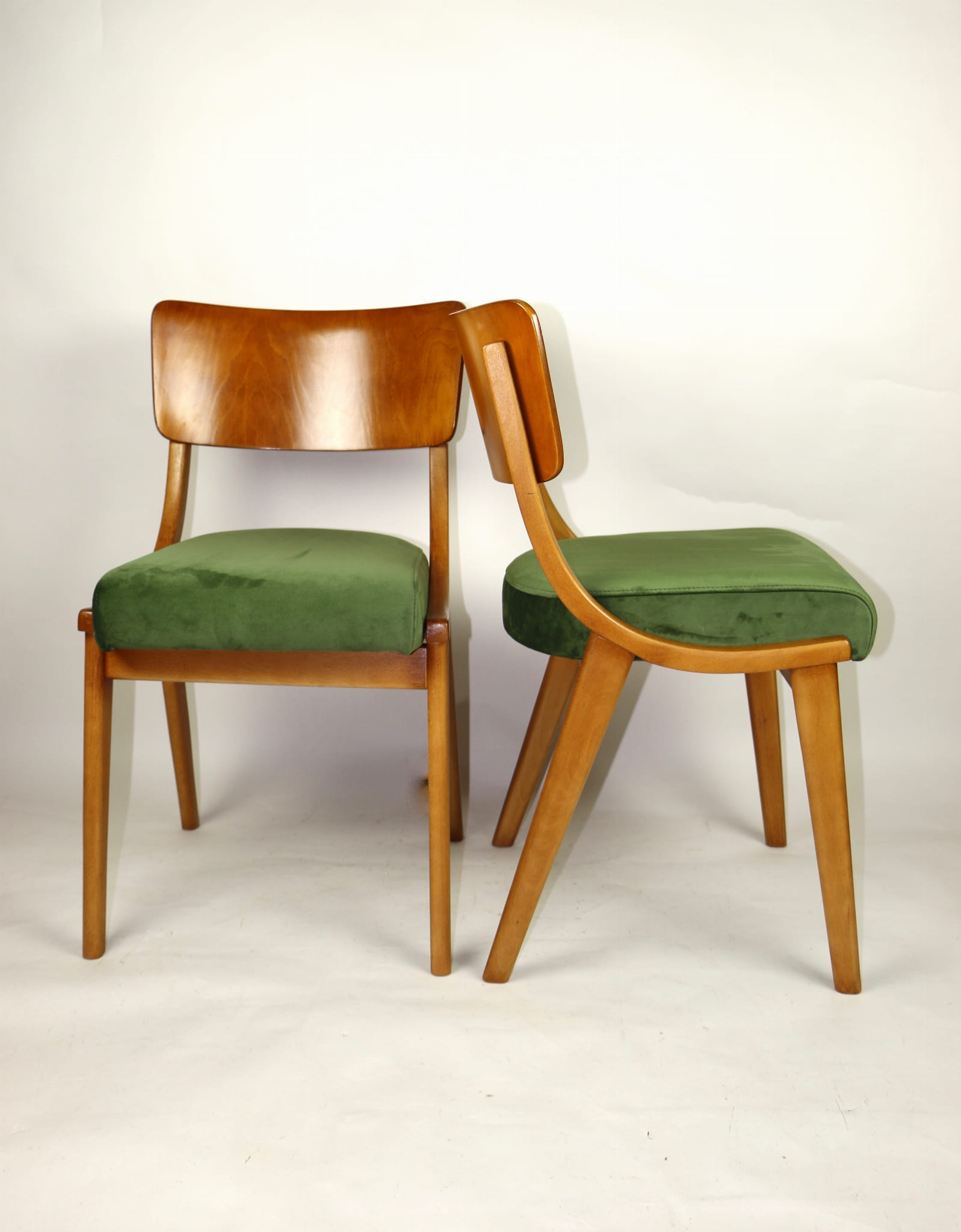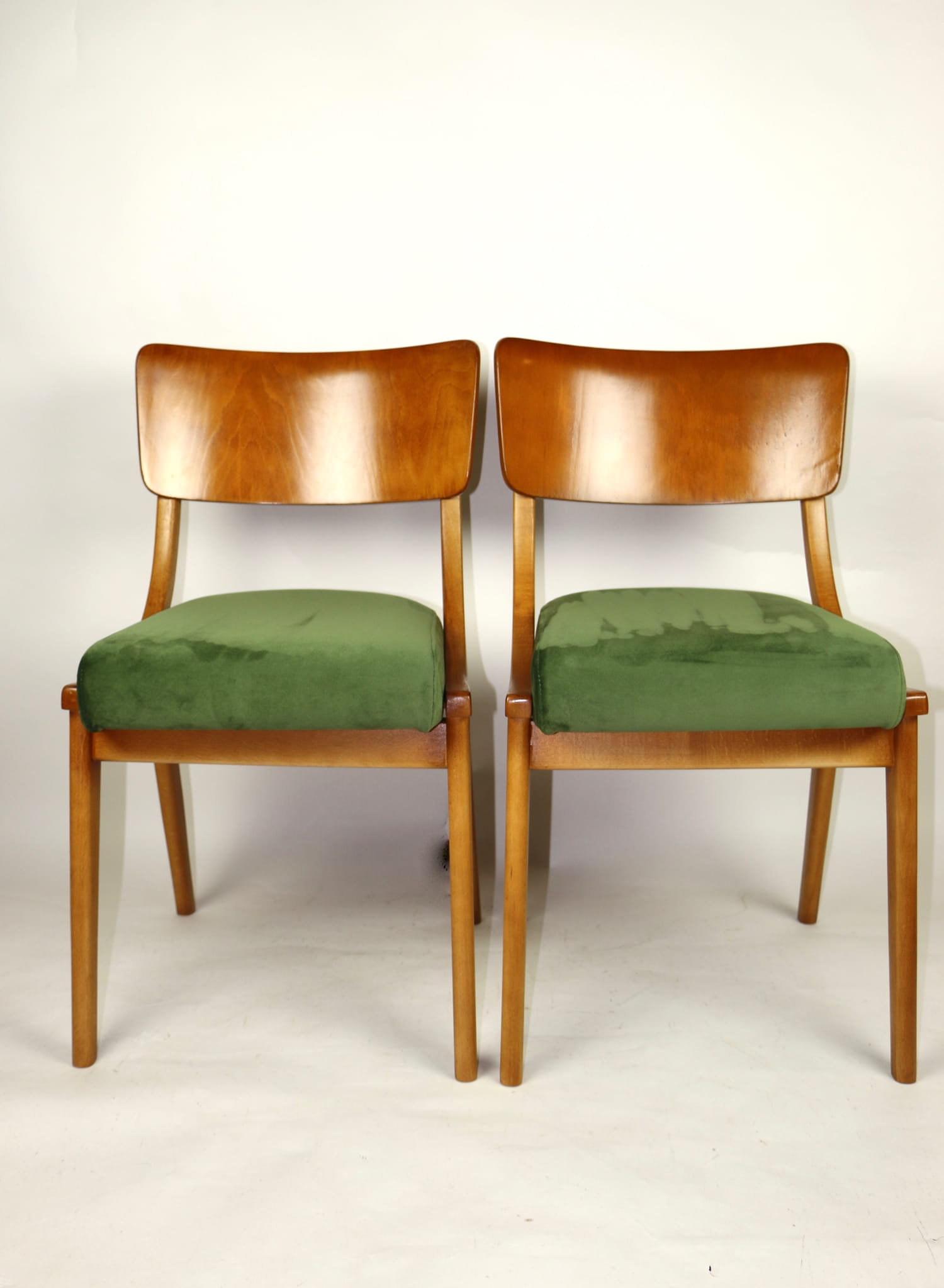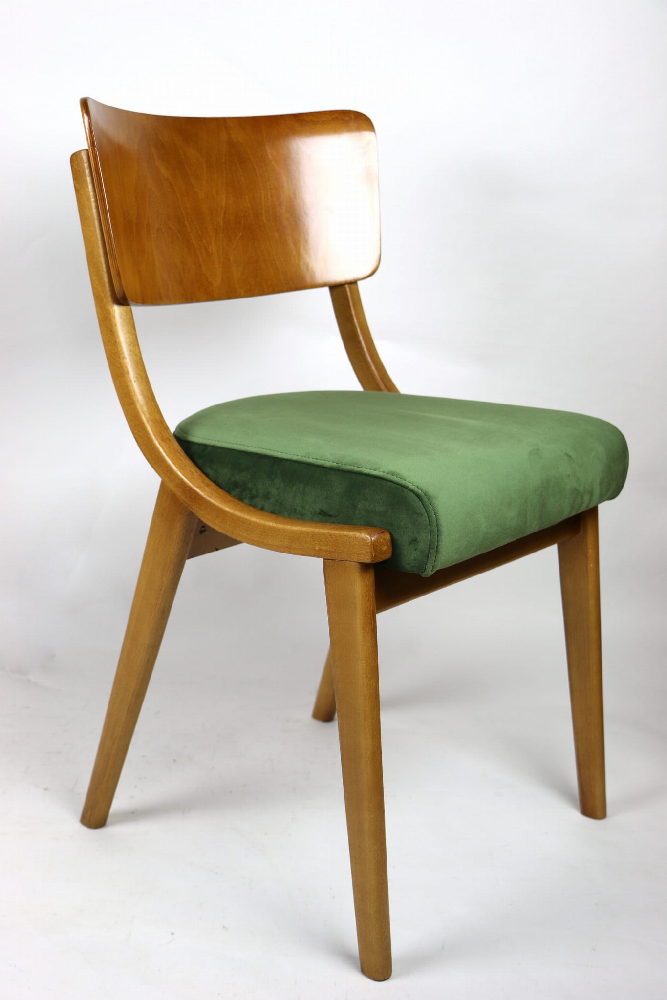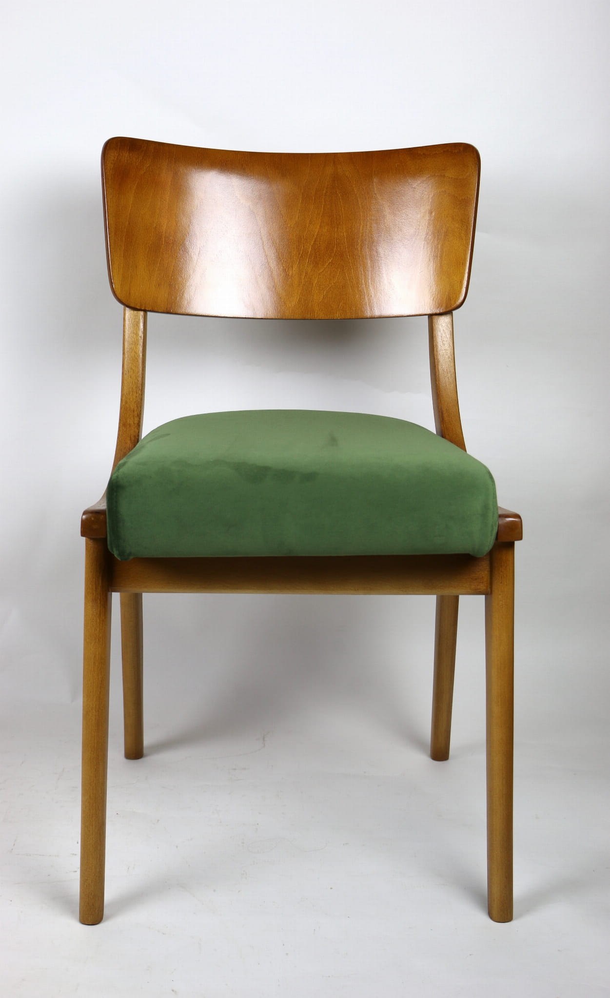 Zestaw dwóch Krzeseł Vintage Skoczek z oparciem w kolorze zielonym kompletnie odrestaurowane. Nowe obicie pokryte materiałem tapicerskim w kolorze zielono-oliwkowym typu welwet. Stelaż drewniany w naturalnym kolorze drewna.