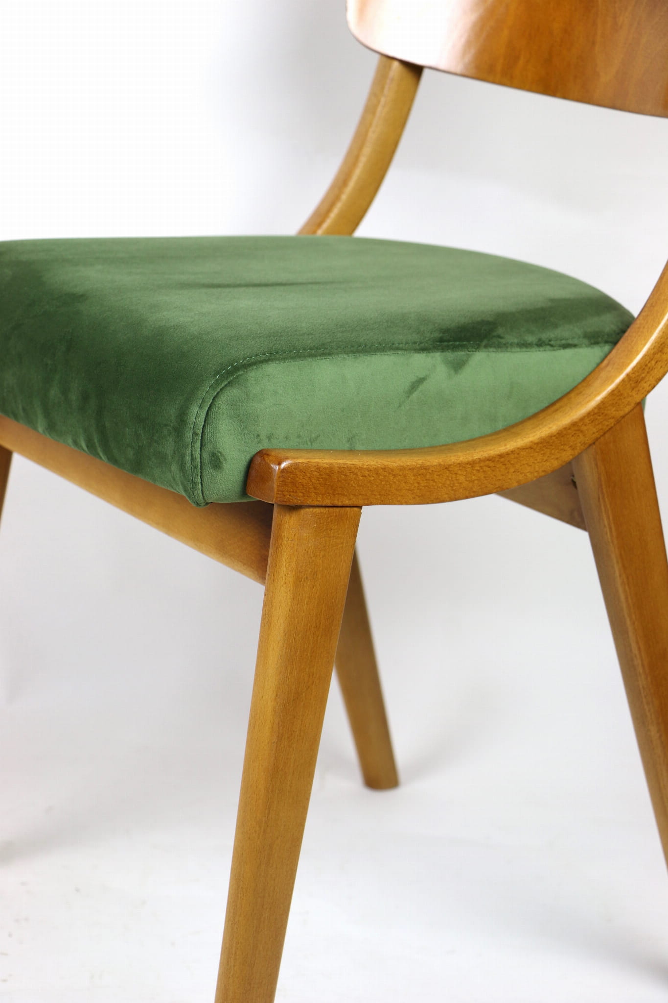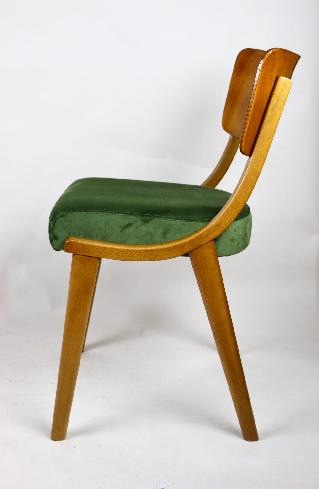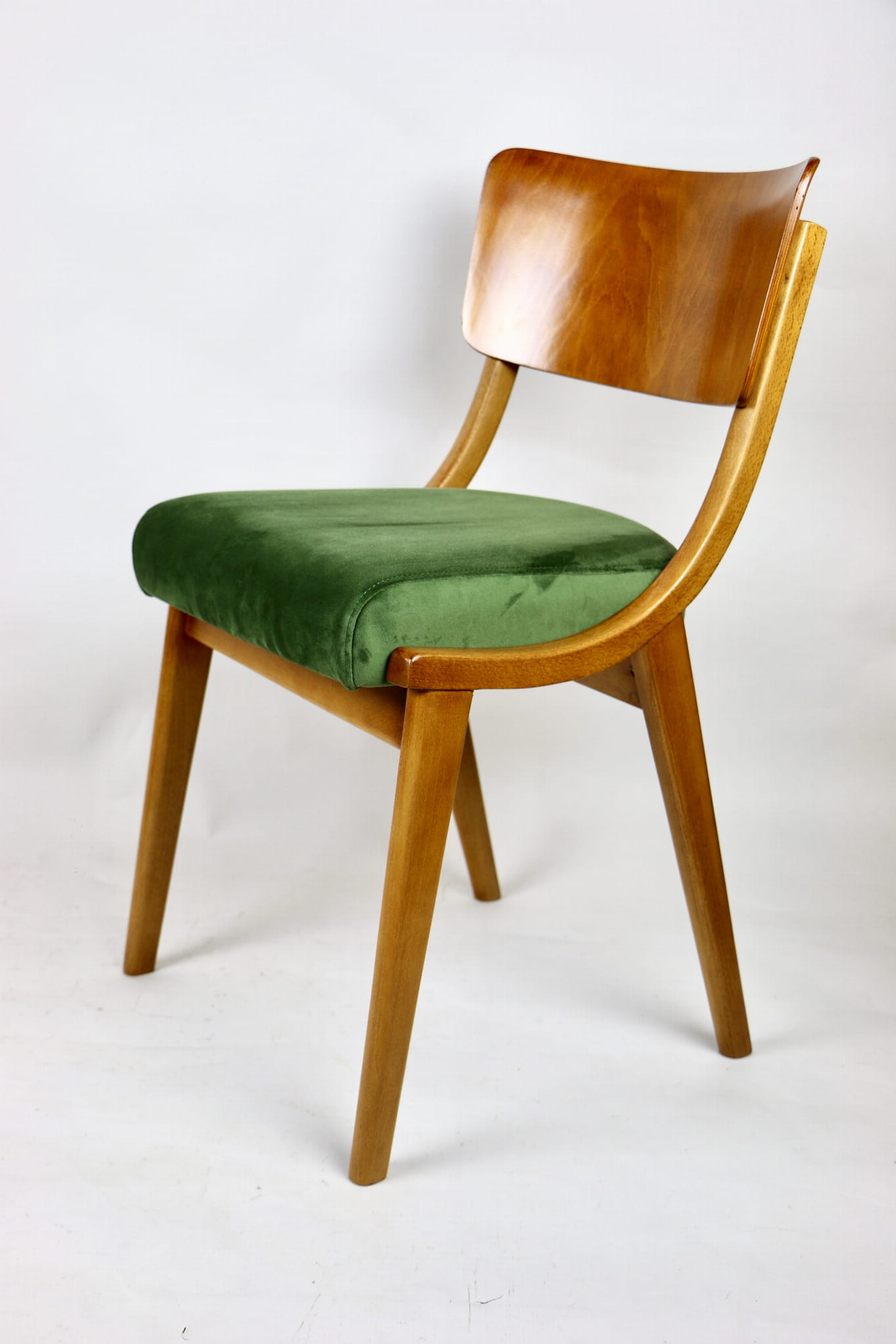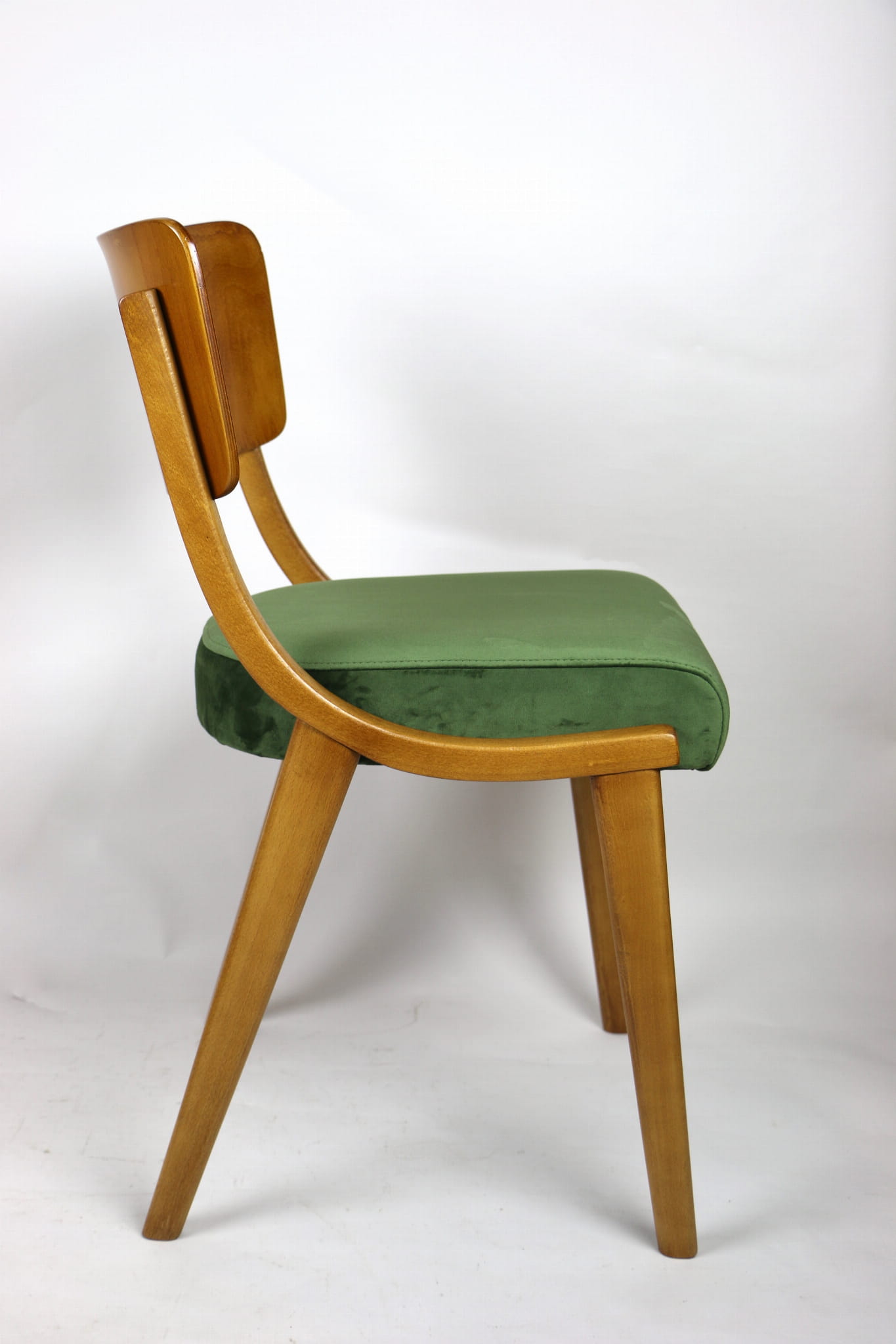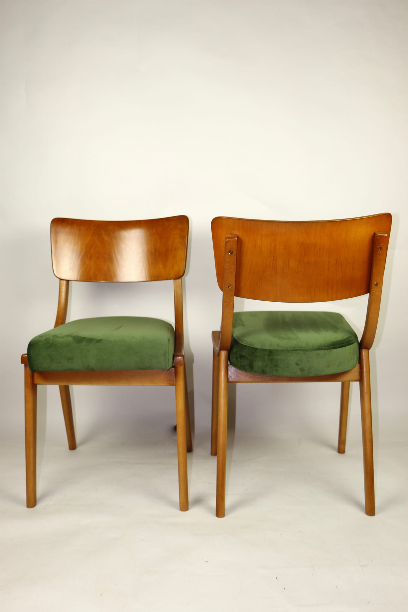 Zestaw dwóch Krzeseł Vintage Skoczek z oparciem w kolorze zielonym kompletnie odrestaurowane. Nowe obicie pokryte materiałem tapicerskim w kolorze zielono-oliwkowym typu welwet. Stelaż drewniany w naturalnym kolorze drewna.