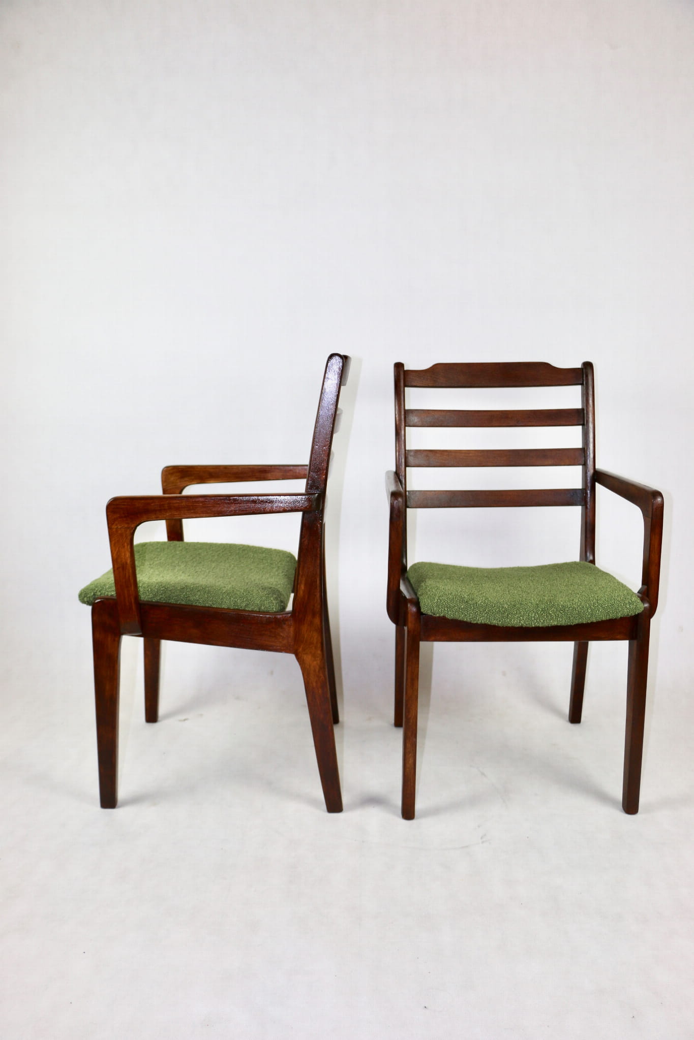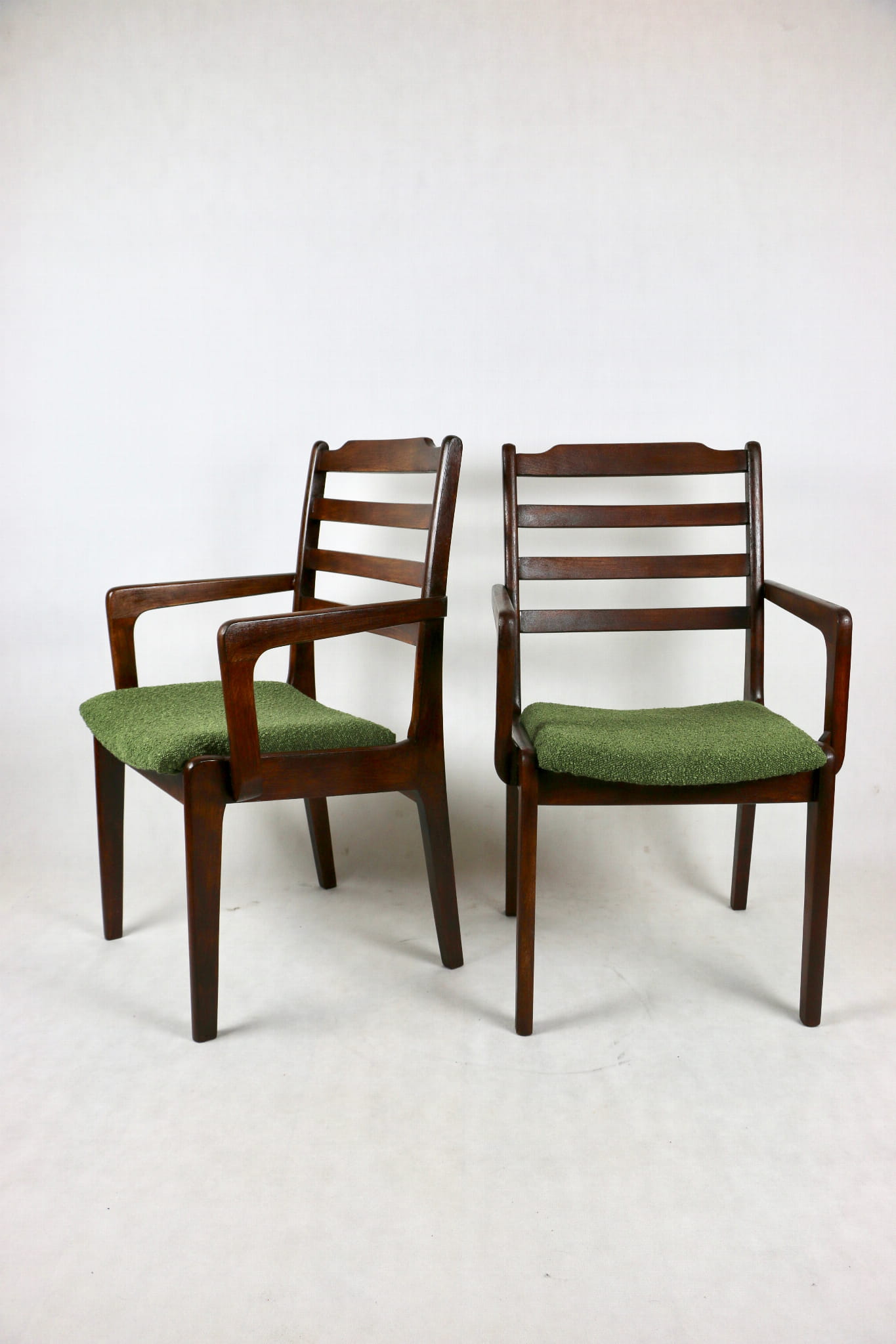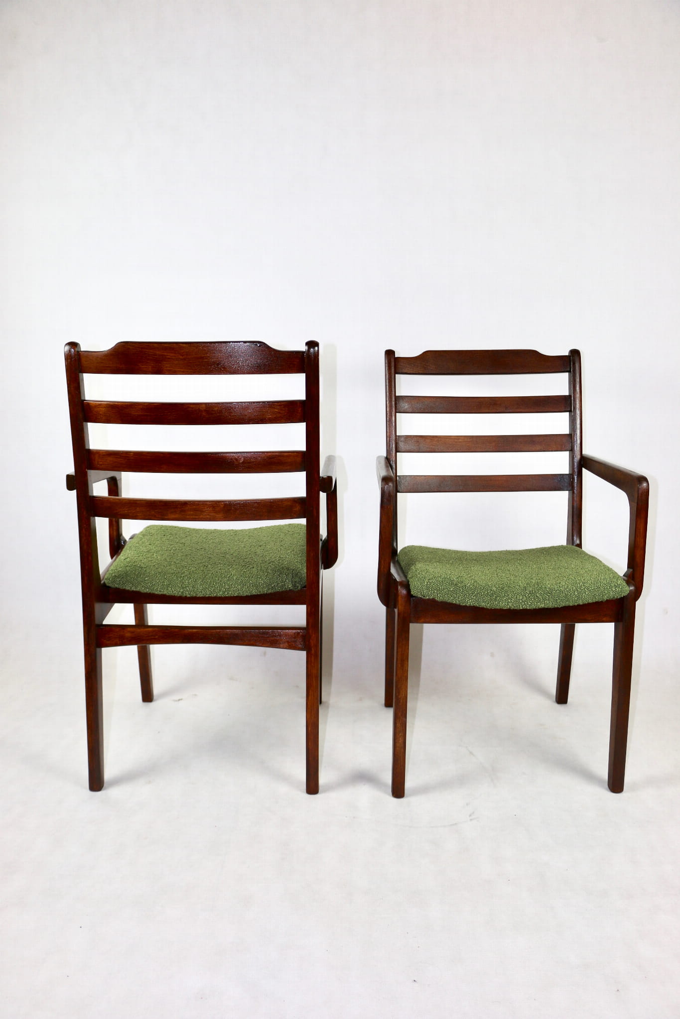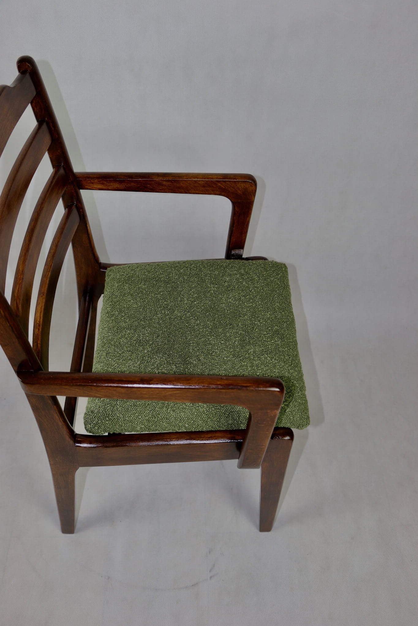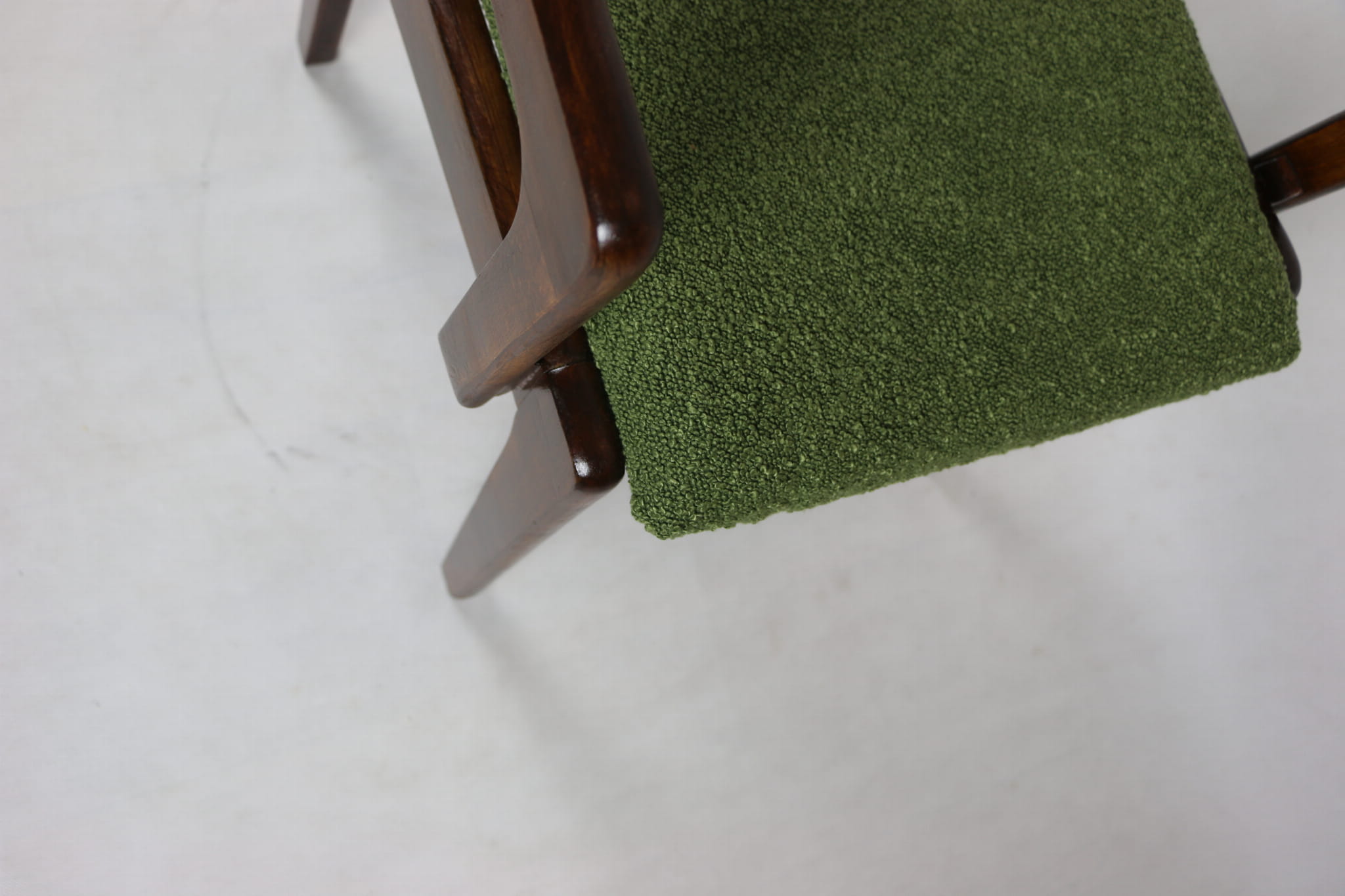 Zestaw 2 Krzeseł Vintage Loft w kolorze zielonym kompletnie odrestaurowane. Nowe obicie pokryte strukturalnym materiałem tapicerskim z serii boucle - Baloo. Stelaż drewniany w naturalnym ciemnym kolorze drewna.