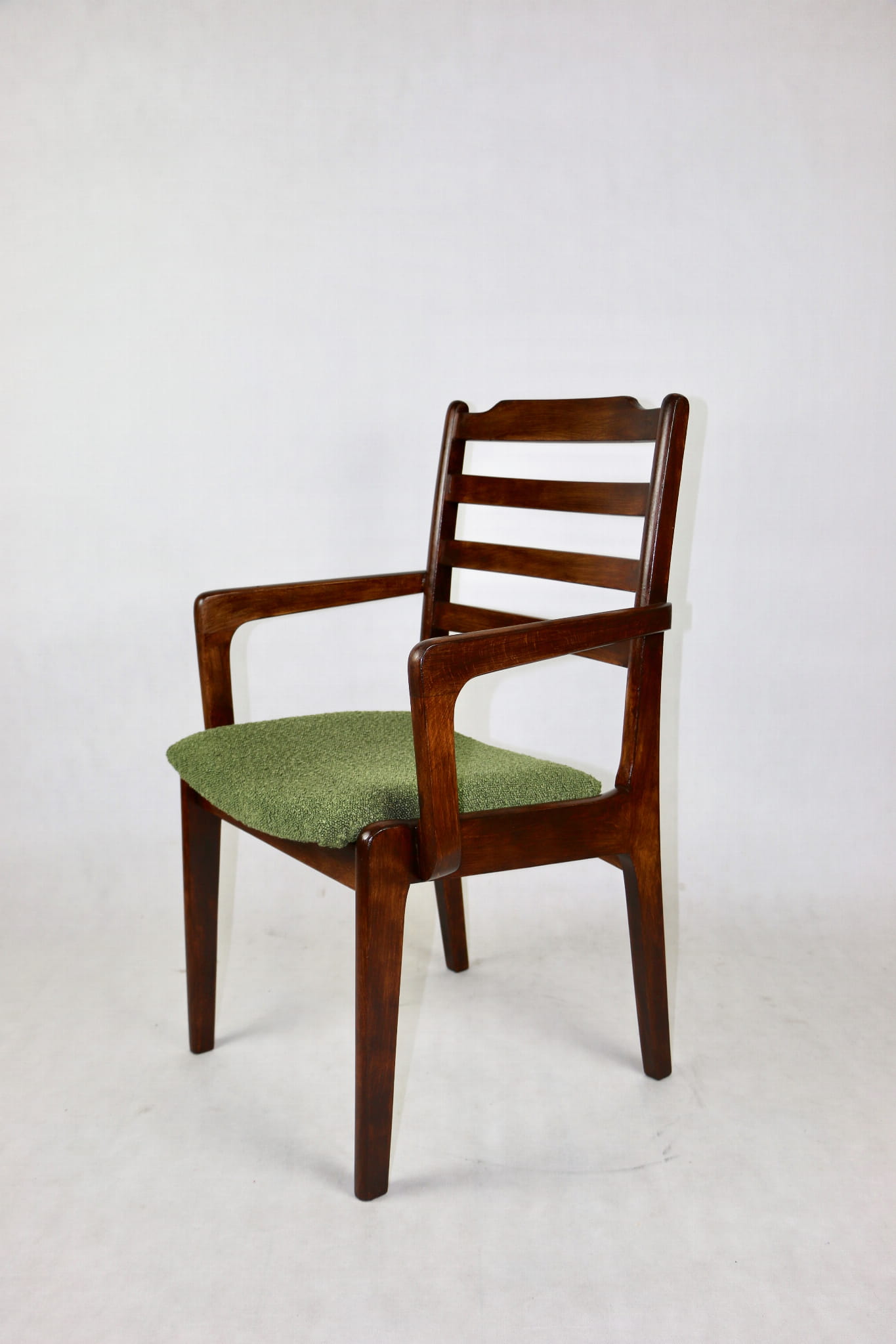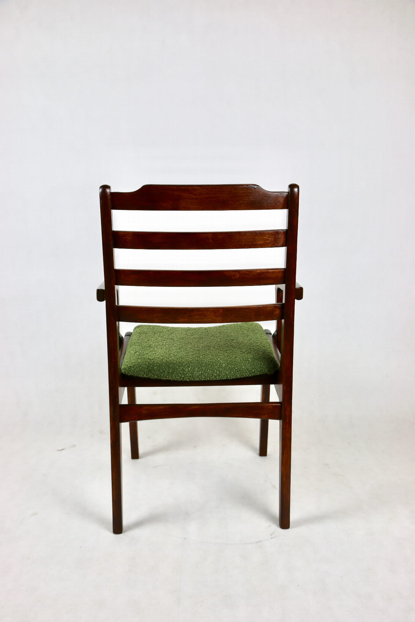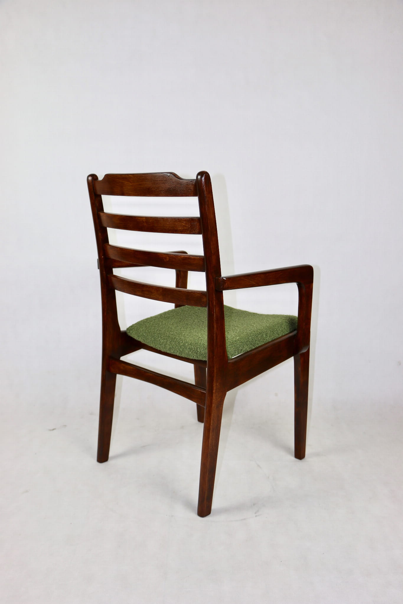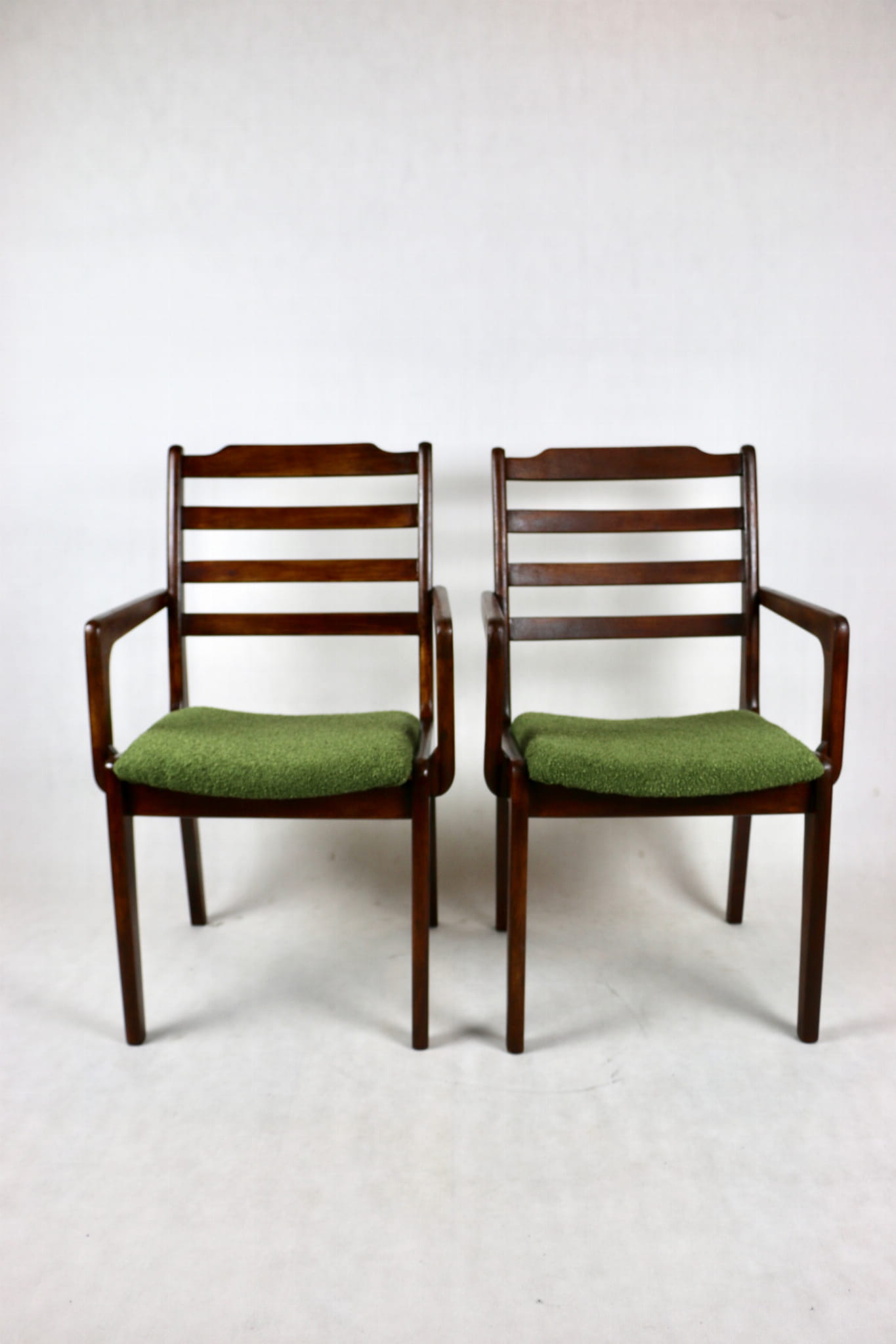 Zestaw 2 Krzeseł Vintage Loft w kolorze zielonym kompletnie odrestaurowane. Nowe obicie pokryte strukturalnym materiałem tapicerskim z serii boucle - Baloo. Stelaż drewniany w naturalnym ciemnym kolorze drewna.