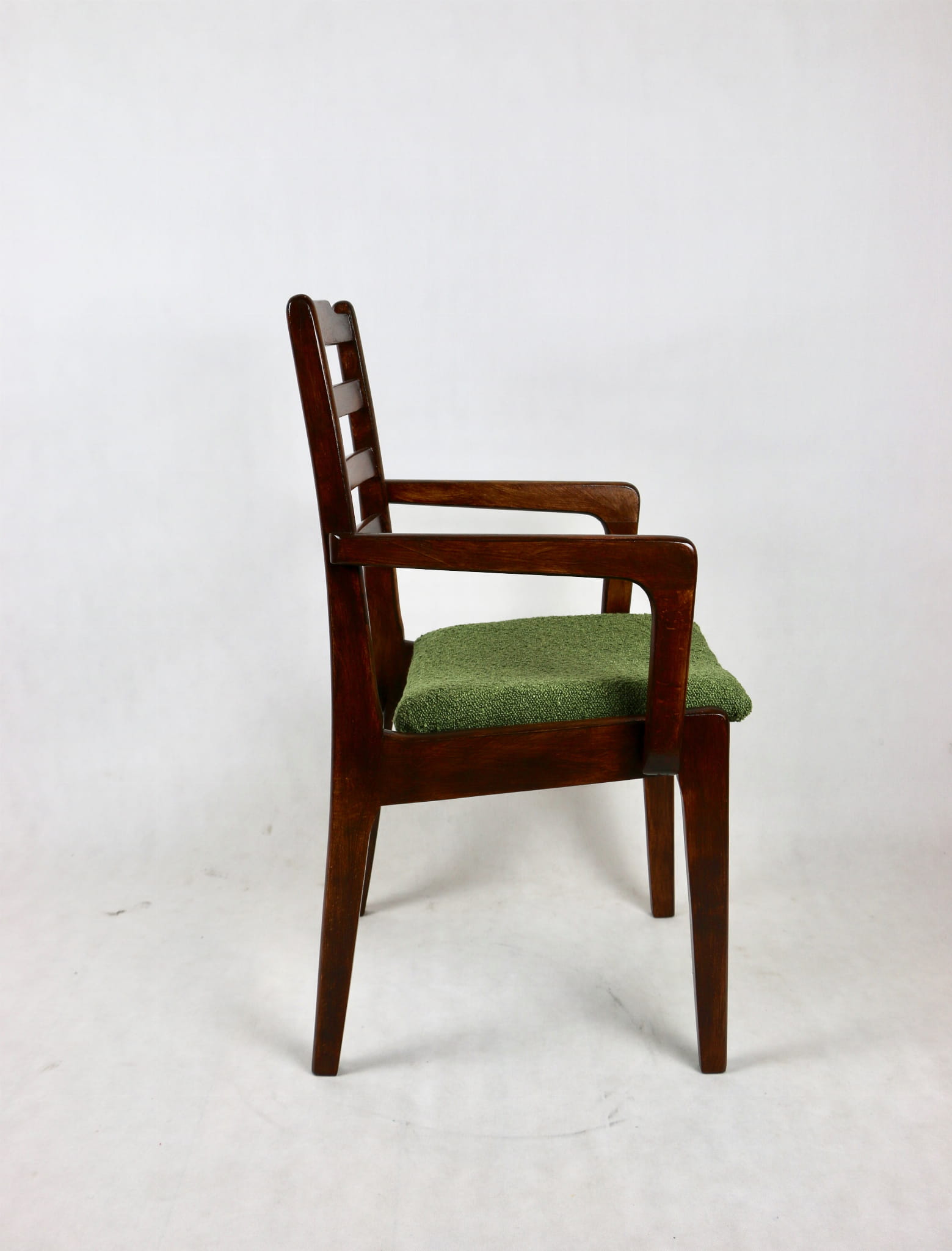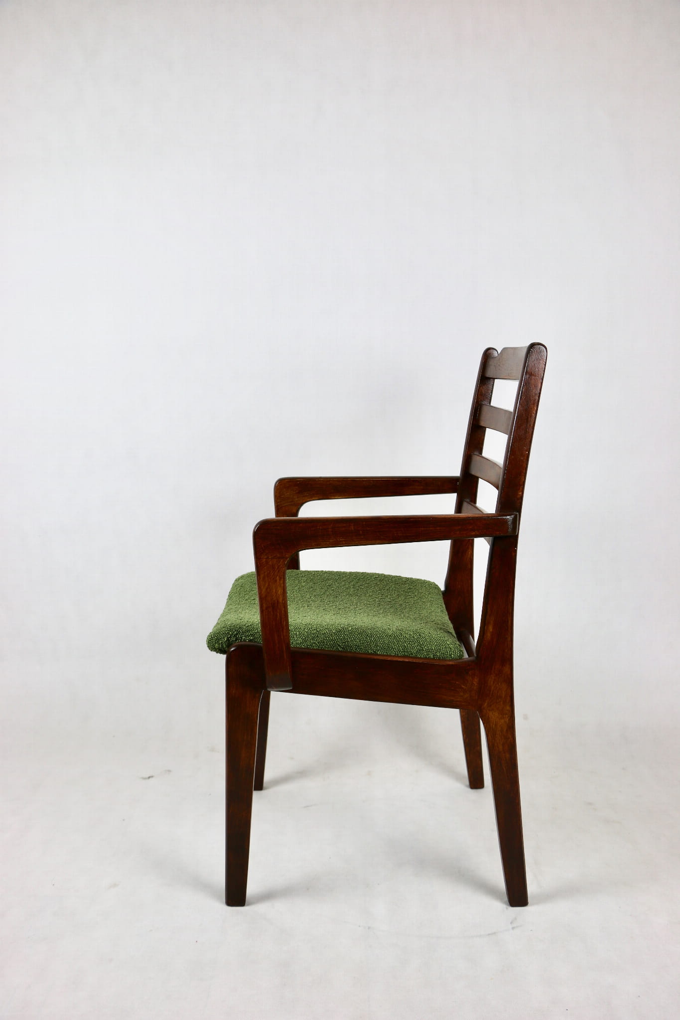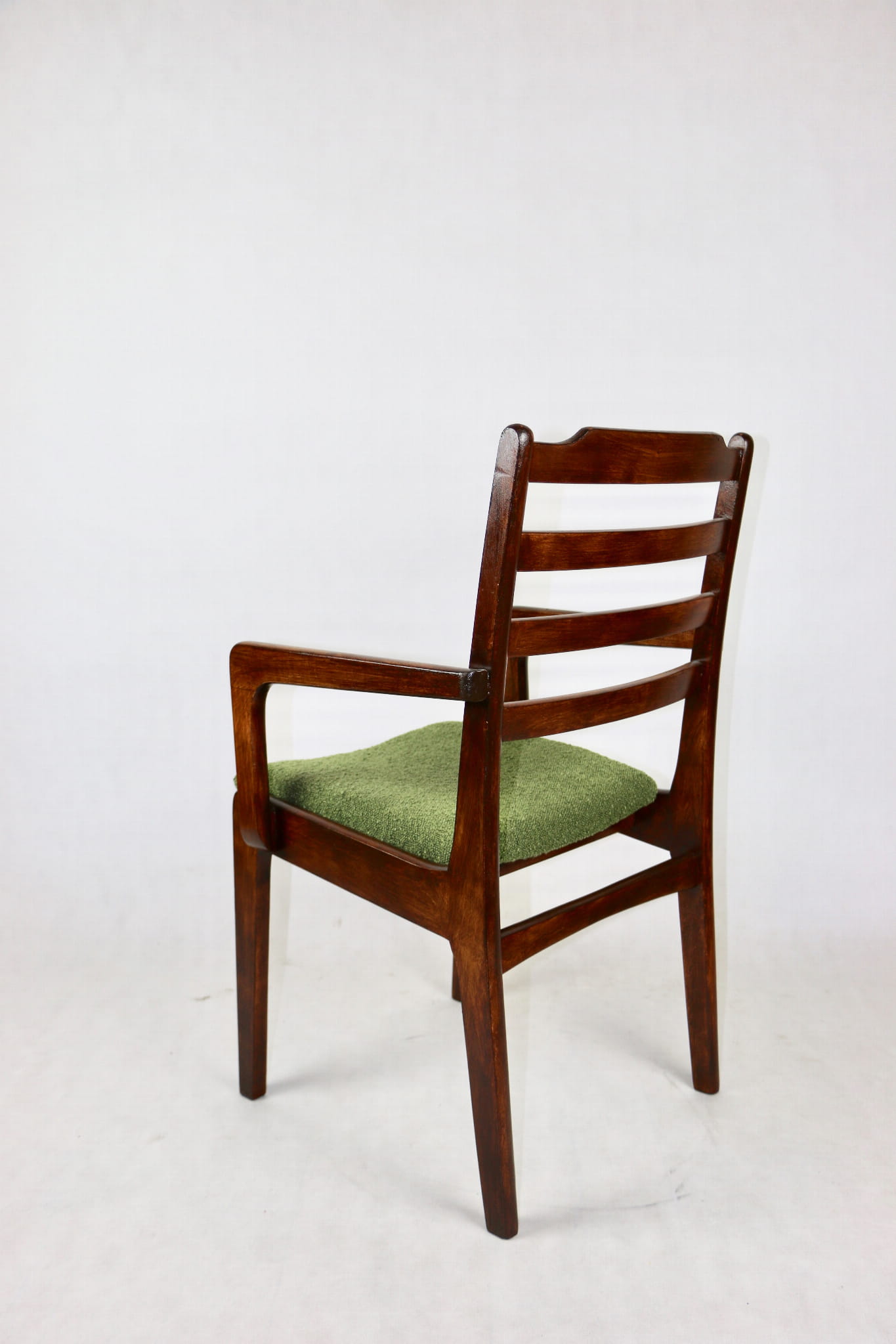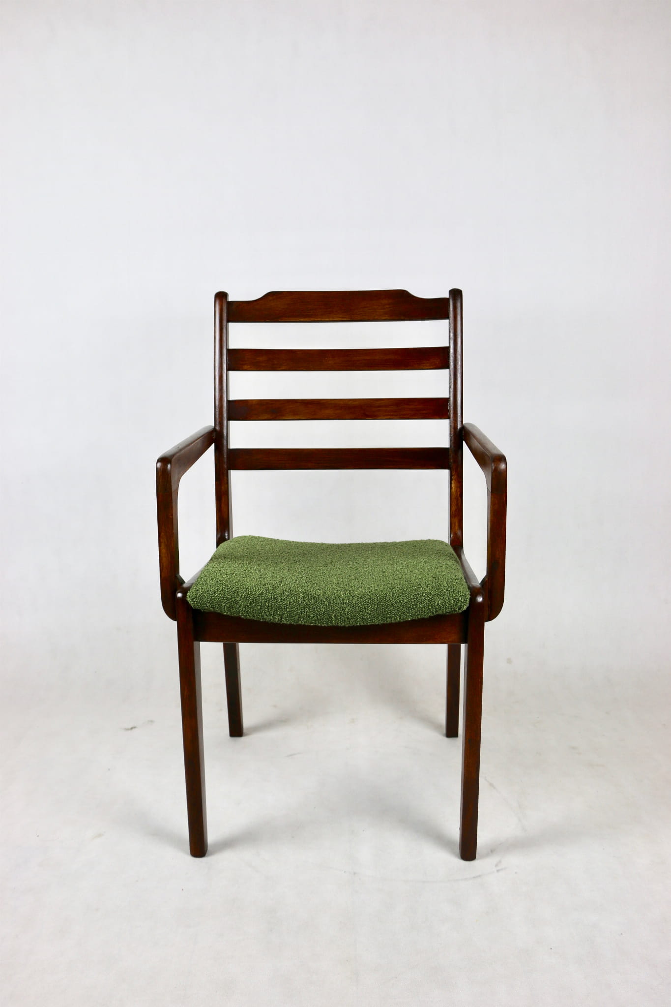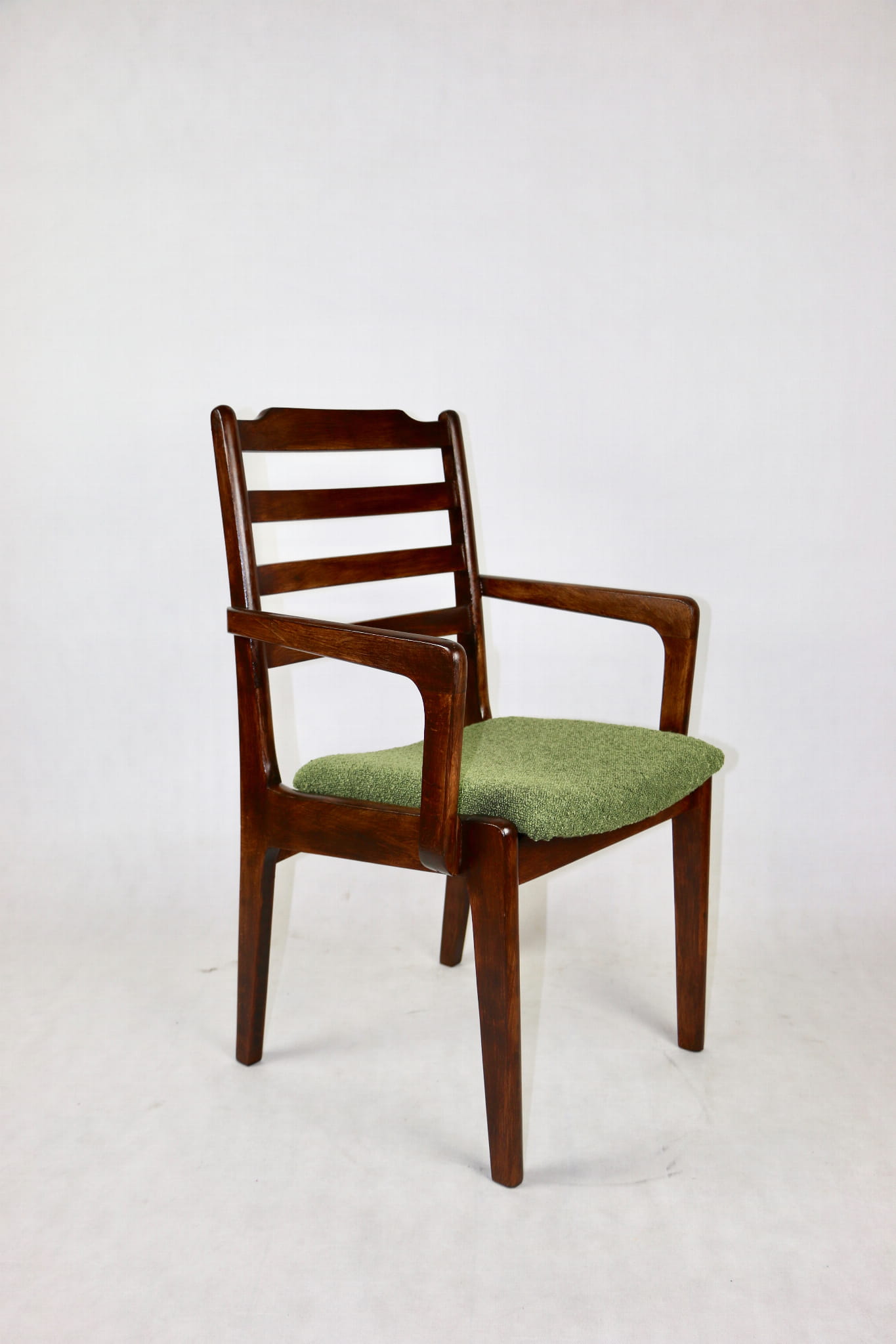 Zestaw 2 Krzeseł Vintage Loft w kolorze zielonym kompletnie odrestaurowane. Nowe obicie pokryte strukturalnym materiałem tapicerskim z serii boucle - Baloo. Stelaż drewniany w naturalnym ciemnym kolorze drewna.