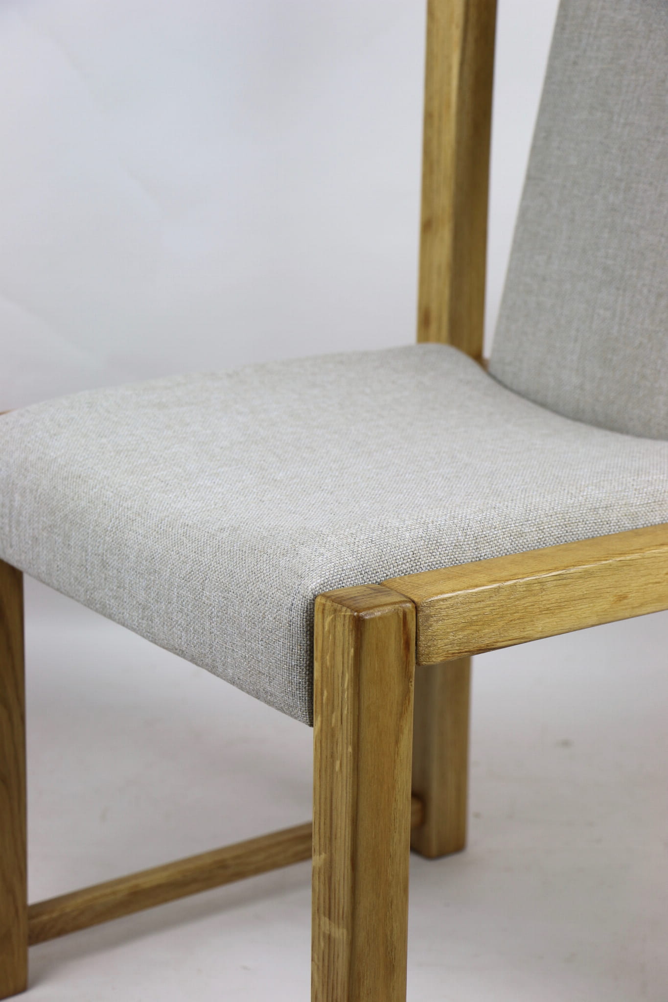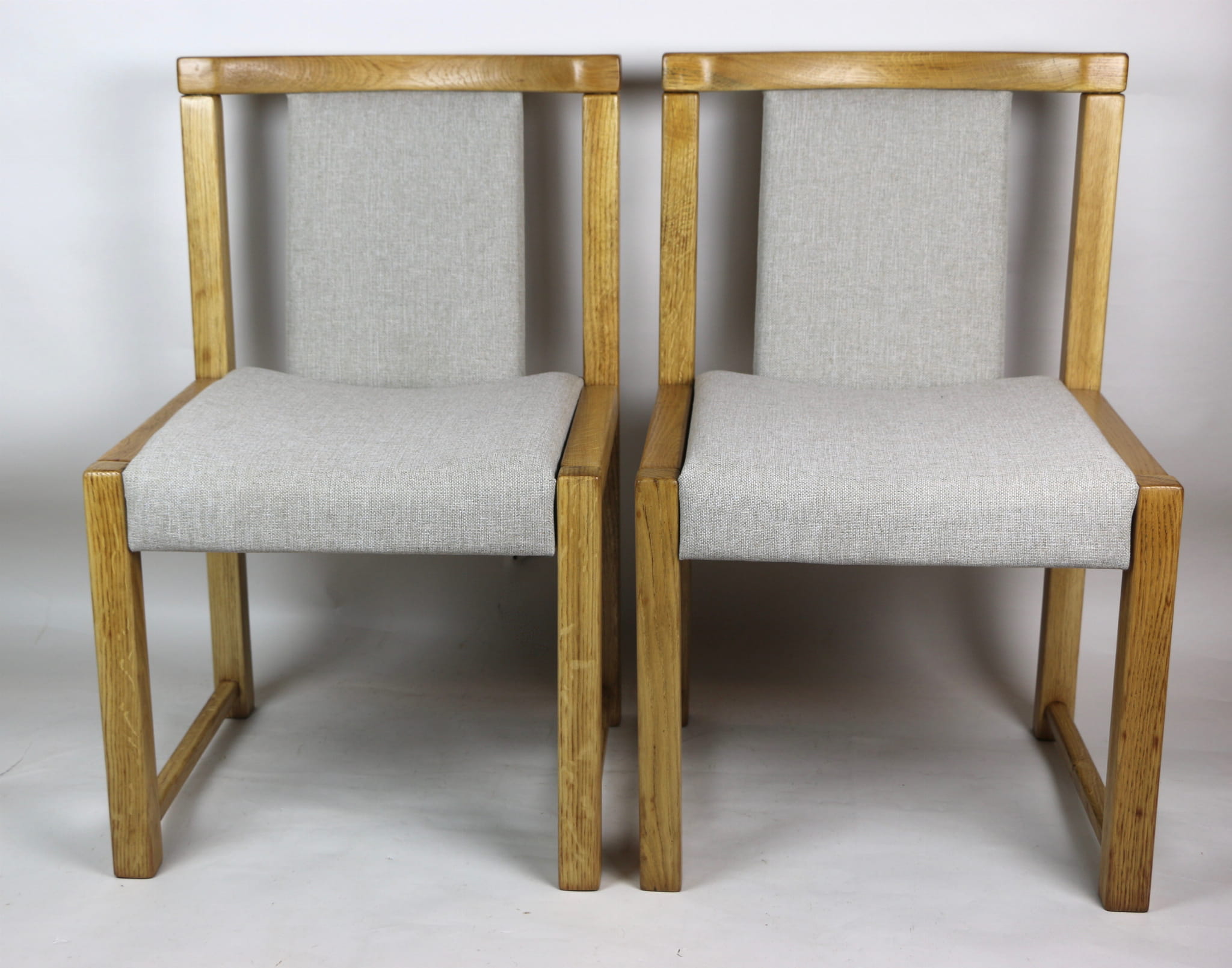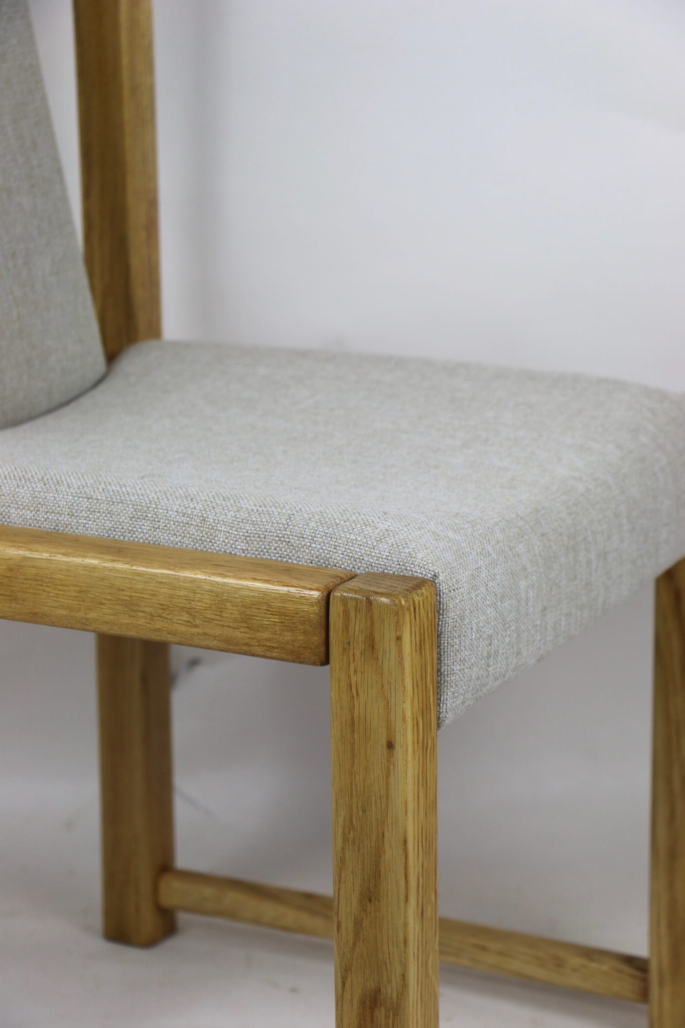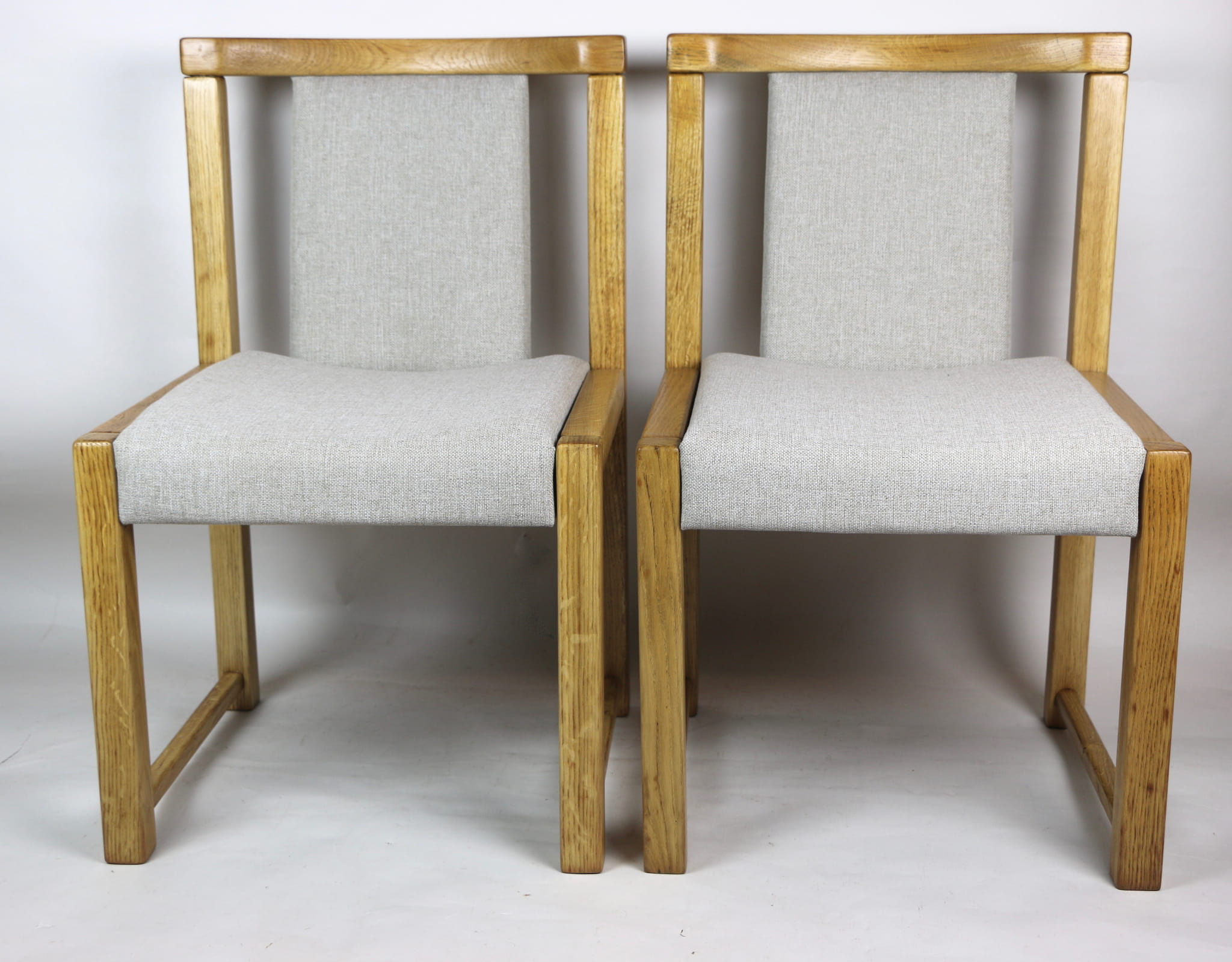 Kompletnie odrestaurowane designerskie dwa krzesła dębowe/ fotele z lat 70 tych. Nowe obicie pokryte strukturalnym materiałem tapicerskim w beżowym kolorze - tkanina naturalna. Stelaż drewniany dębowy w kolorze jasnego drewna pokryty lakierem.