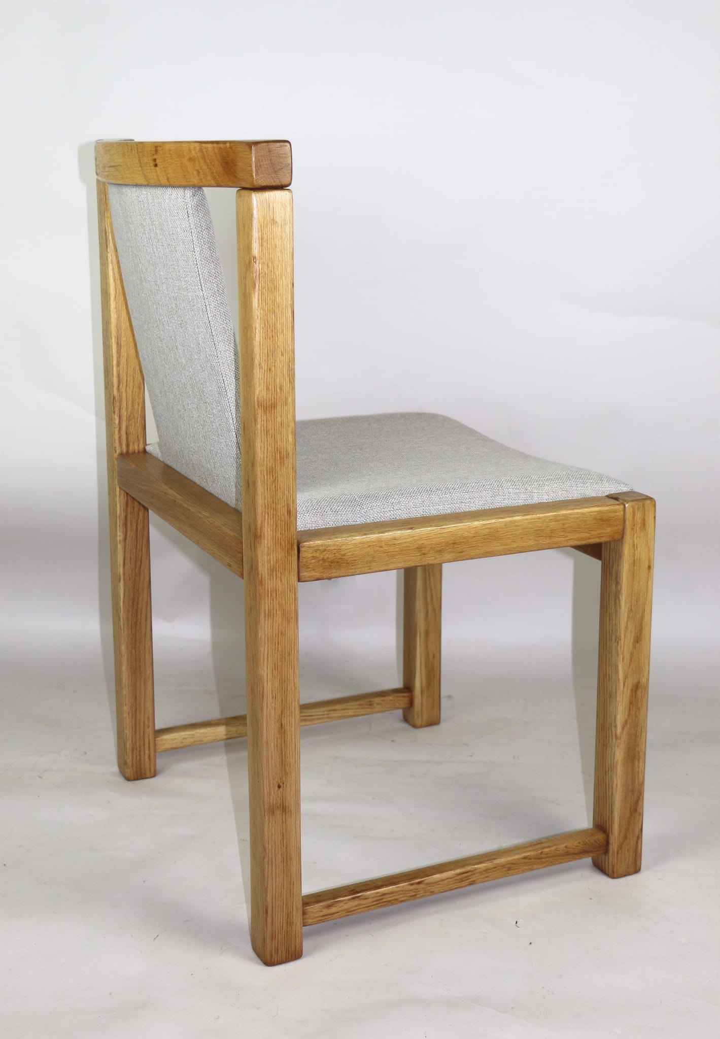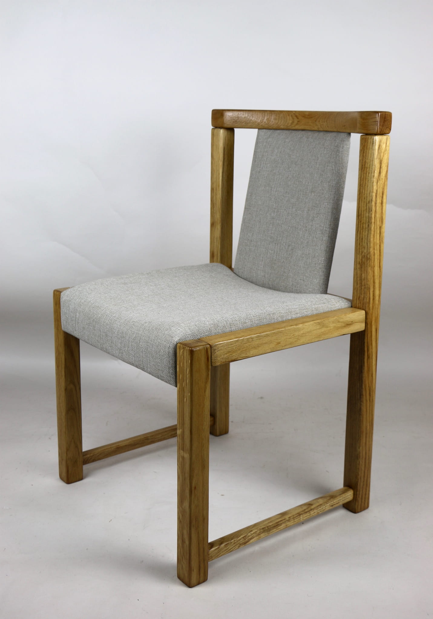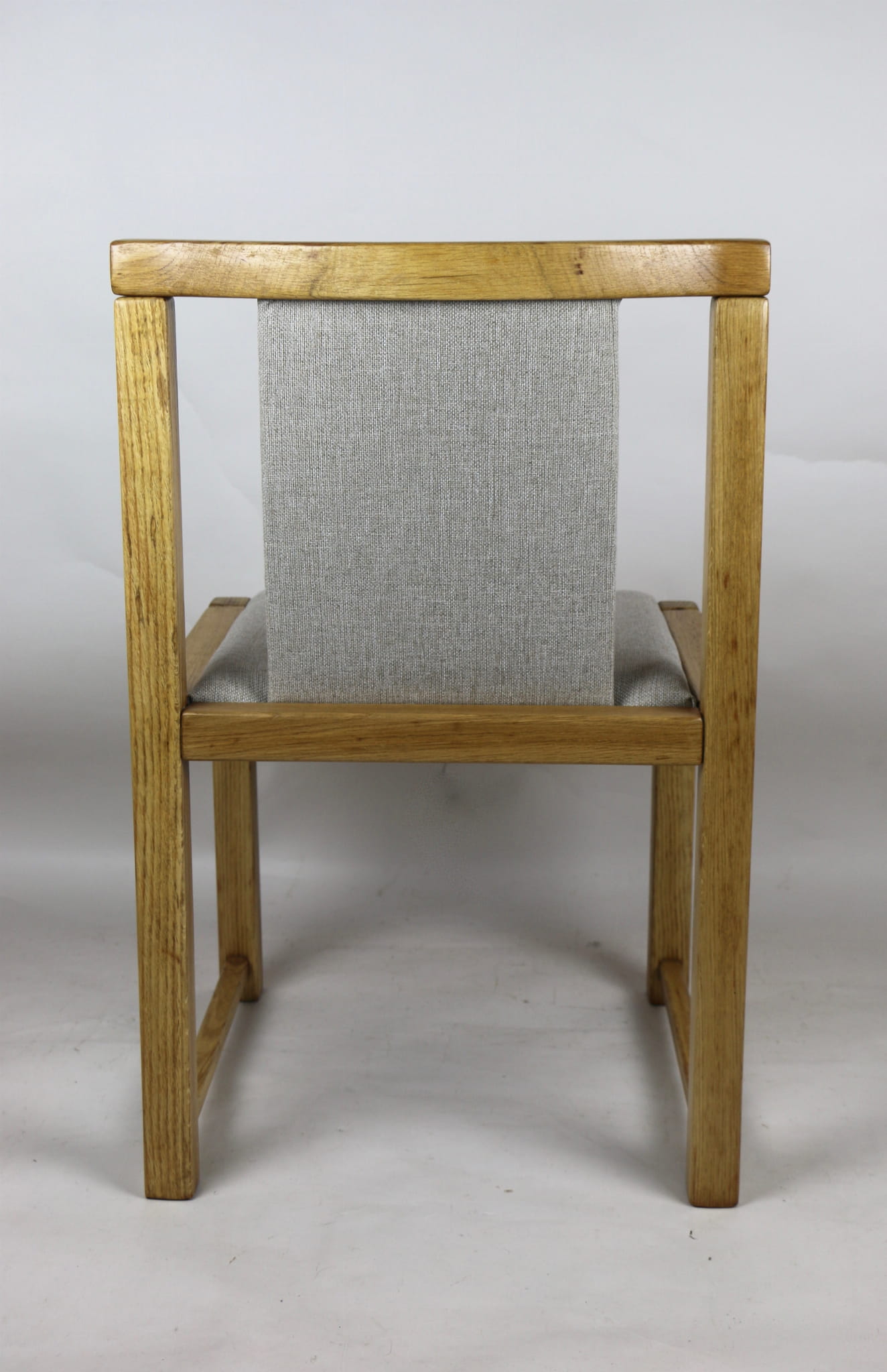 Kompletnie odrestaurowane designerskie dwa krzesła dębowe/ fotele z lat 70 tych. Nowe obicie pokryte strukturalnym materiałem tapicerskim w beżowym kolorze - tkanina naturalna. Stelaż drewniany dębowy w kolorze jasnego drewna pokryty lakierem.