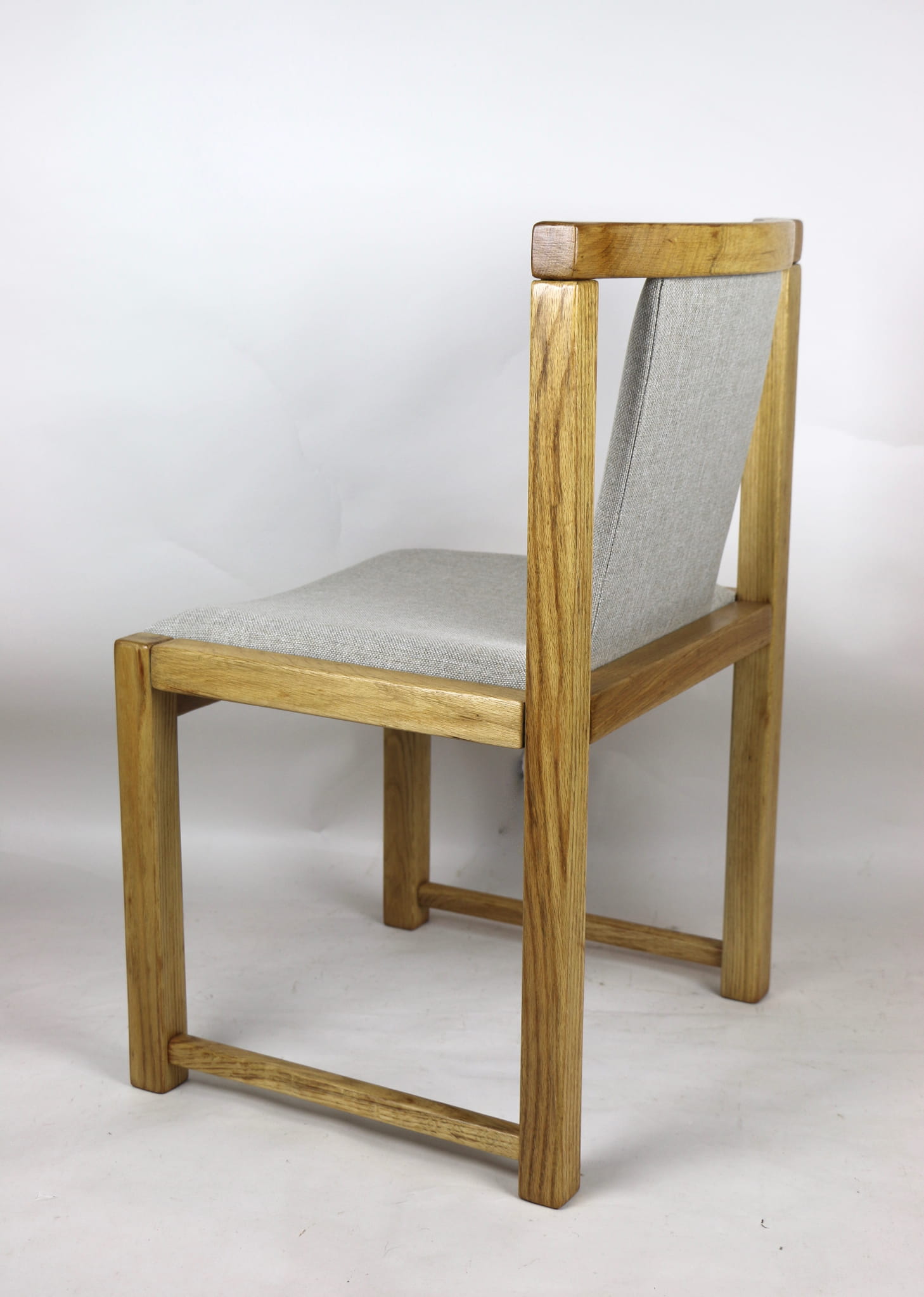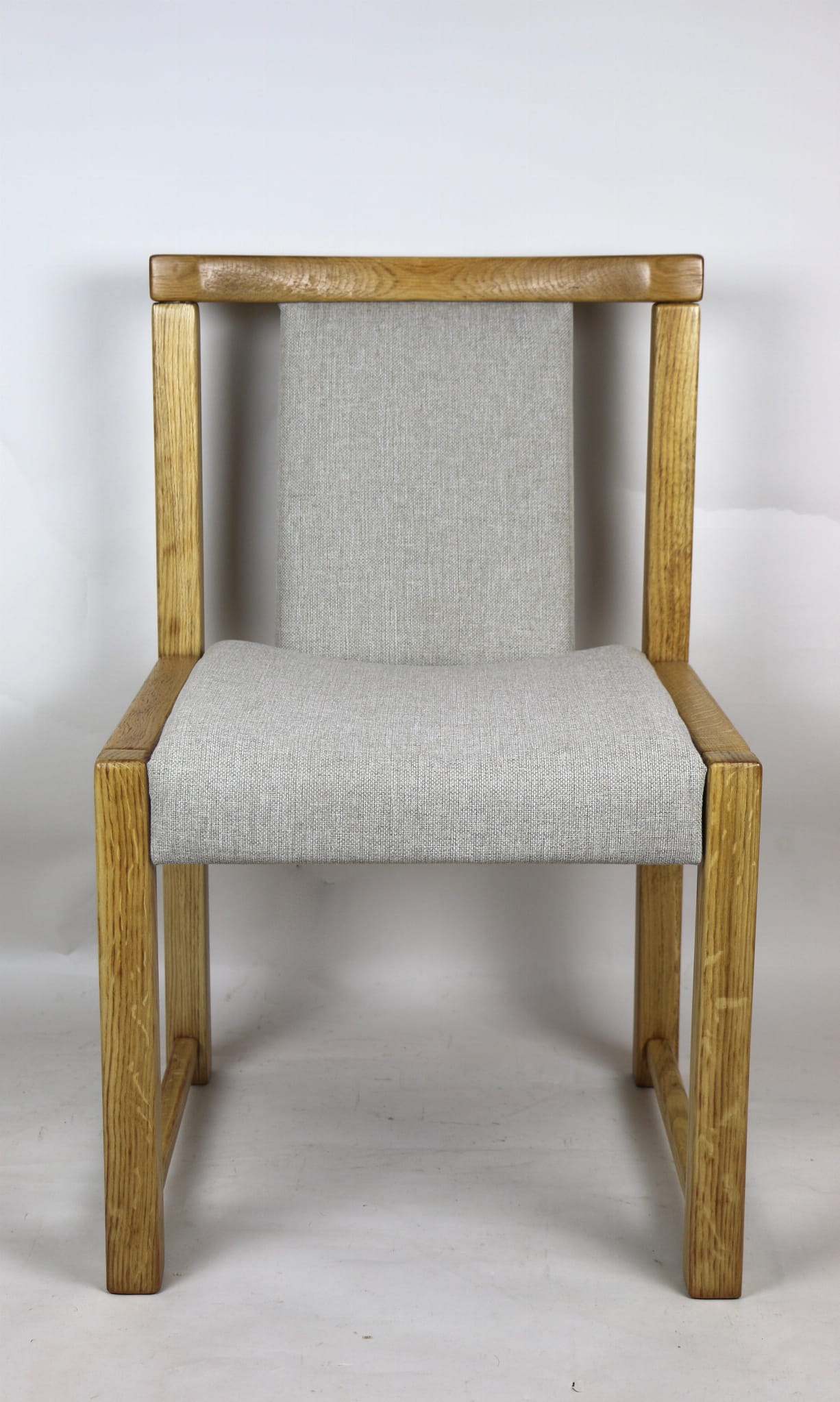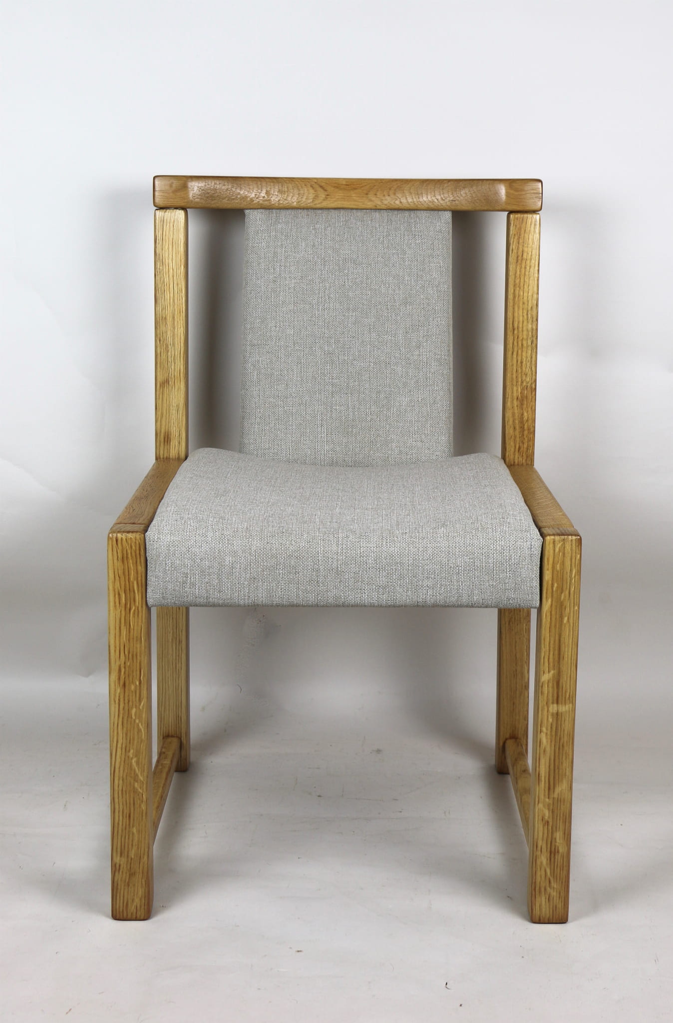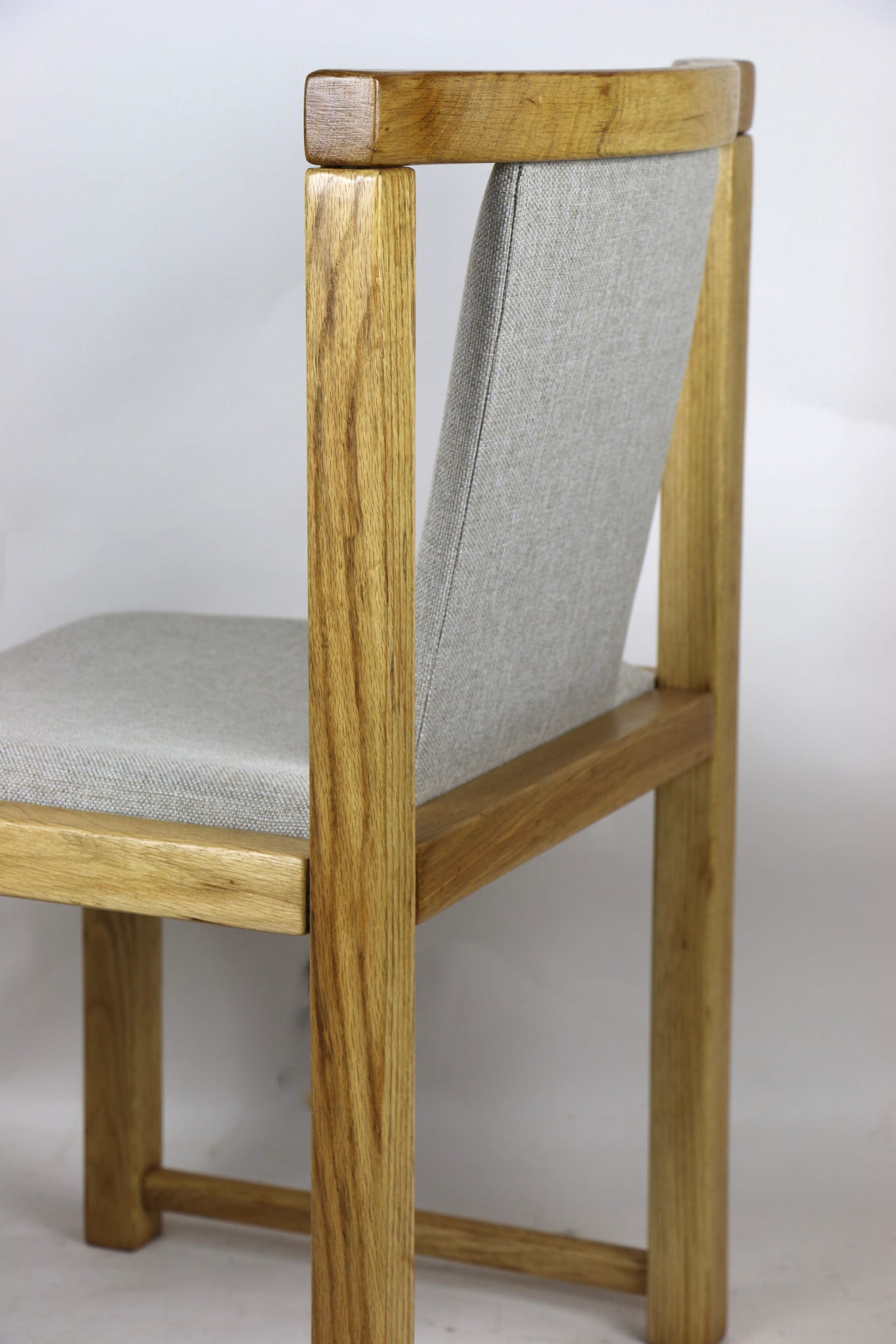 Kompletnie odrestaurowane designerskie dwa krzesła dębowe/ fotele z lat 70 tych. Nowe obicie pokryte strukturalnym materiałem tapicerskim w beżowym kolorze - tkanina naturalna. Stelaż drewniany dębowy w kolorze jasnego drewna pokryty lakierem.