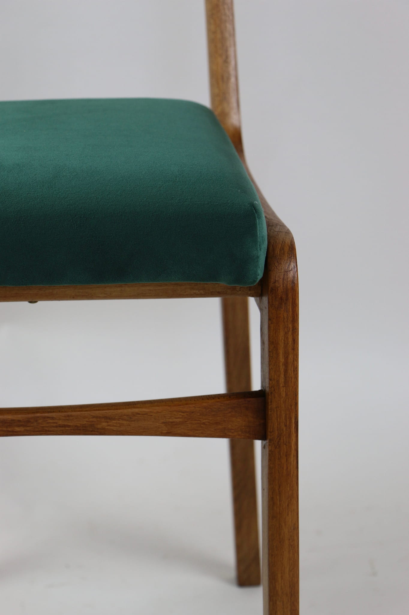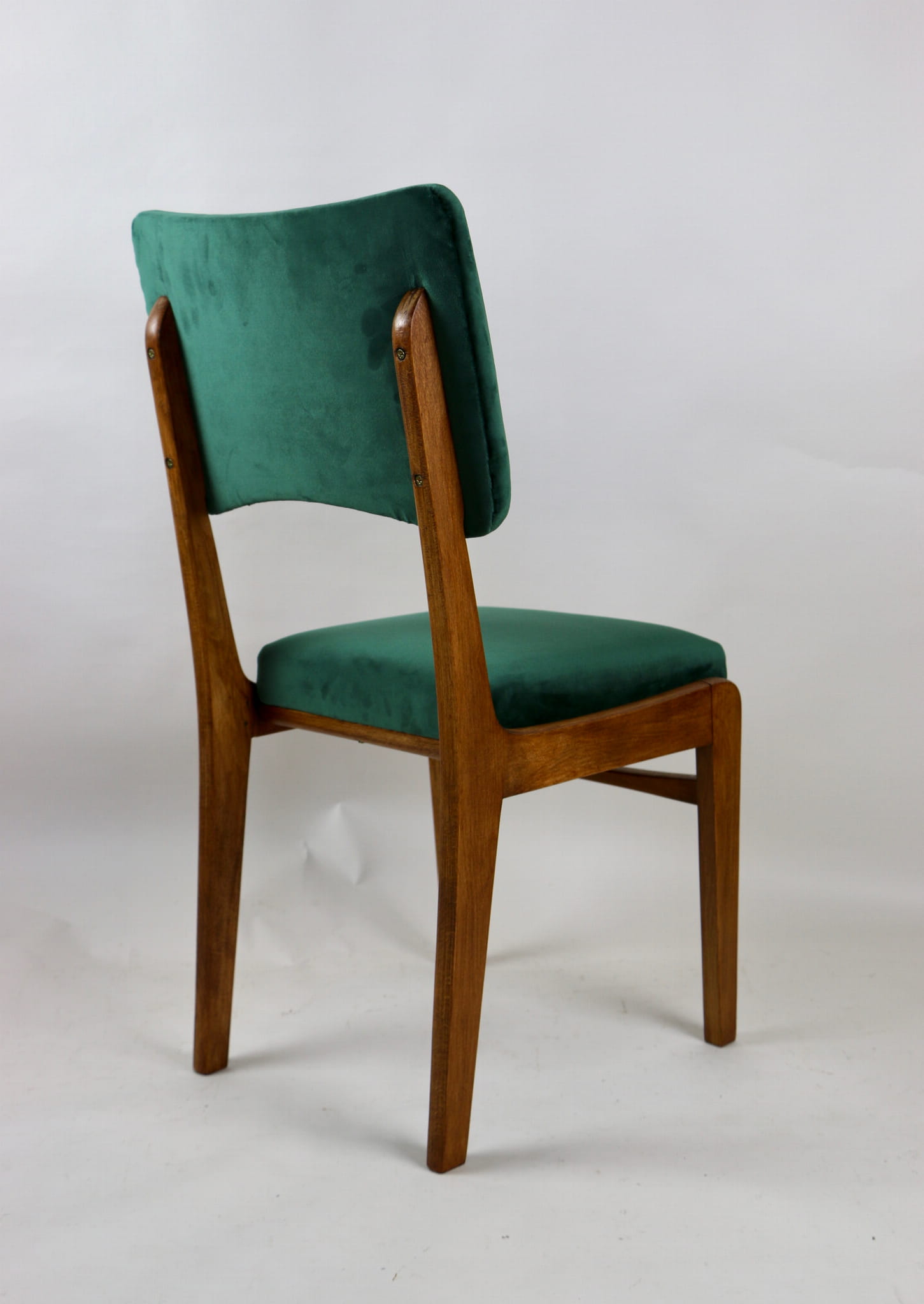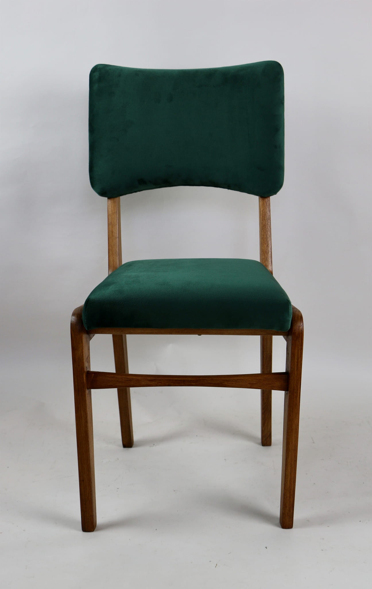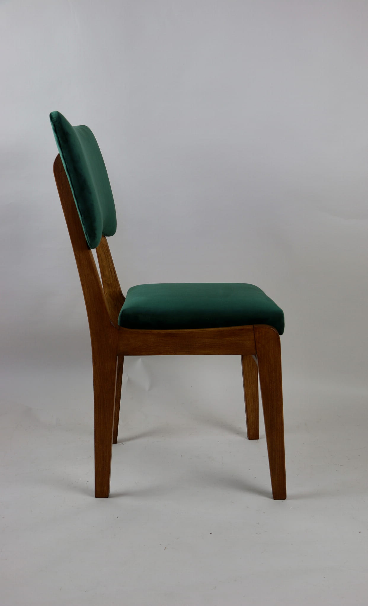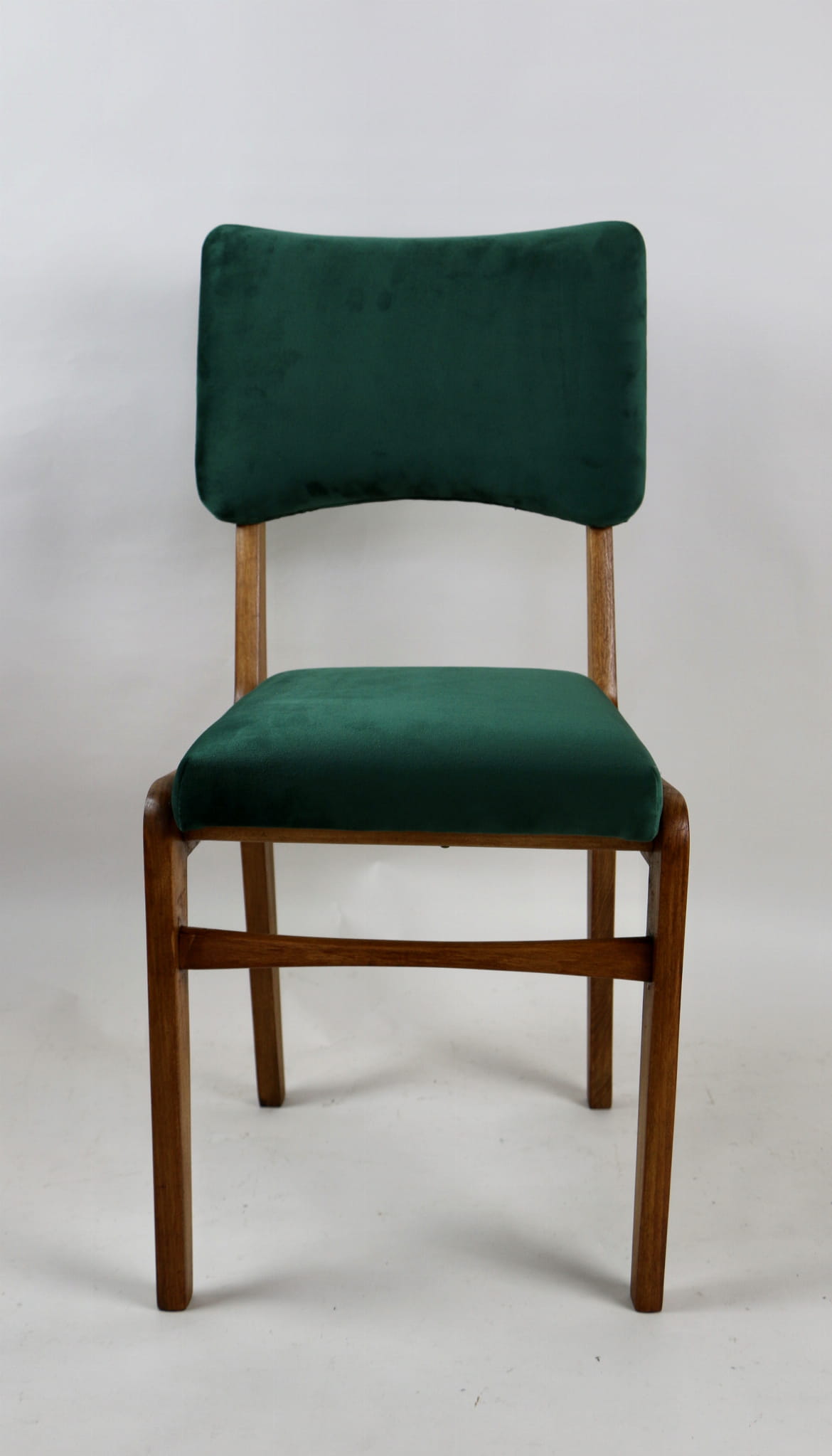 Kompletnie odrestaurowane oryginalne krzesło Hałas z lat 70 tych. Nowe obicie pokryte aksamitnym materiałem tapicerskim w kolorze zielonym. Stelaż drewniany w kolorze jasnego drewna.