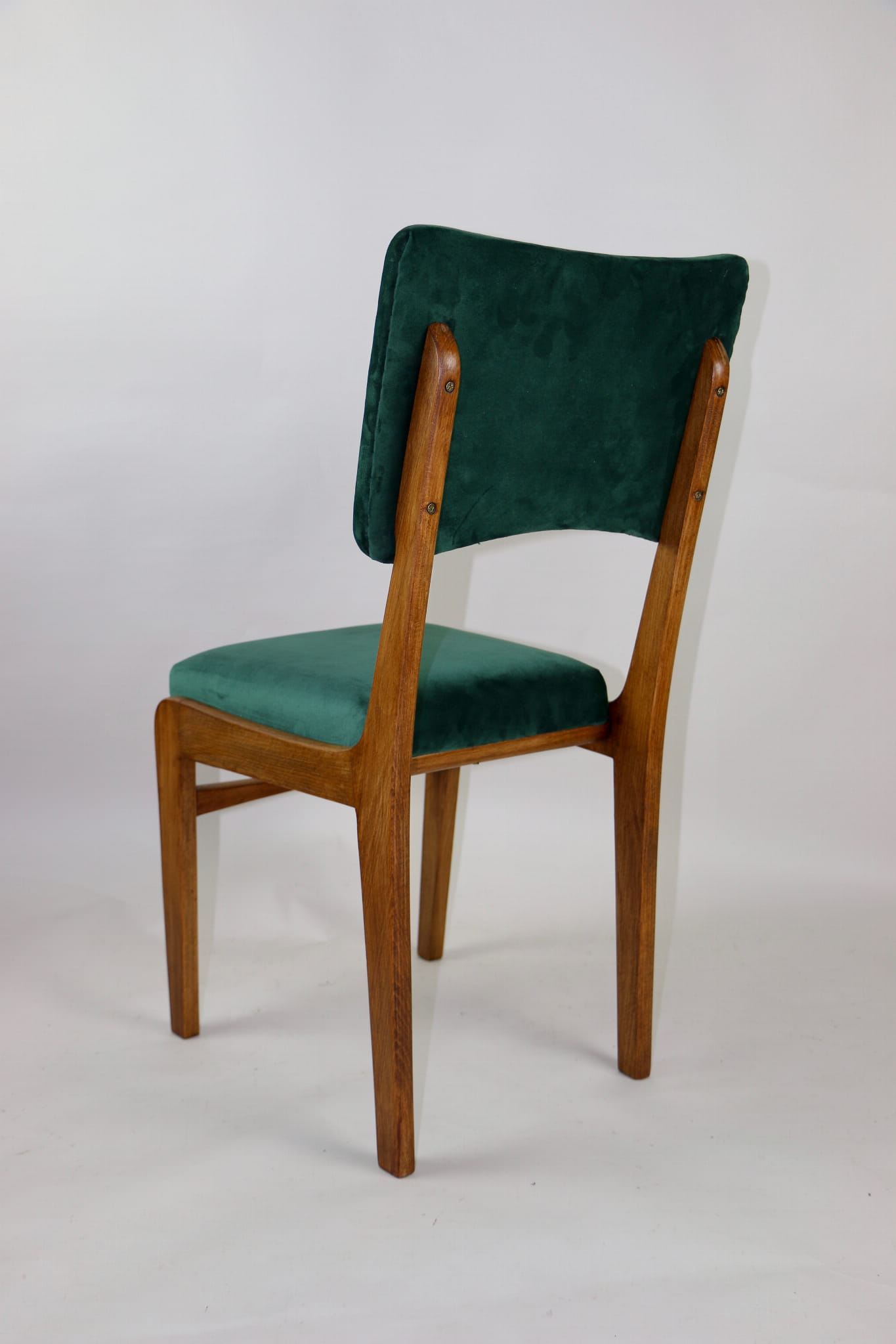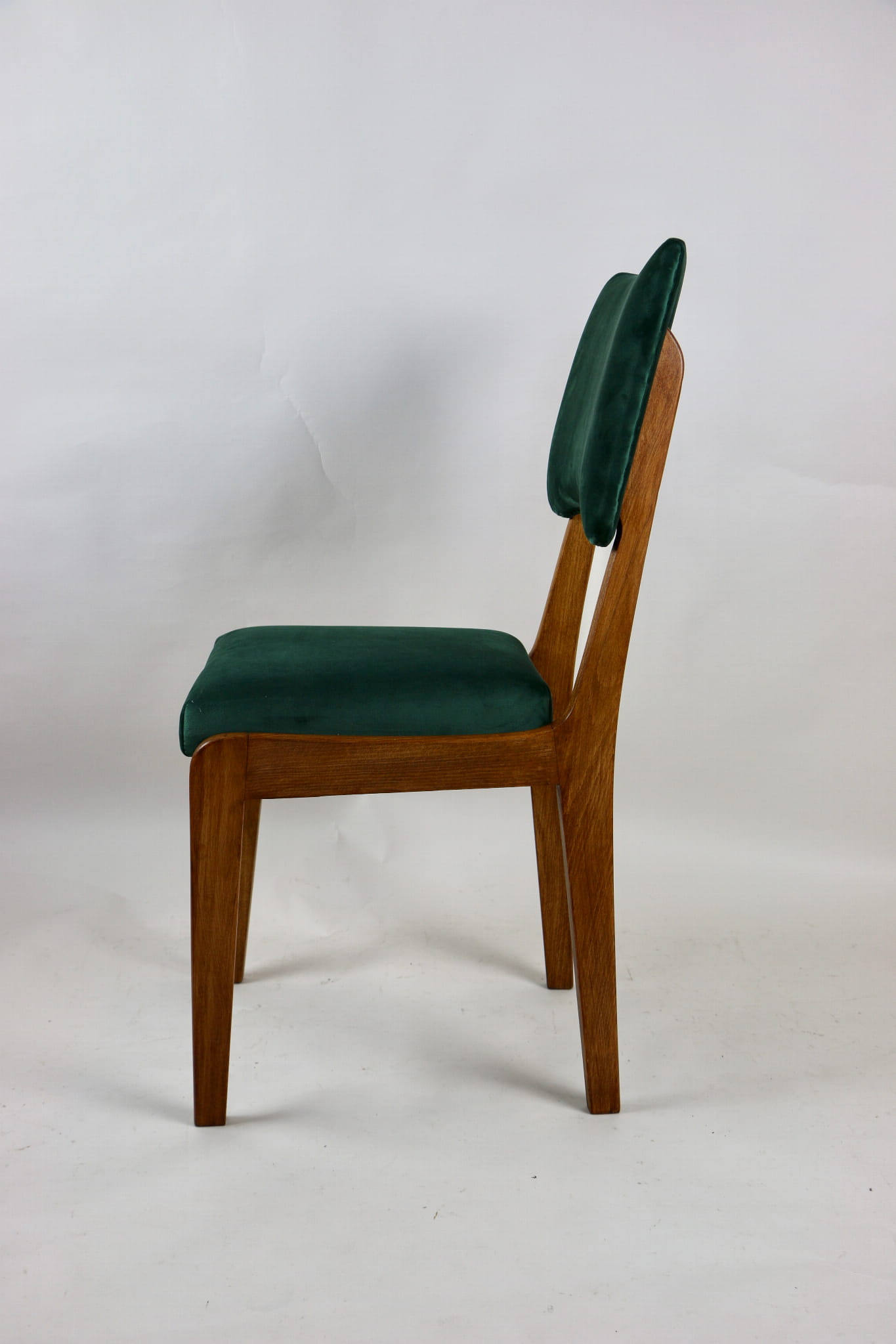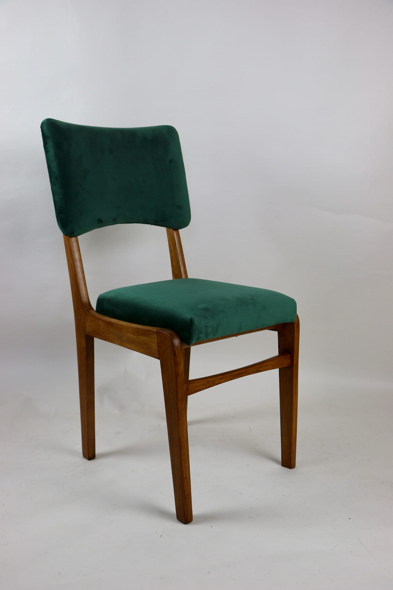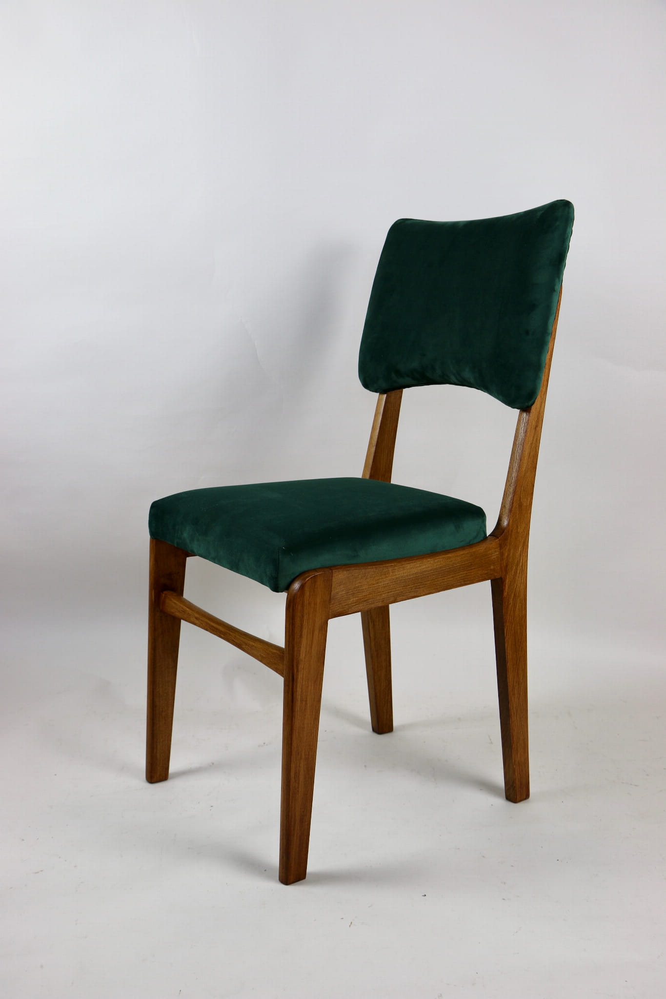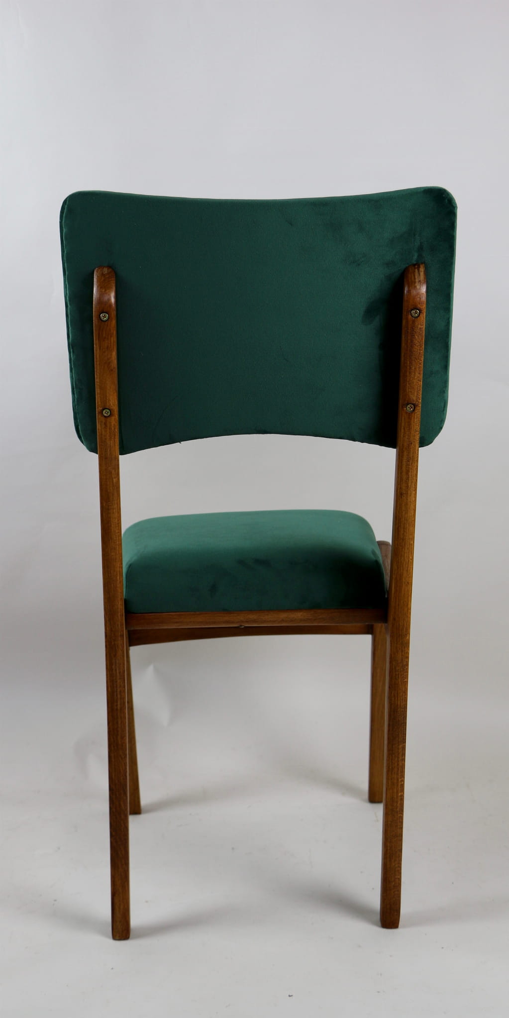 Kompletnie odrestaurowane oryginalne krzesło Hałas z lat 70 tych. Nowe obicie pokryte aksamitnym materiałem tapicerskim w kolorze zielonym. Stelaż drewniany w kolorze jasnego drewna.