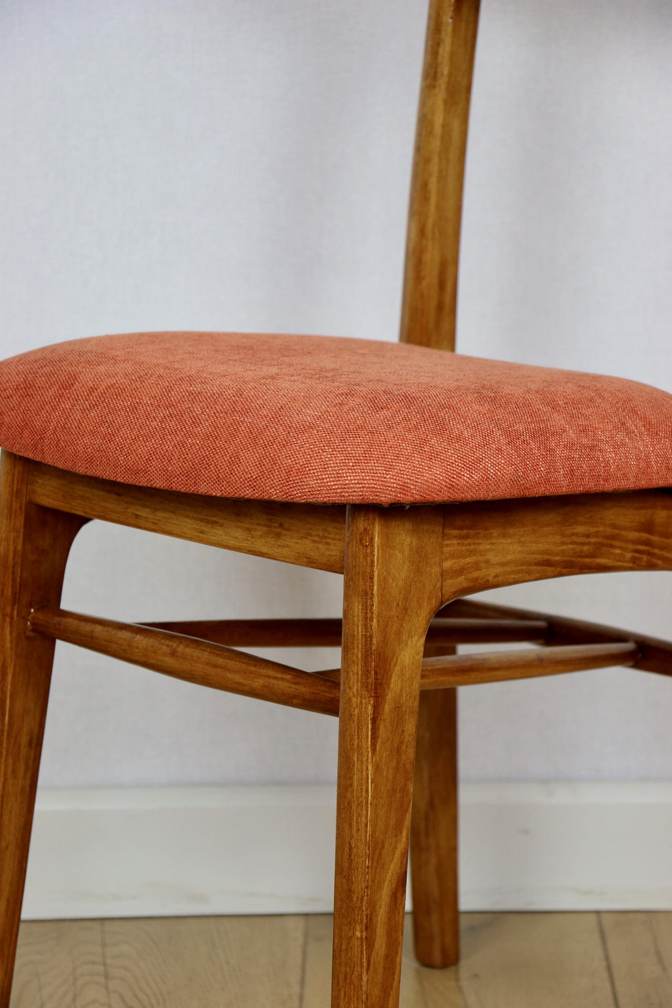Nowe obicie pokryte strukturalnym materiałem tapicerskim w kolorze ceglastym/ terakota w tkaninie naturalnej.