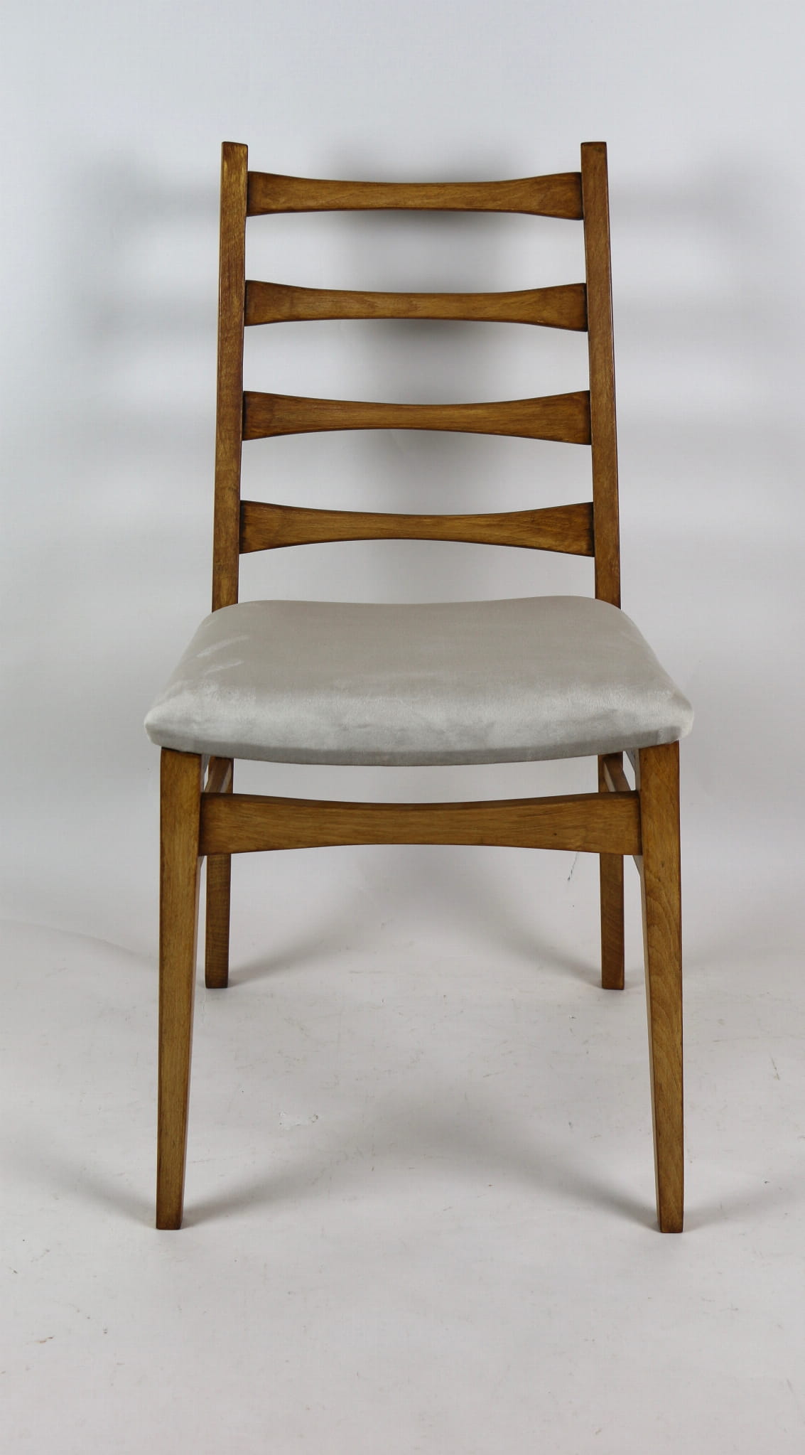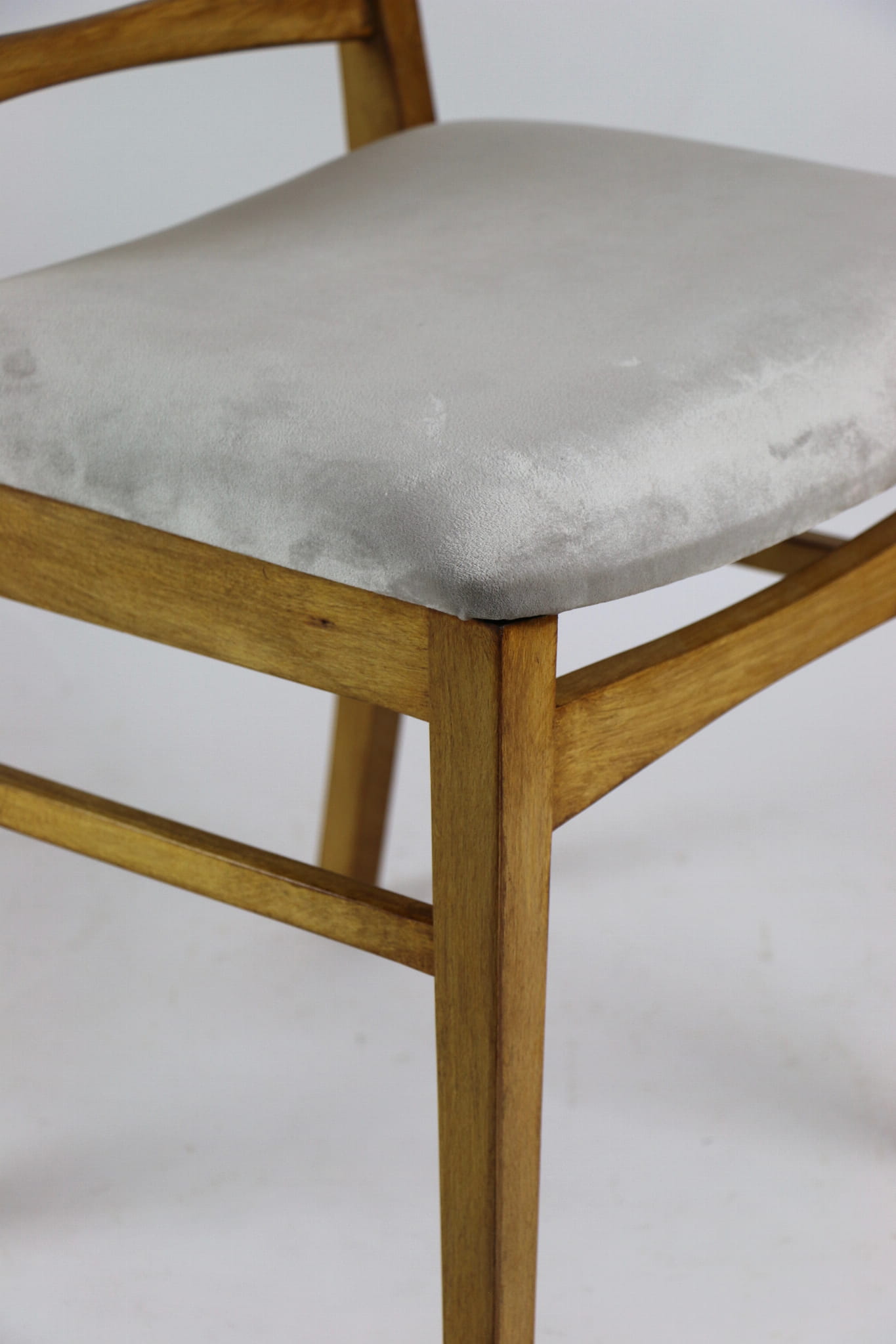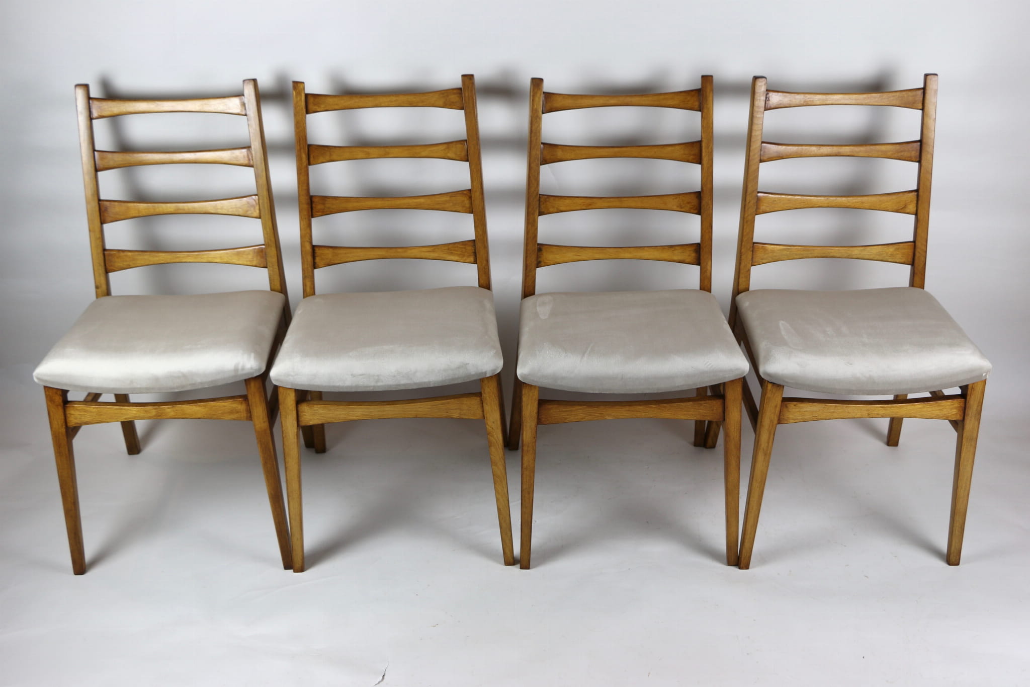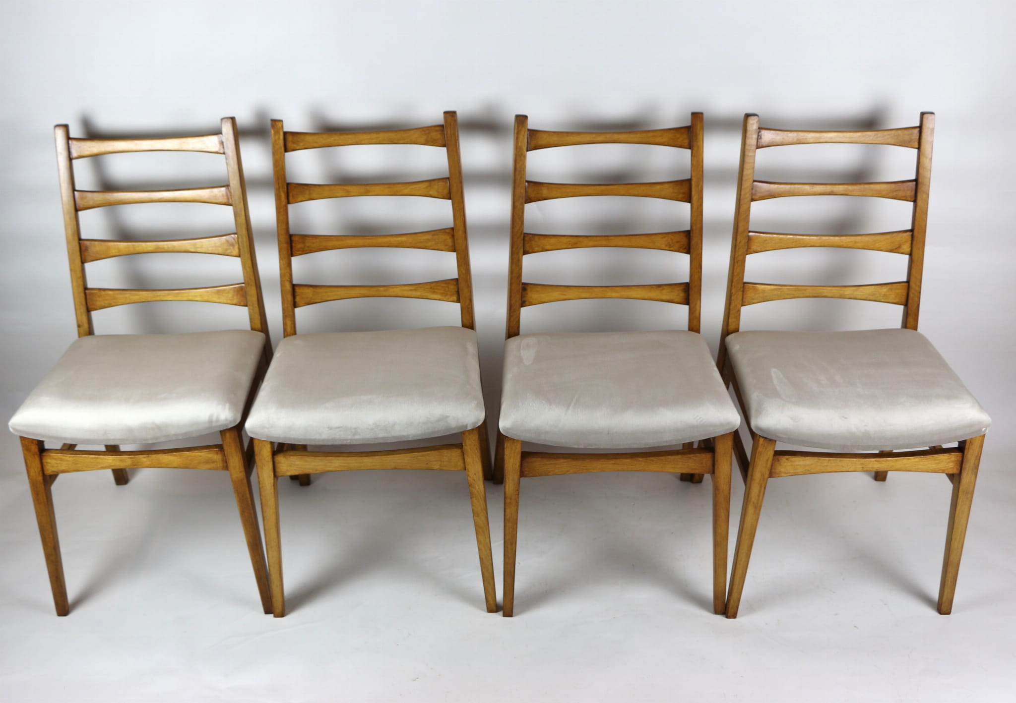 Kompletnie odrestaurowane designerskie cztery krzesła. Nowe obicie pokryte aksamitnym materiałem tapicerskim w beżowym kolorze - tkanina Quartz. Stelaż drewniany w kolorze jasnego drewna.