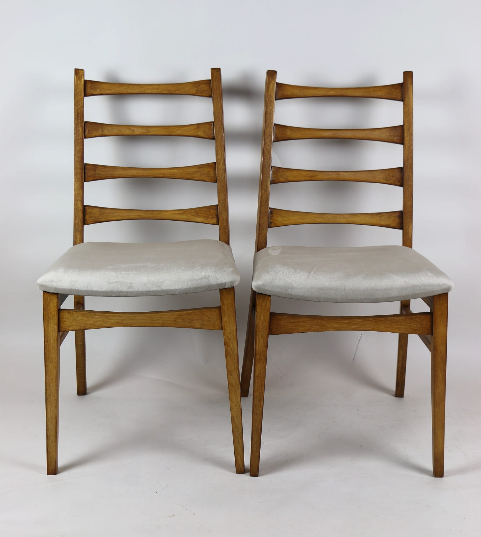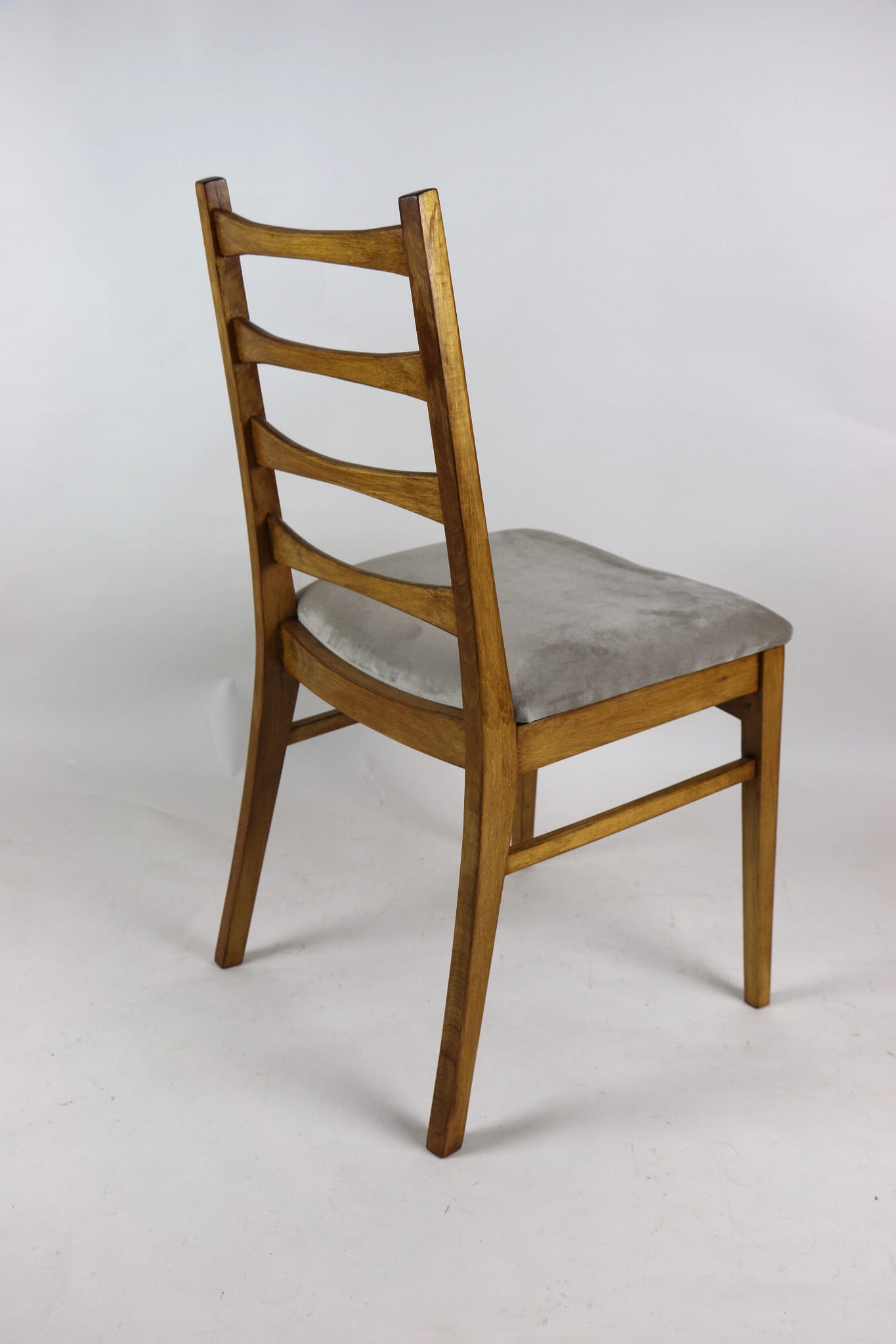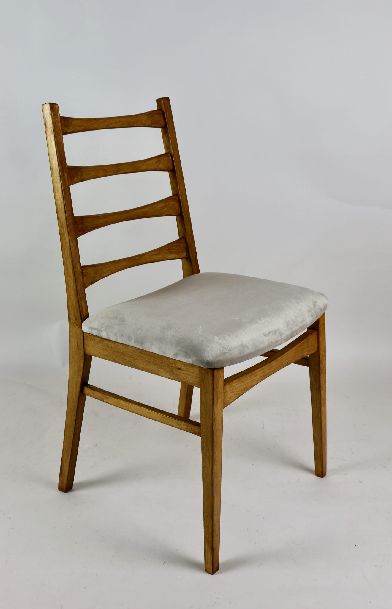 Kompletnie odrestaurowane designerskie cztery krzesła. Nowe obicie pokryte aksamitnym materiałem tapicerskim w beżowym kolorze - tkanina Quartz. Stelaż drewniany w kolorze jasnego drewna.