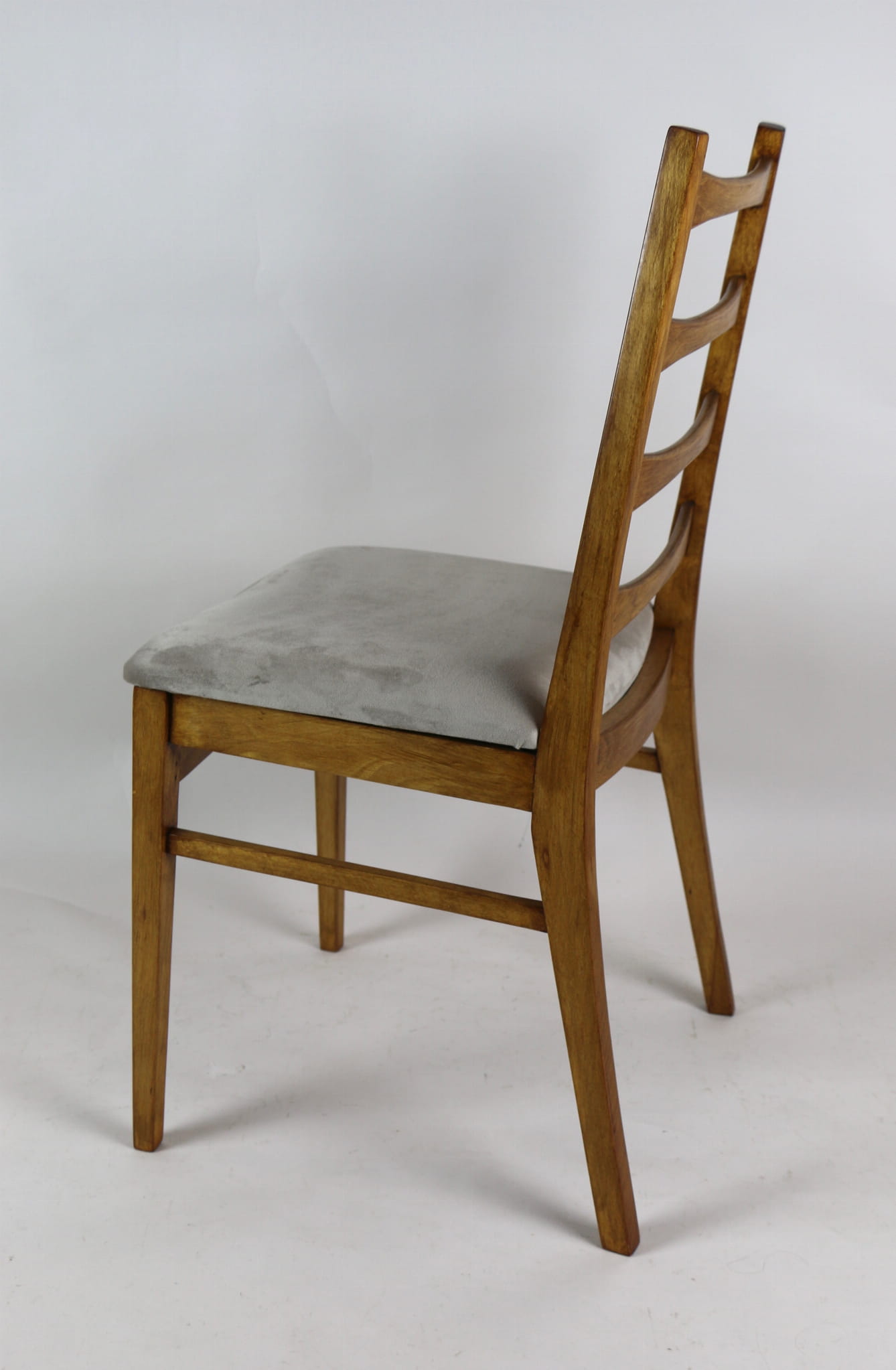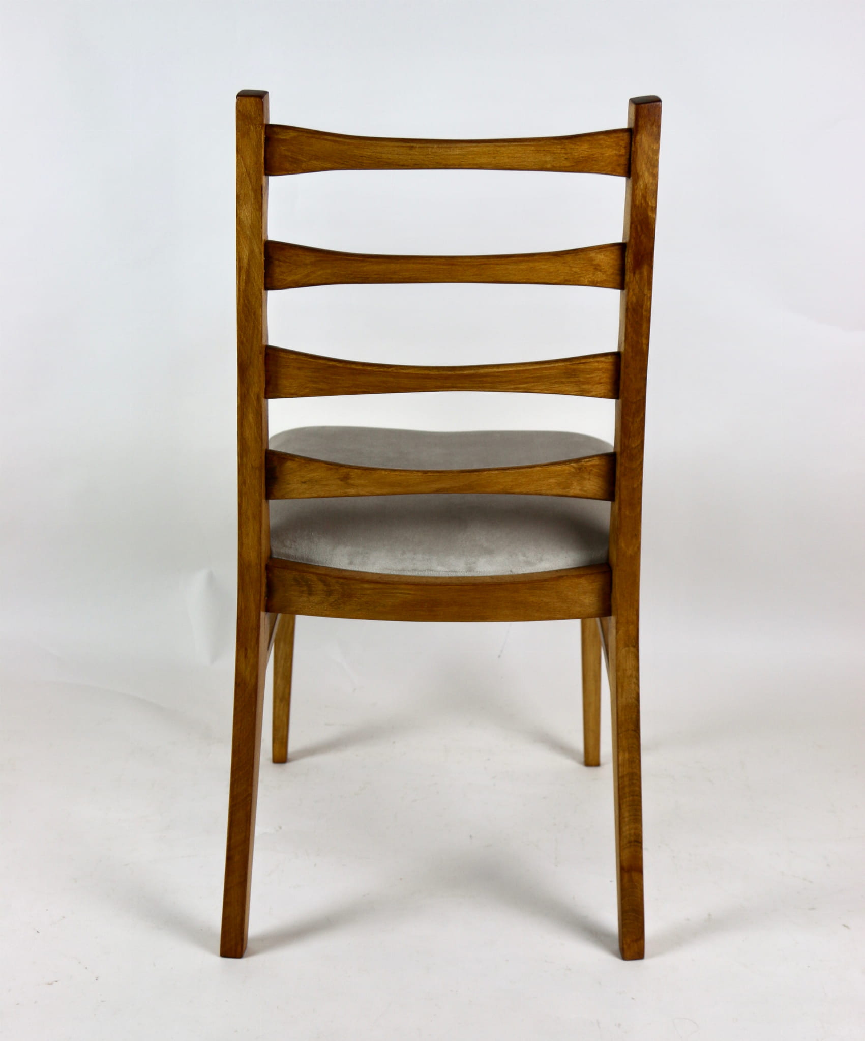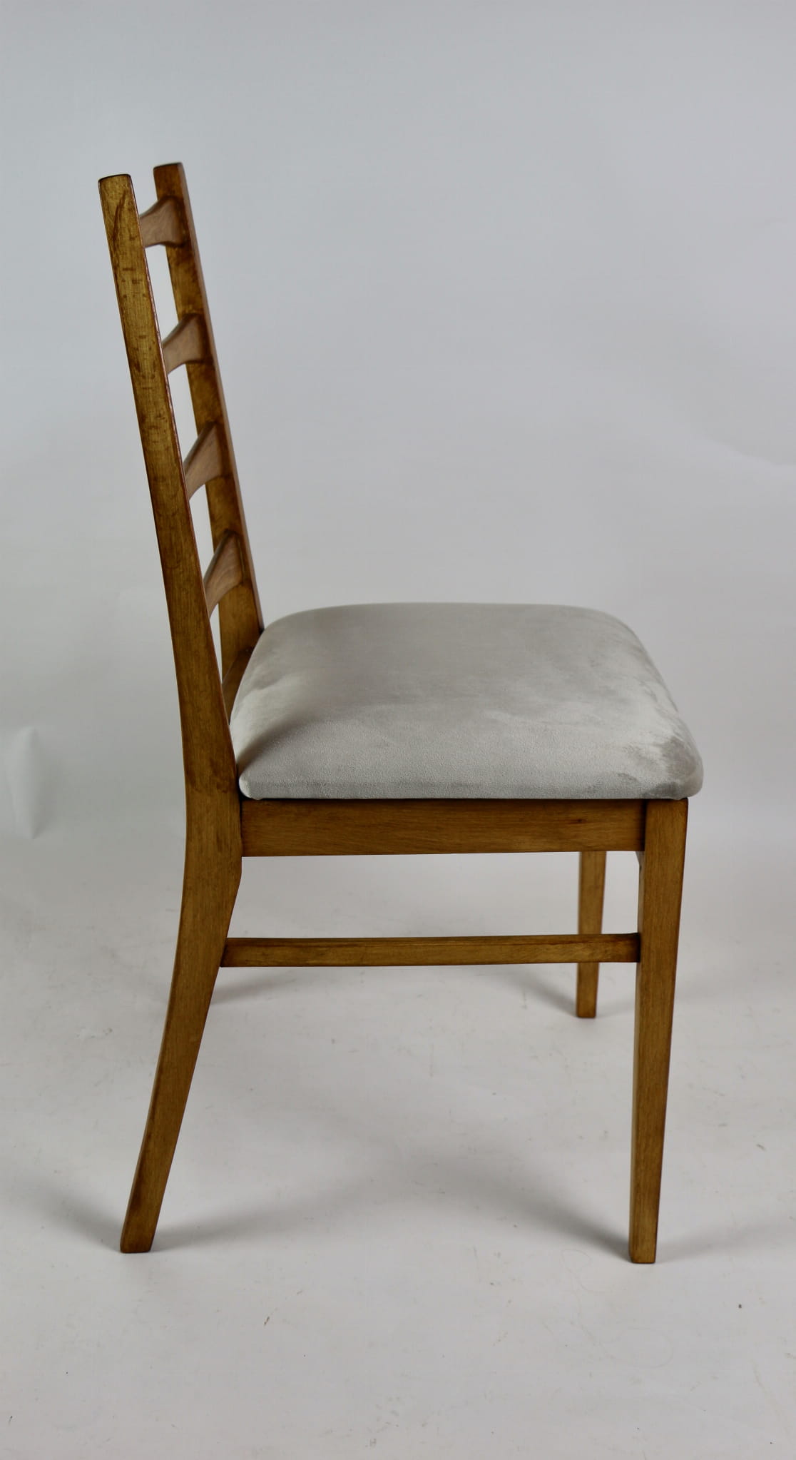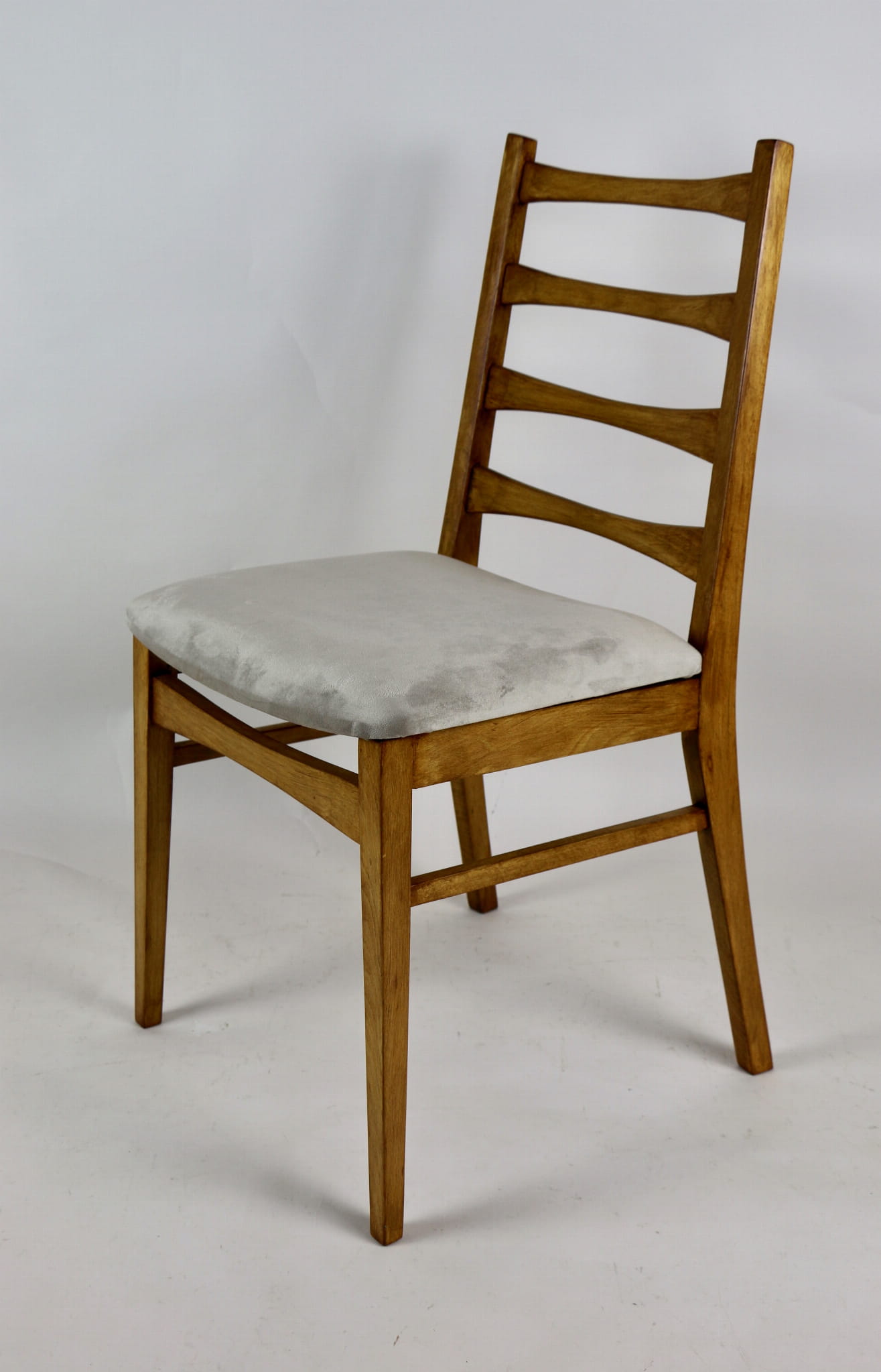 Kompletnie odrestaurowane designerskie cztery krzesła. Nowe obicie pokryte aksamitnym materiałem tapicerskim w beżowym kolorze - tkanina Quartz. Stelaż drewniany w kolorze jasnego drewna.