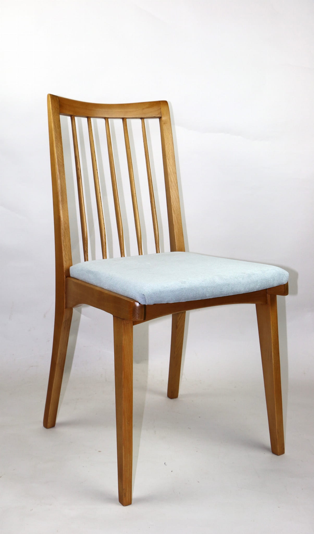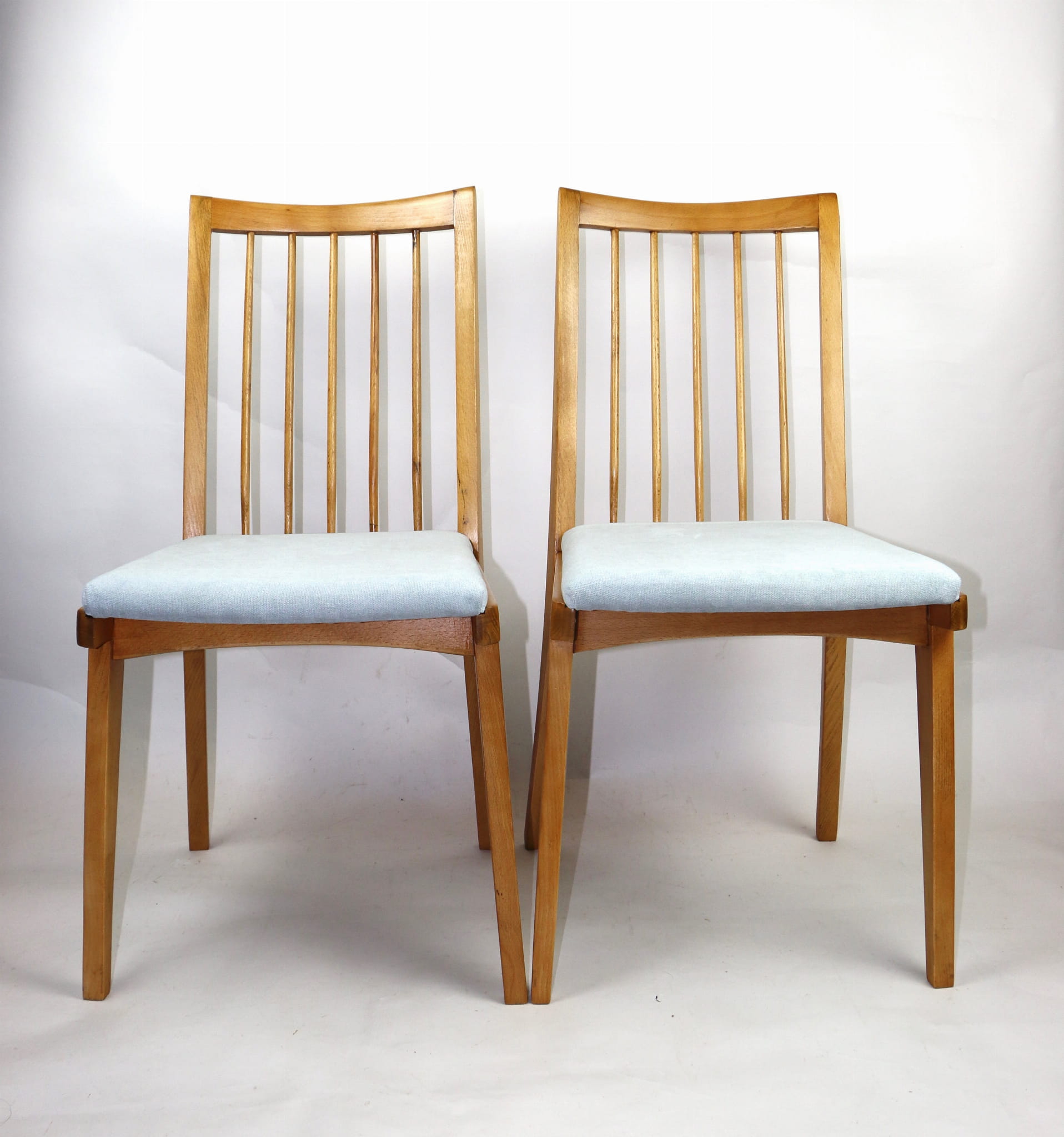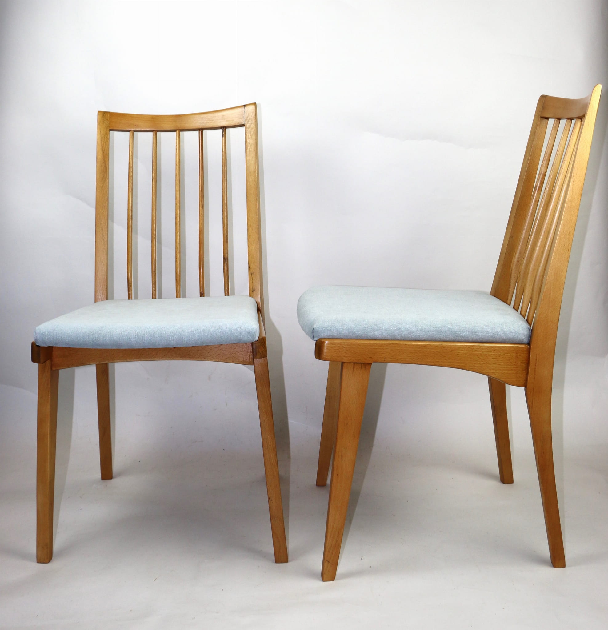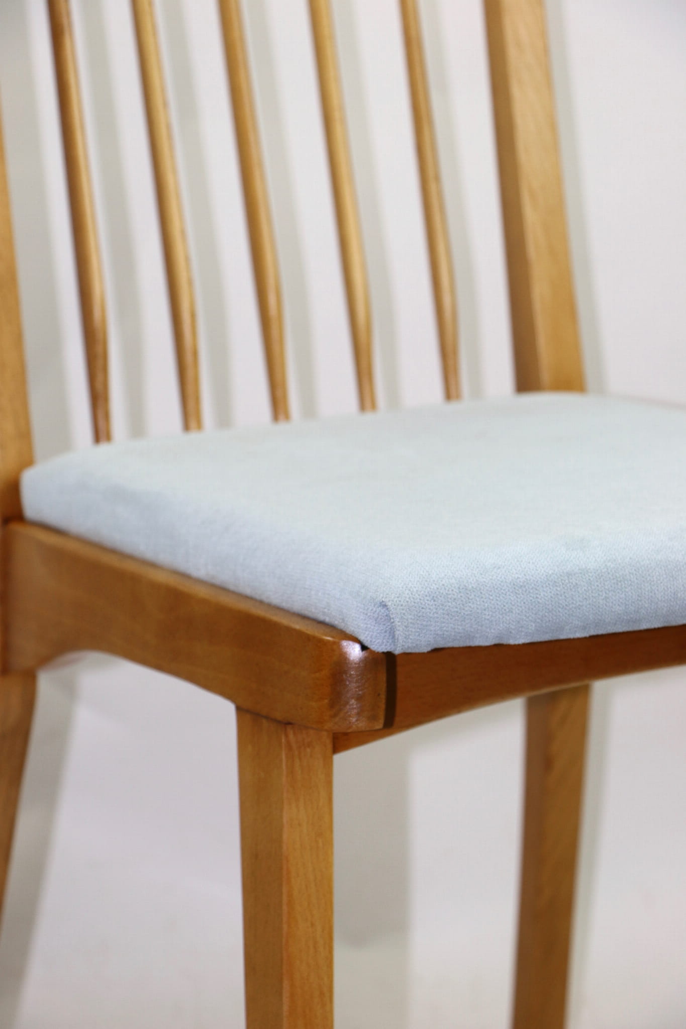 Kompletnie odrestaurowane designerskie dwa krzesła z lat 70 tych. Nowe obicie pokryte strukturalnym materiałem tapicerskim w seledynowo - szarym kolorze - tkanina Symphony Mills. Stelaż drewniany w kolorze jasnego drewna pokryty lakierem.