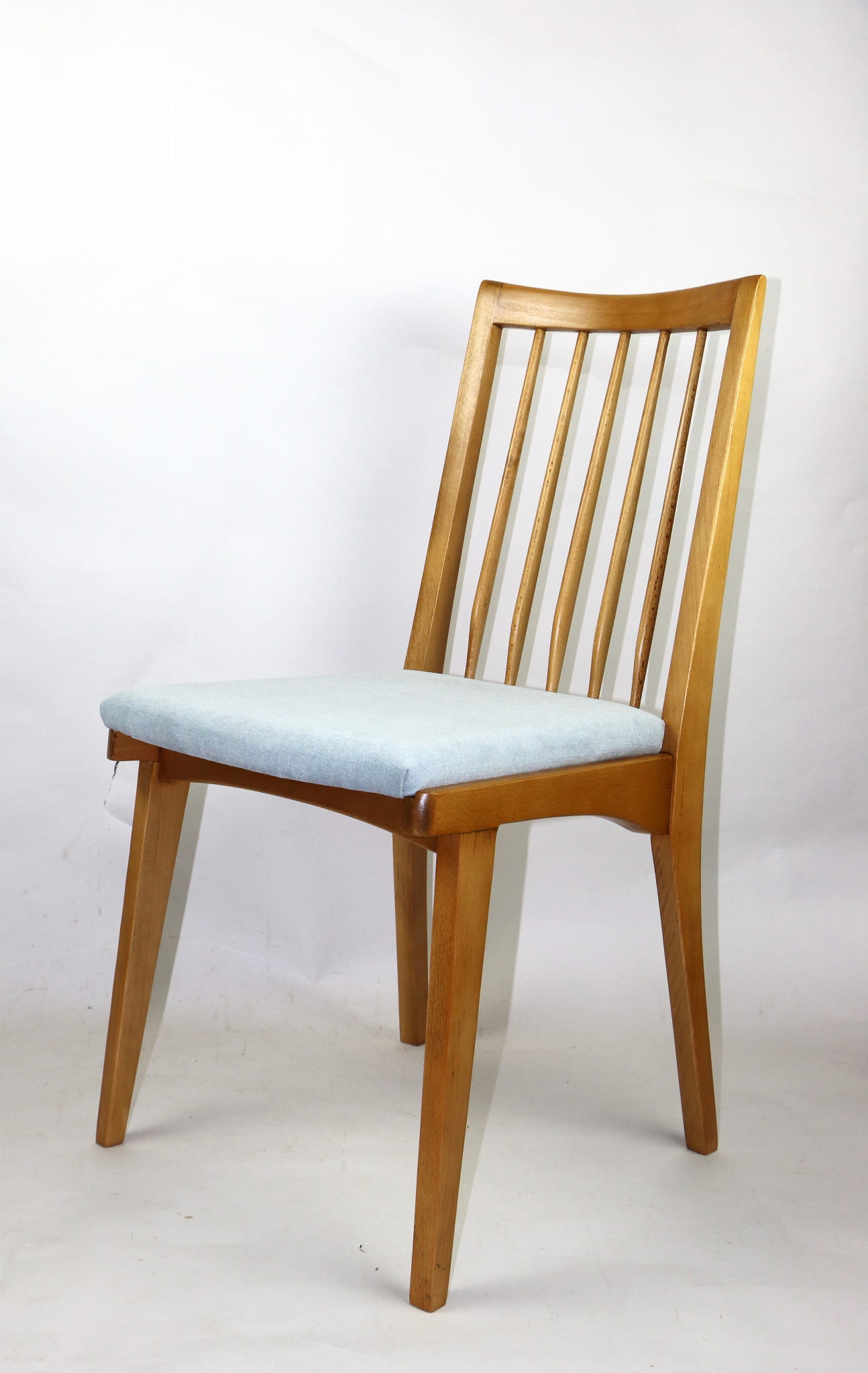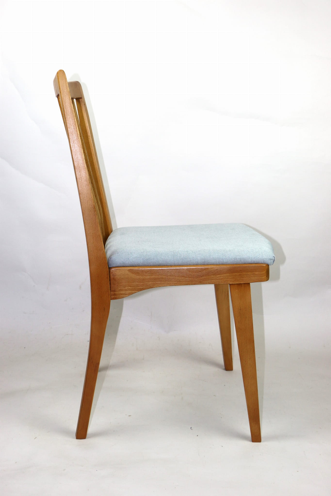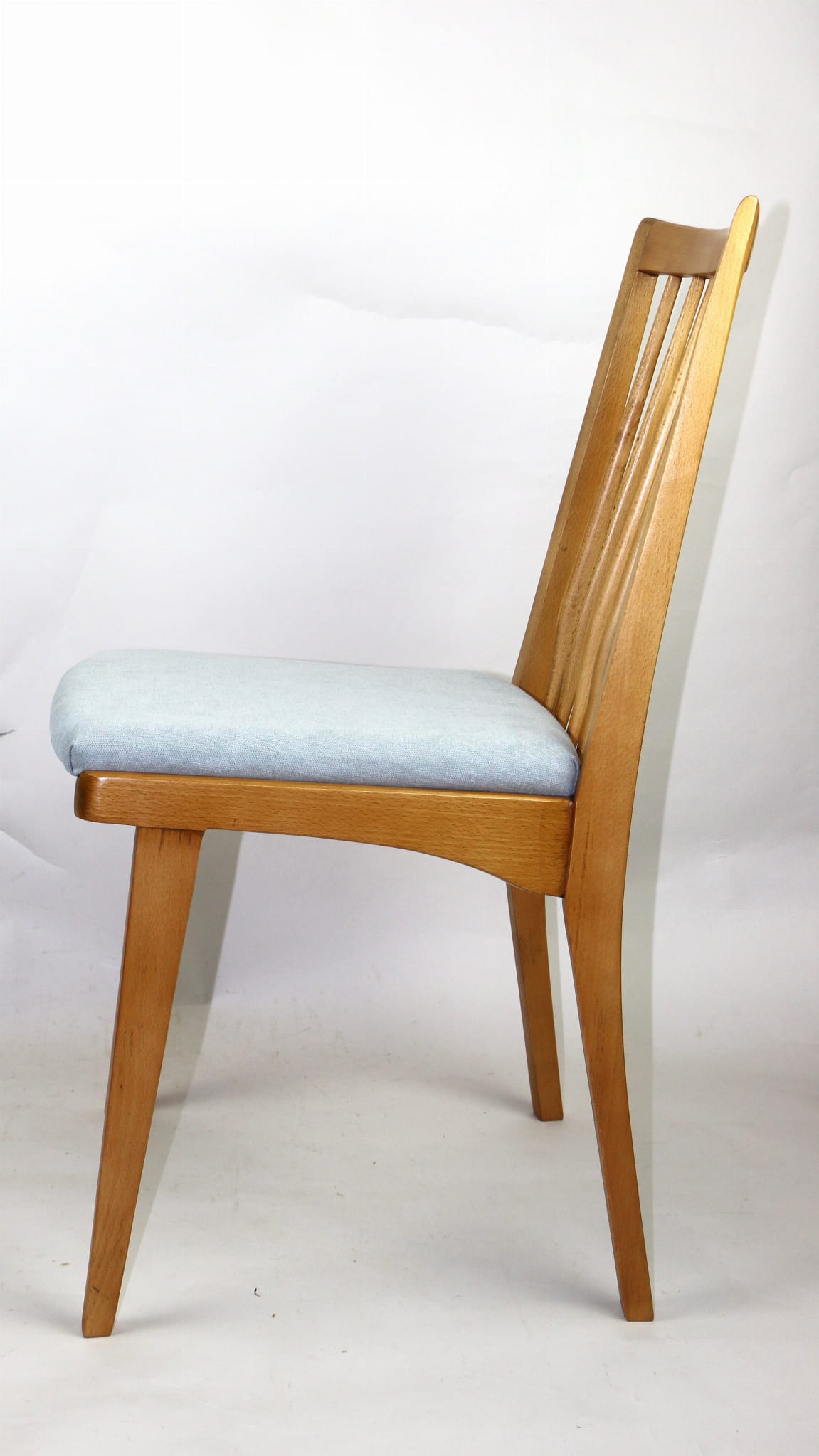 Kompletnie odrestaurowane designerskie dwa krzesła z lat 70 tych. Nowe obicie pokryte strukturalnym materiałem tapicerskim w seledynowo - szarym kolorze - tkanina Symphony Mills. Stelaż drewniany w kolorze jasnego drewna pokryty lakierem.