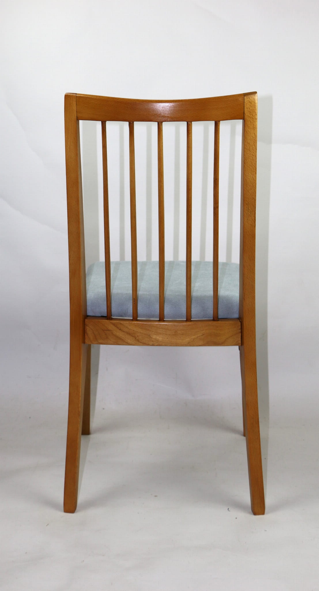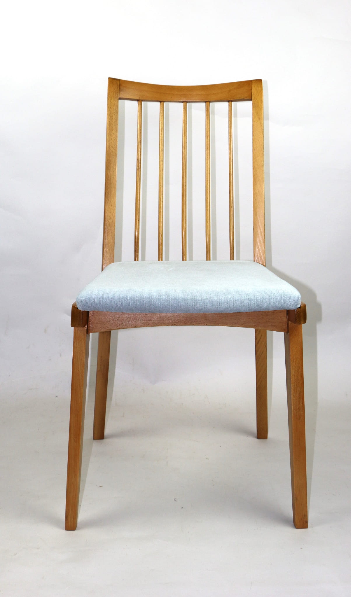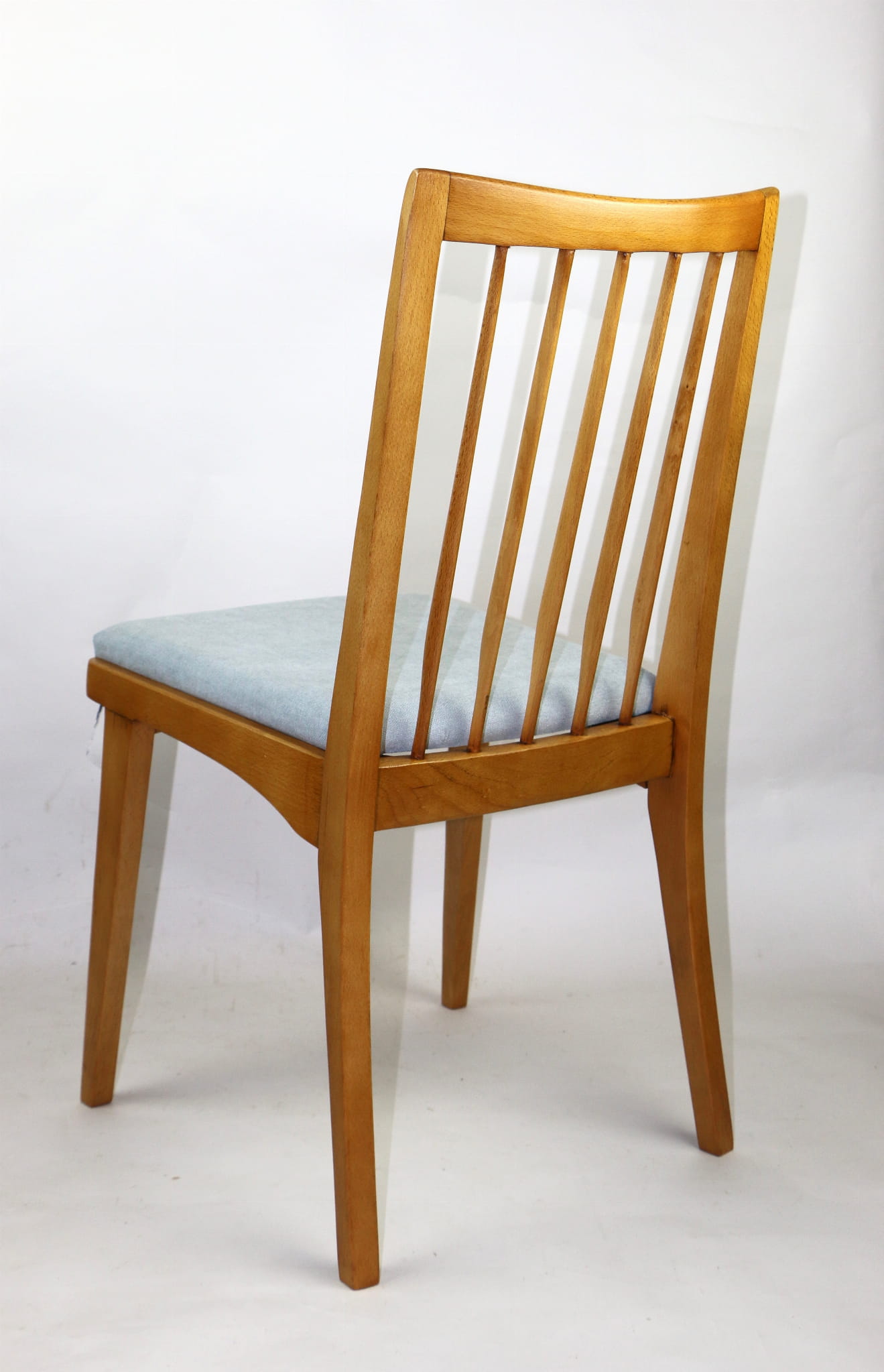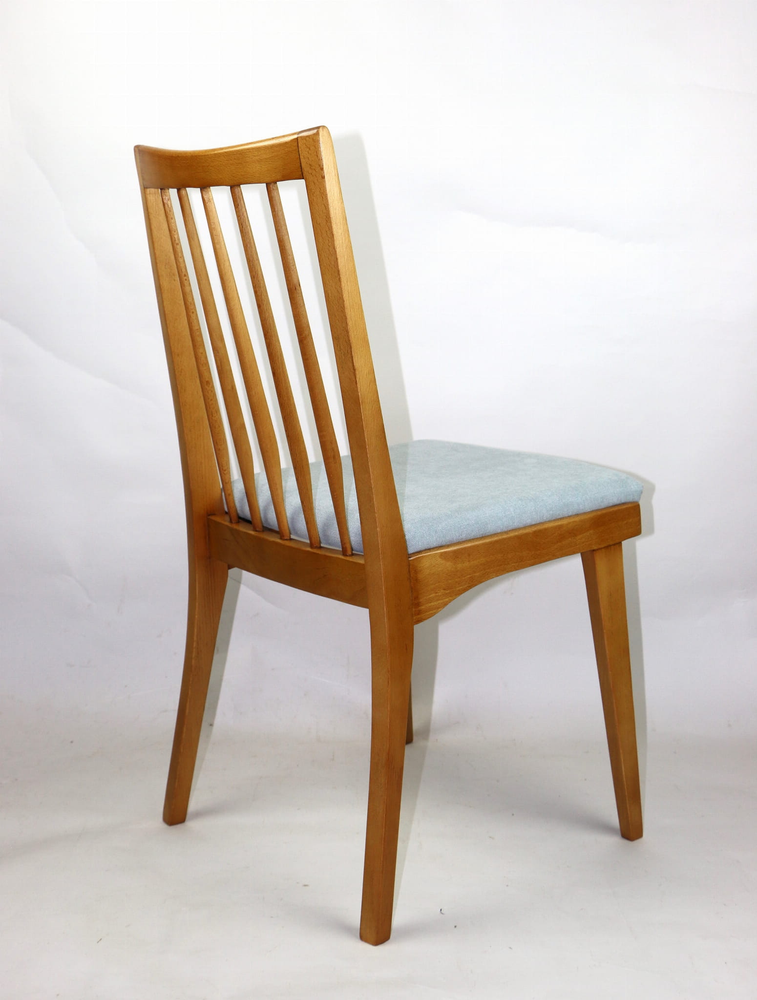 Kompletnie odrestaurowane designerskie dwa krzesła z lat 70 tych. Nowe obicie pokryte strukturalnym materiałem tapicerskim w seledynowo - szarym kolorze - tkanina Symphony Mills. Stelaż drewniany w kolorze jasnego drewna pokryty lakierem.