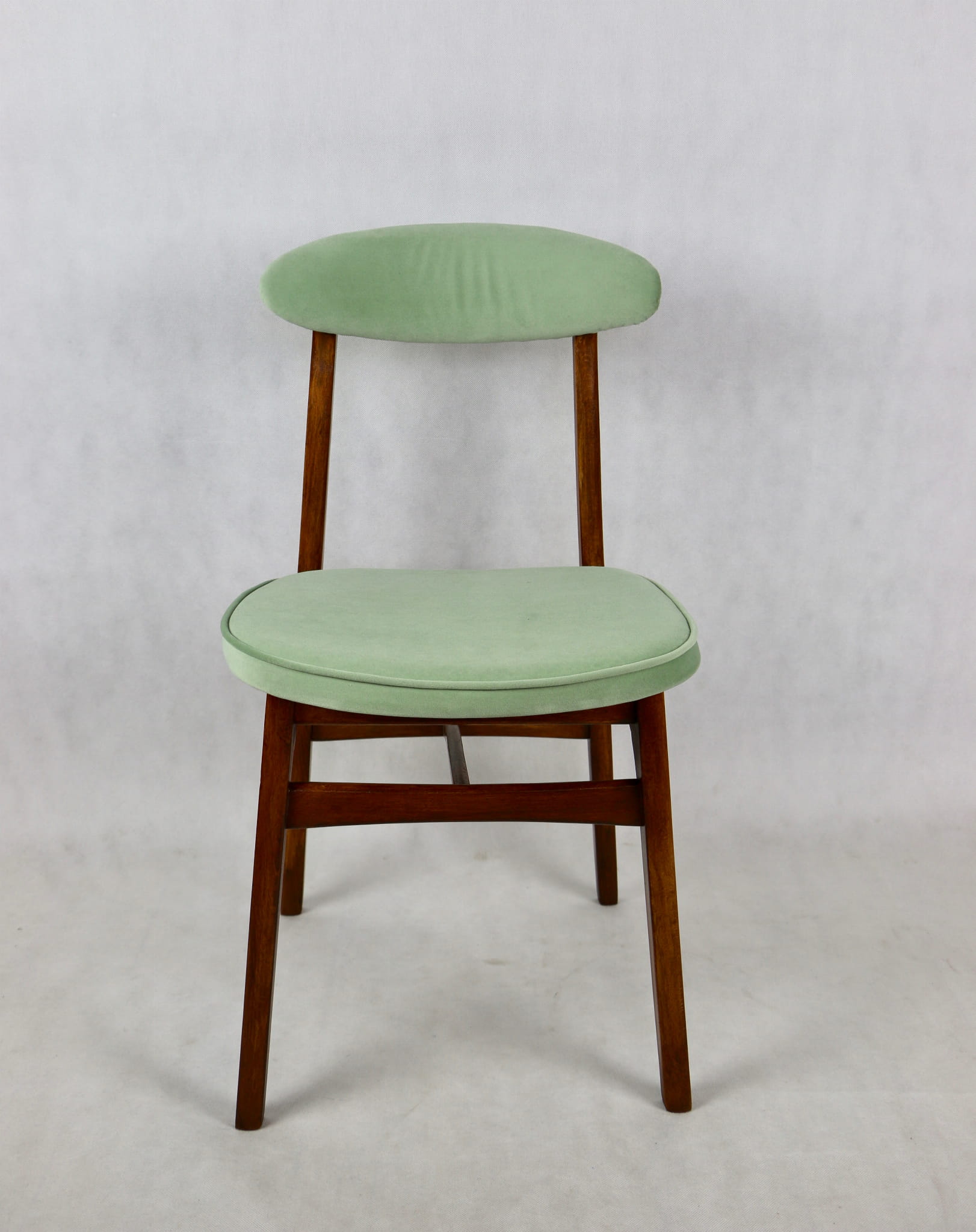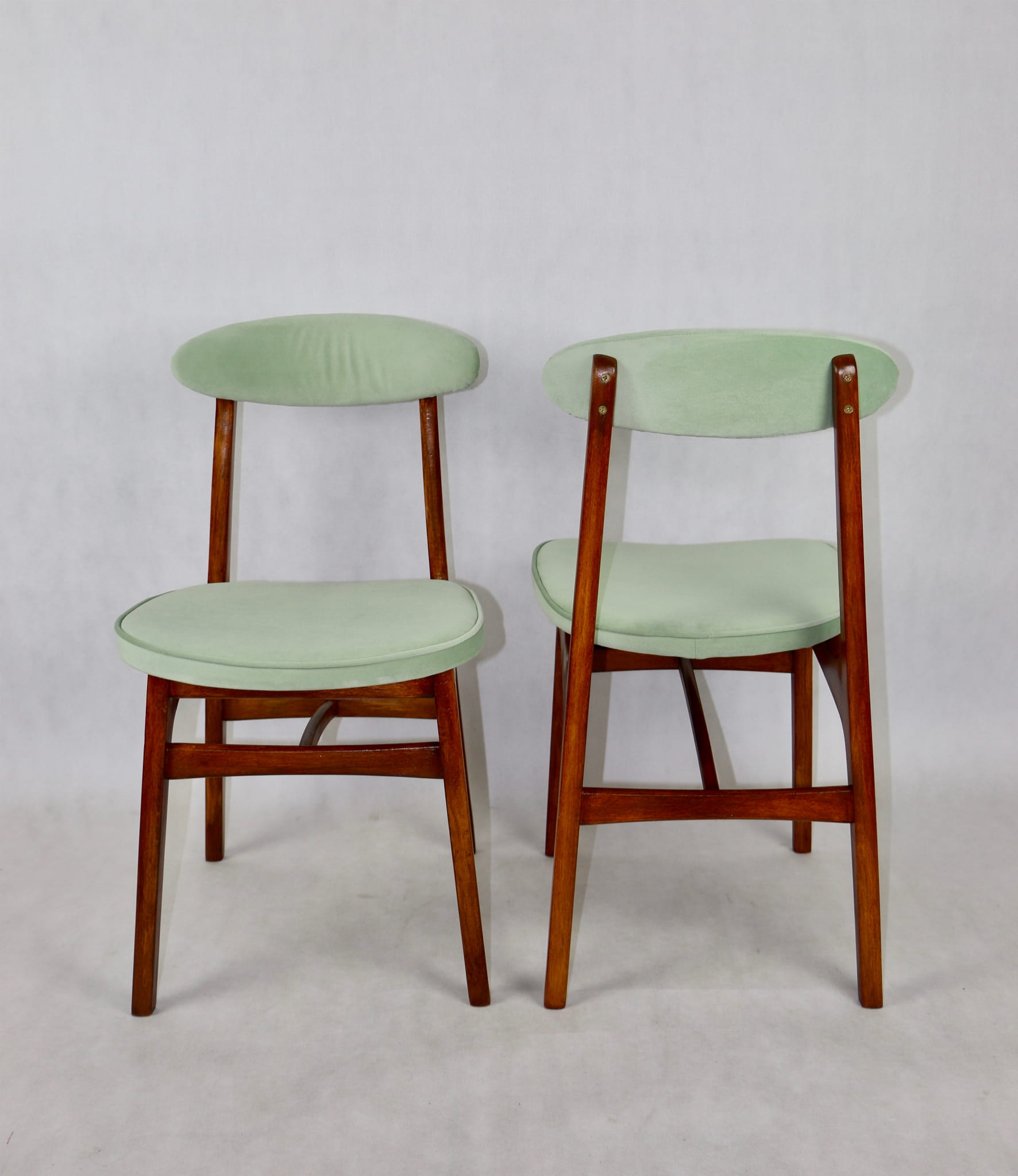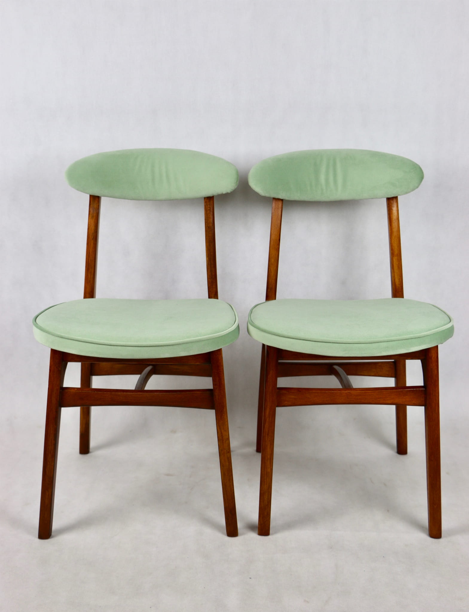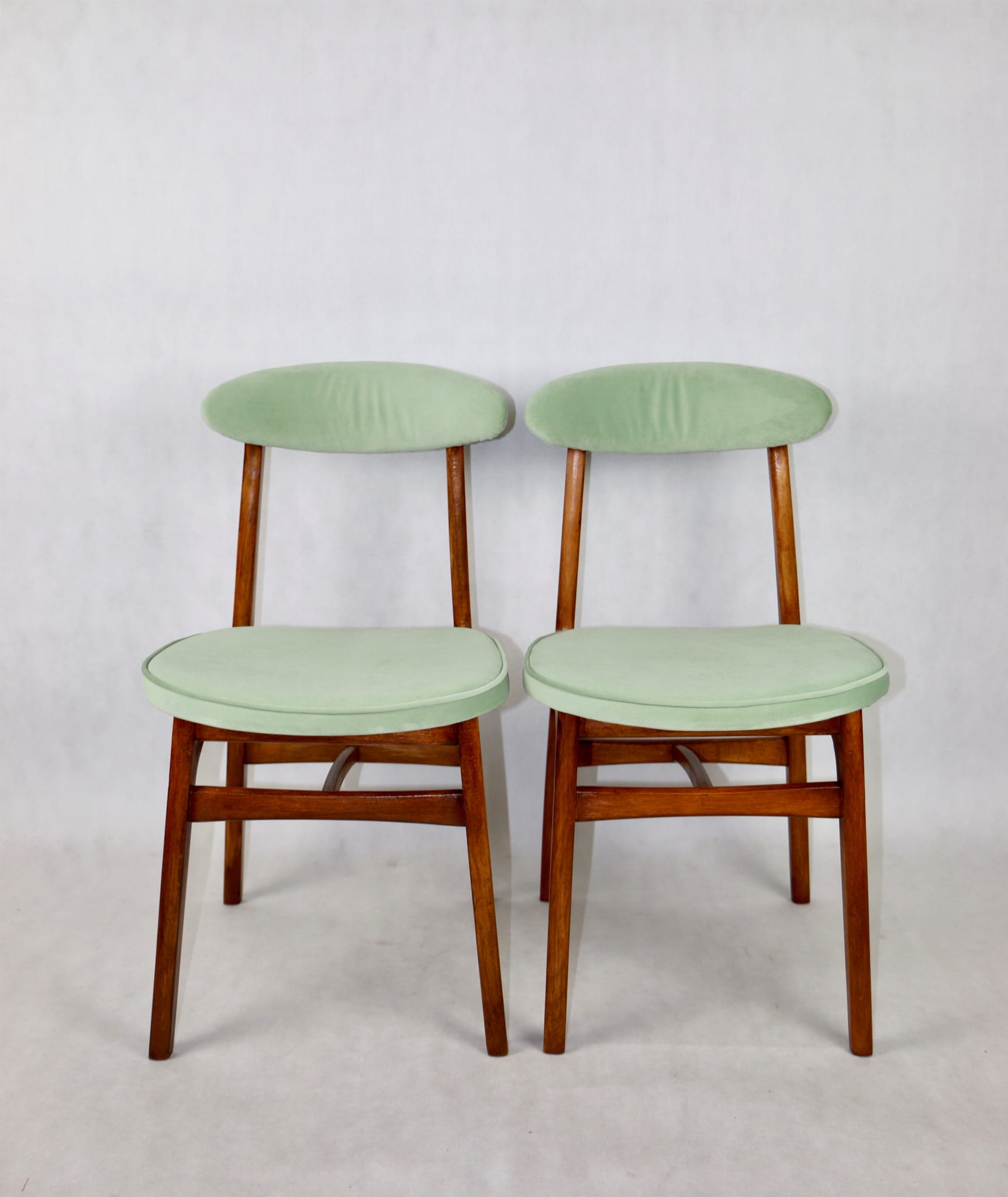 Kompletnie odrestaurowane oryginalne dwa krzesła projektu Rajmunda Hałas z lat 70 tych. Nowe obicie pokryte materiałem tapicerskim z serii welwetów Jade w kolorze jasno - zielonym ( kolor miętowy). Stelaż drewniany w kolorze orzechowego drewna.