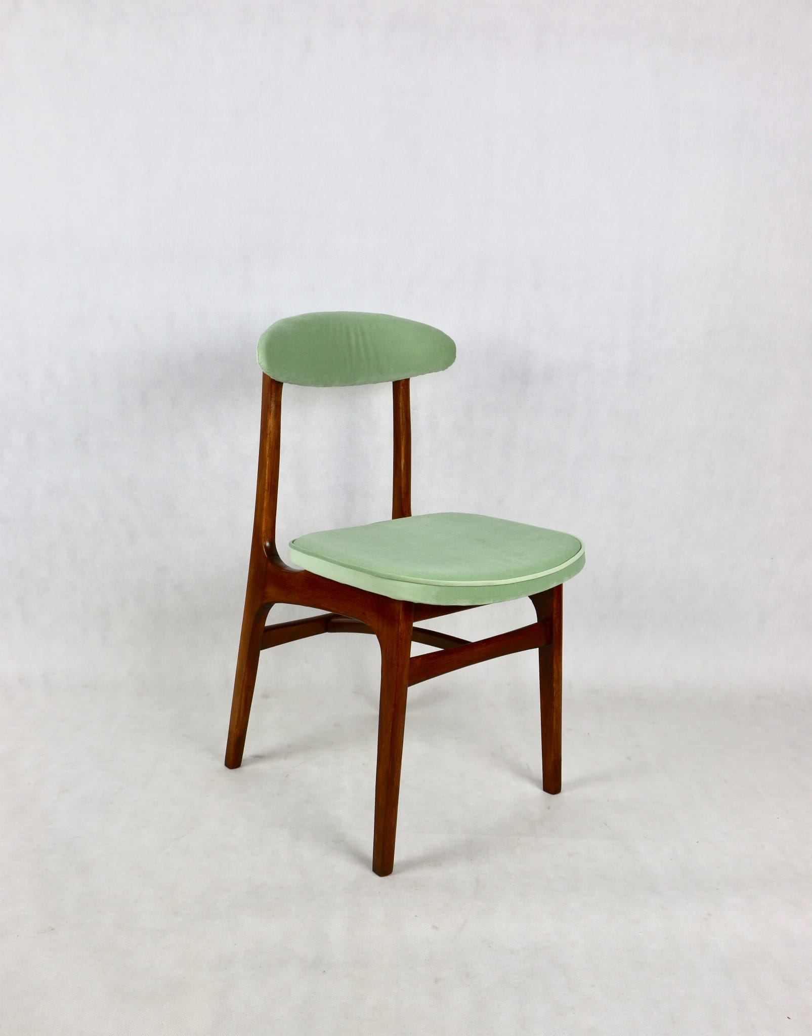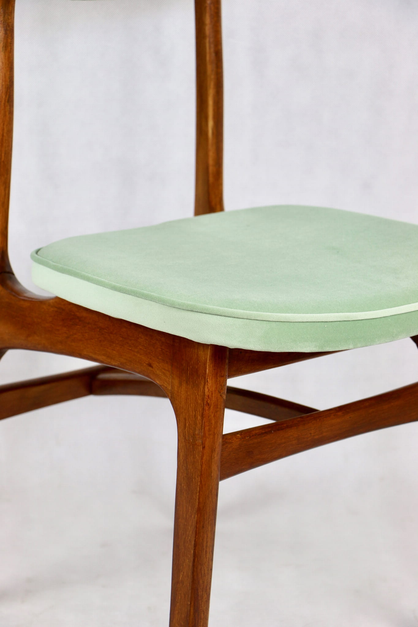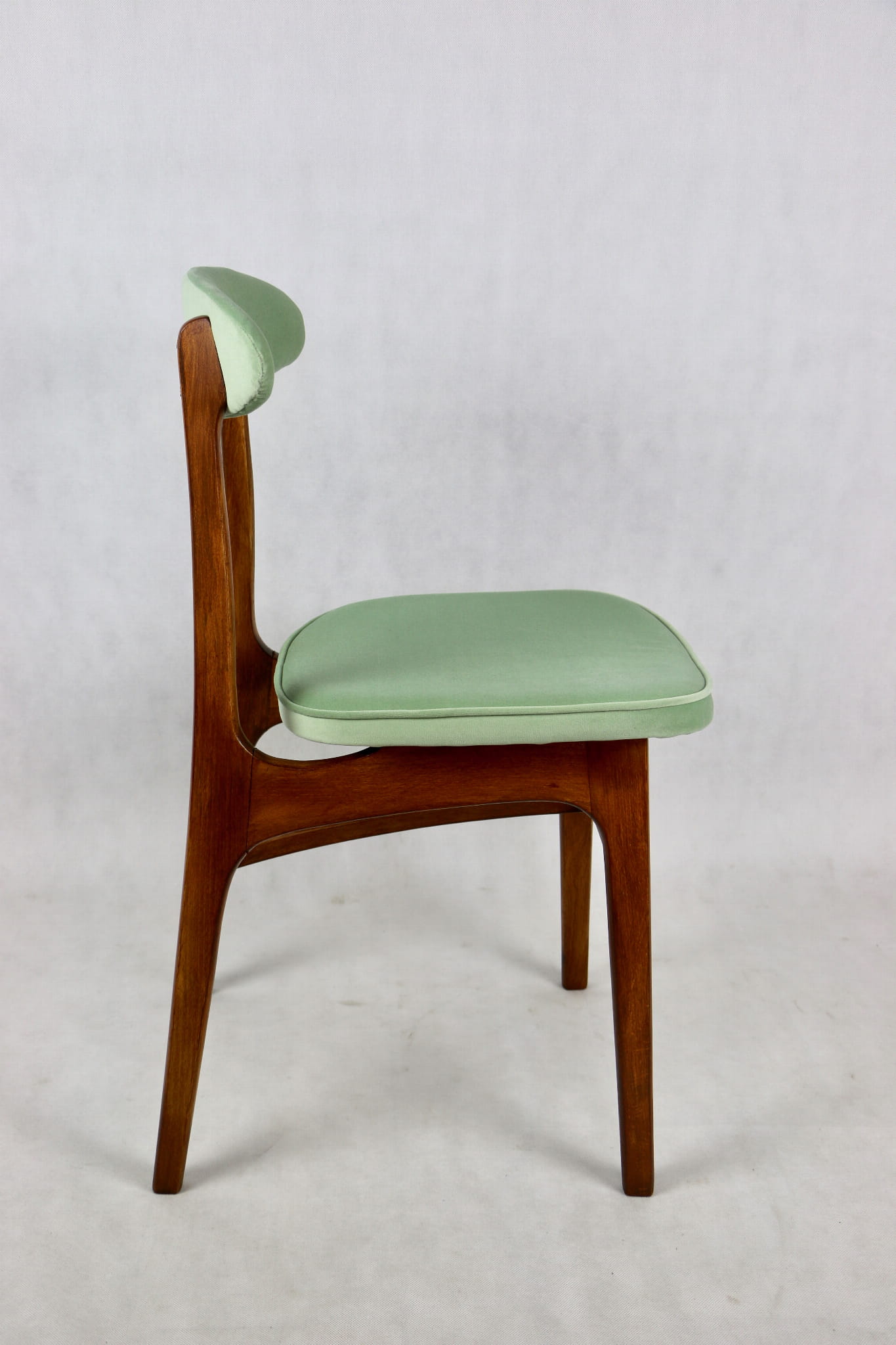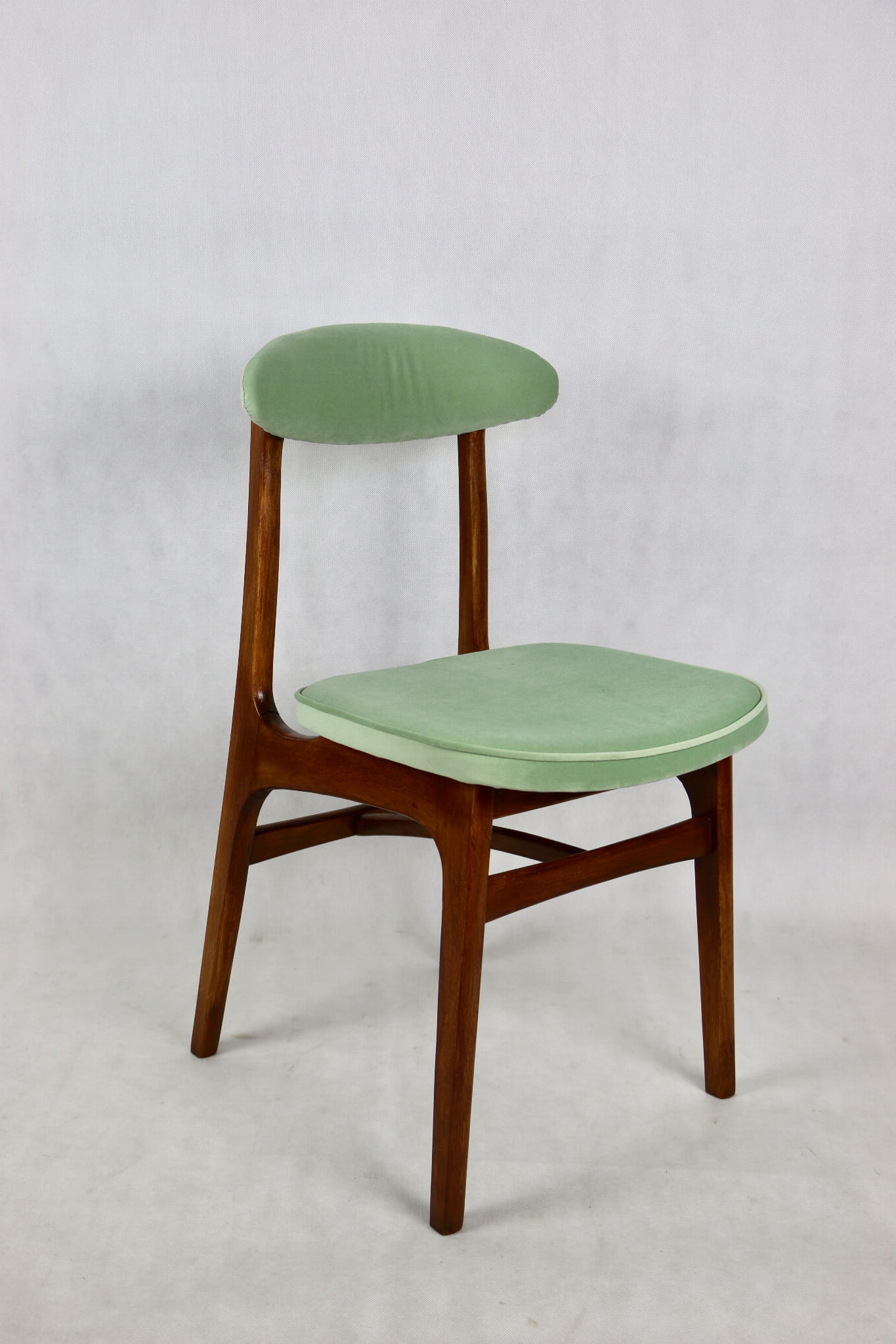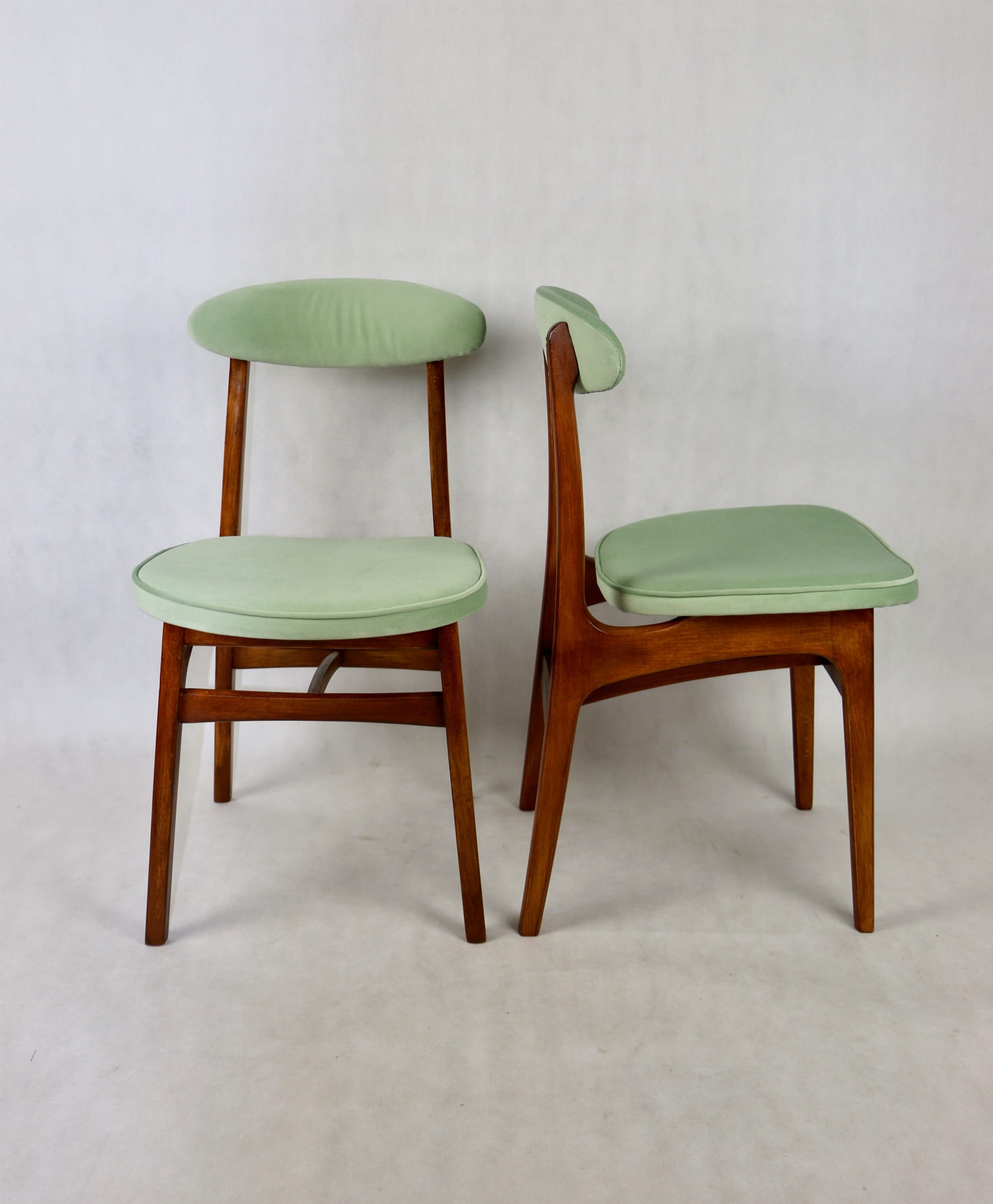 Kompletnie odrestaurowane oryginalne dwa krzesła projektu Rajmunda Hałas z lat 70 tych. Nowe obicie pokryte materiałem tapicerskim z serii welwetów Jade w kolorze jasno - zielonym ( kolor miętowy). Stelaż drewniany w kolorze orzechowego drewna.