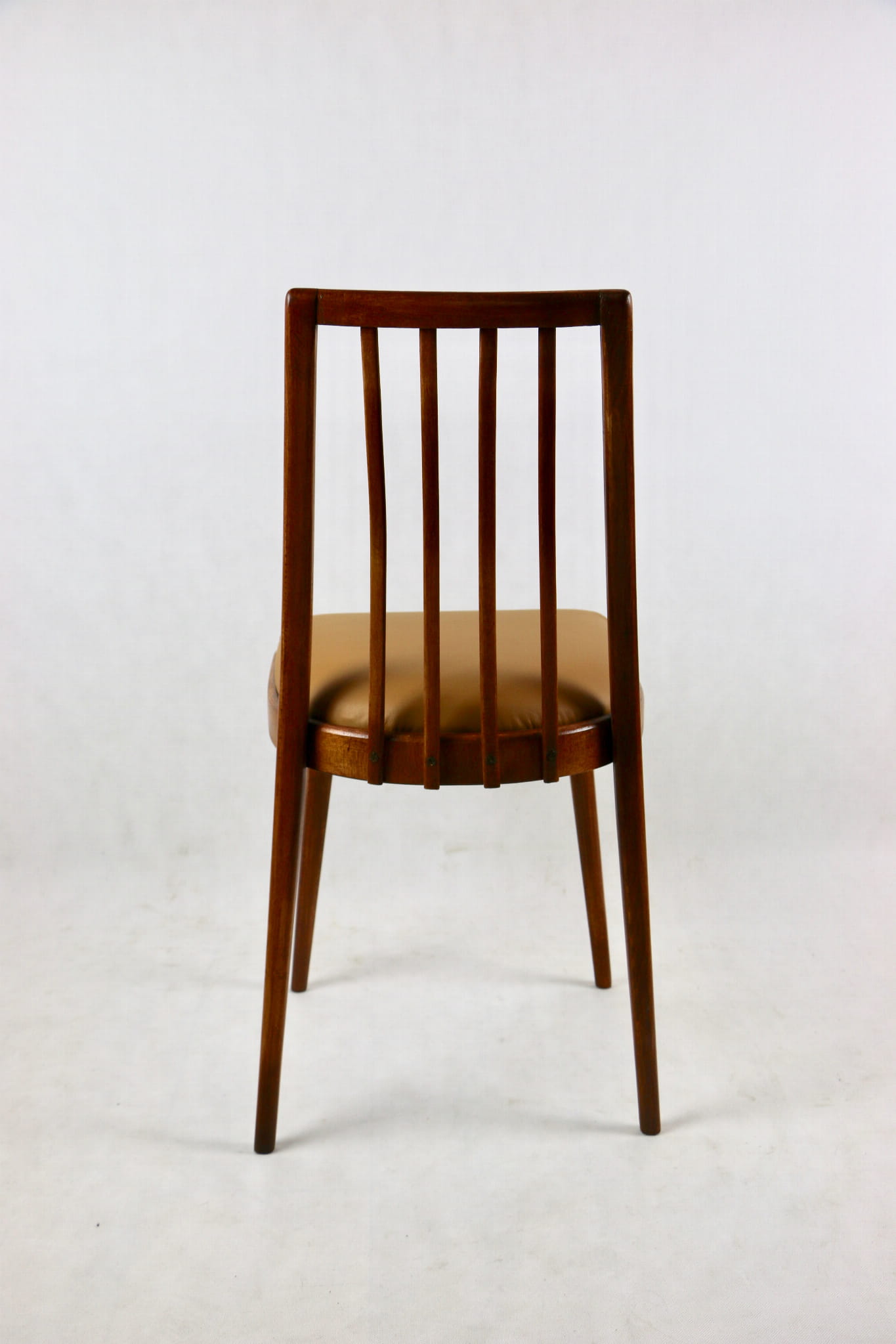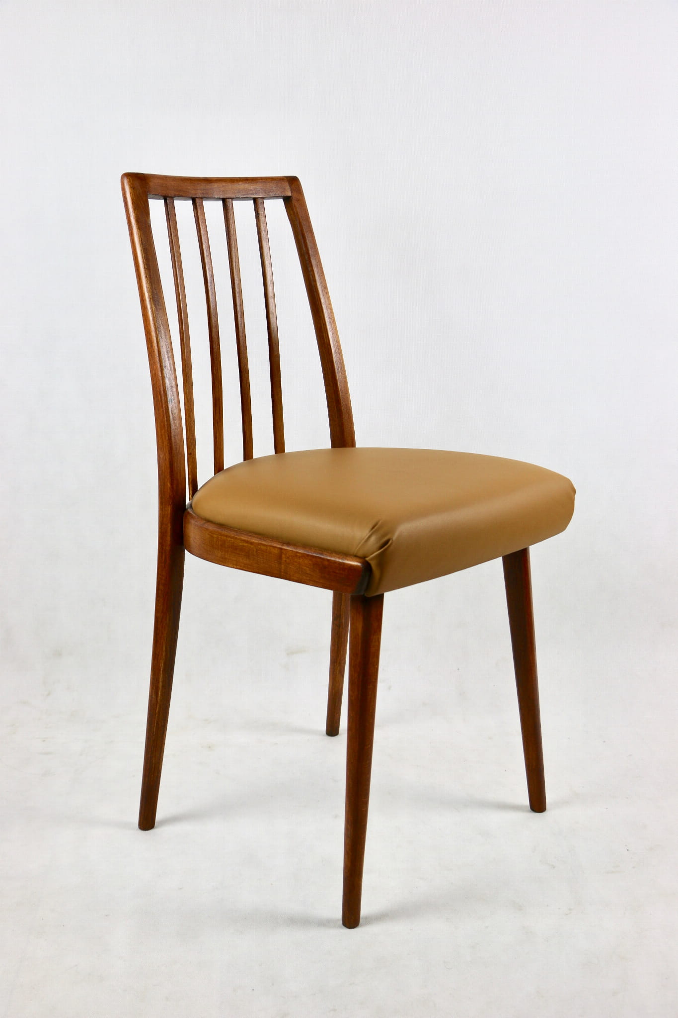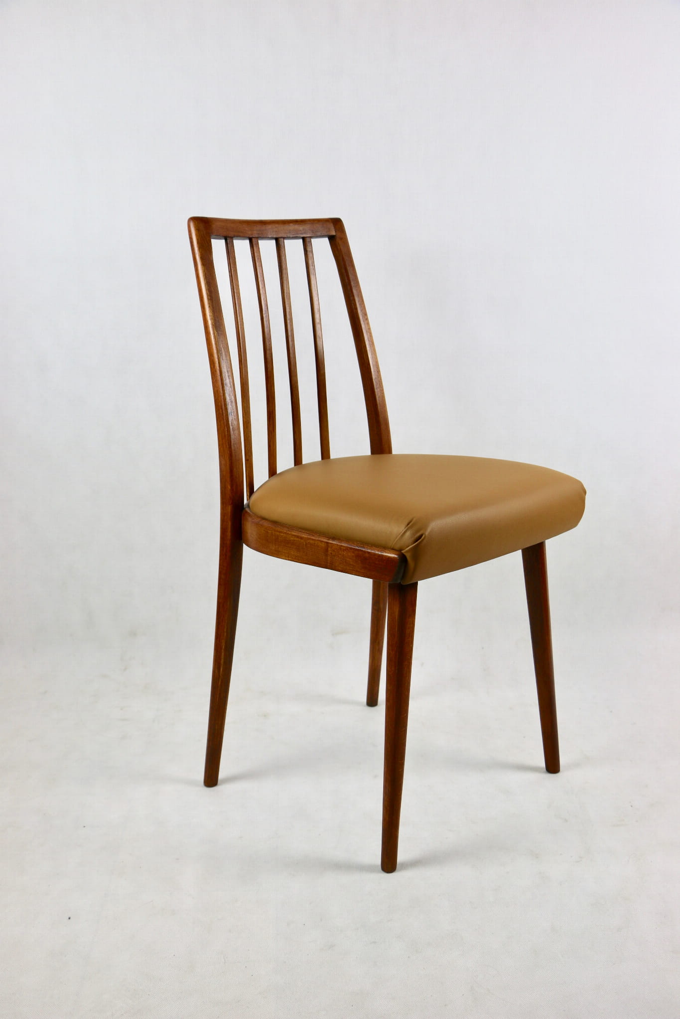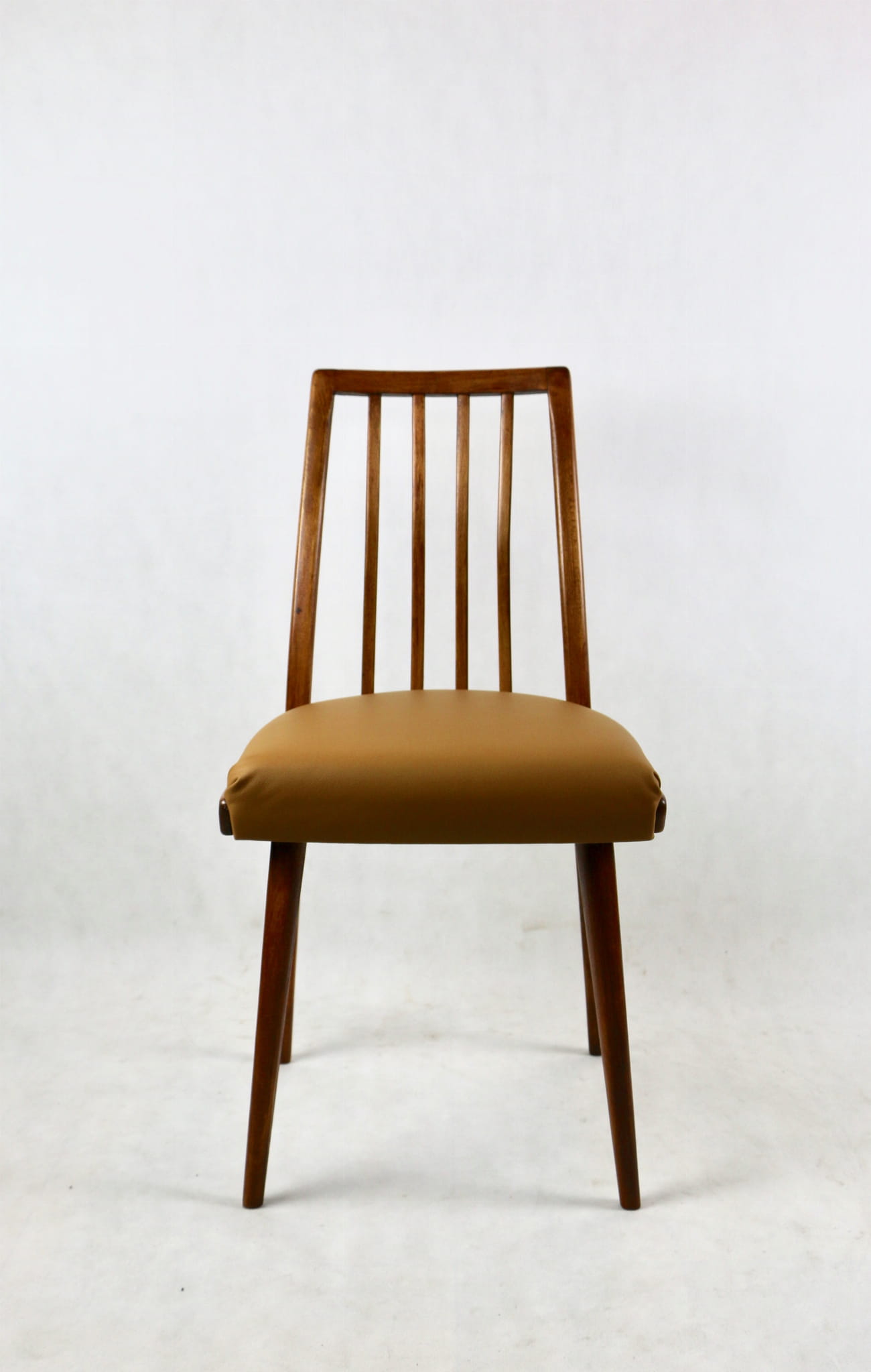 Krzesło Vintage Loft w kolorze brązowym kompletnie odrestaurowane. Nowe obicie pokryte naturalną skórą w pięknym brązowym kolorze - Camel. Stelaż drewniany w naturalnym kolorze drewna.