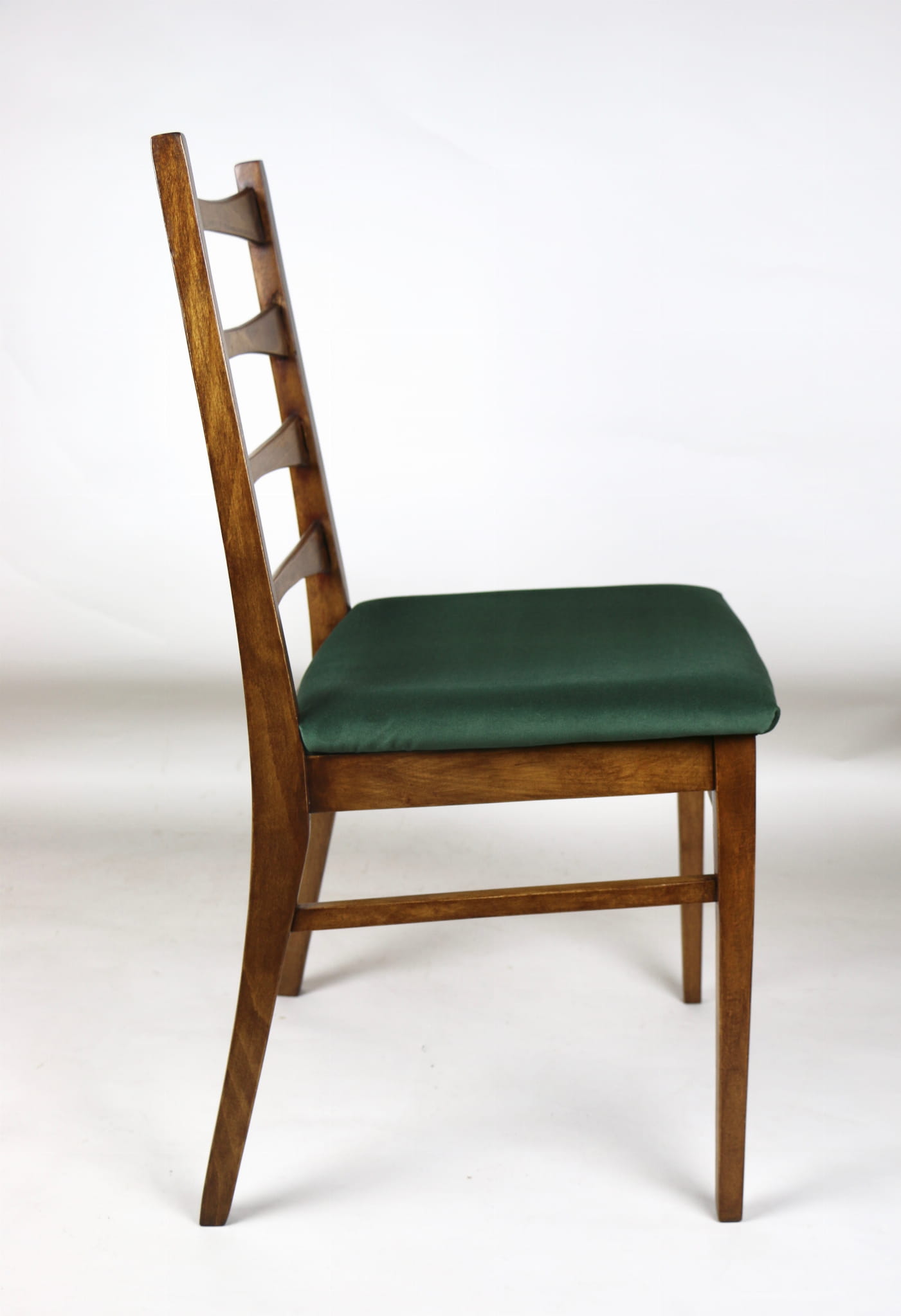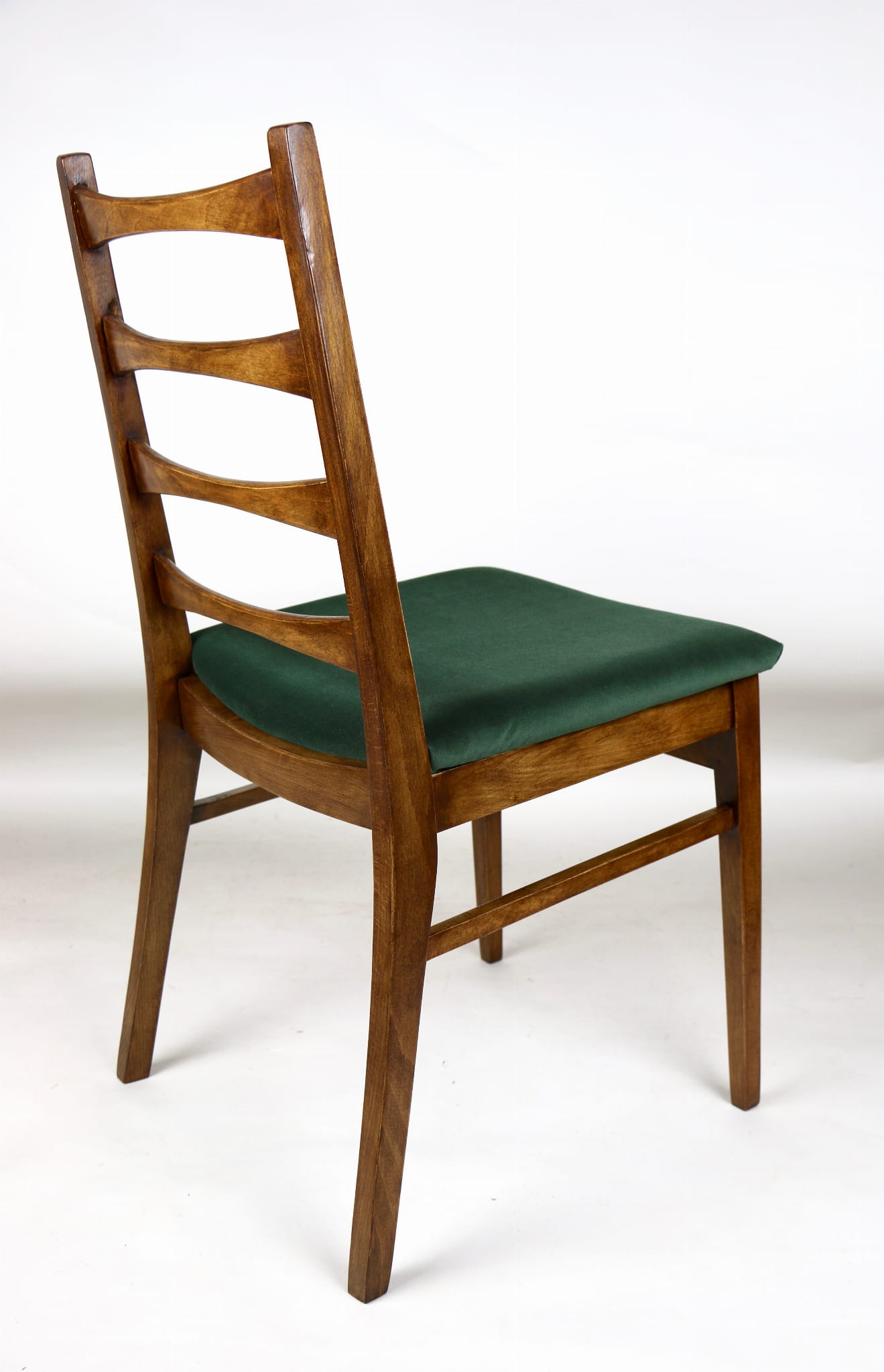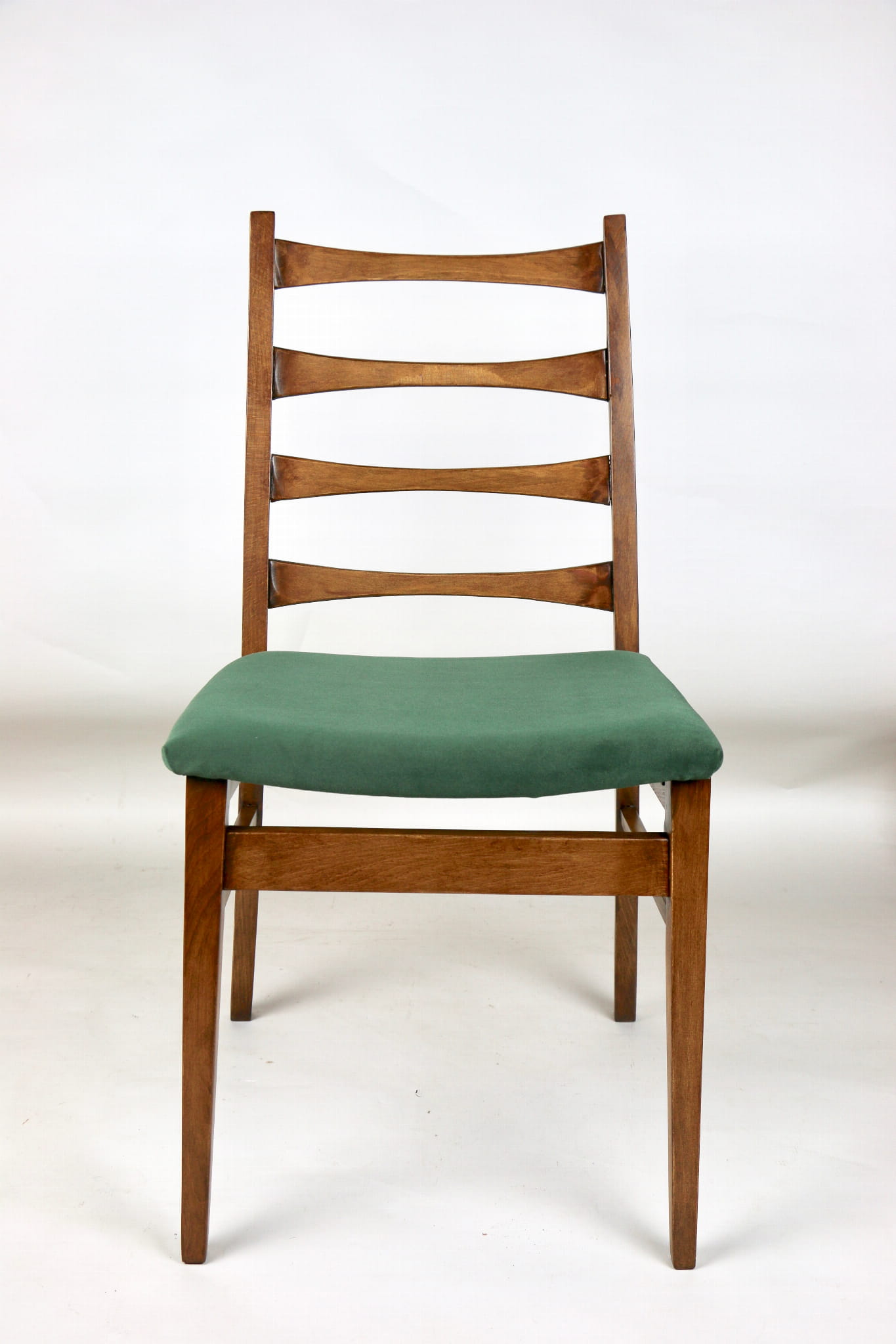 Kompletnie odrestaurowane designerskie krzesło. Nowe obicie pokryte aksamitnym materiałem tapicerskim w zielonym kolorze - tkanina Jade. Stelaż drewniany w kolorze orzechowego drewna.