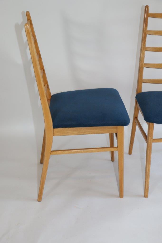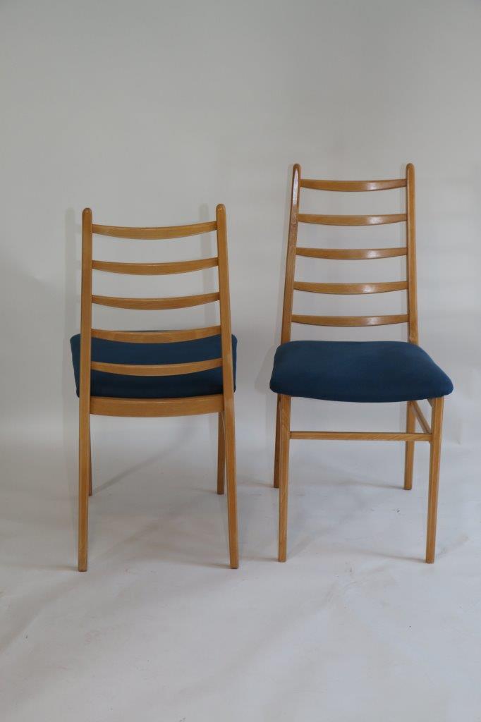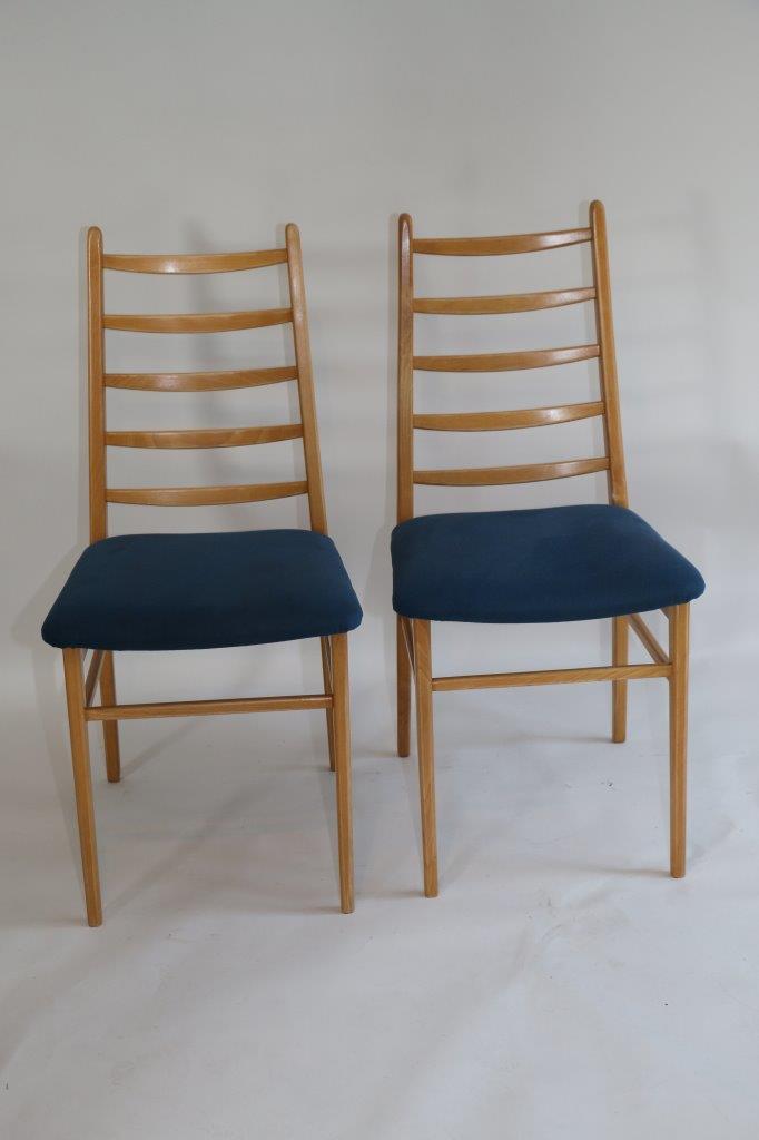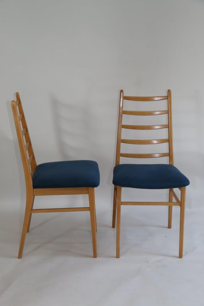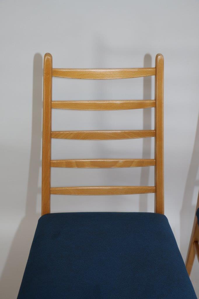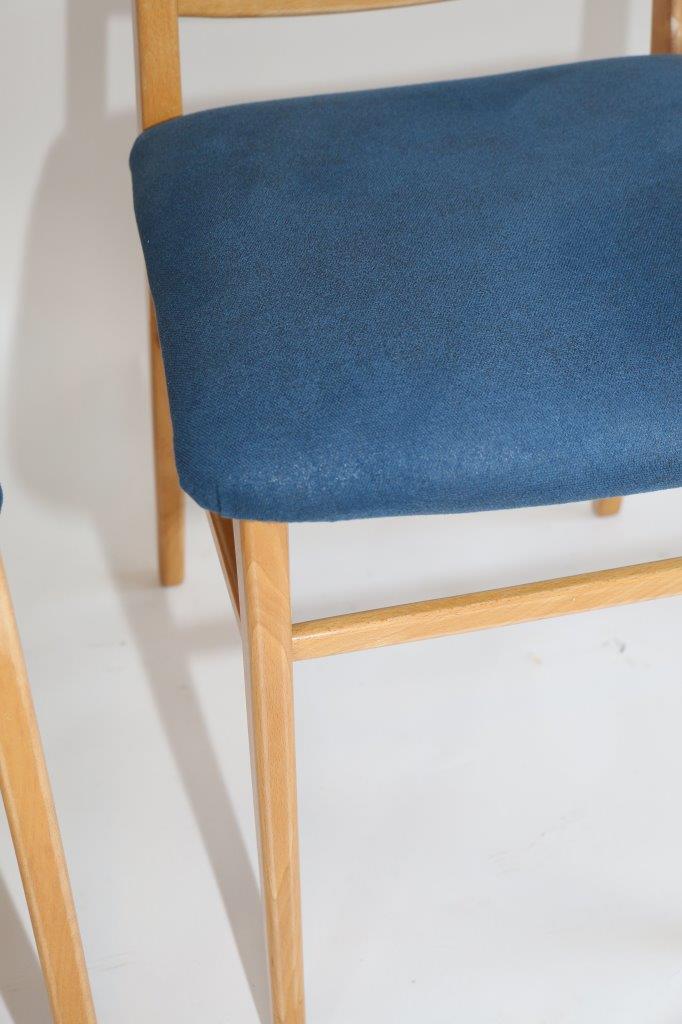 Krzesła oryginalne, zachowane w bardzo dobrym stanie.Stelaż odświeżony. Siedzisko otrzymało nowe obicie. Pokryte materiałem tapicerskim w niebieskim połyskującym kolorze.
