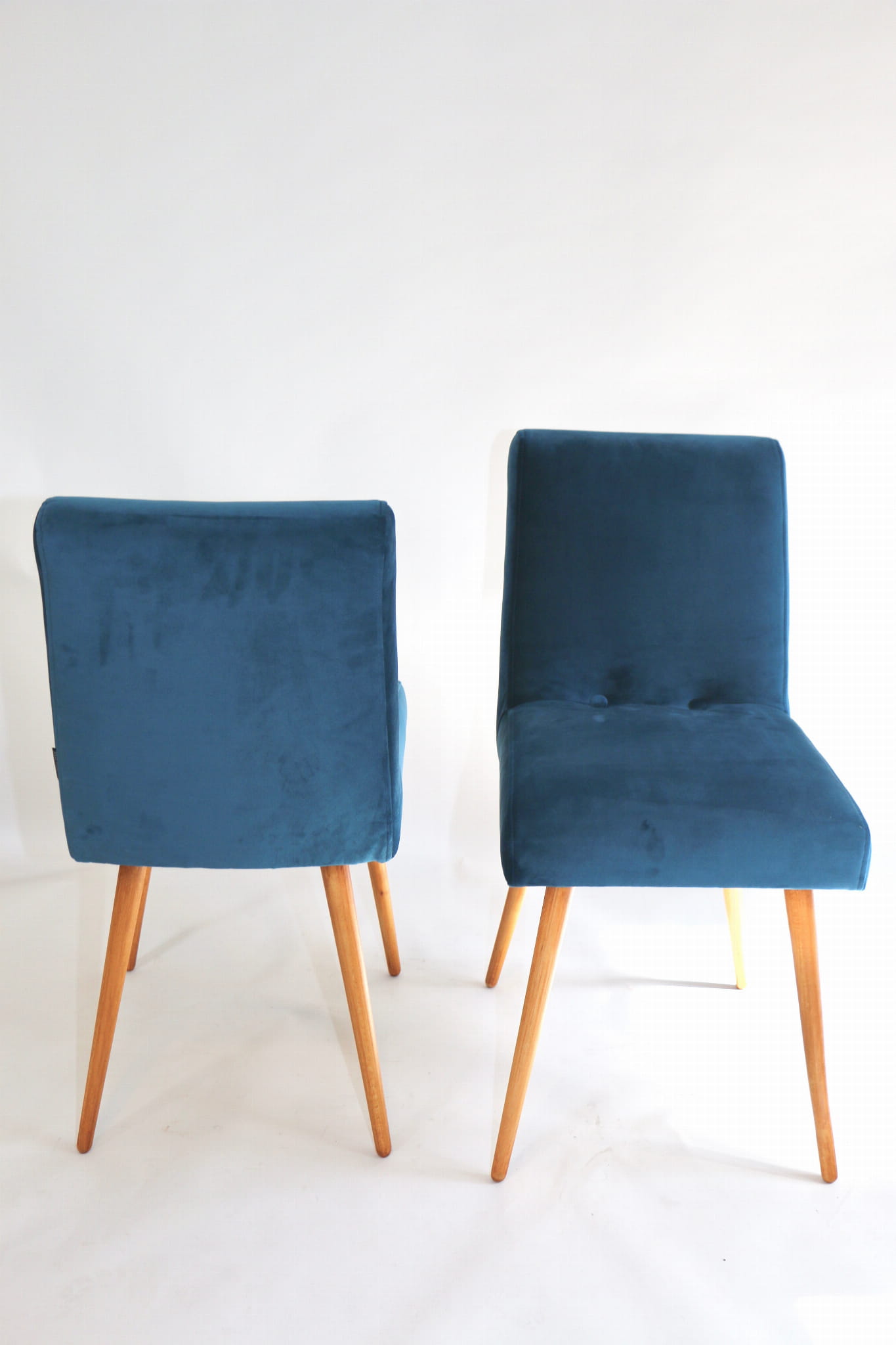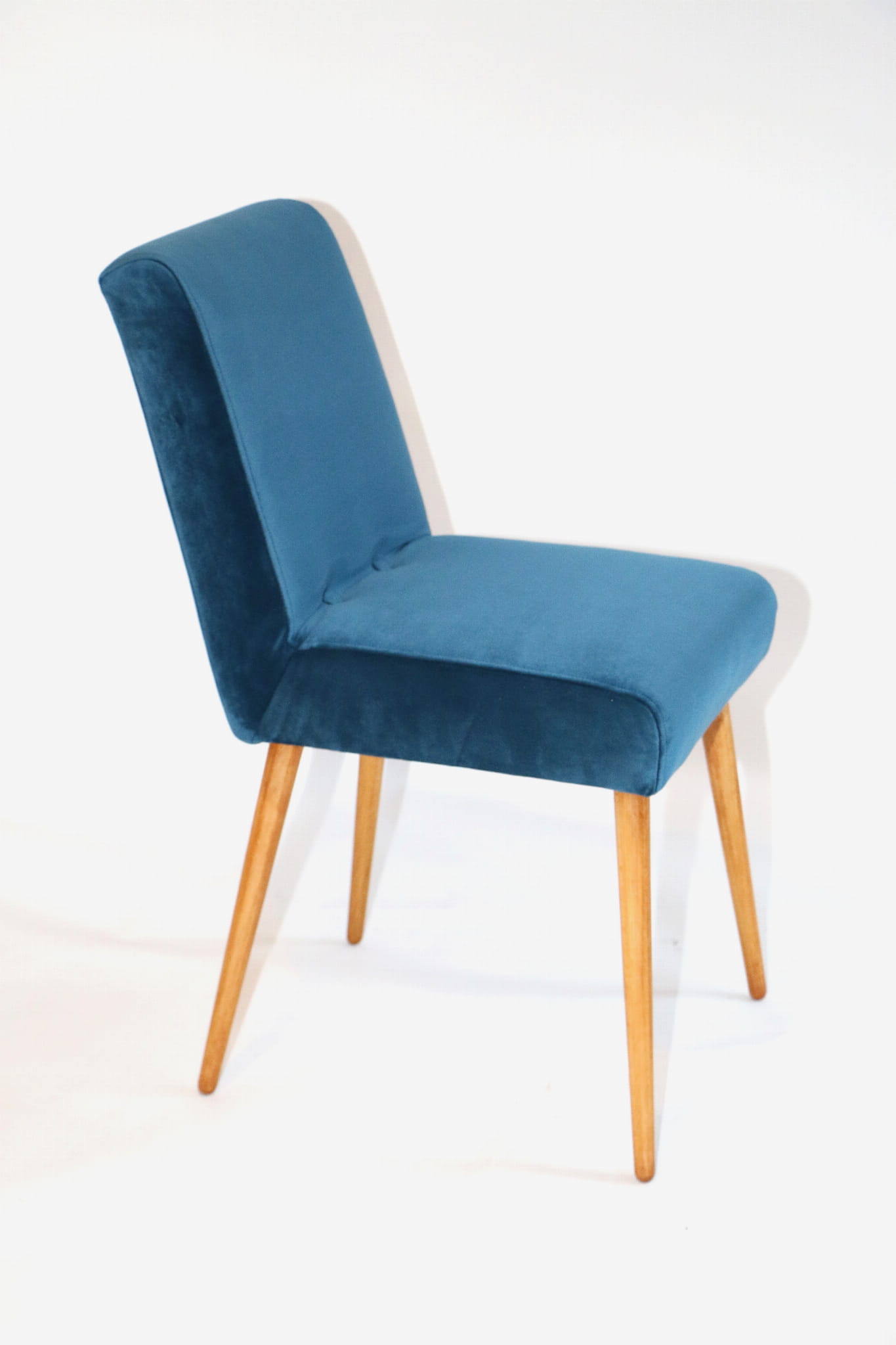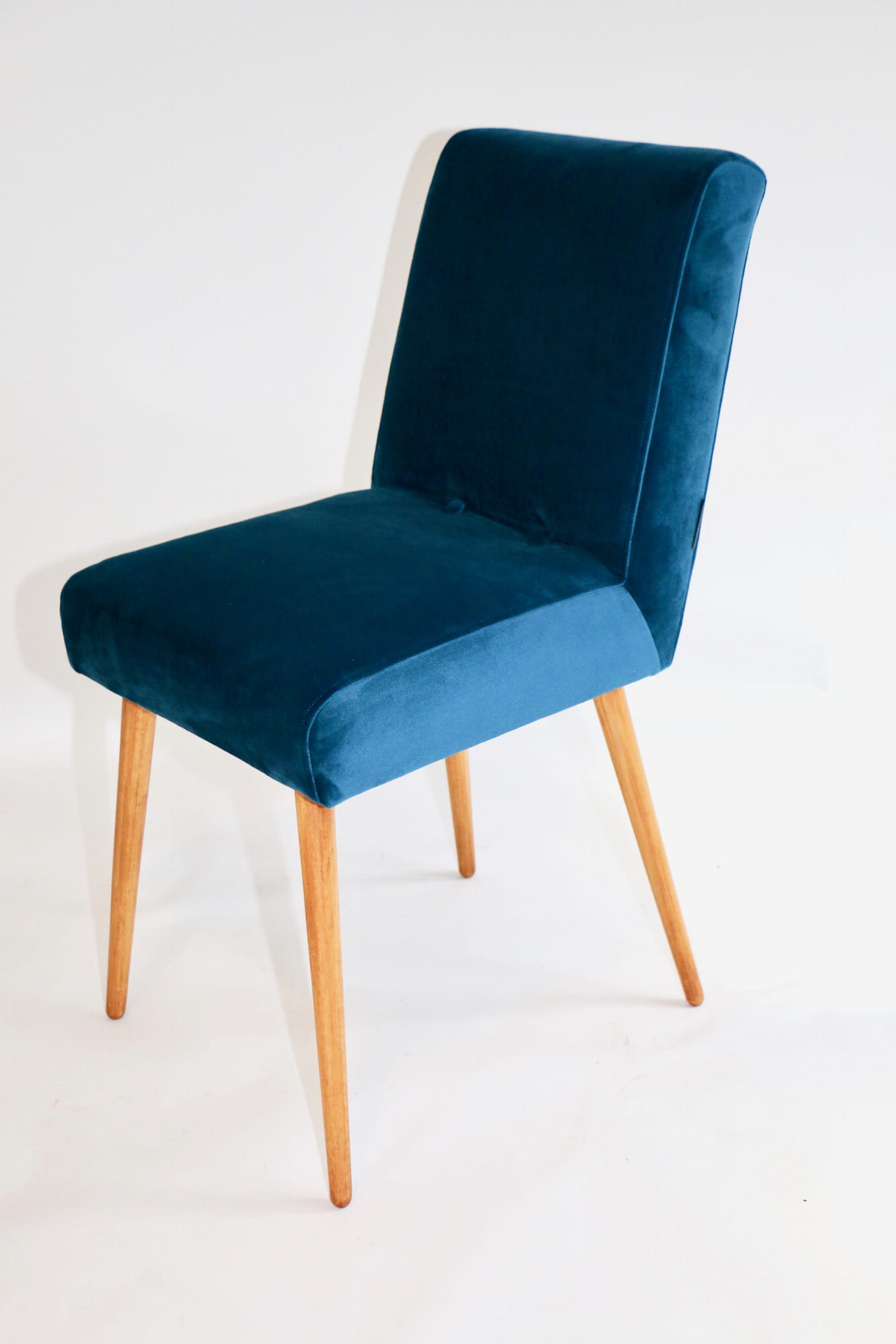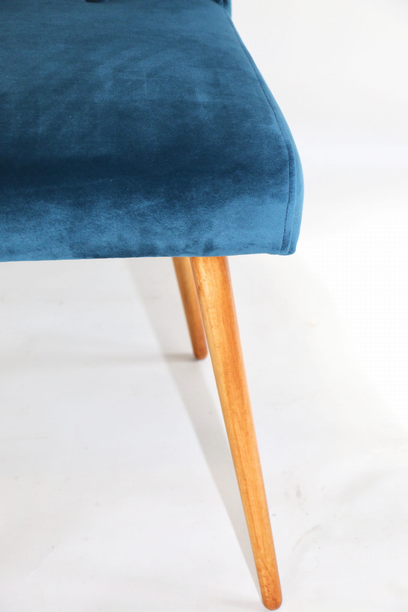 Odrestaurowane, stelaż drewniany w naturalnym kolorze . Nowe obicie pokryte aksamitnym materiałem tapicerskim velvet w pięknym morskim kolorze .