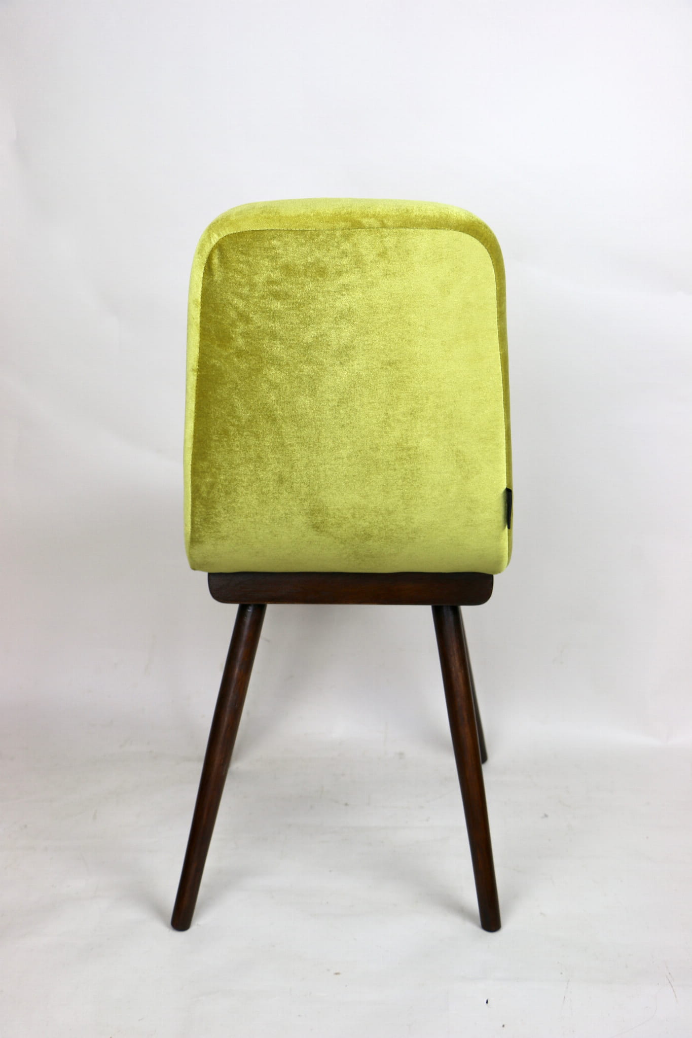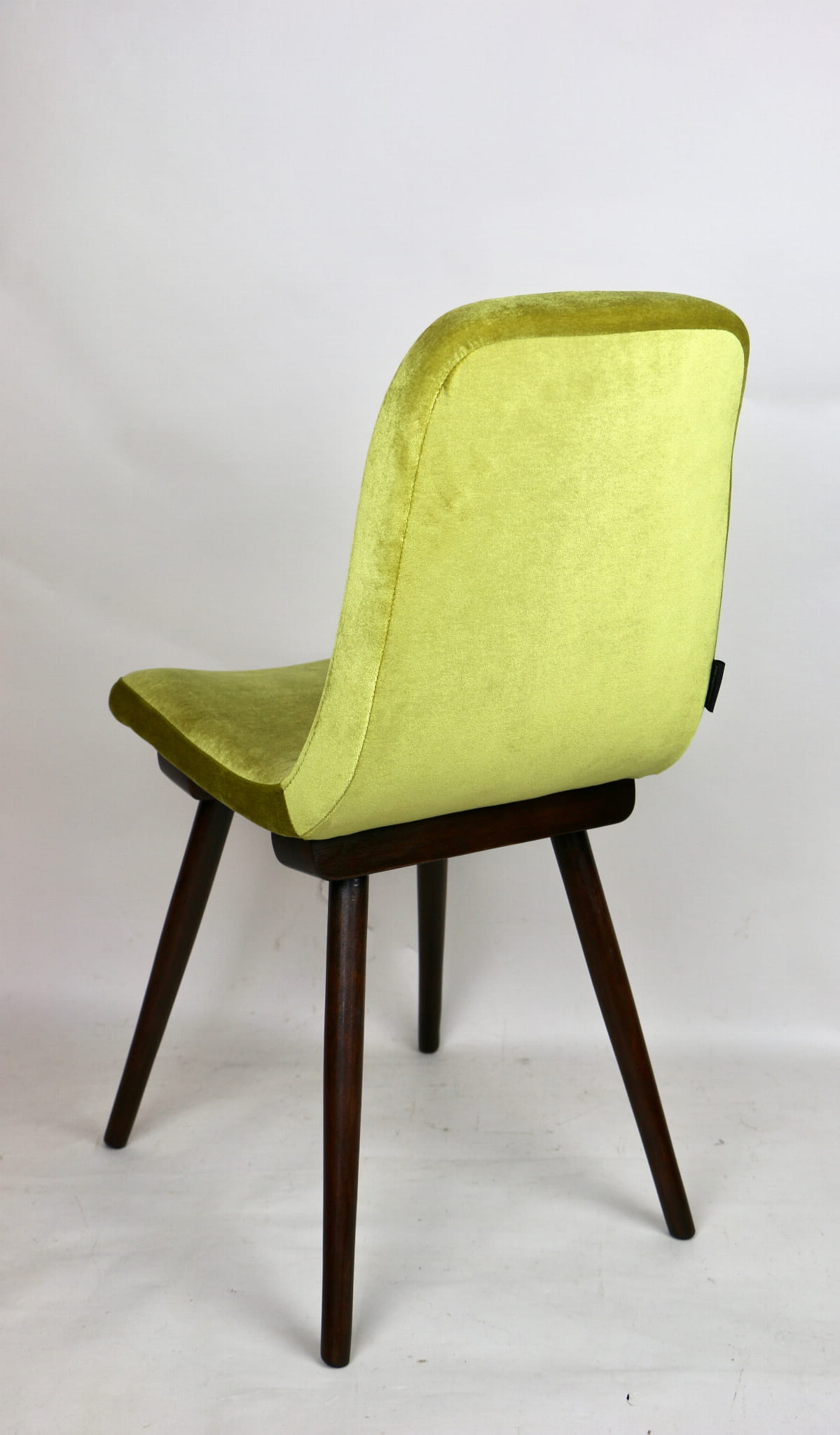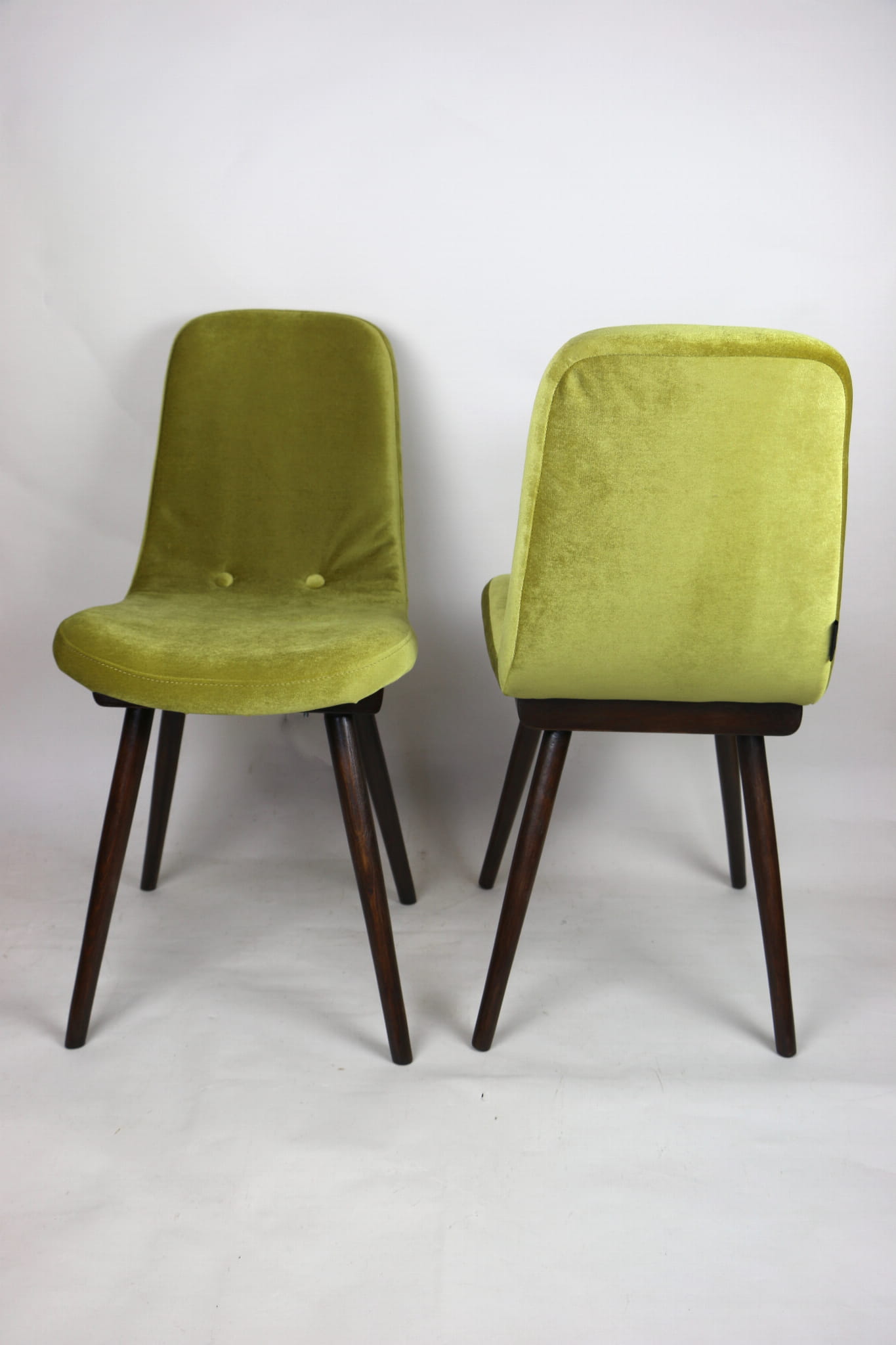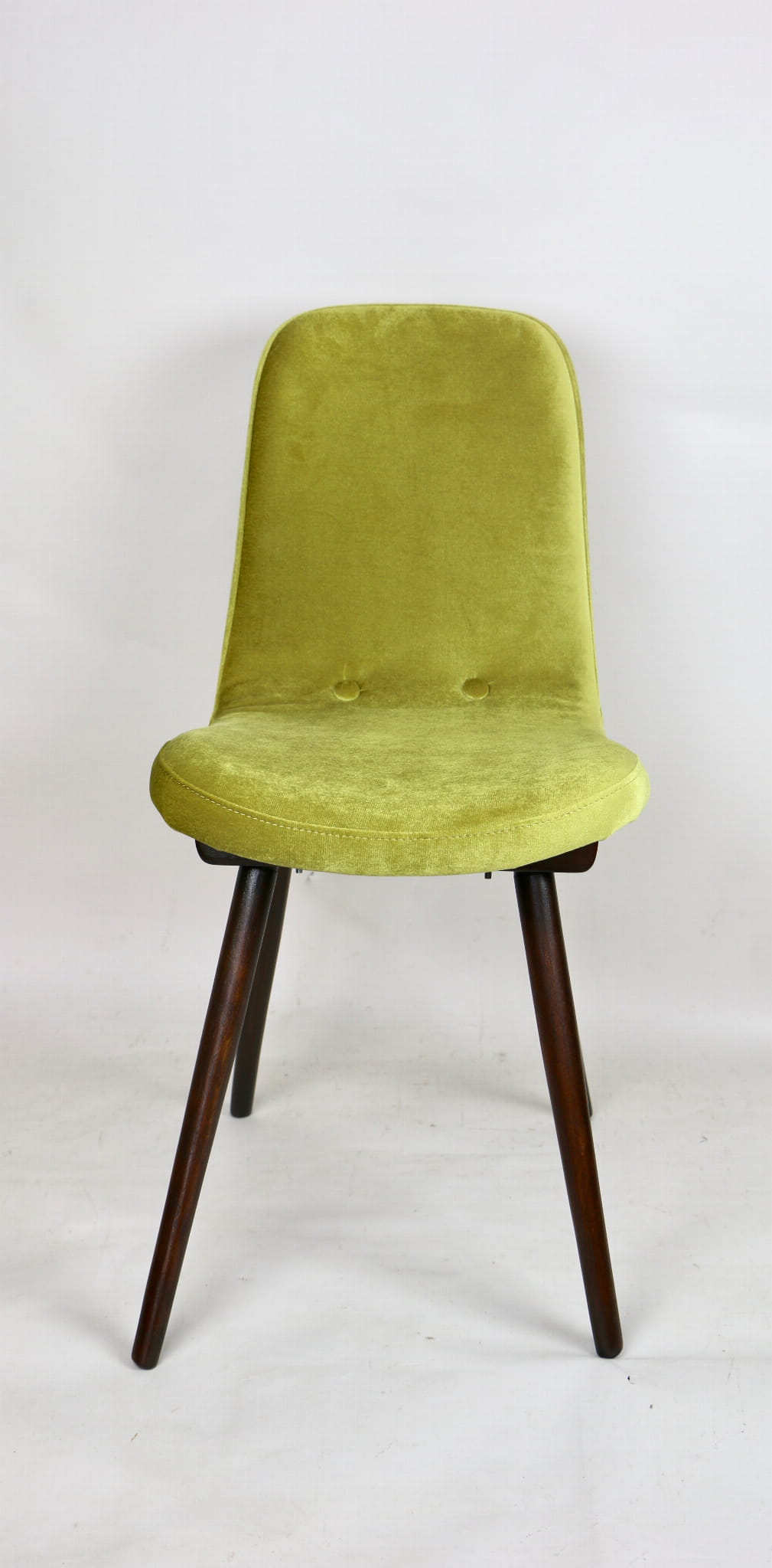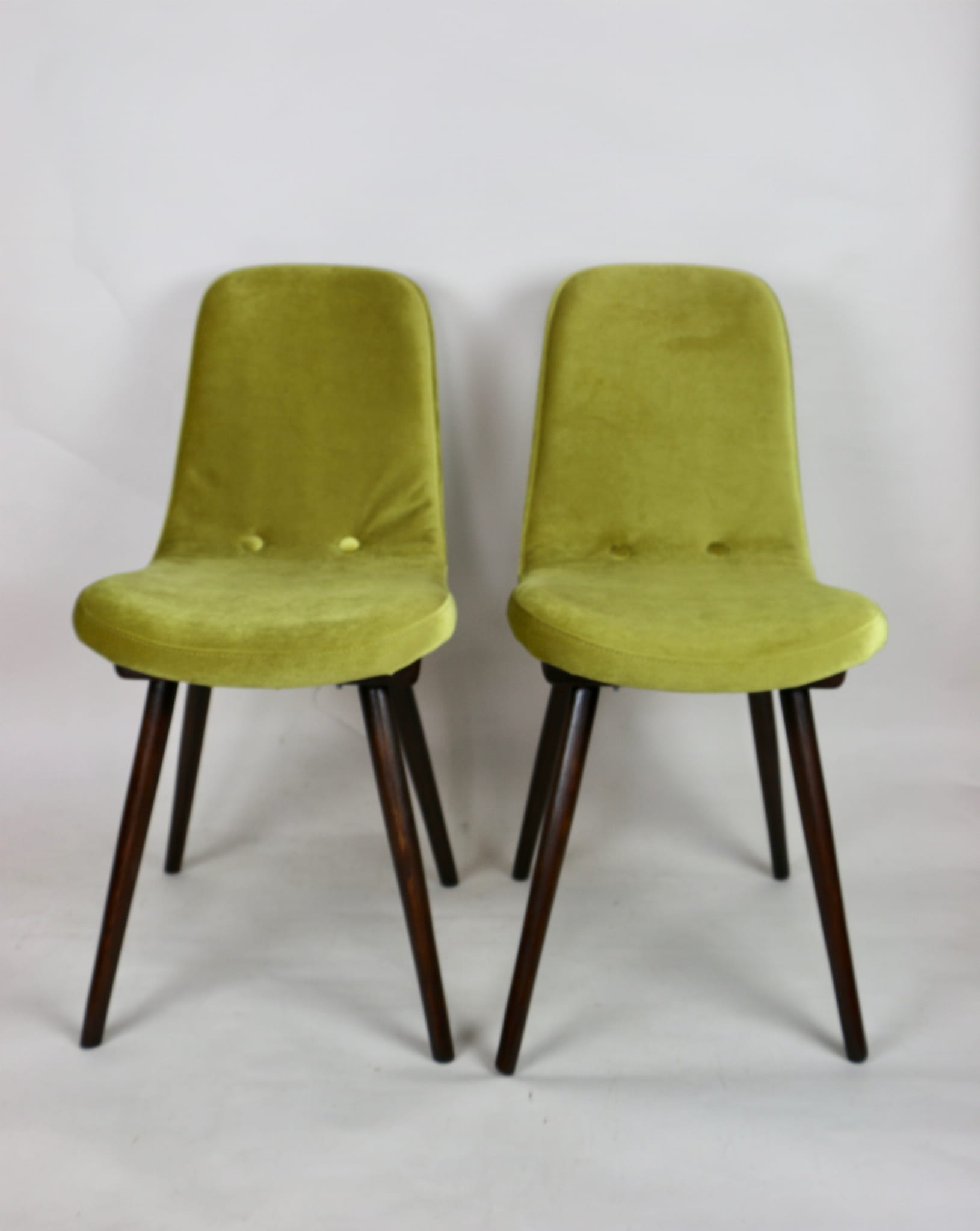 Odrestaurowane dwa krzesła typ A-6150. Stelaż drewniany w kolorze ciemnego orzecha. Siedzisko otrzymało nowe obicie pokryte tkaniną welwetową w kolorze żółto - złotym.