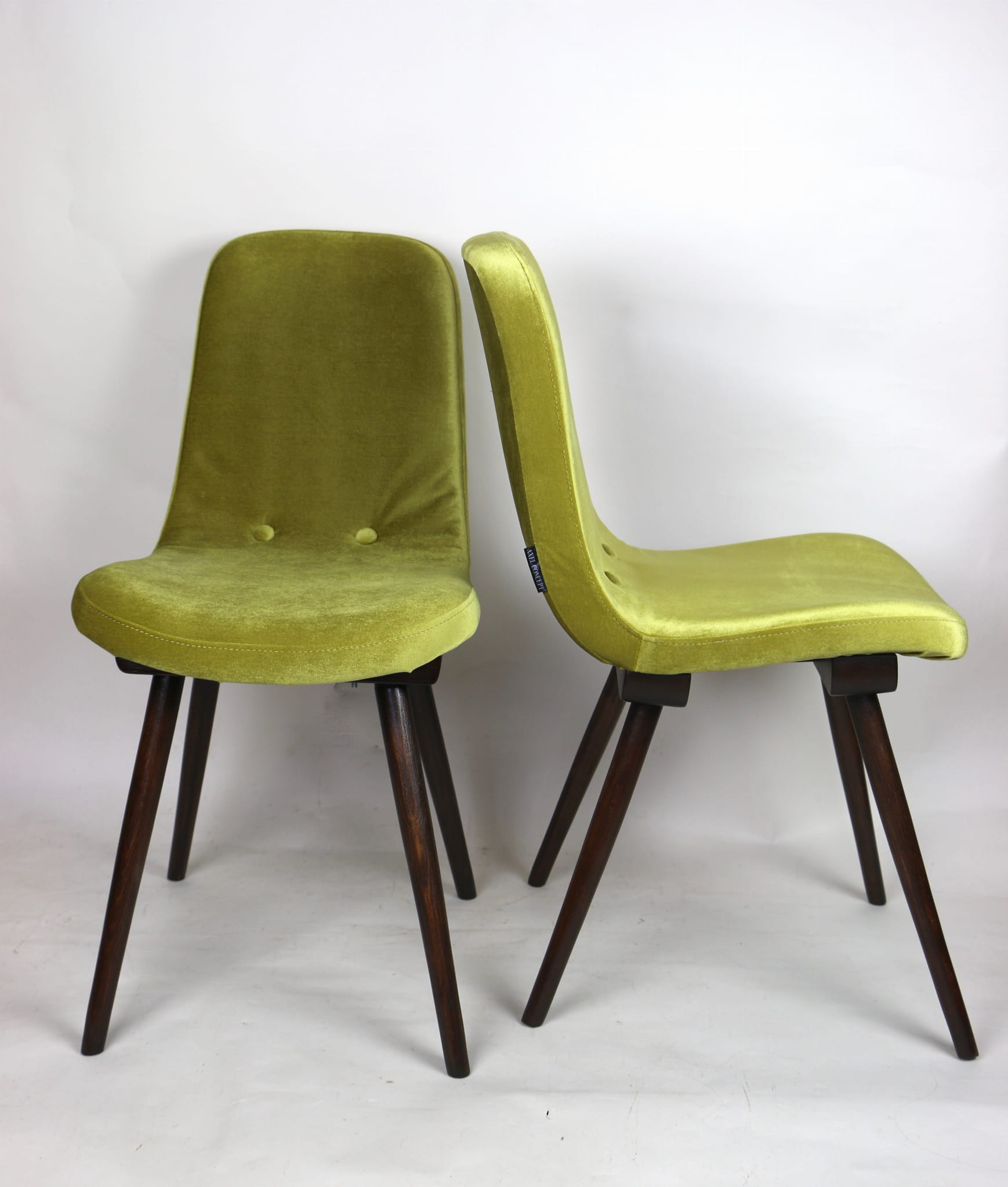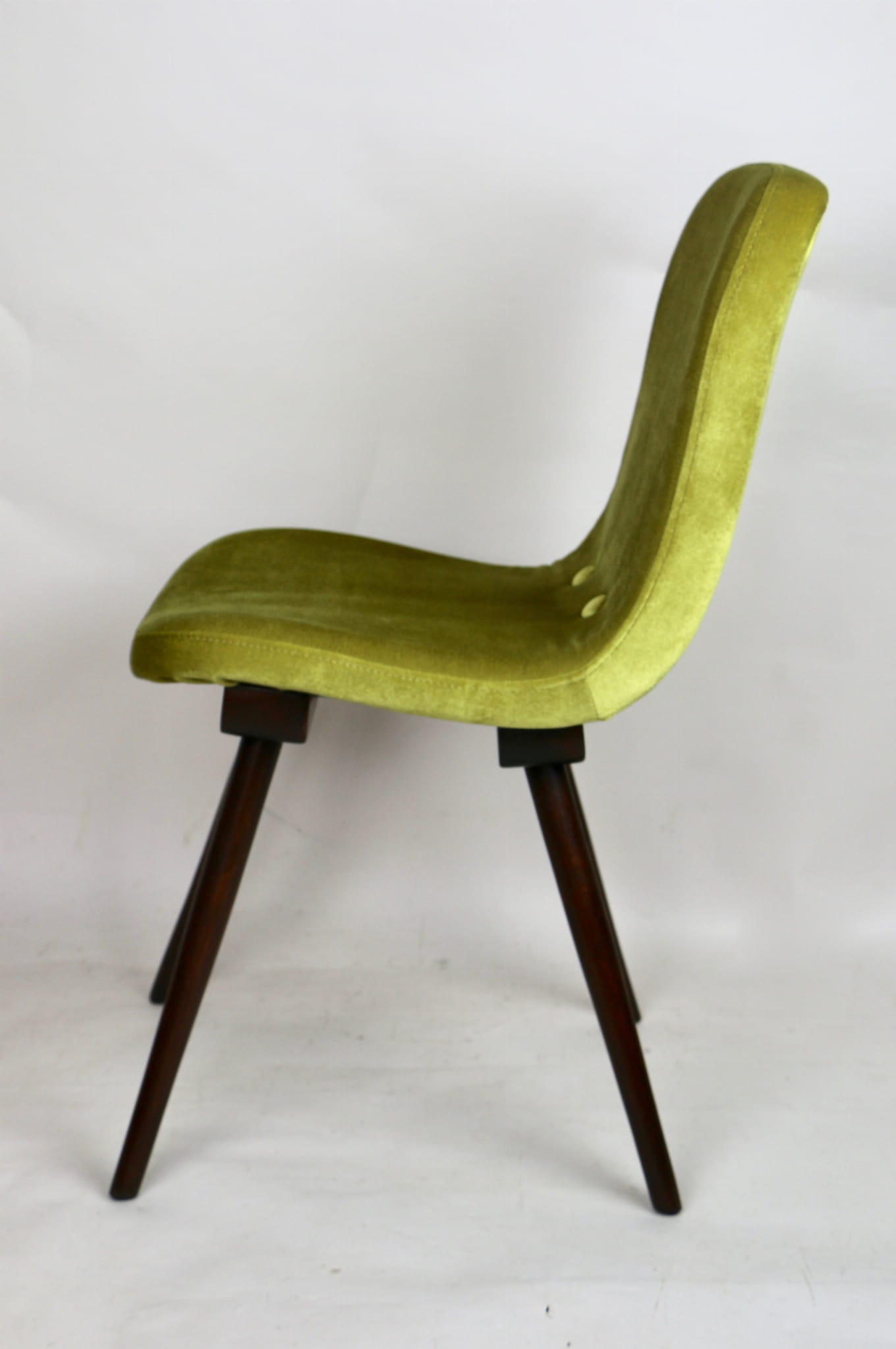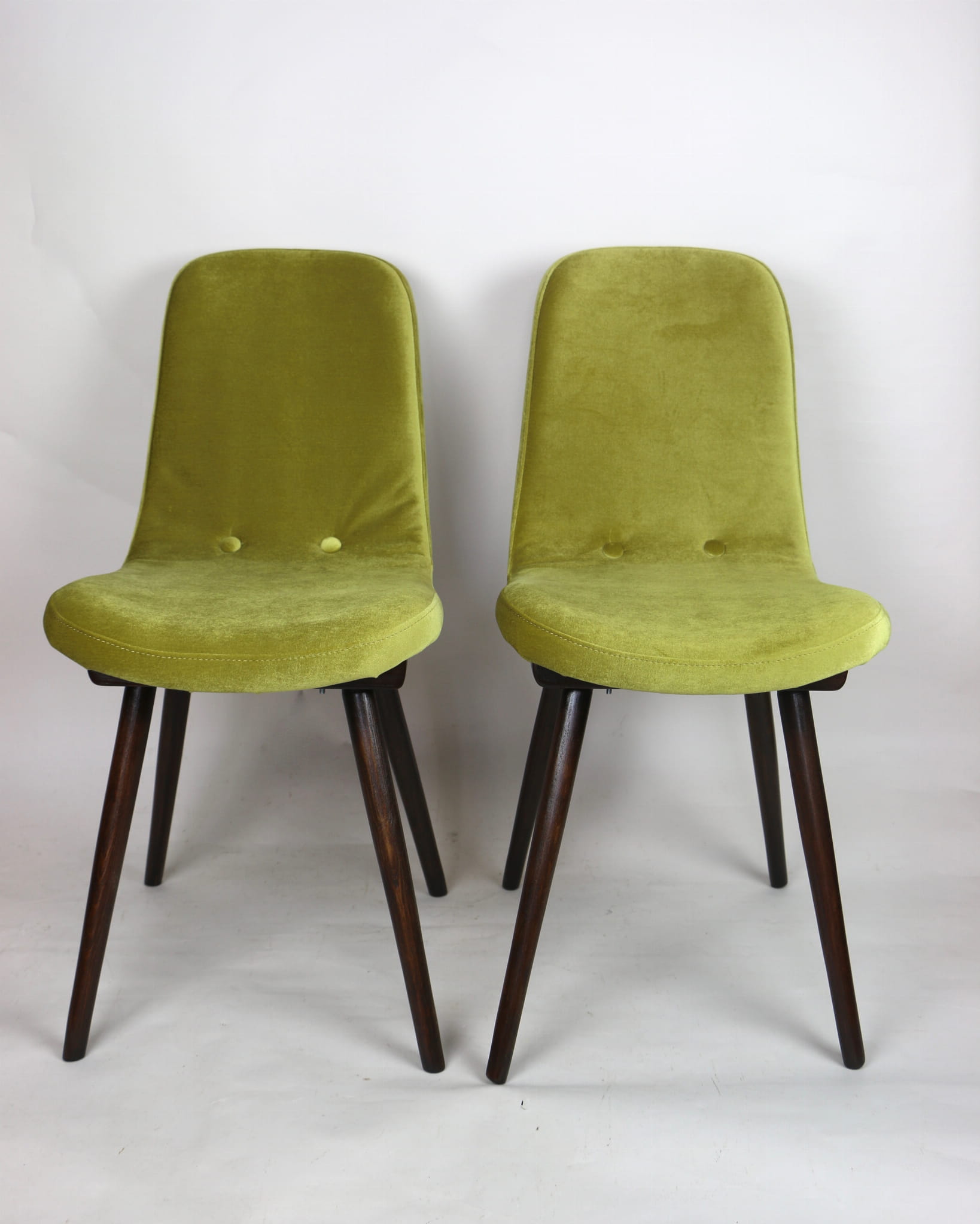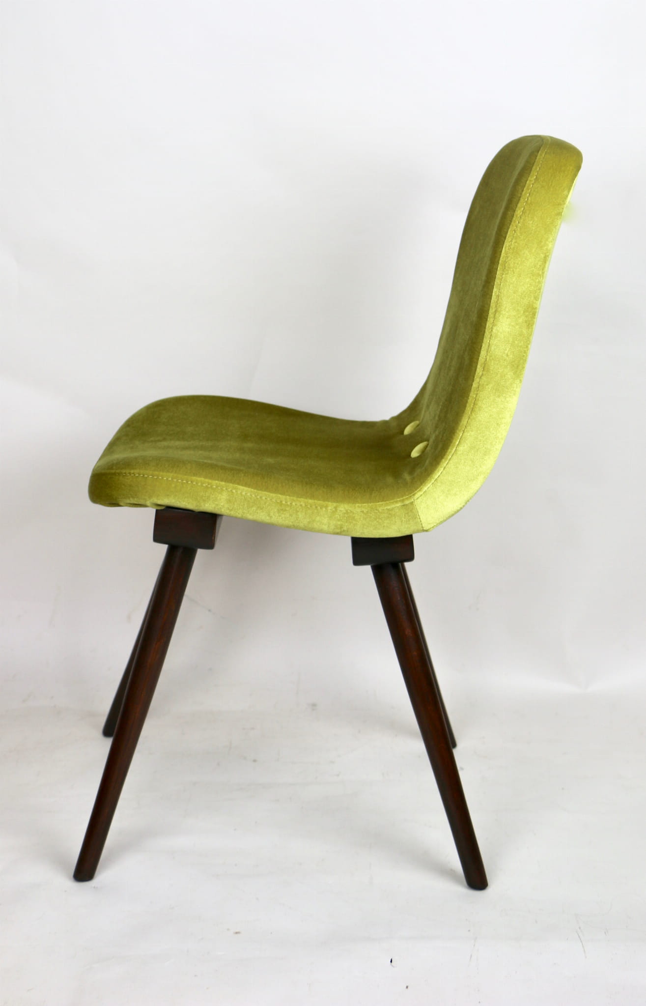 Odrestaurowane dwa krzesła typ A-6150. Stelaż drewniany w kolorze ciemnego orzecha. Siedzisko otrzymało nowe obicie pokryte tkaniną welwetową w kolorze żółto - złotym.