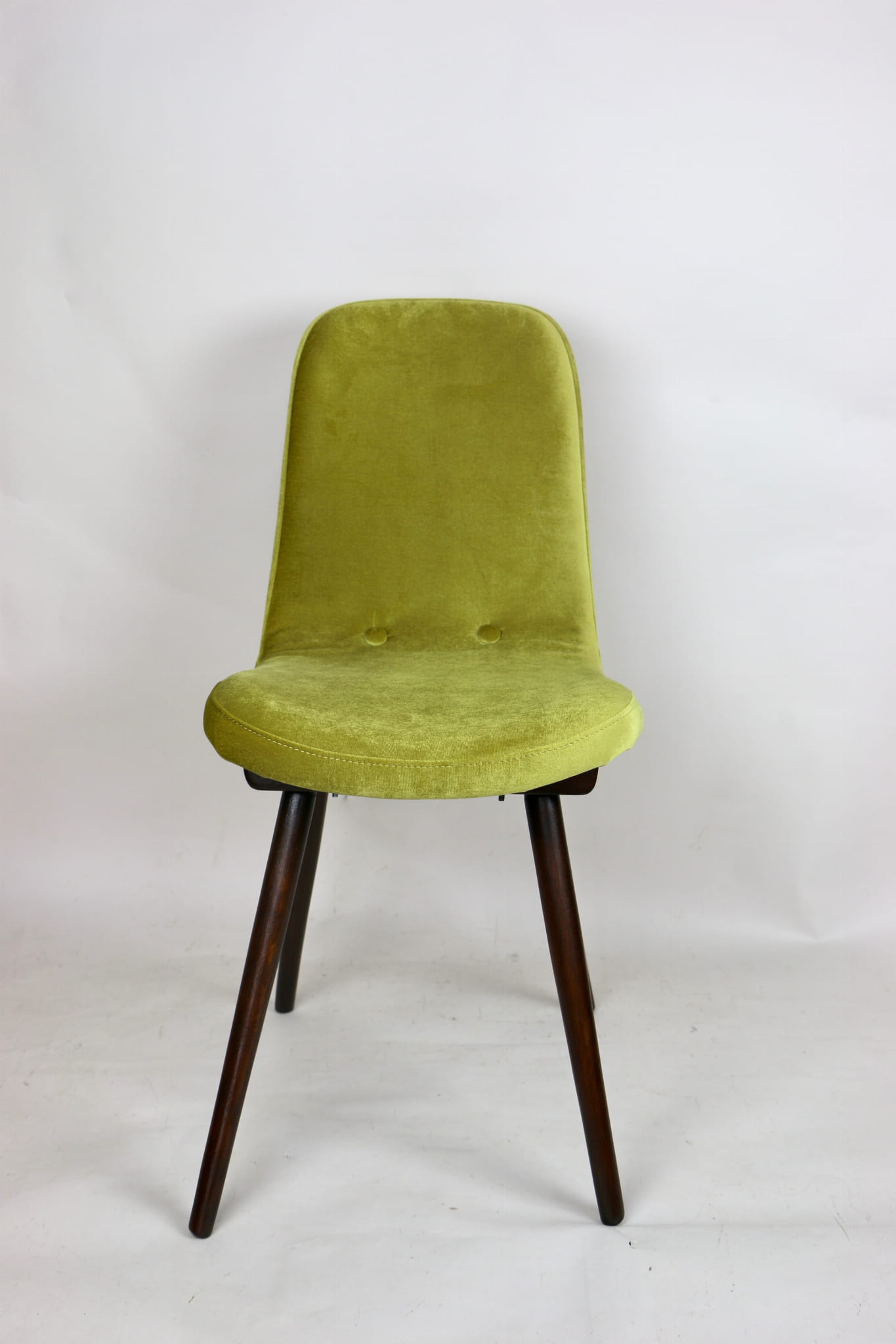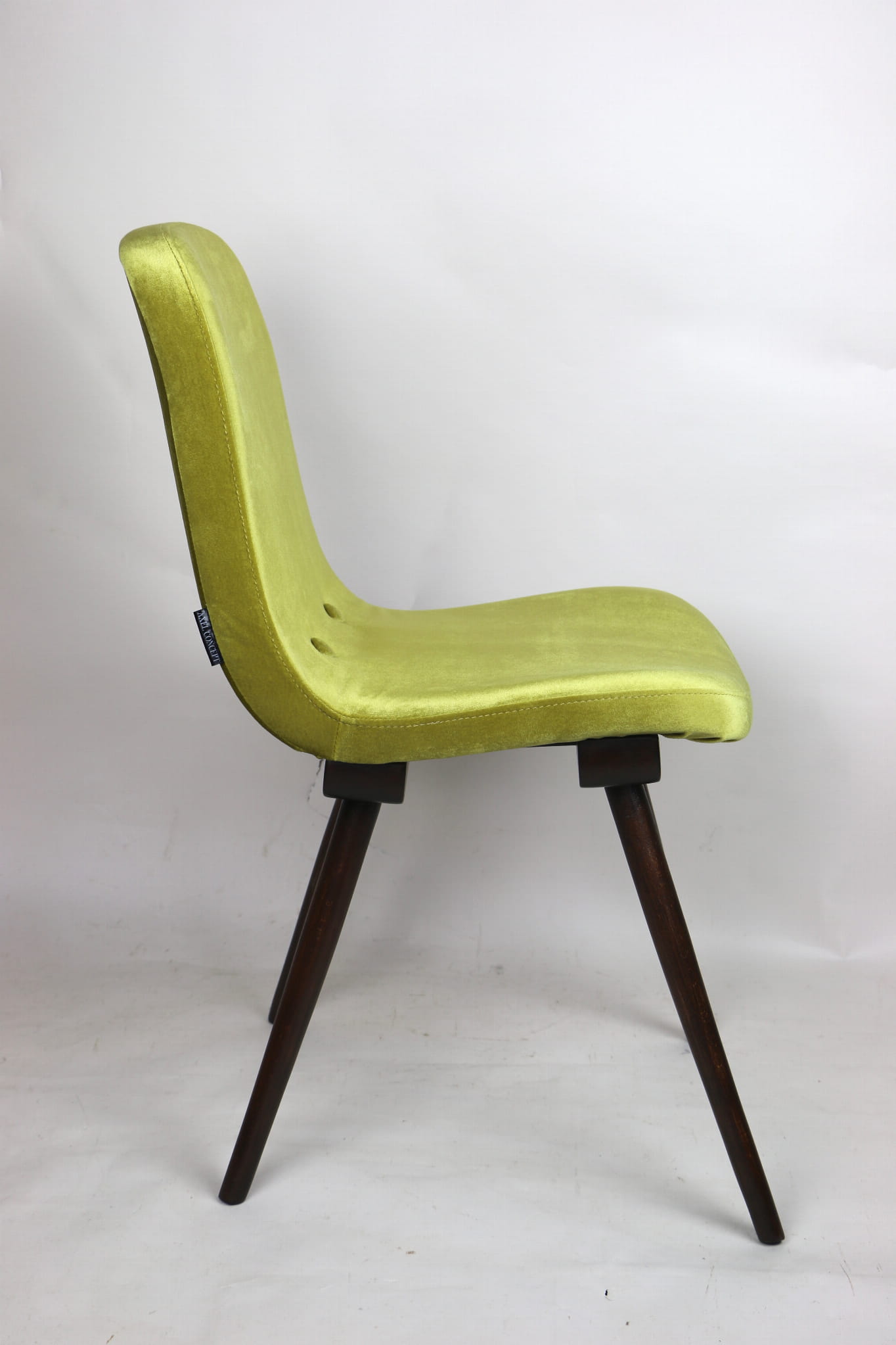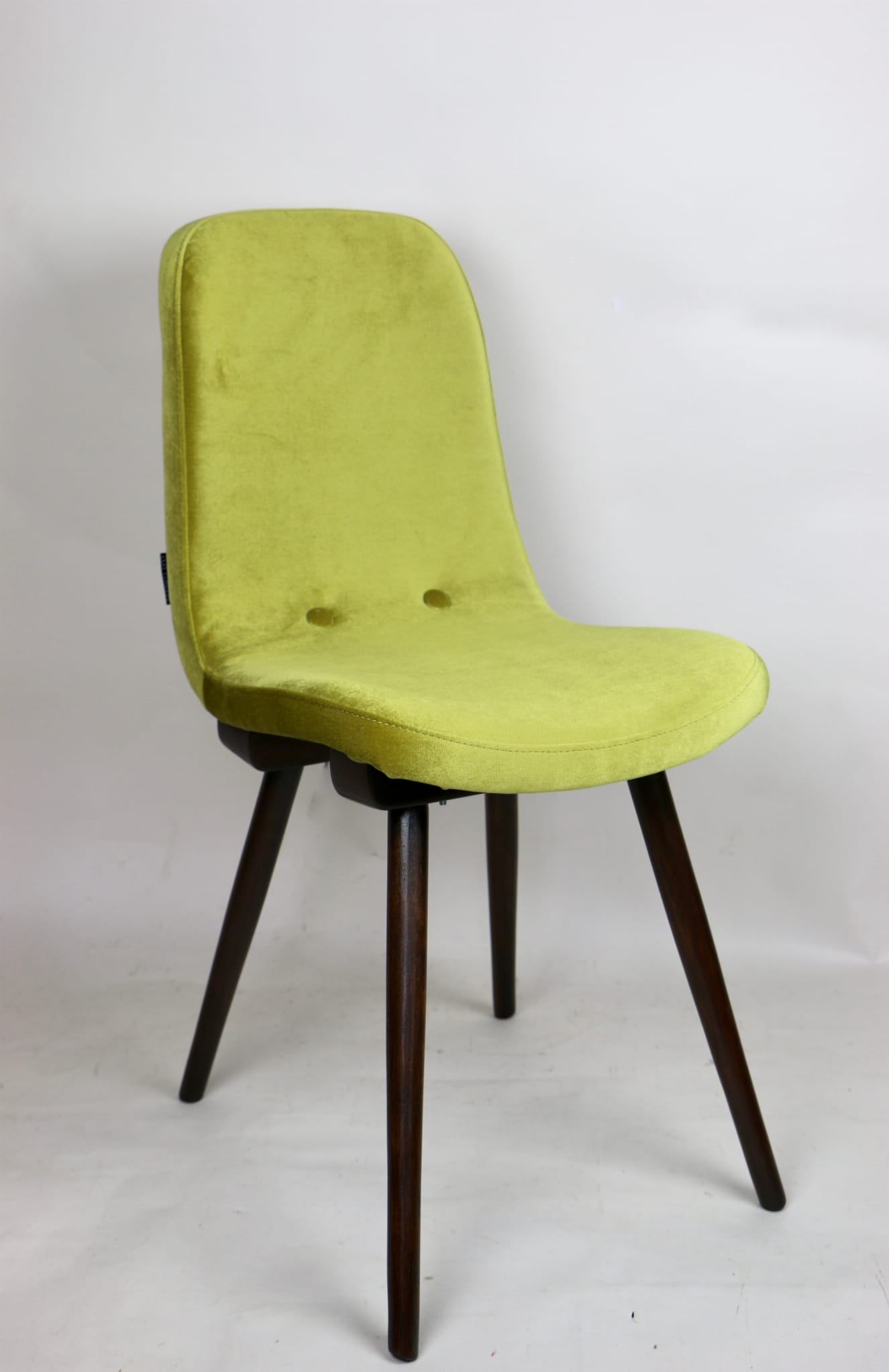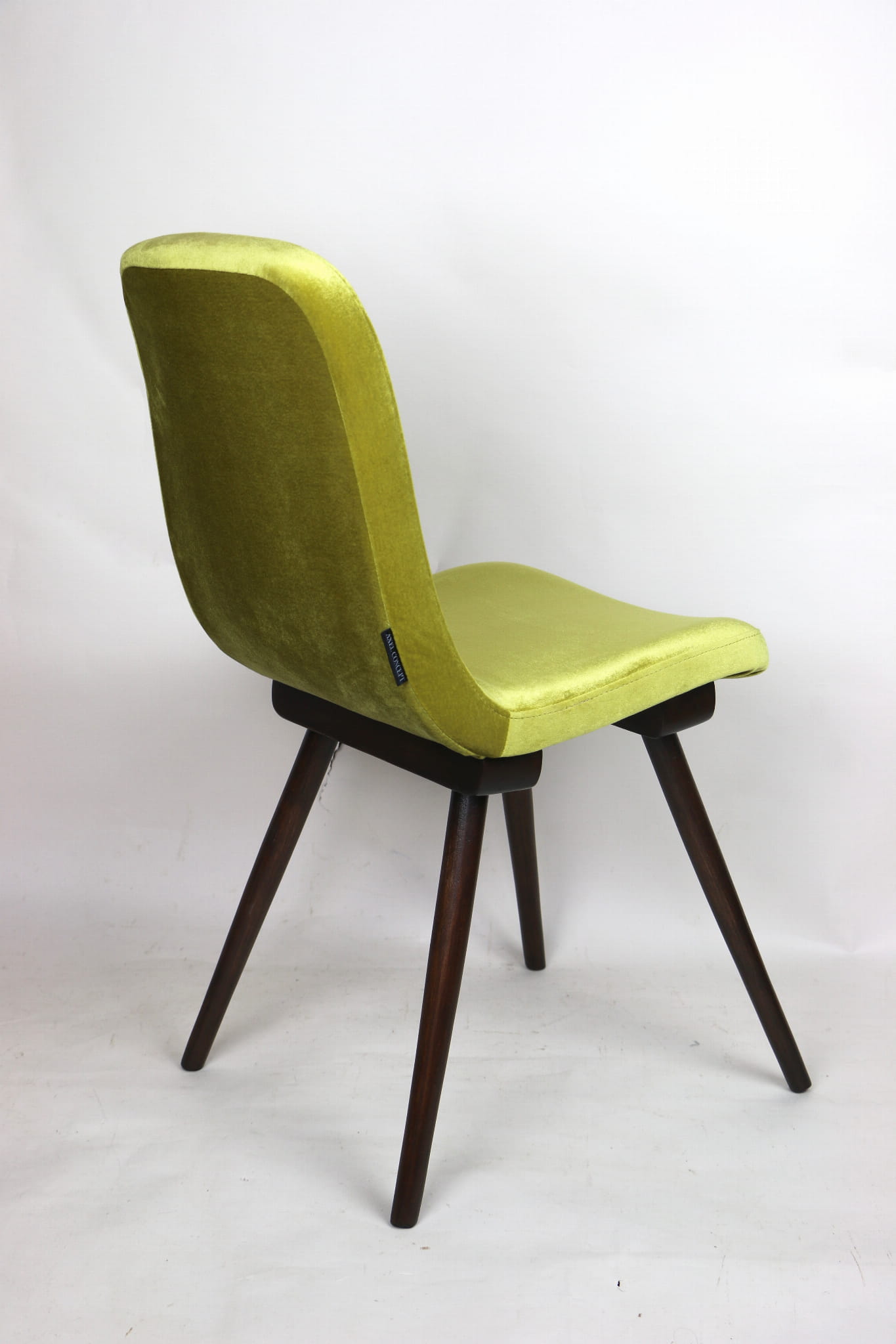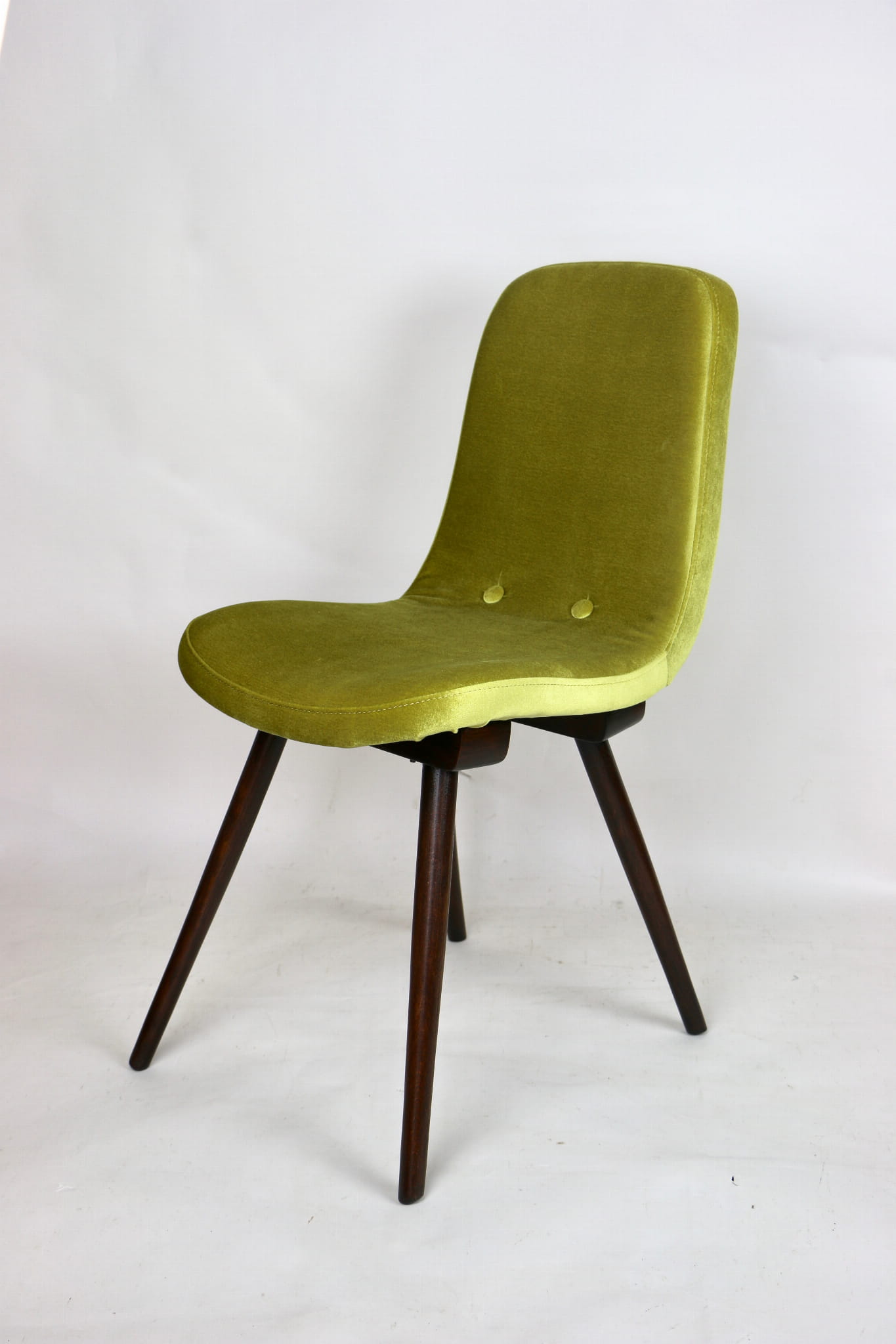 Odrestaurowane dwa krzesła typ A-6150. Stelaż drewniany w kolorze ciemnego orzecha. Siedzisko otrzymało nowe obicie pokryte tkaniną welwetową w kolorze żółto - złotym.