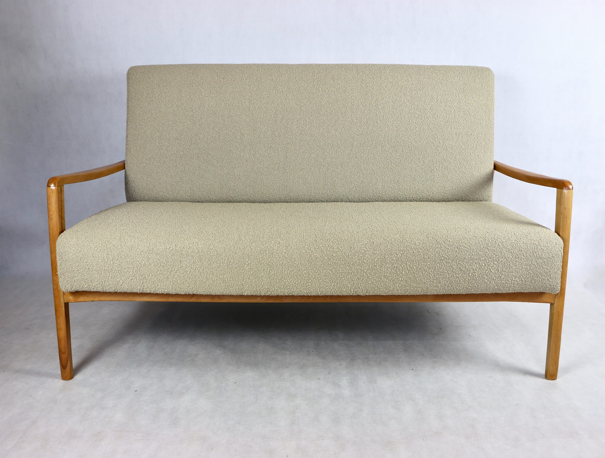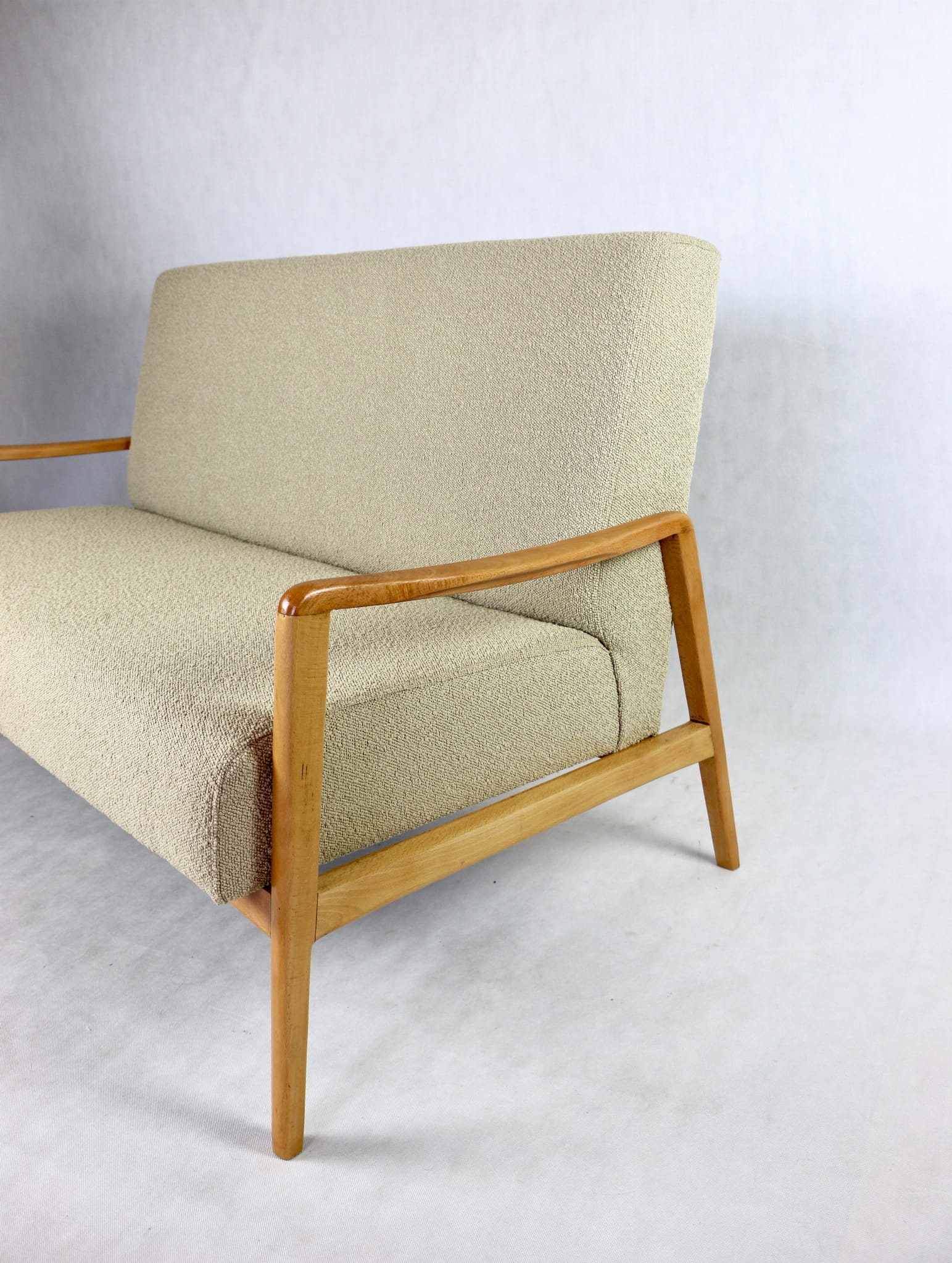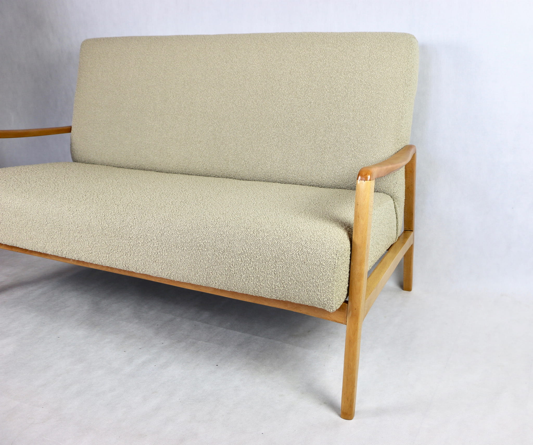 Piękna stylowa sofa dwu - trzyosobowa Vintage profesjonalnie odrestaurowana - produkcja rumuńska z lat 70 tych. Tapicerka została pokryta najwyższej jakości naturalnym materiałem tapicerskim w kolorze beżowym z serii boucle. Rama i konstrukcja drewniane w kolorze jasnego drewna pokryta lakierem.Siedziska i oparcia całkowicie wymienione i wypełnione pianką HR. Całość wykonana z najwyższą starannością i jakością. Stan kompletu idealny.
