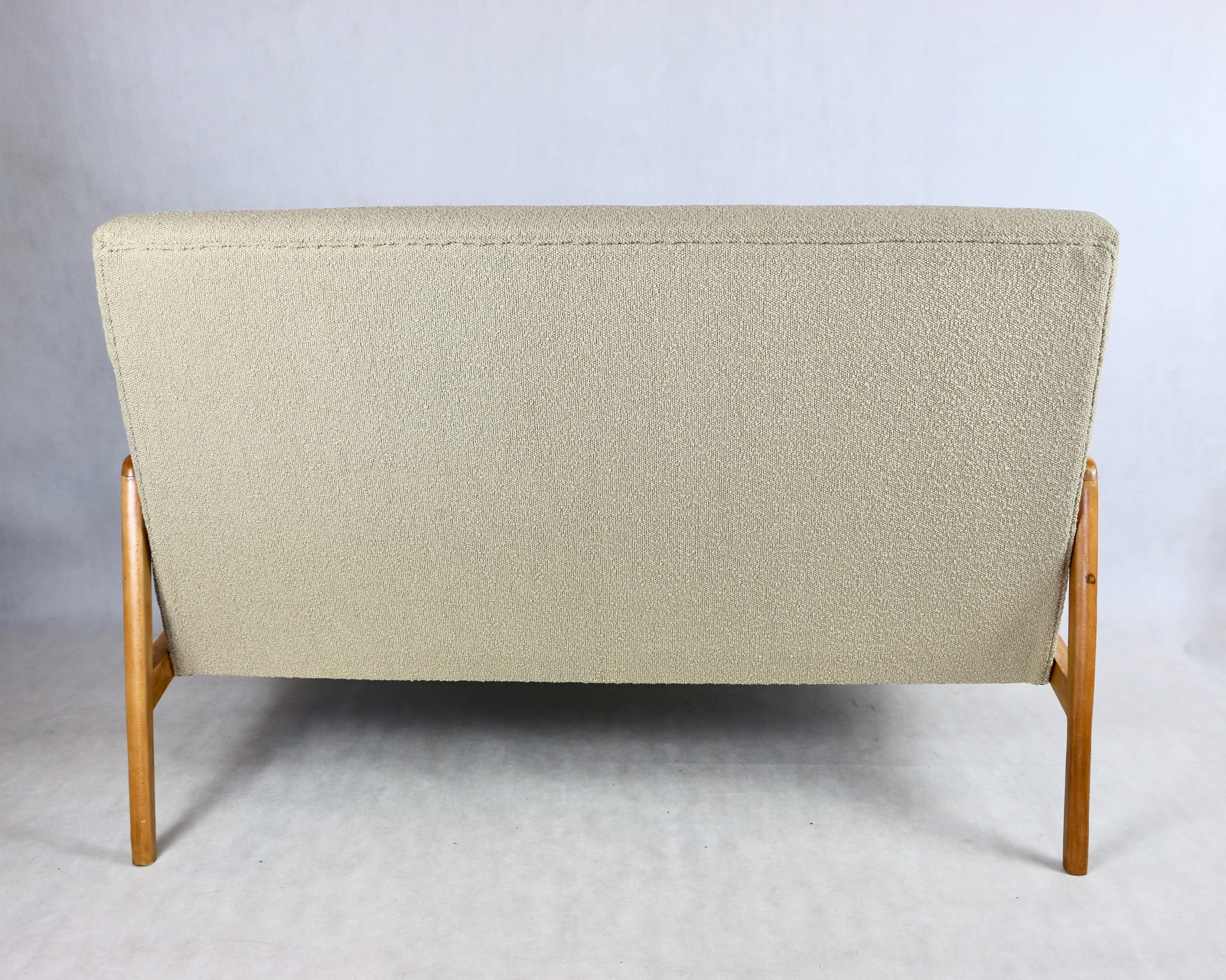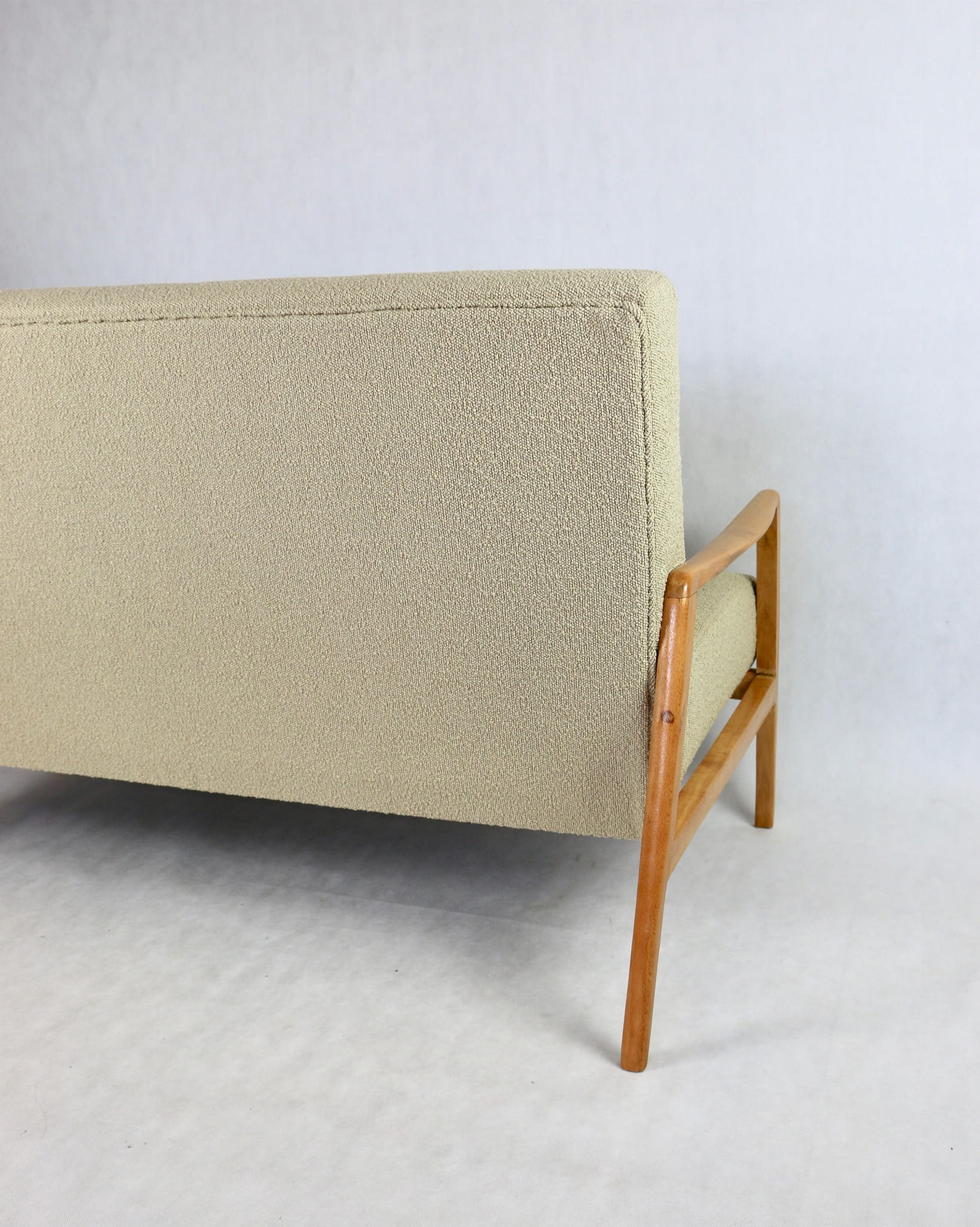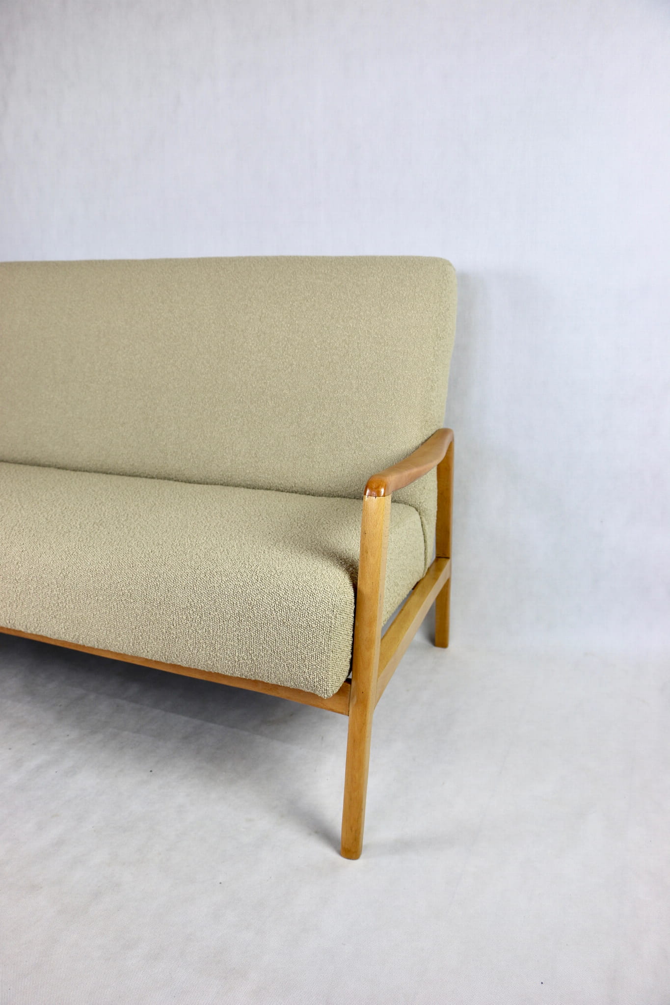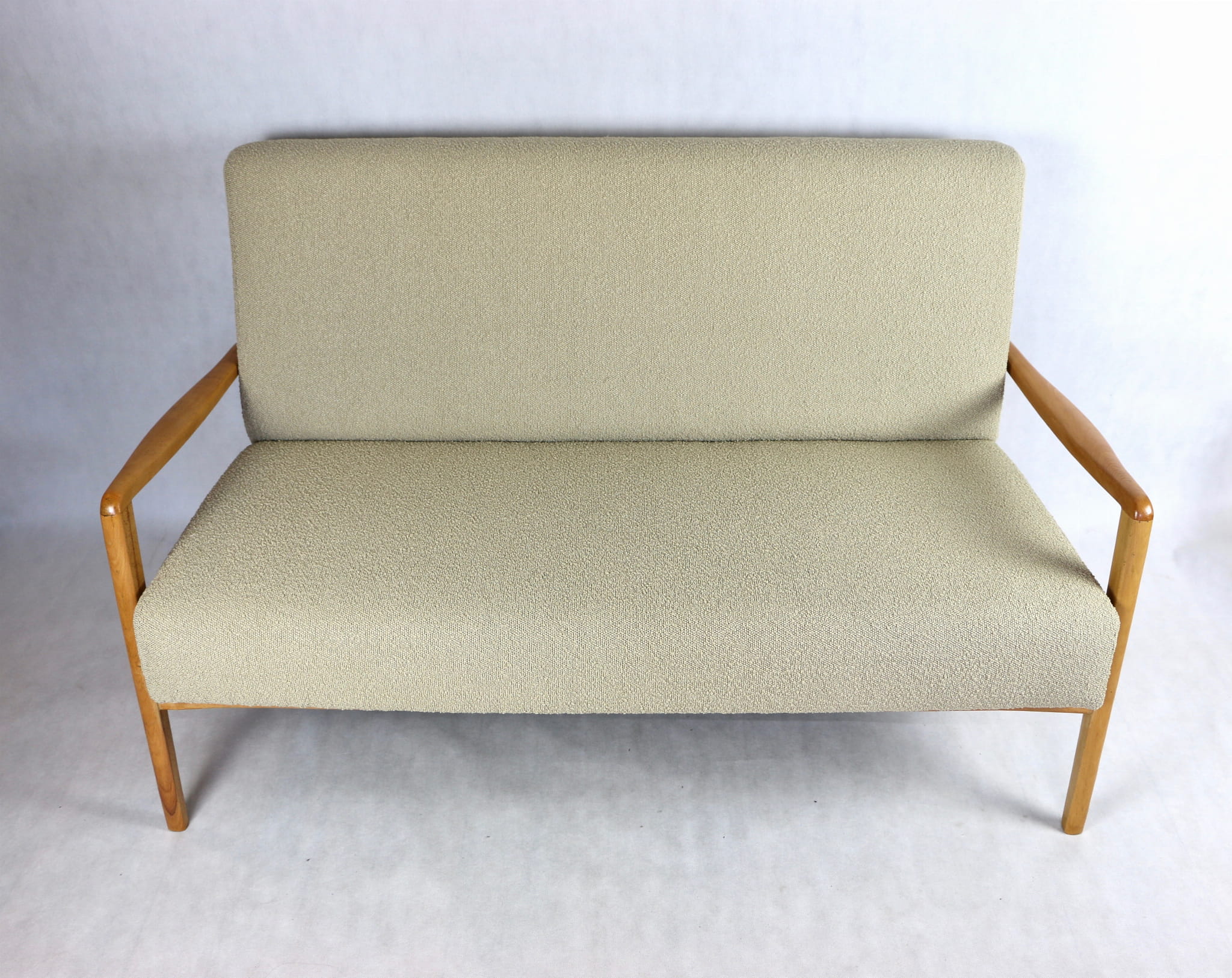 Piękna stylowa sofa dwu - trzyosobowa Vintage profesjonalnie odrestaurowana - produkcja rumuńska z lat 70 tych. Tapicerka została pokryta najwyższej jakości naturalnym materiałem tapicerskim w kolorze beżowym z serii boucle. Rama i konstrukcja drewniane w kolorze jasnego drewna pokryta lakierem.Siedziska i oparcia całkowicie wymienione i wypełnione pianką HR. Całość wykonana z najwyższą starannością i jakością. Stan kompletu idealny.