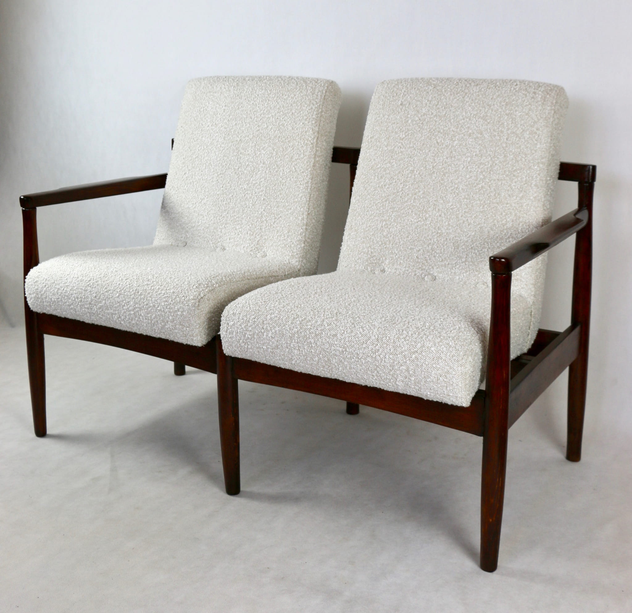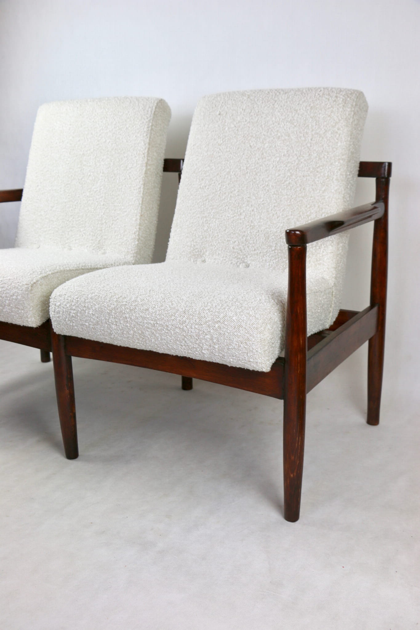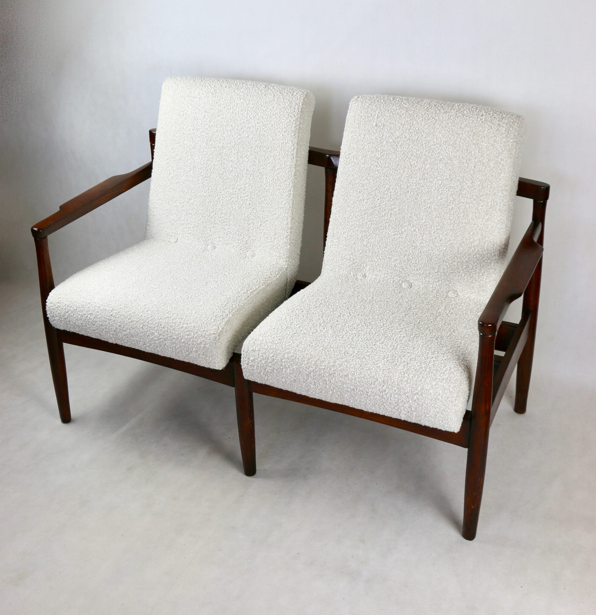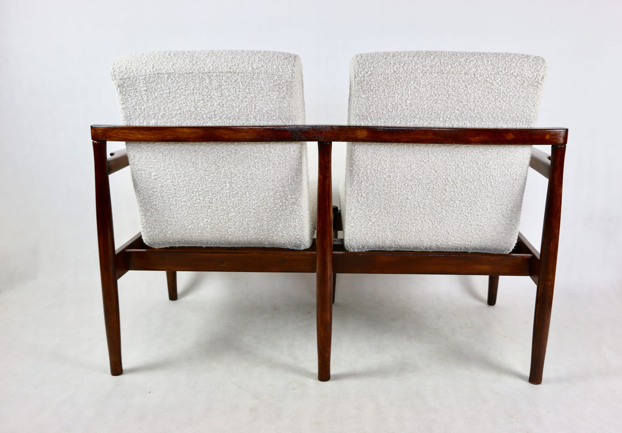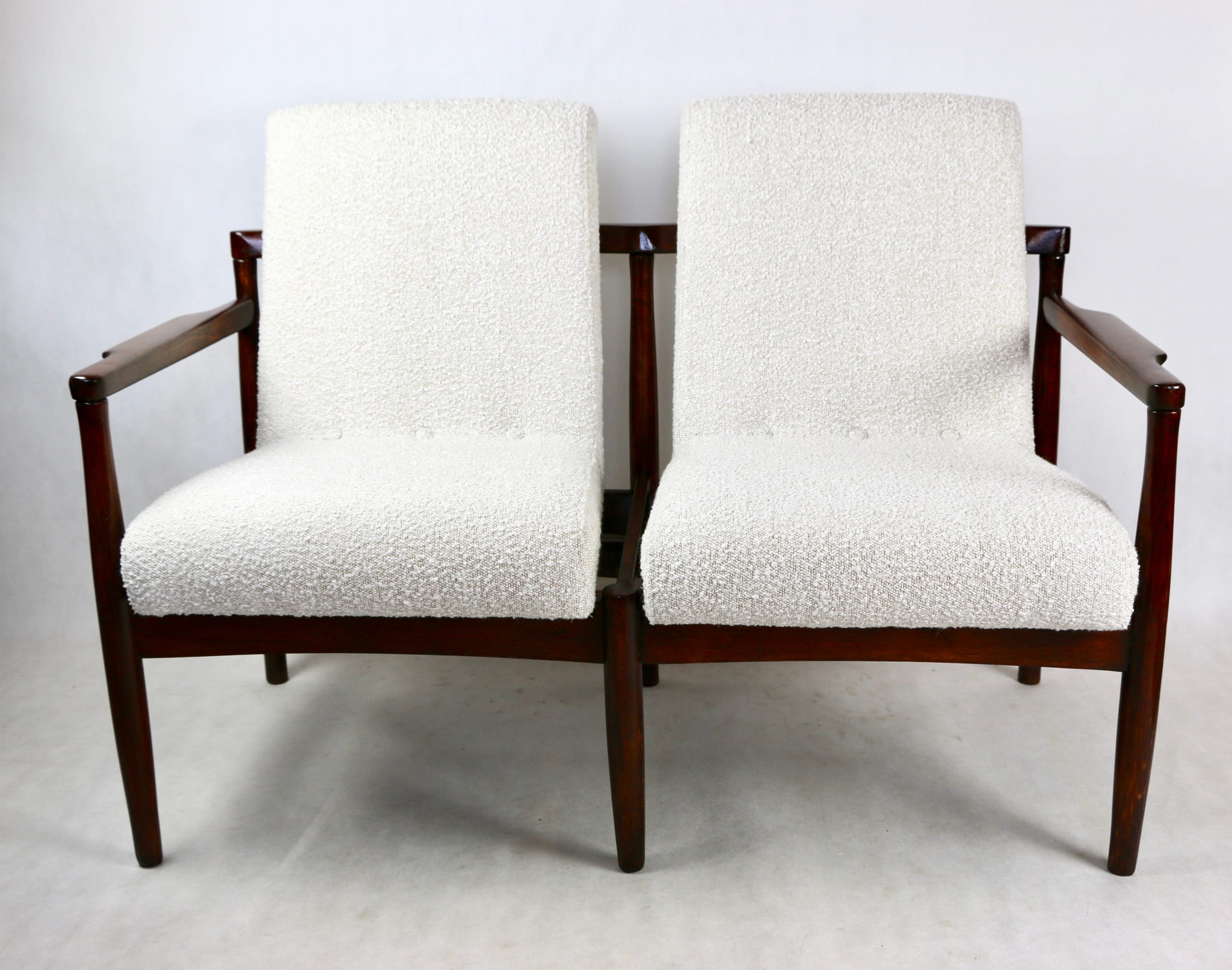 Piękna sofa dwu osobowa, ławka Vintage profesjonalnie odrestaurowana z lat 70 tych. Tapicerka została pokryta najwyższej jakości materiałem tapicerskim w kolorze kremowym z serii boucle. Rama i konstrukcja drewniane w kolorze ciemnego drewna pokryta lakierem i lakierobejcą. Siedziska i oparcia całkowicie wymienione i wypełnione nową pianką. Całość wykonana z najwyższą starannością i jakością.
