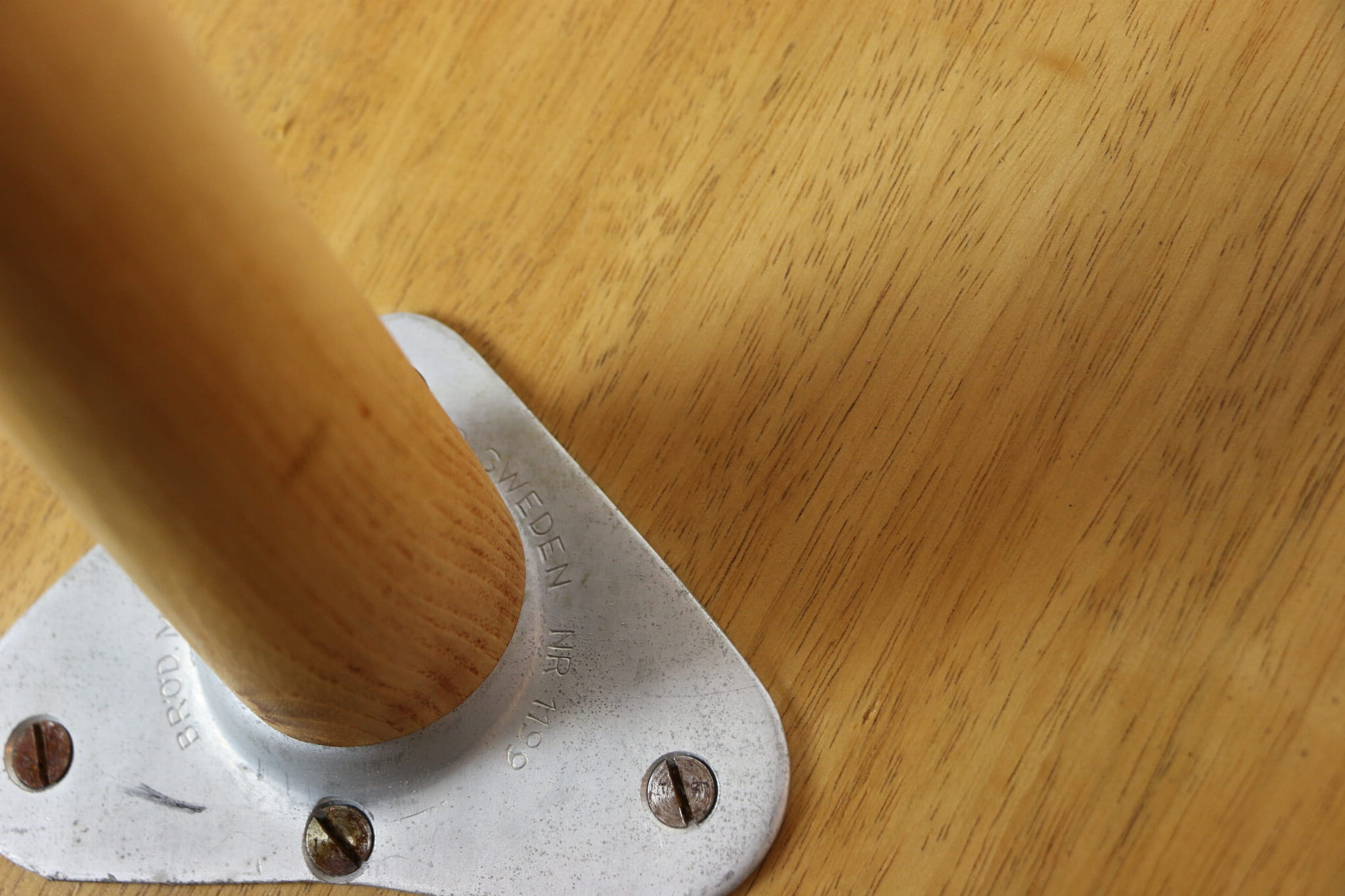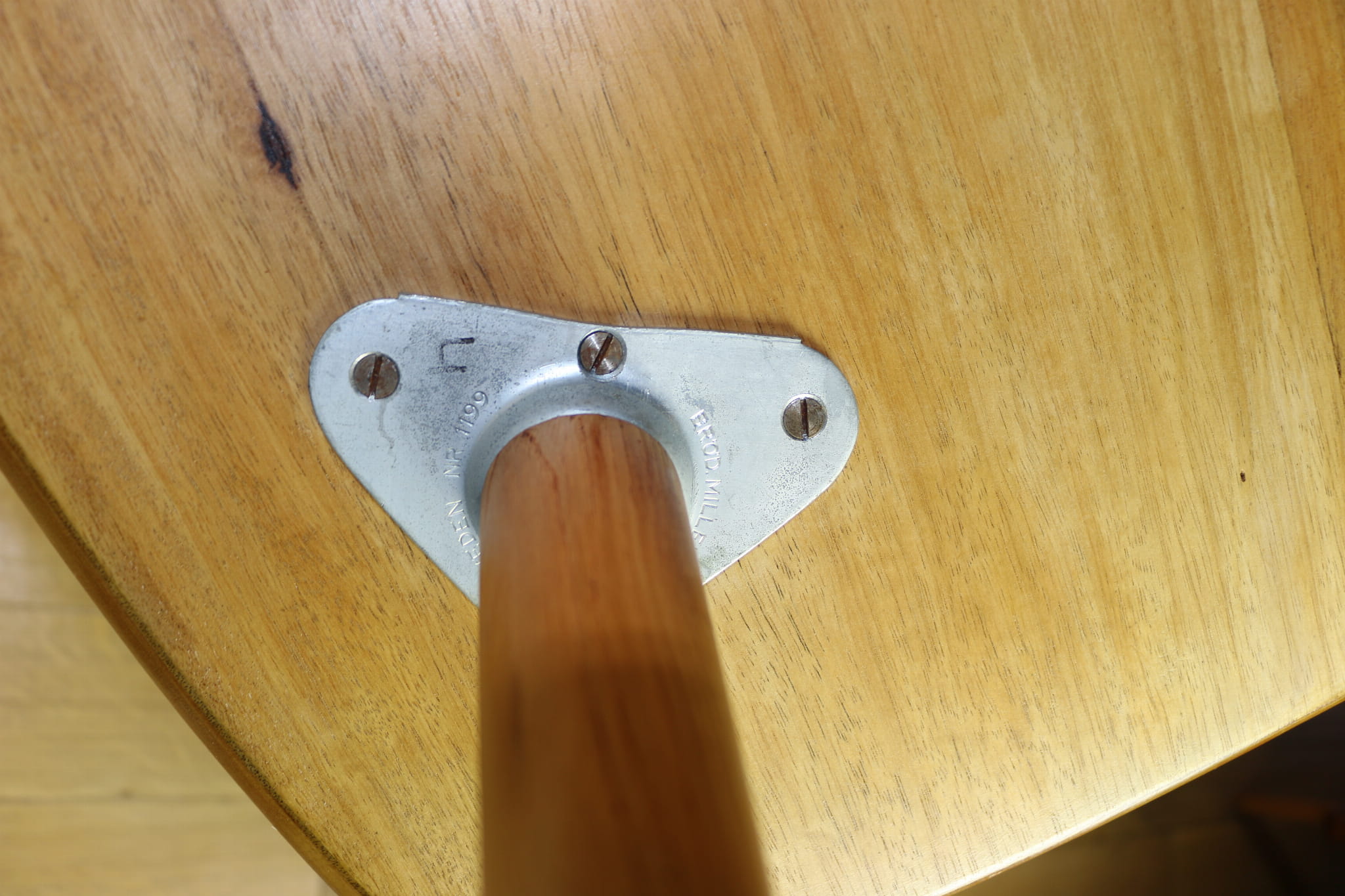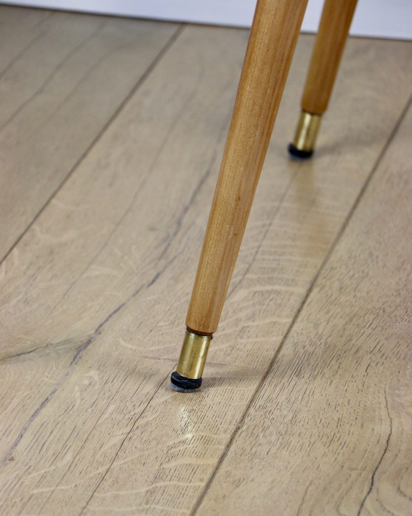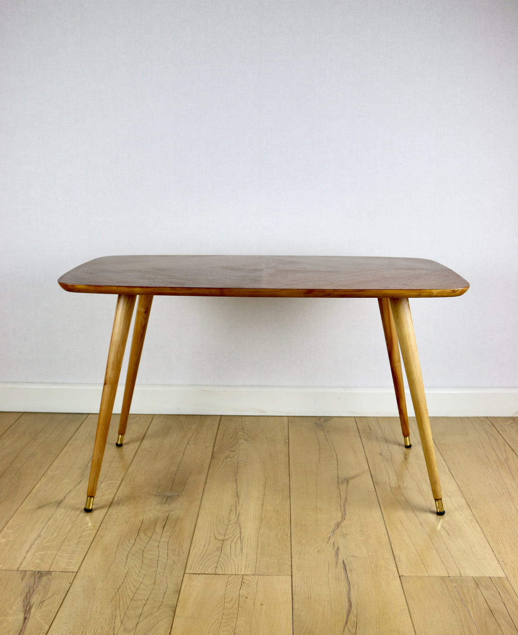 Stolik drewniany, ława o kształcie prostokątnym zaokrąglanym z lat 70 tych - wykonana w przepięknym stylu na okrągłych wykręcaych nogach zakończonych złotymi stopkami. Przepiękny strukturalny blat jest wykonany z forniru z orzecha włoskiego ułożonego w kształcie jodełki. Produkcja skandynawska - na elementach metalowych łączeniowych jest napisane wyprodukowane w Szwecji.