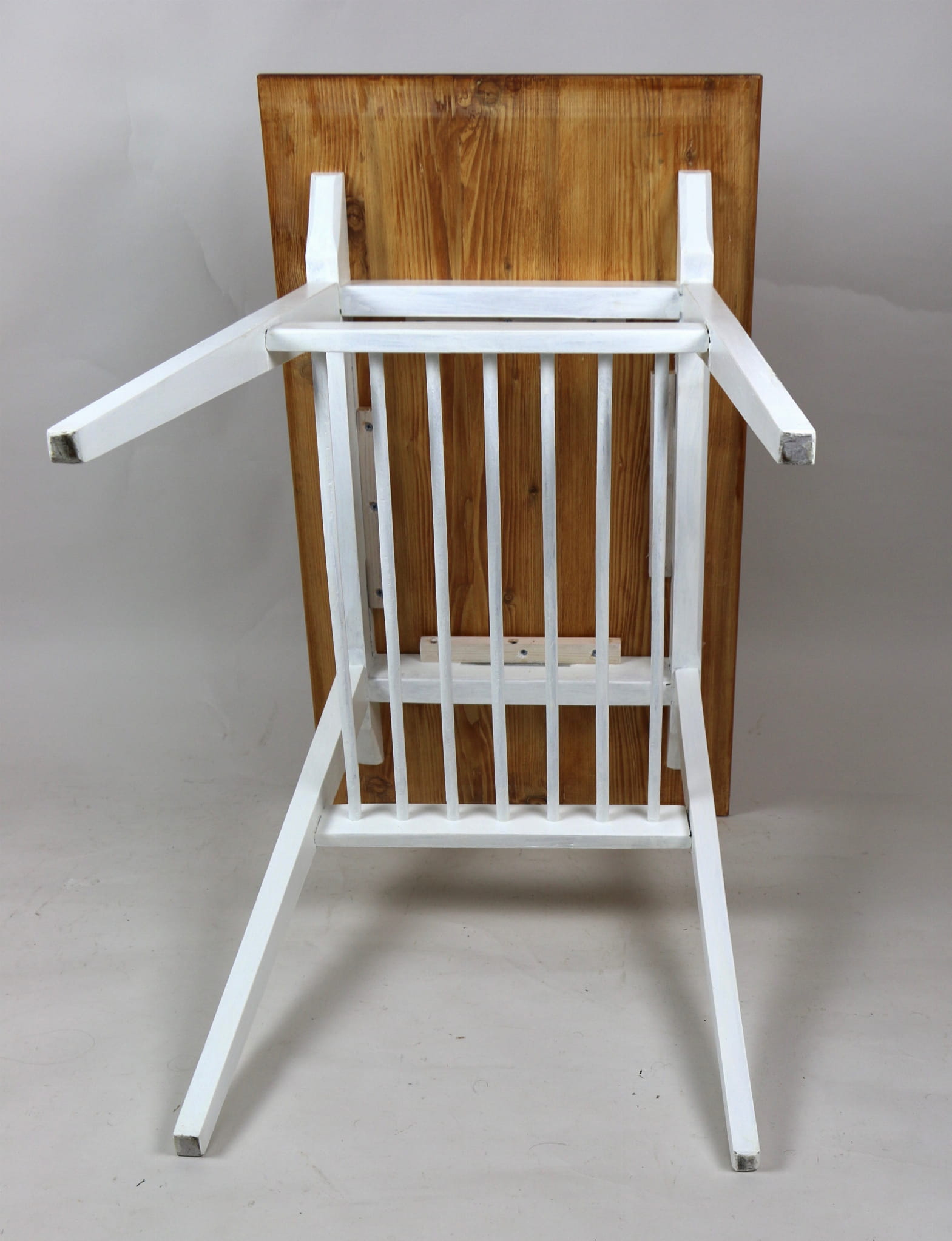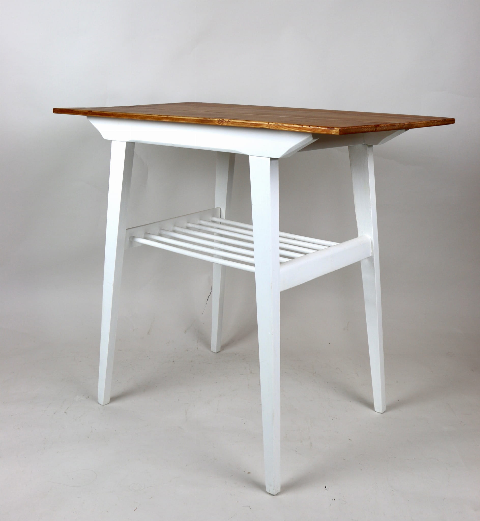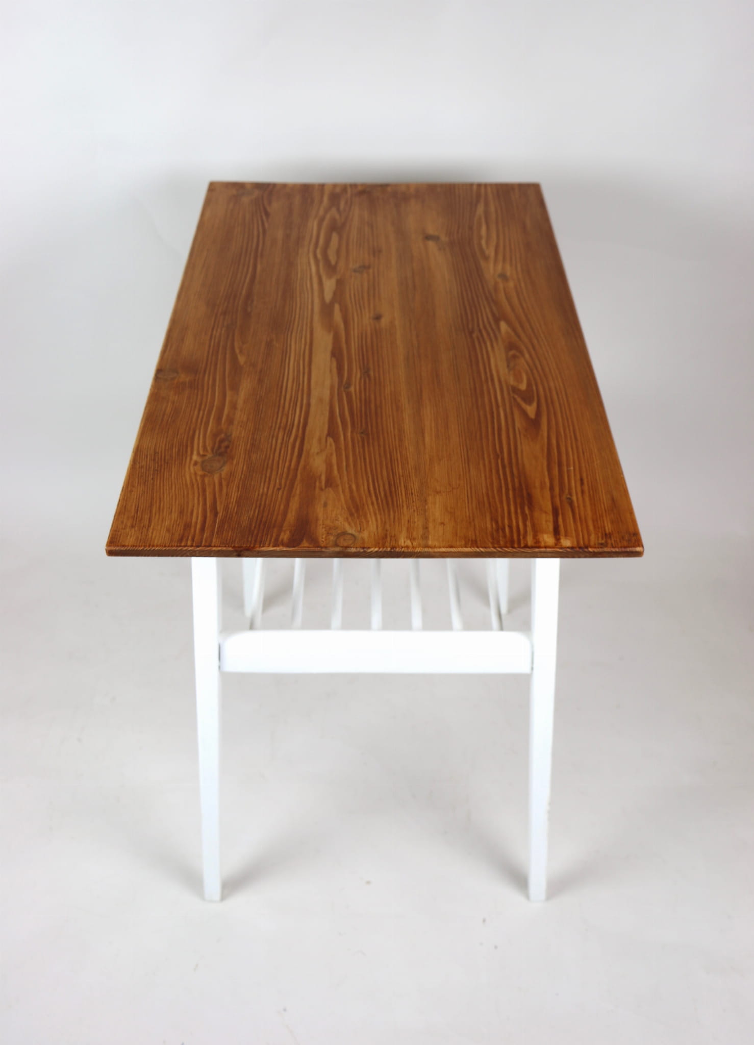 Stolik drewniany całkowicie odrestaurowany na bazie ławy ze szczebelkami z lat 70 tych. Został w nim wymieniony blat na całkowicie nowy z drewna klejonego o grubości 2 cm, a podstawa oczyszczona ze starego lakieru i pomalowana białą farbą akrylową. Konstrukcja ponadczasowa ze względu na szczebelki. Stan: bardzo dobry.