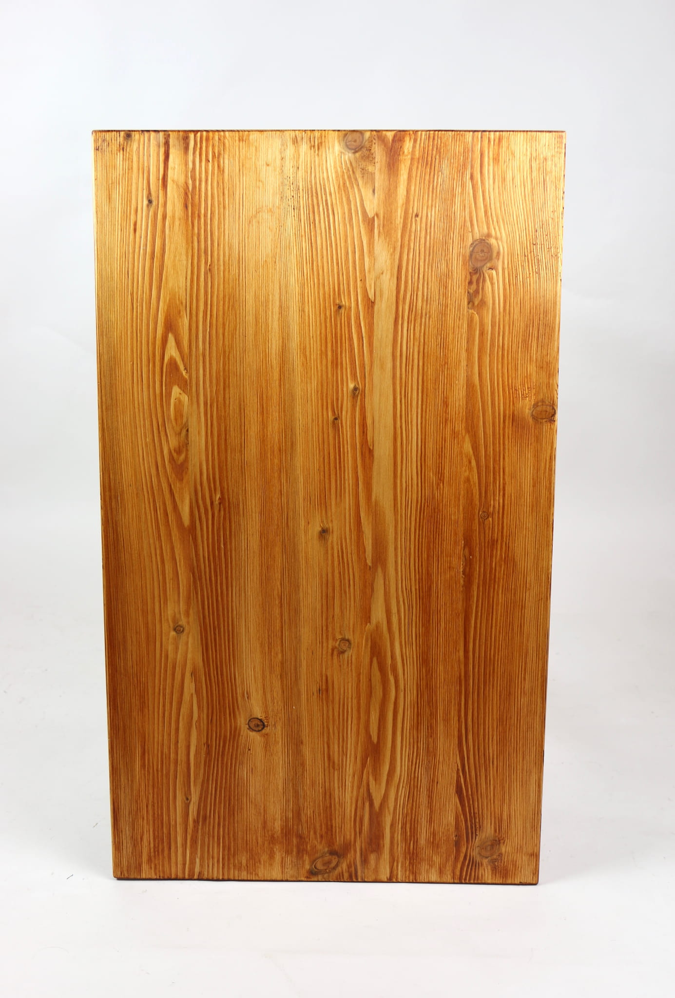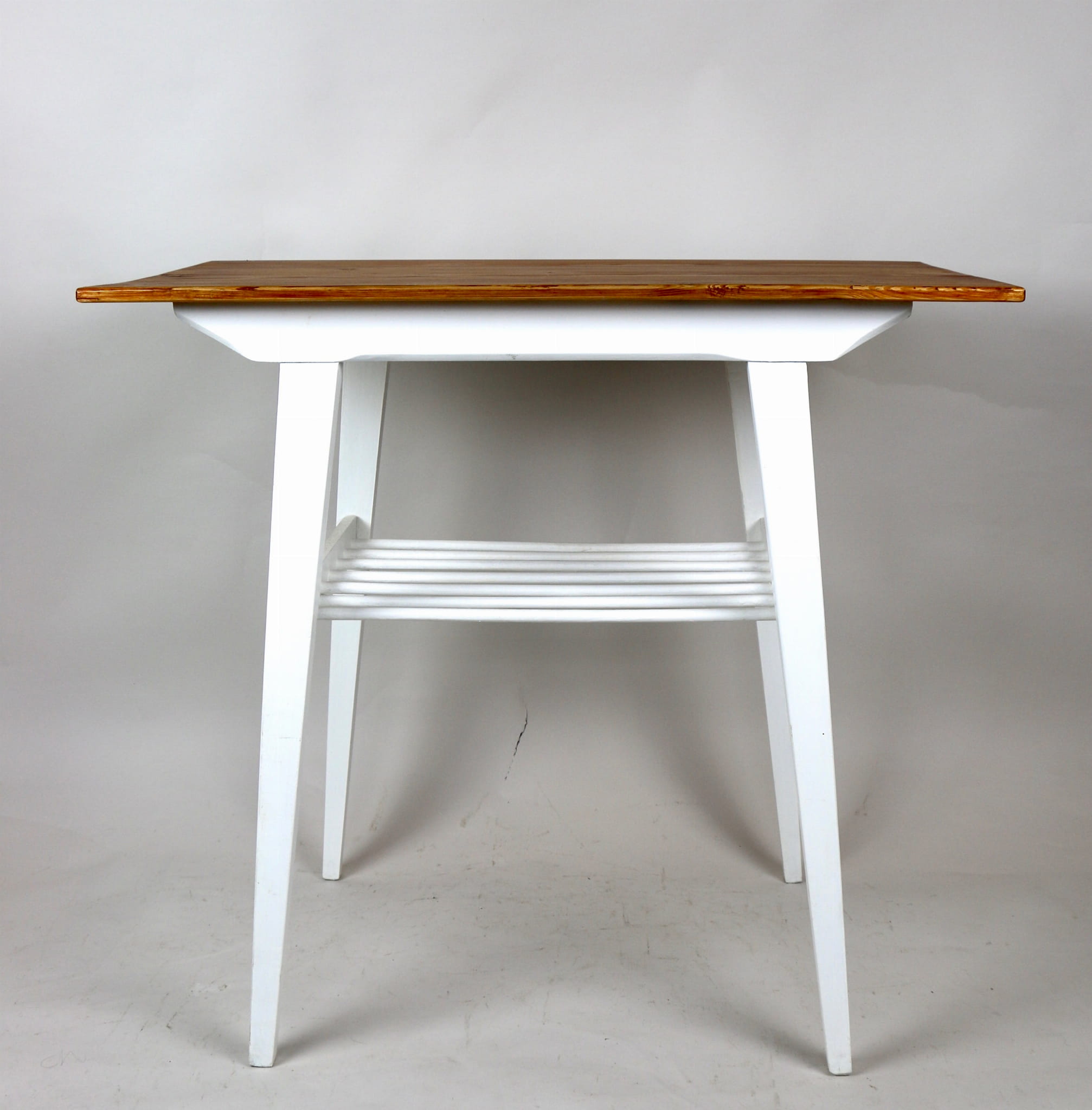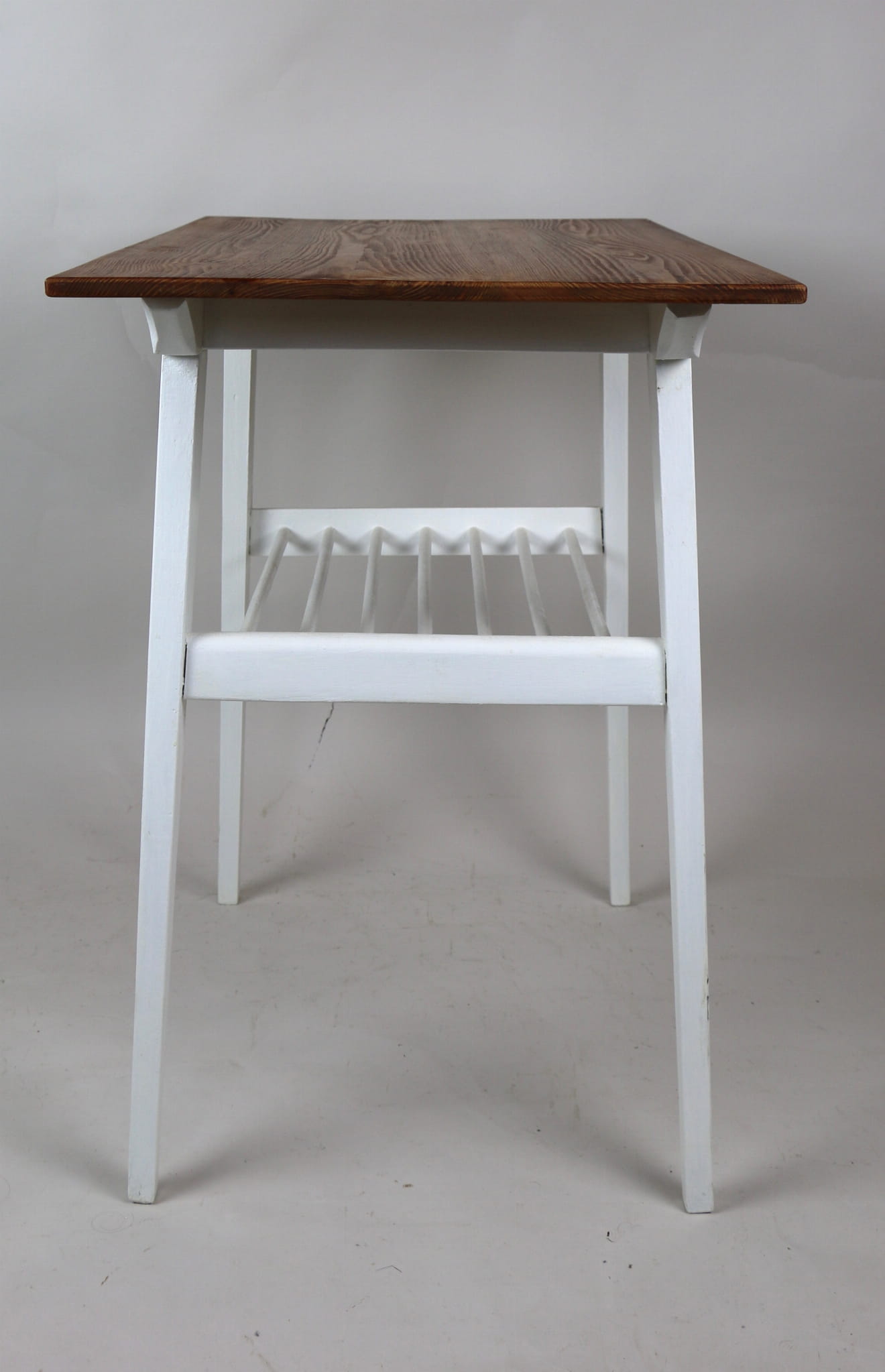 Stolik drewniany całkowicie odrestaurowany na bazie ławy ze szczebelkami z lat 70 tych. Został w nim wymieniony blat na całkowicie nowy z drewna klejonego o grubości 2 cm, a podstawa oczyszczona ze starego lakieru i pomalowana białą farbą akrylową. Konstrukcja ponadczasowa ze względu na szczebelki. Stan: bardzo dobry.