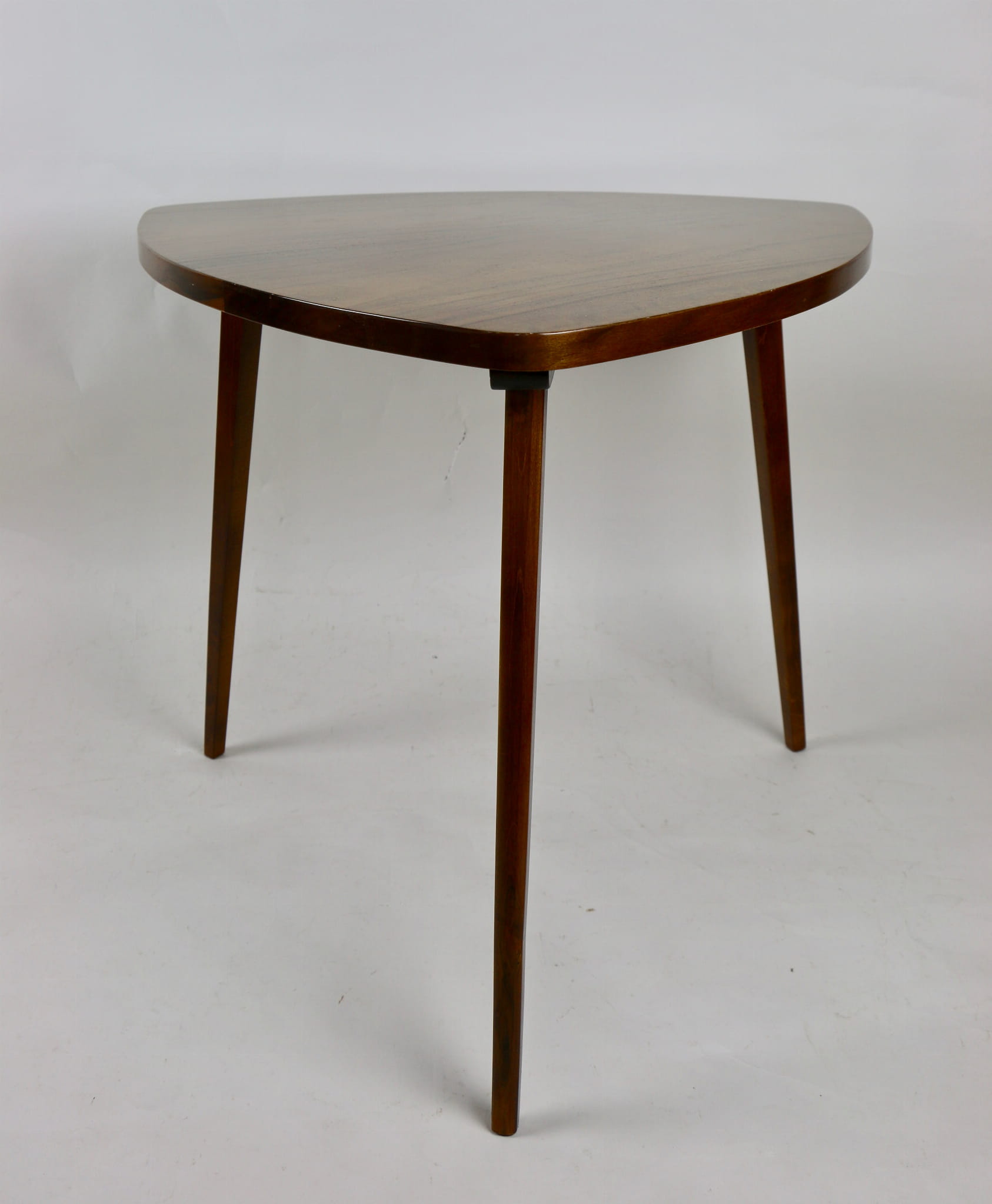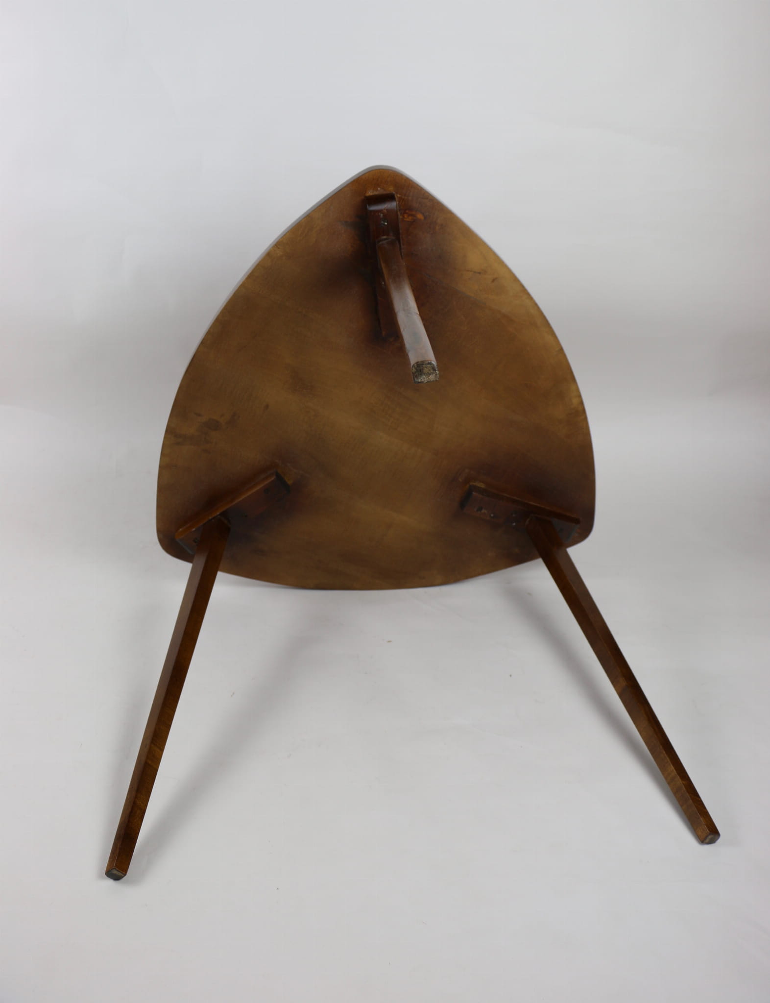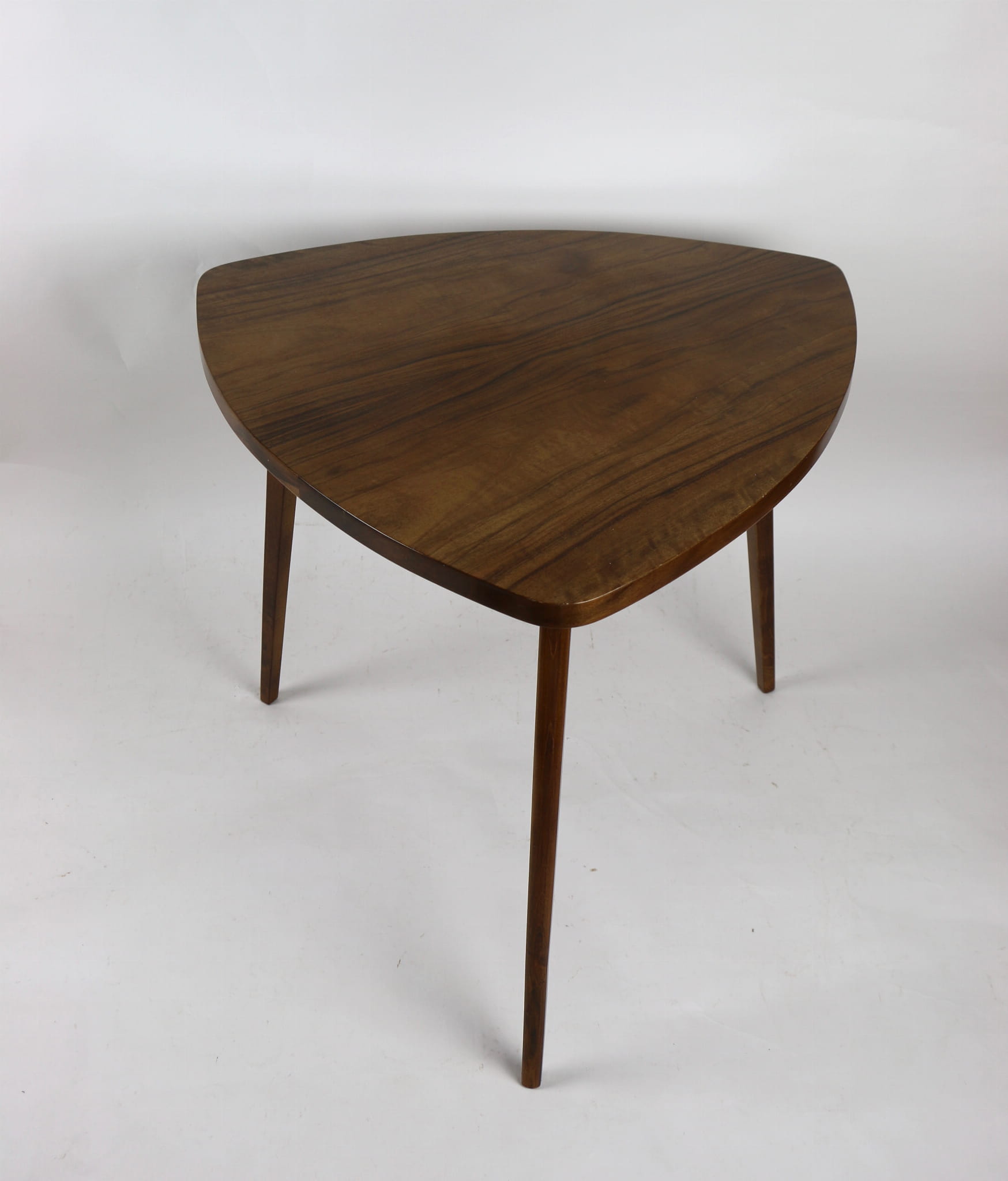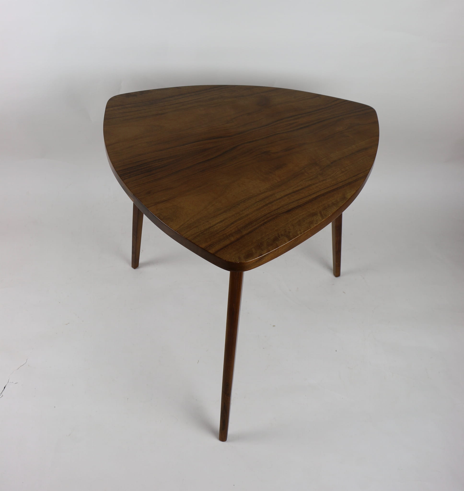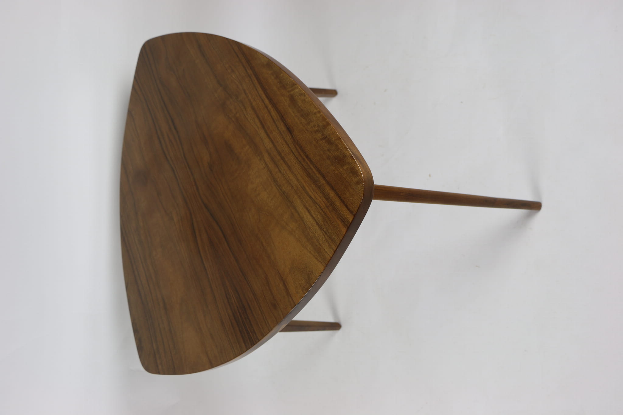 Drewniany stolik liść, całkowicie odrestaurowany w kolorze orzechu. Blat i nogi oraz pozostałe elementy pokryte są lakierem o strukturze wysokiego połysku.
