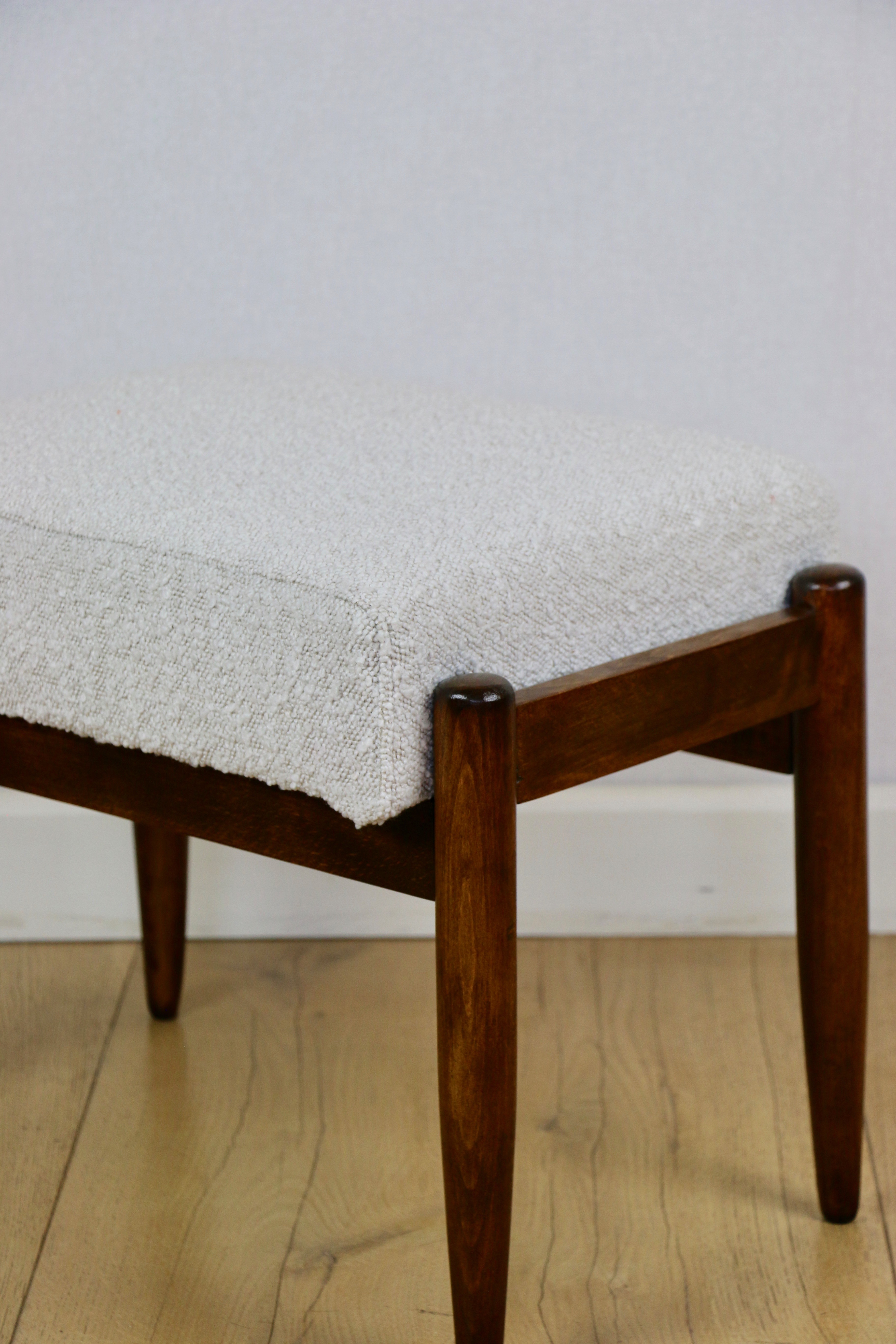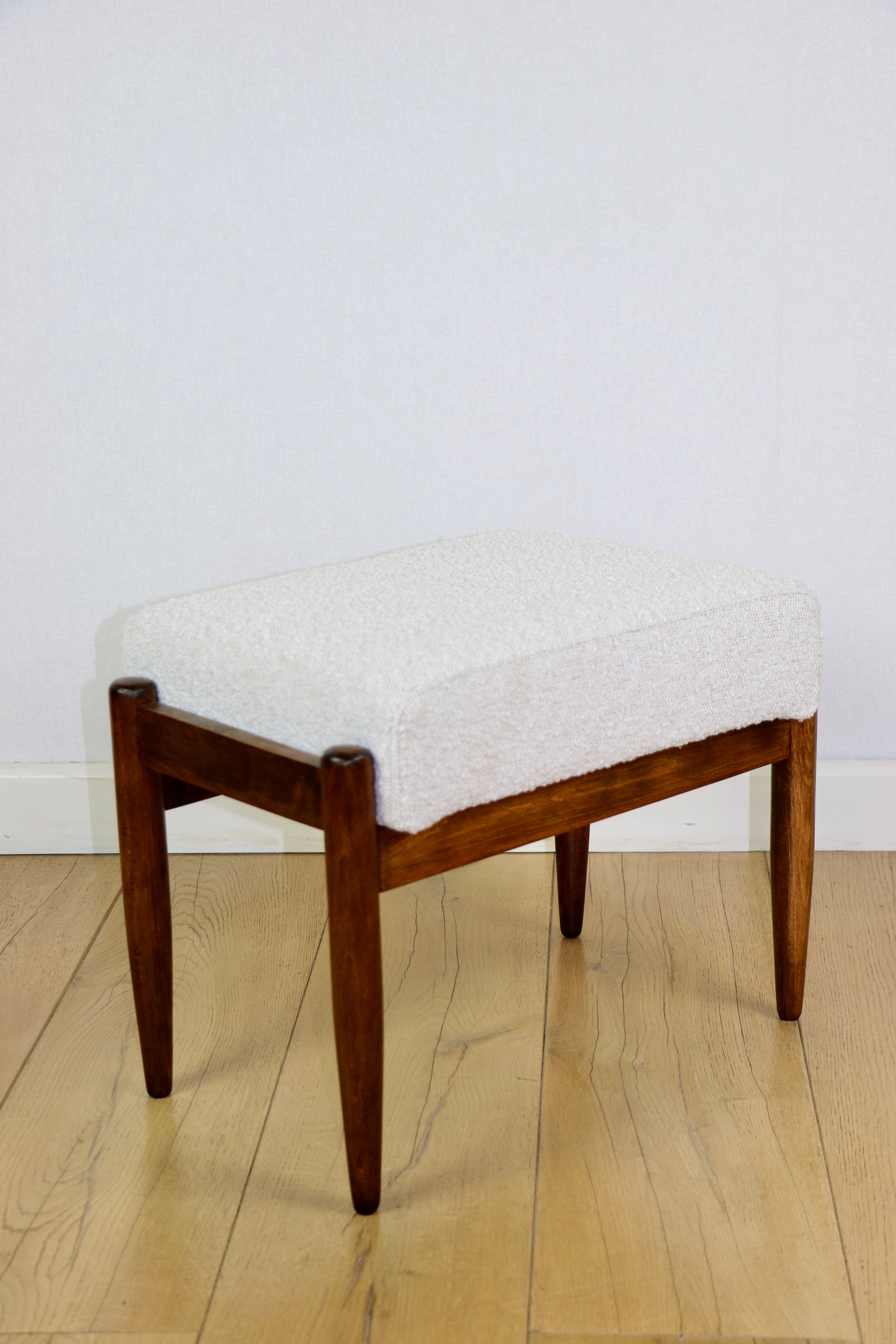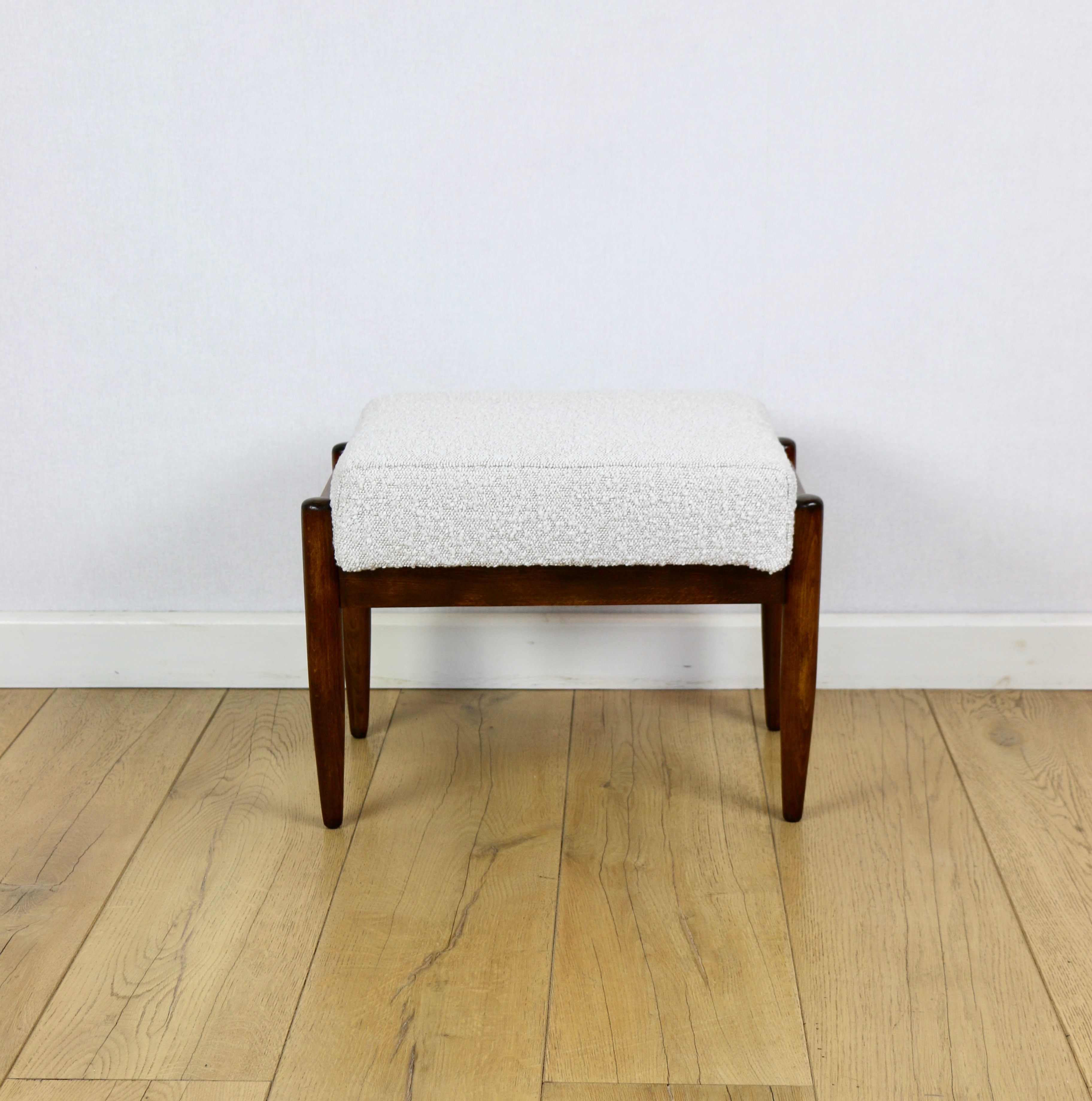 Taboret projektu Edmund Homa produkowany w lata 70tych. Całkowicie odnowiony, obicie w strukturalnej tkaninie z serii boucle w kolorze biało - kremowym ivory white cream. Nóżki drewniane w ciemnym kolorze - drewno bukowe.