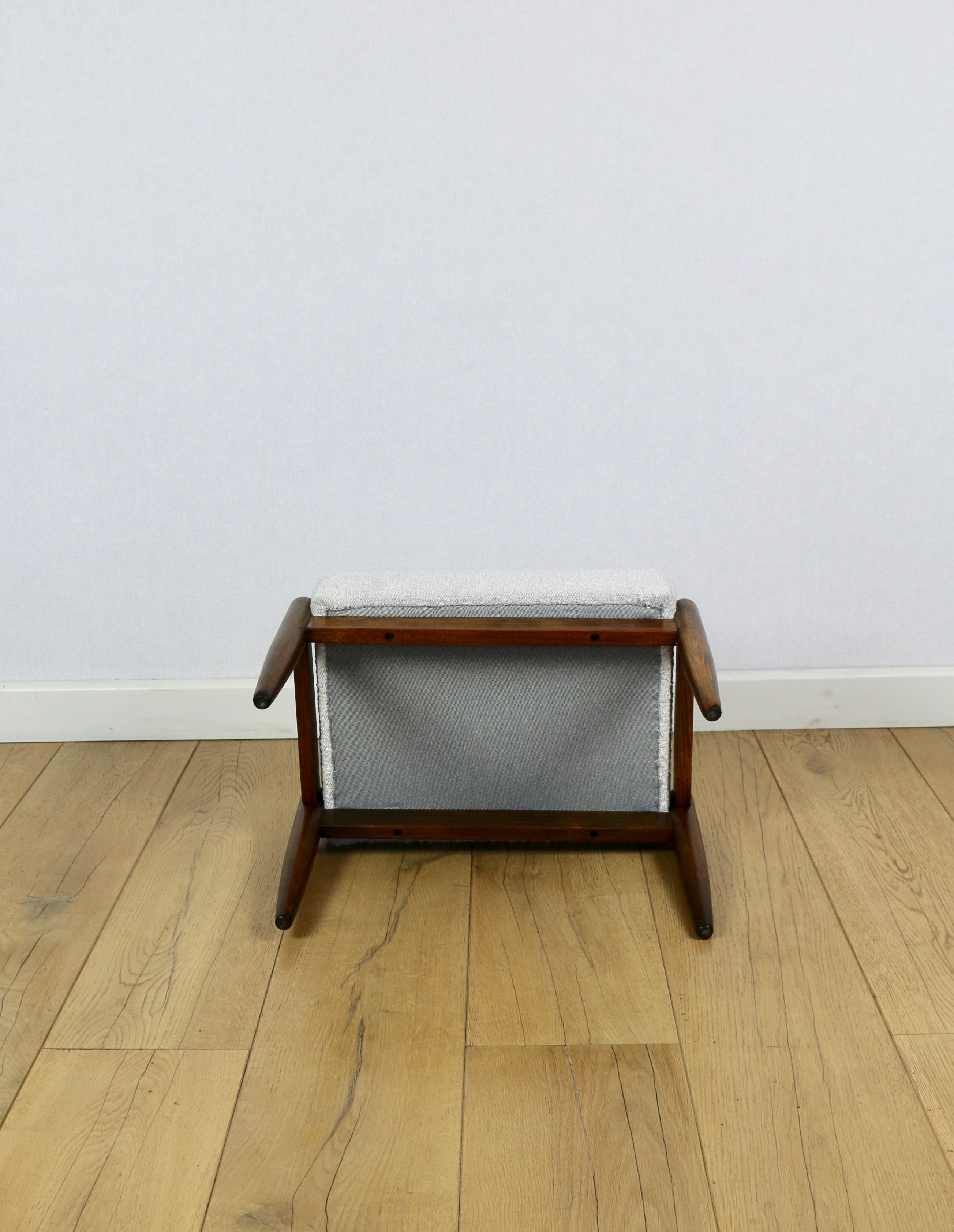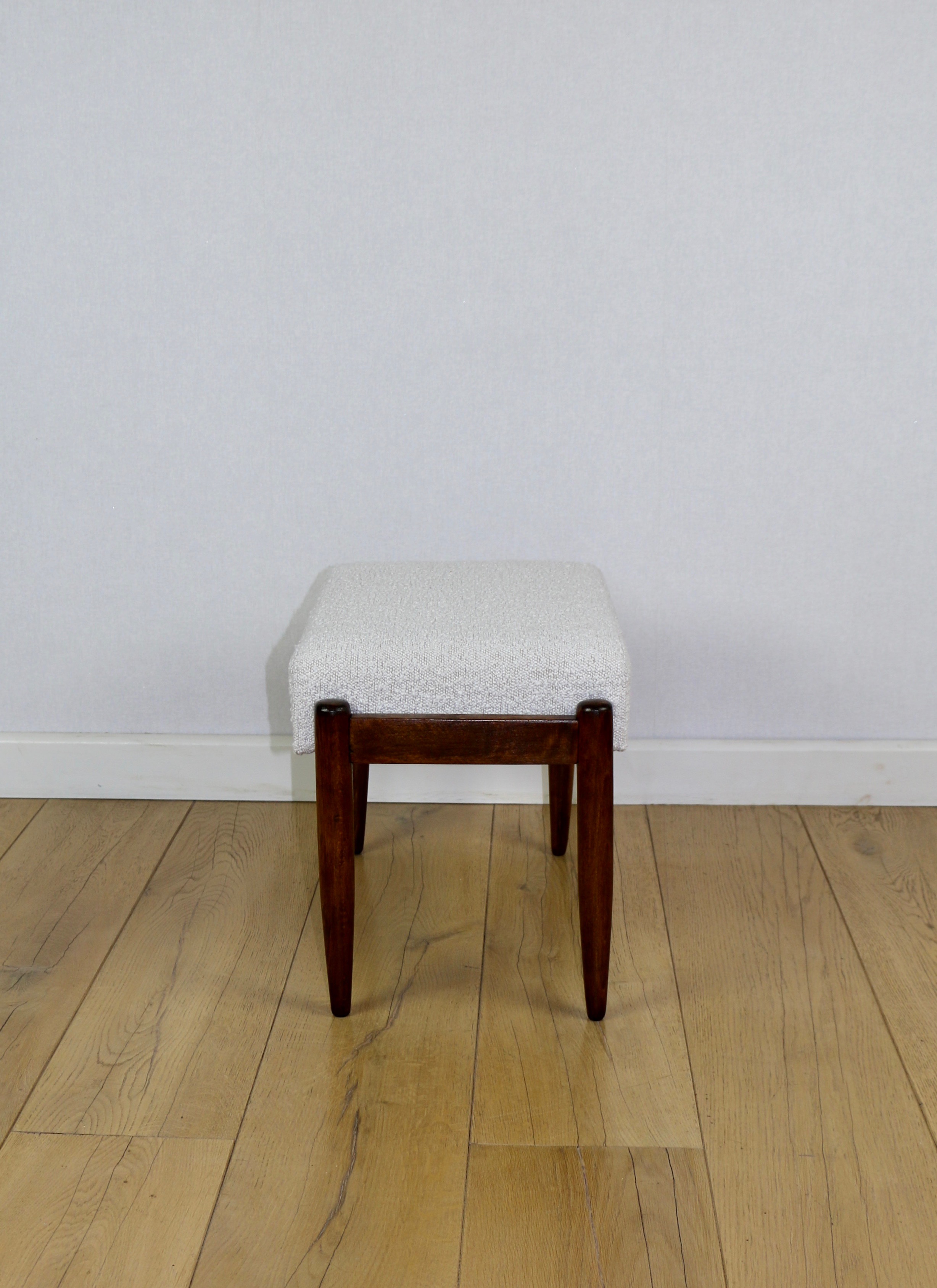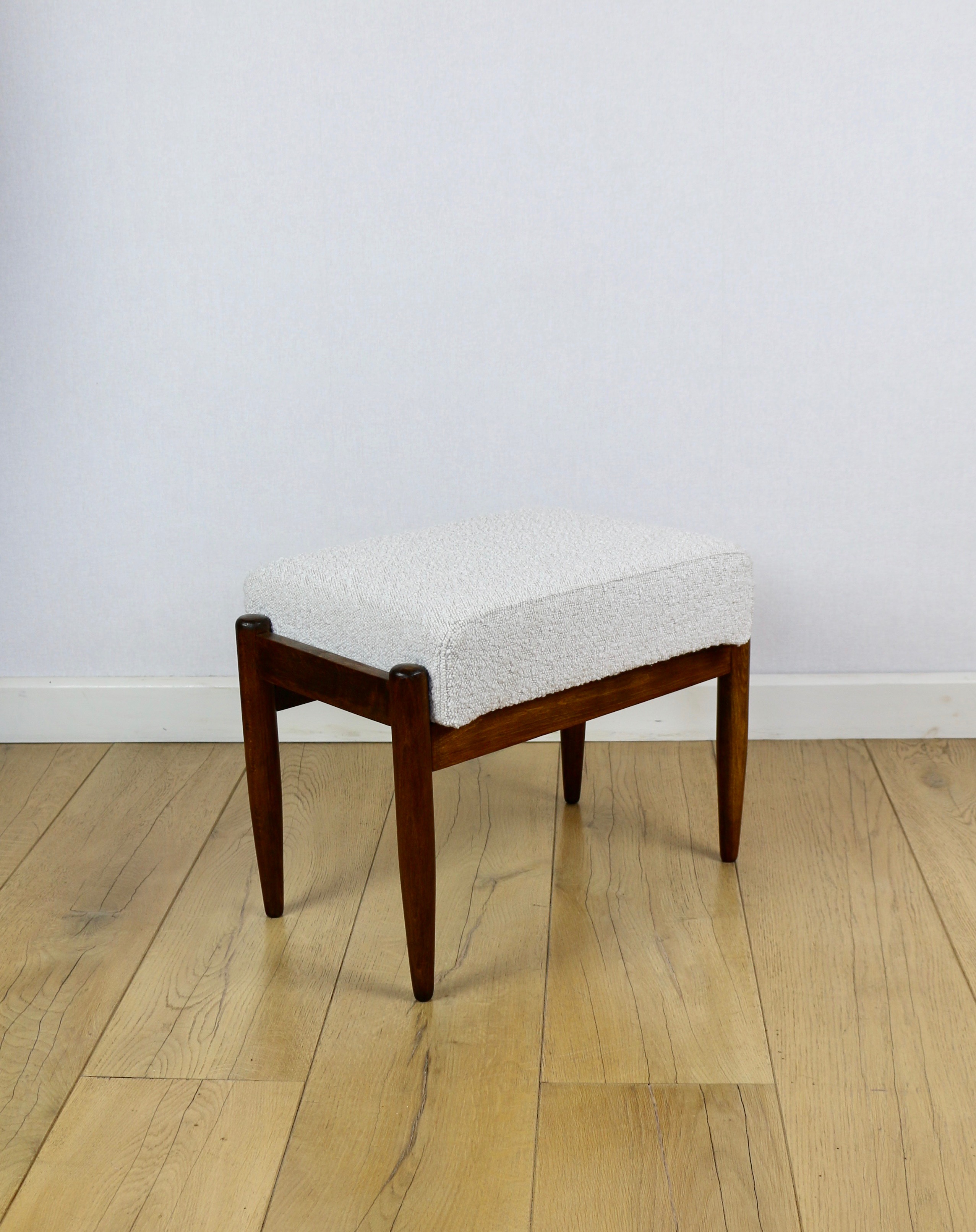 Taboret projektu Edmund Homa produkowany w lata 70tych. Całkowicie odnowiony, obicie w strukturalnej tkaninie z serii boucle w kolorze biało - kremowym ivory white cream. Nóżki drewniane w ciemnym kolorze - drewno bukowe.