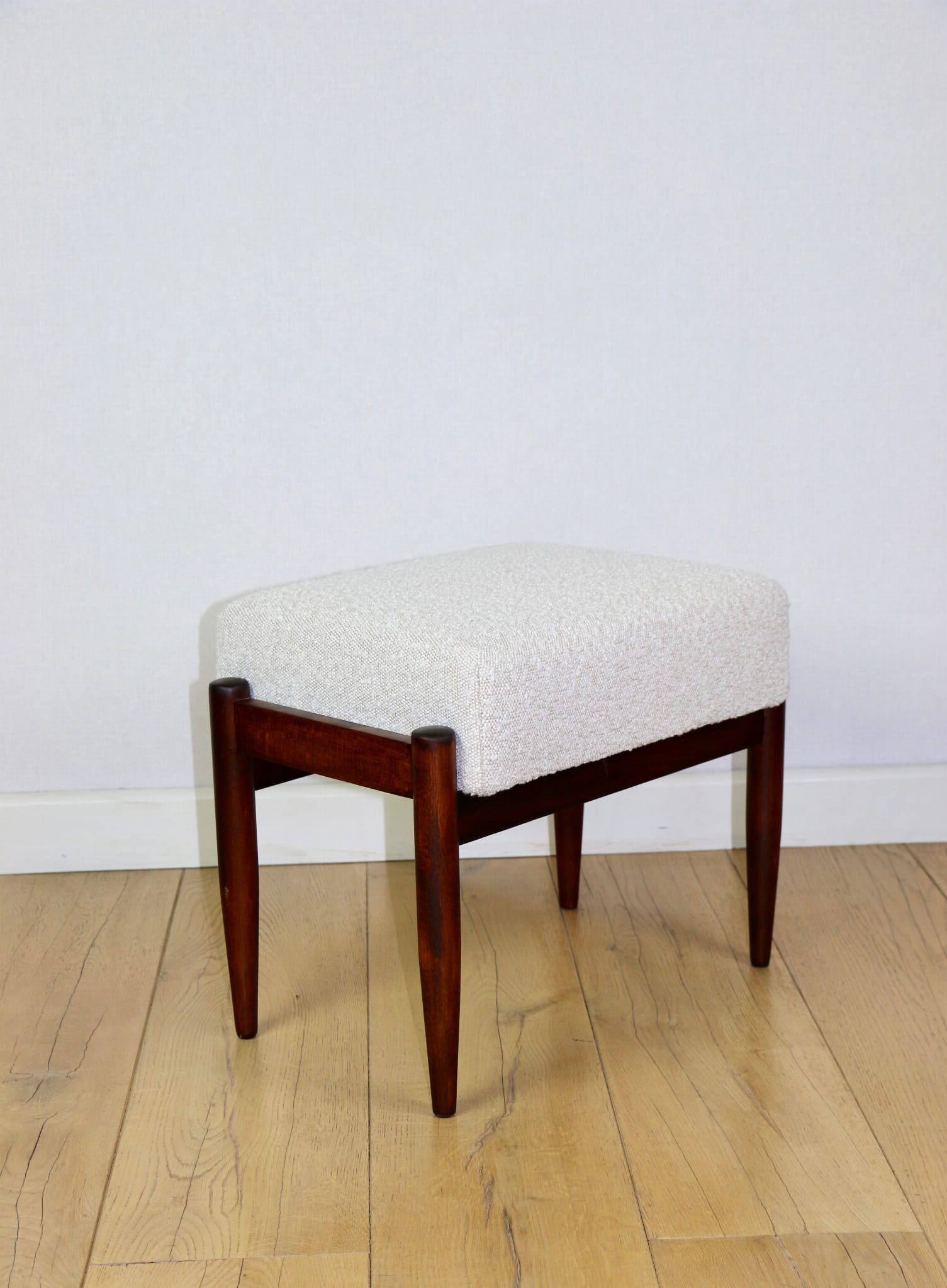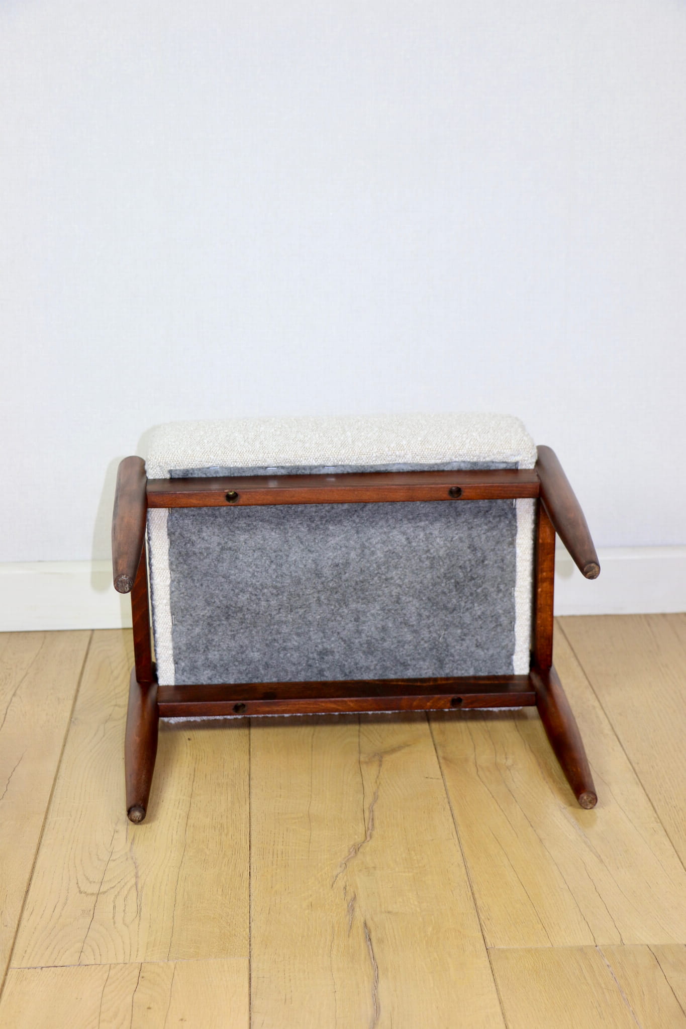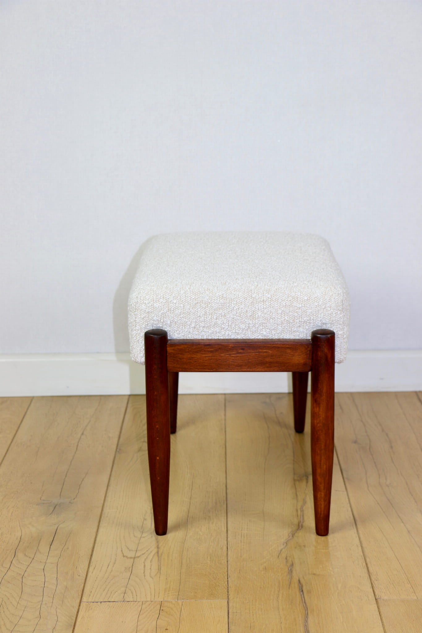 Taboret projektu Edmund Homa produkowany w lata 70tych. Całkowicie odnowiony, obicie w strukturalnej tkaninie z serii boucle w kolorze biało - kremowym ivory white. Nóżki drewniane w ciemnym kolorze - drewno bukowe.