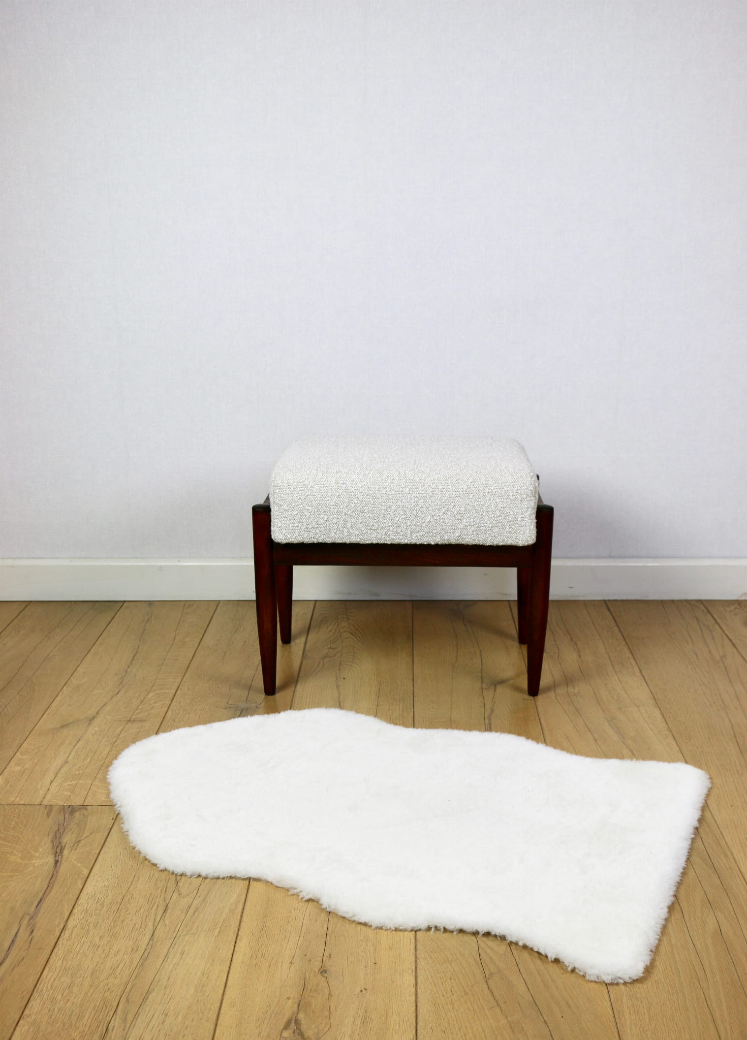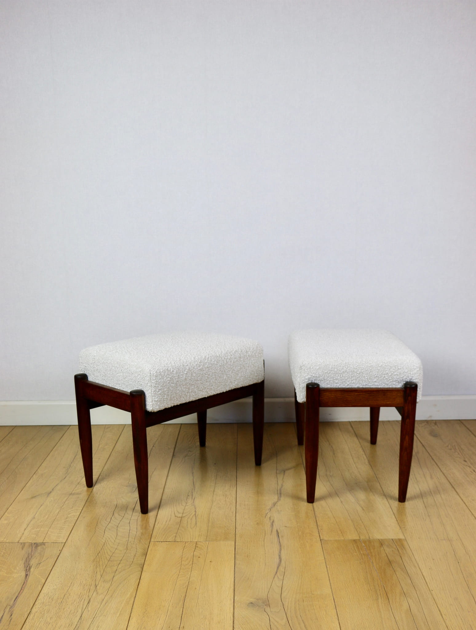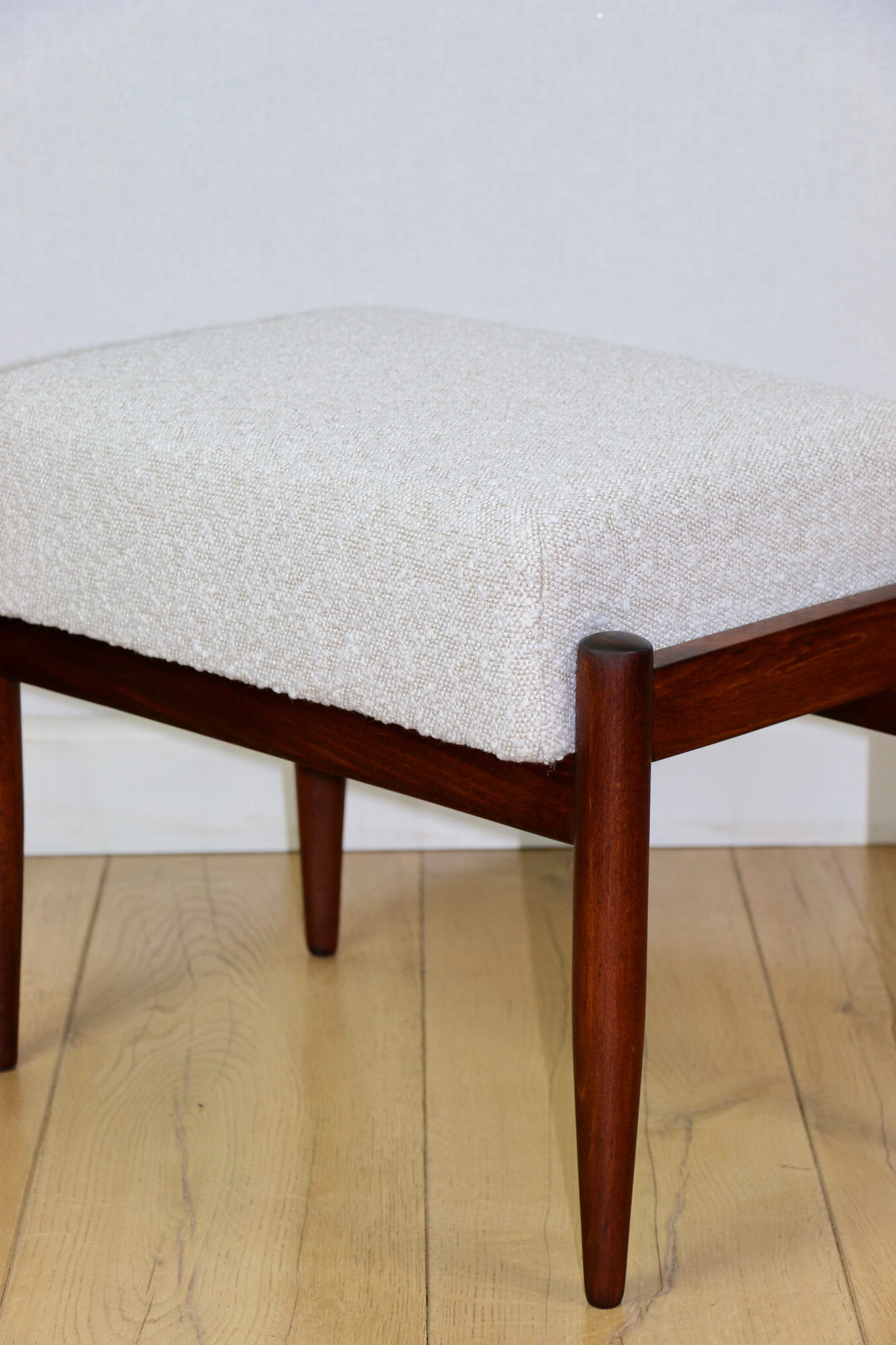 Taboret projektu Edmund Homa produkowany w lata 70tych. Całkowicie odnowiony, obicie w strukturalnej tkaninie z serii boucle w kolorze biało - kremowym ivory white. Nóżki drewniane w ciemnym kolorze - drewno bukowe.