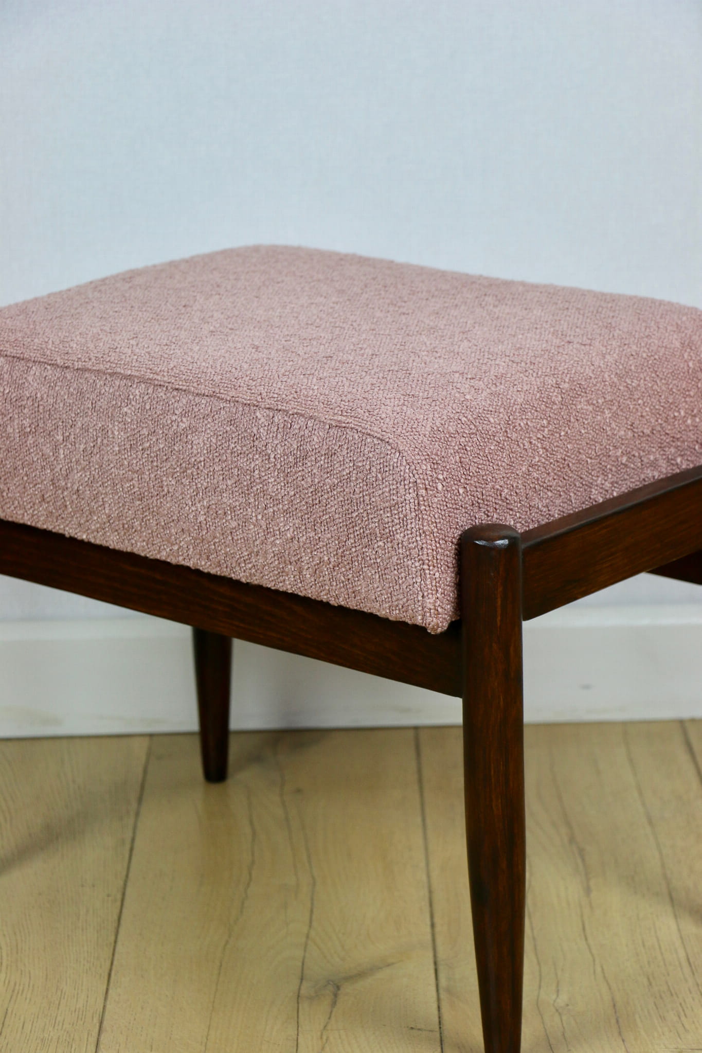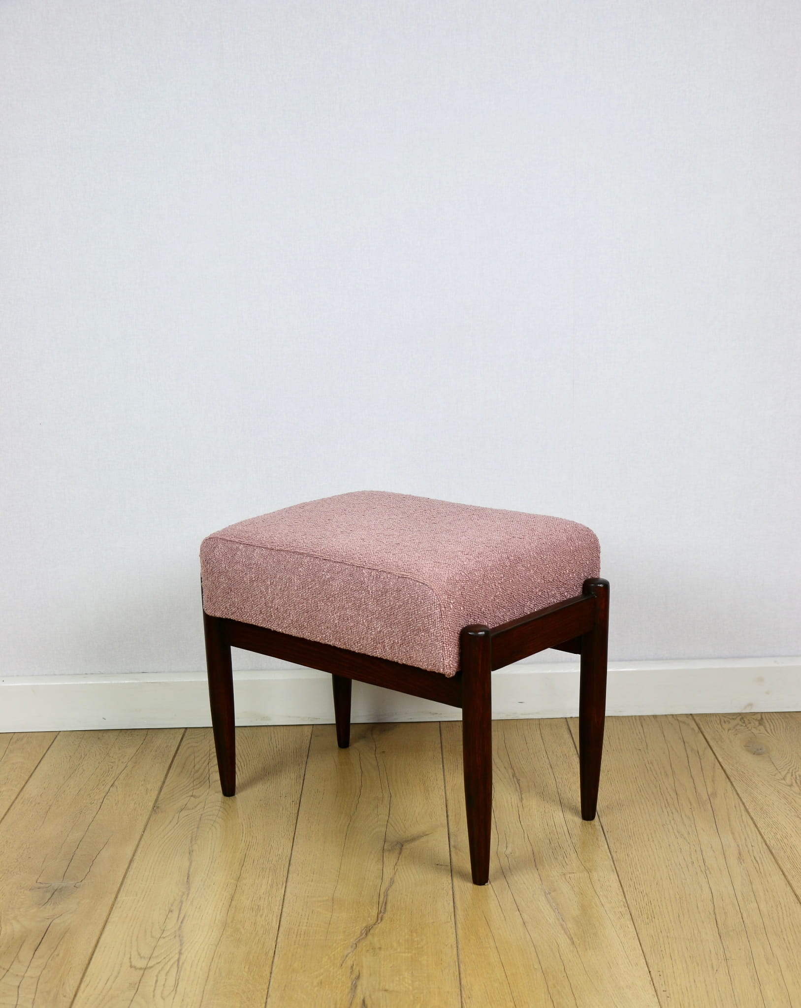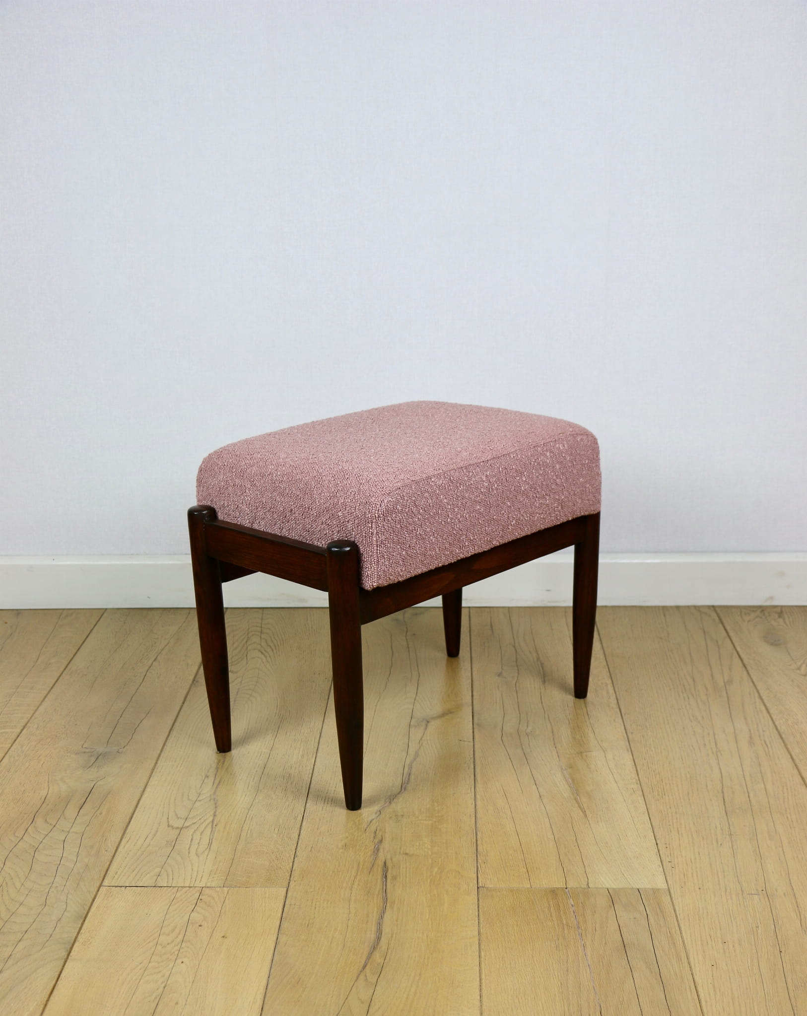 Taboret projektu Edmund Homa produkowany w lata 70tych. Całkowicie odnowiony, obicie w strukturalnej tkaninie z serii boucle w kolorze różowym. Nóżki drewniane w naturalnym kolorze woskowane - drewno bukowe.