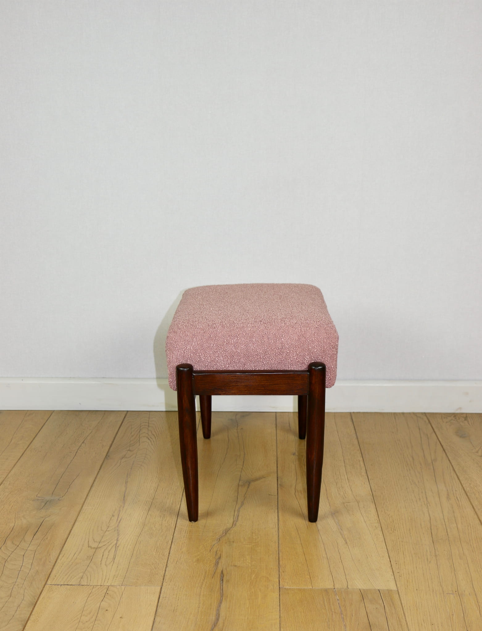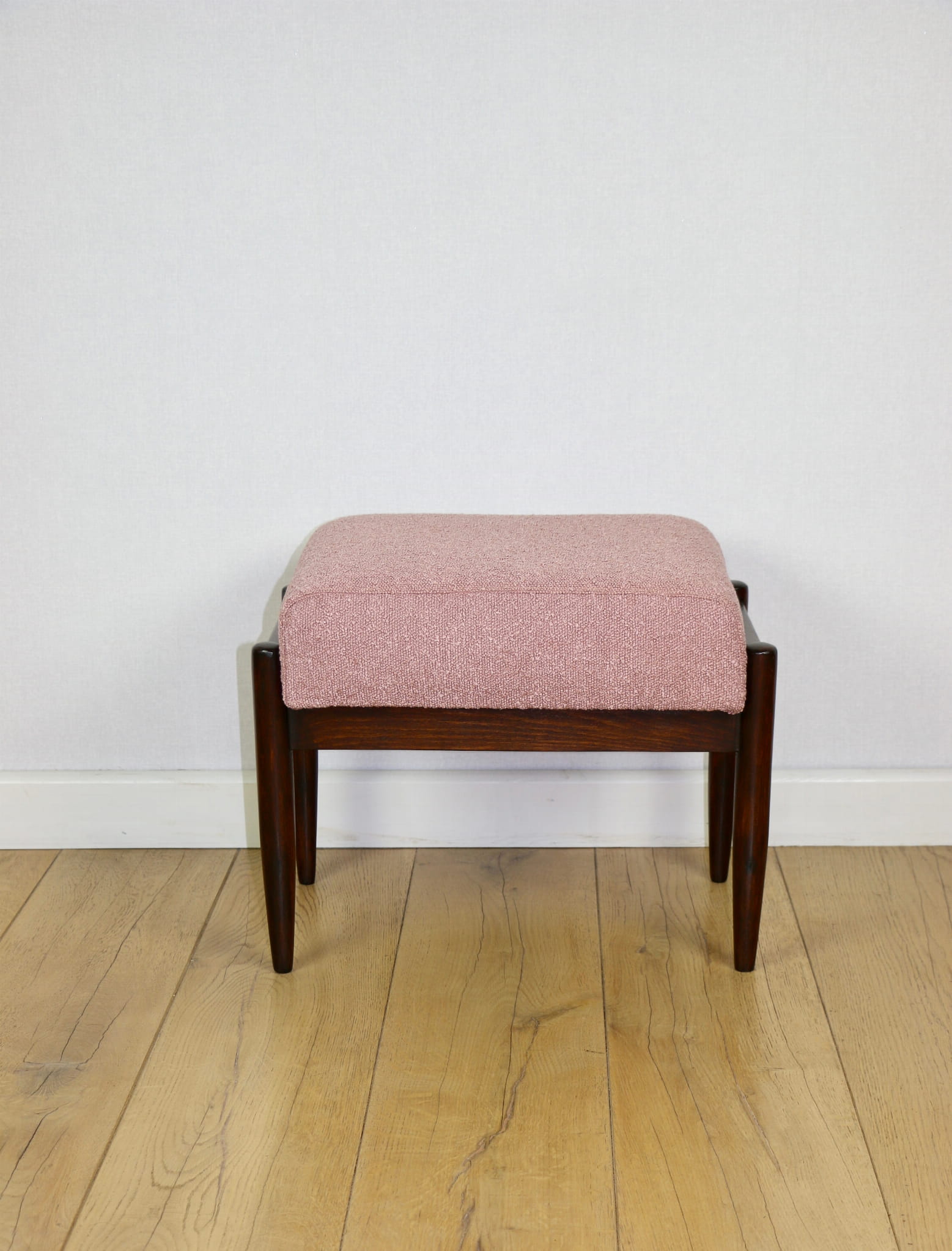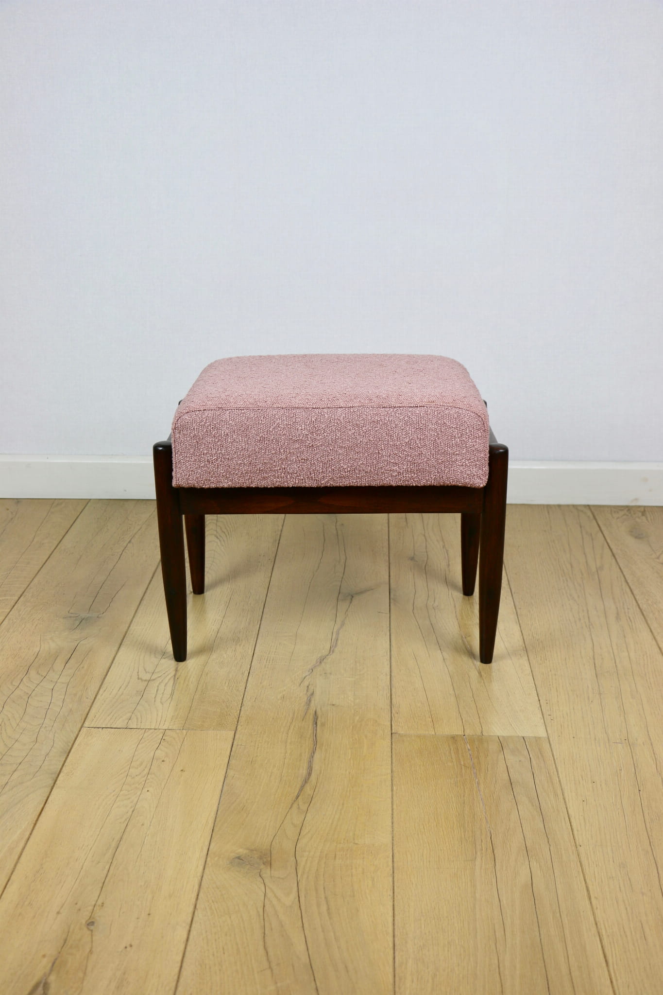 Taboret projektu Edmund Homa produkowany w lata 70tych. Całkowicie odnowiony, obicie w strukturalnej tkaninie z serii boucle w kolorze różowym. Nóżki drewniane w naturalnym kolorze woskowane - drewno bukowe.
