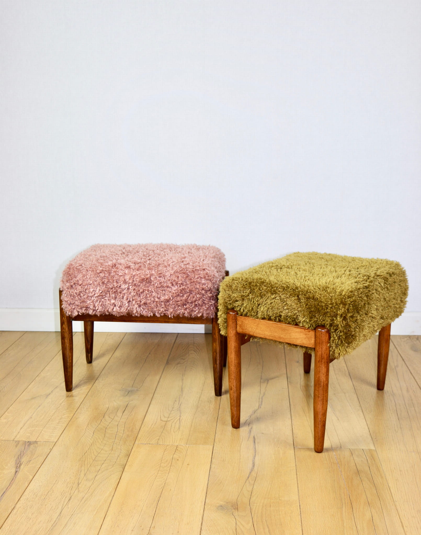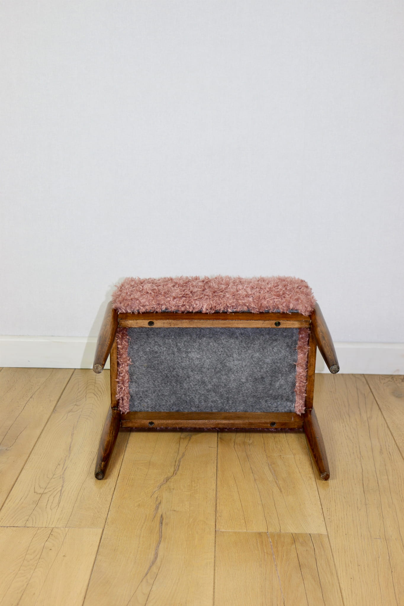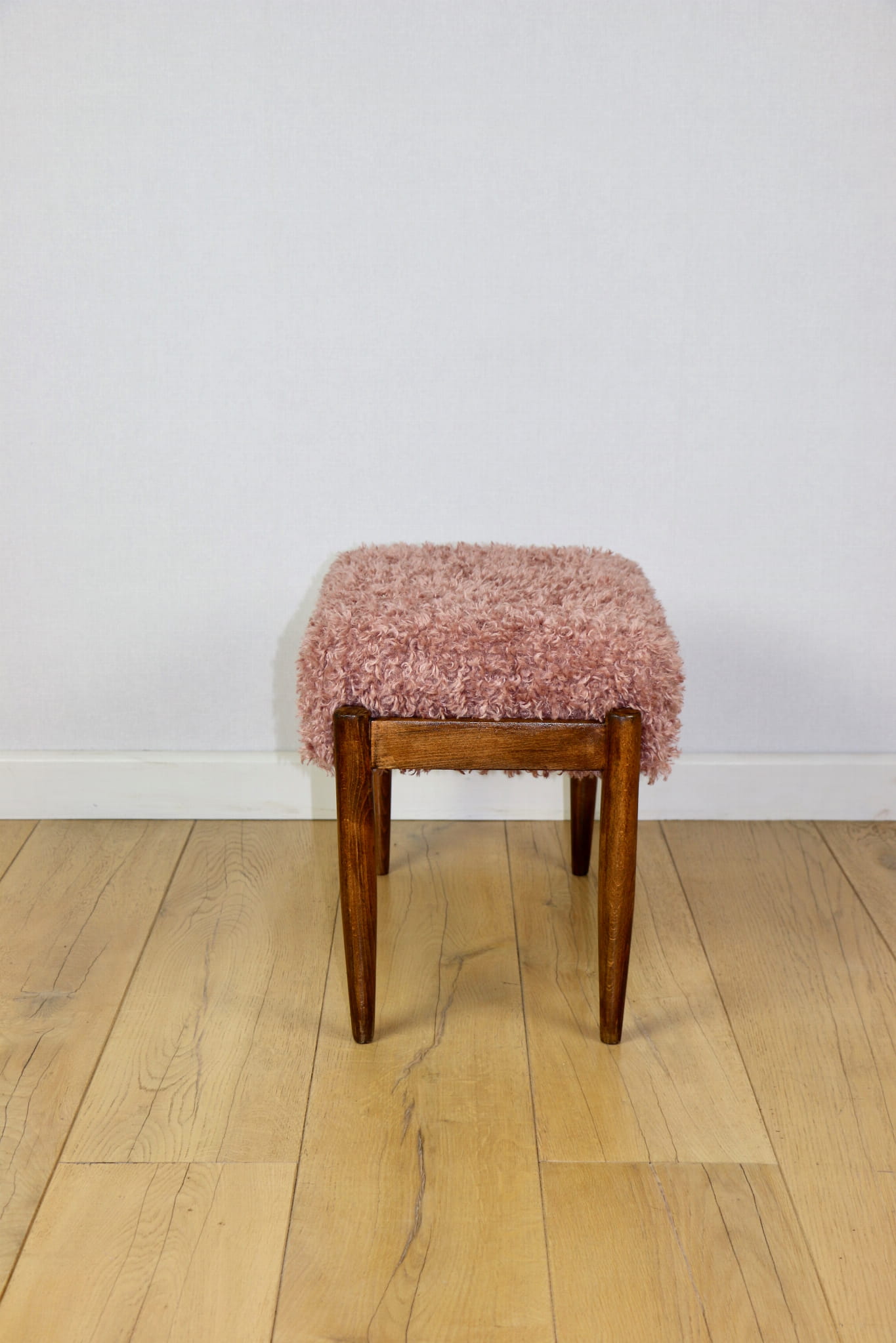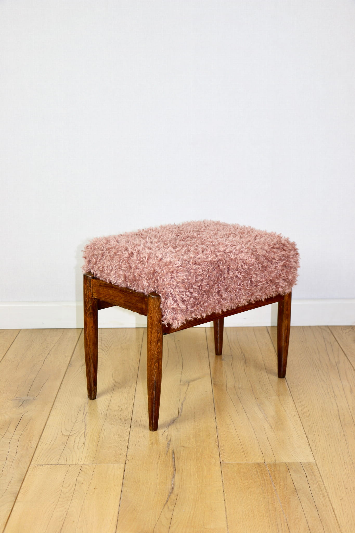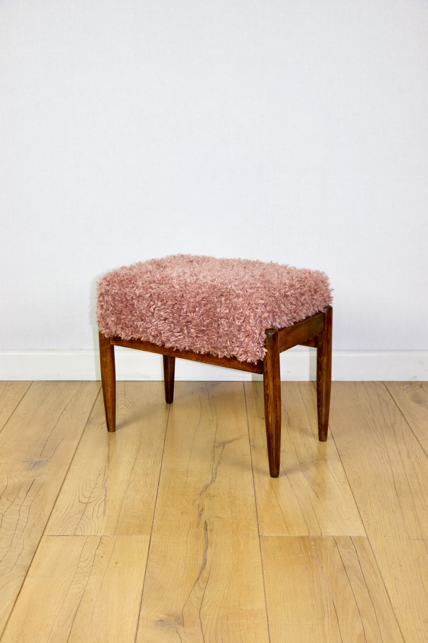 Taboret projektu Edmund Homa produkowany w lata 70tych. Całkowicie odnowiony, obicie w strukturalnej tkaninie z serii długie i miękkie włosie w kolorze różowym. Nóżki drewniane w ciemnym naturalnym kolorze - woskowane - drewno bukowe.