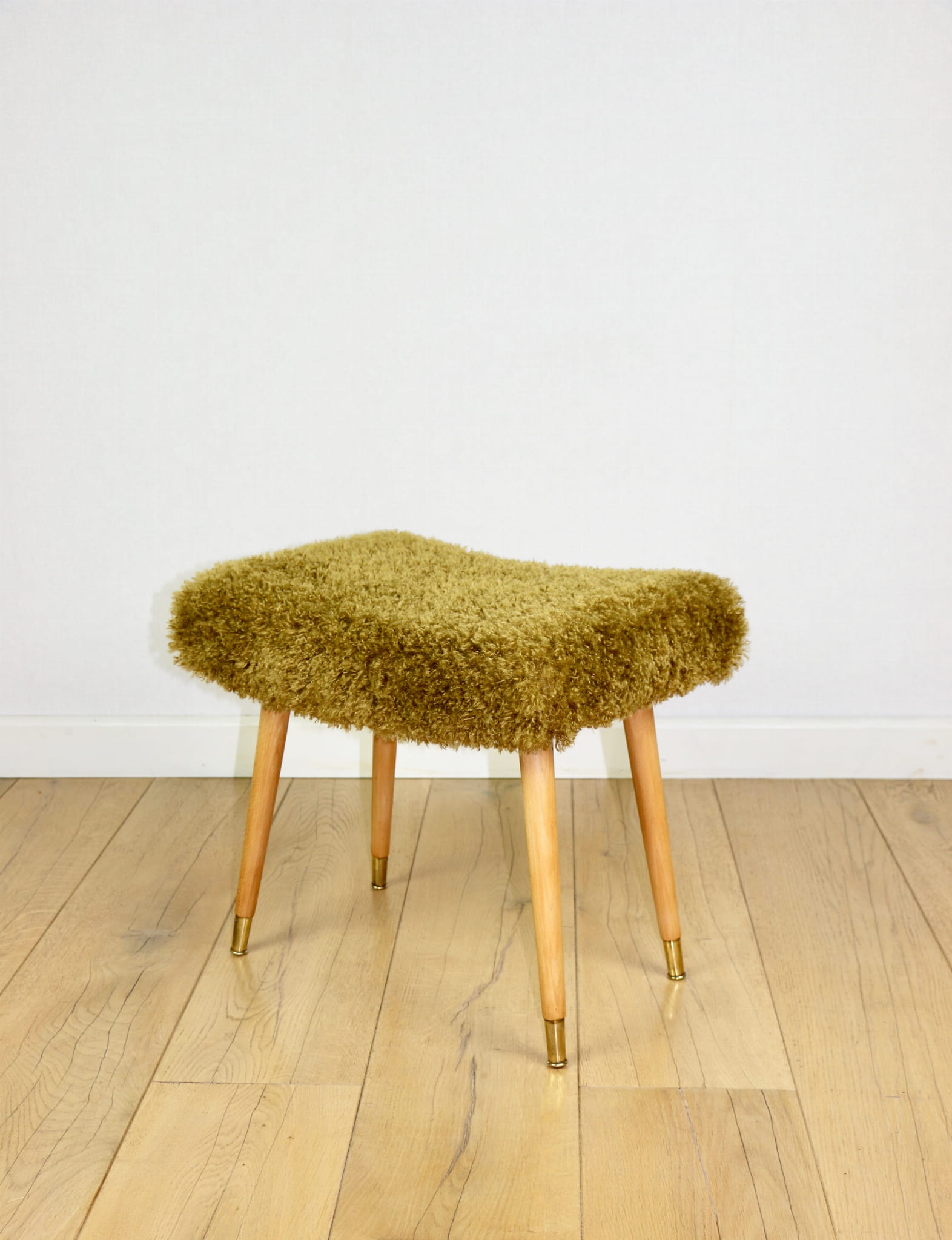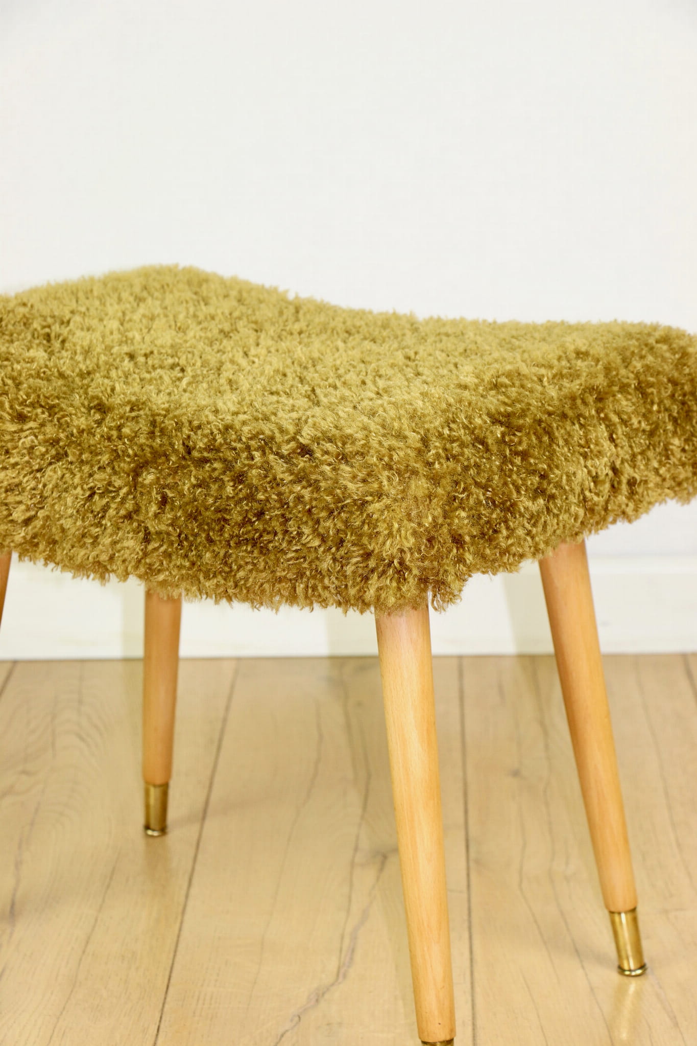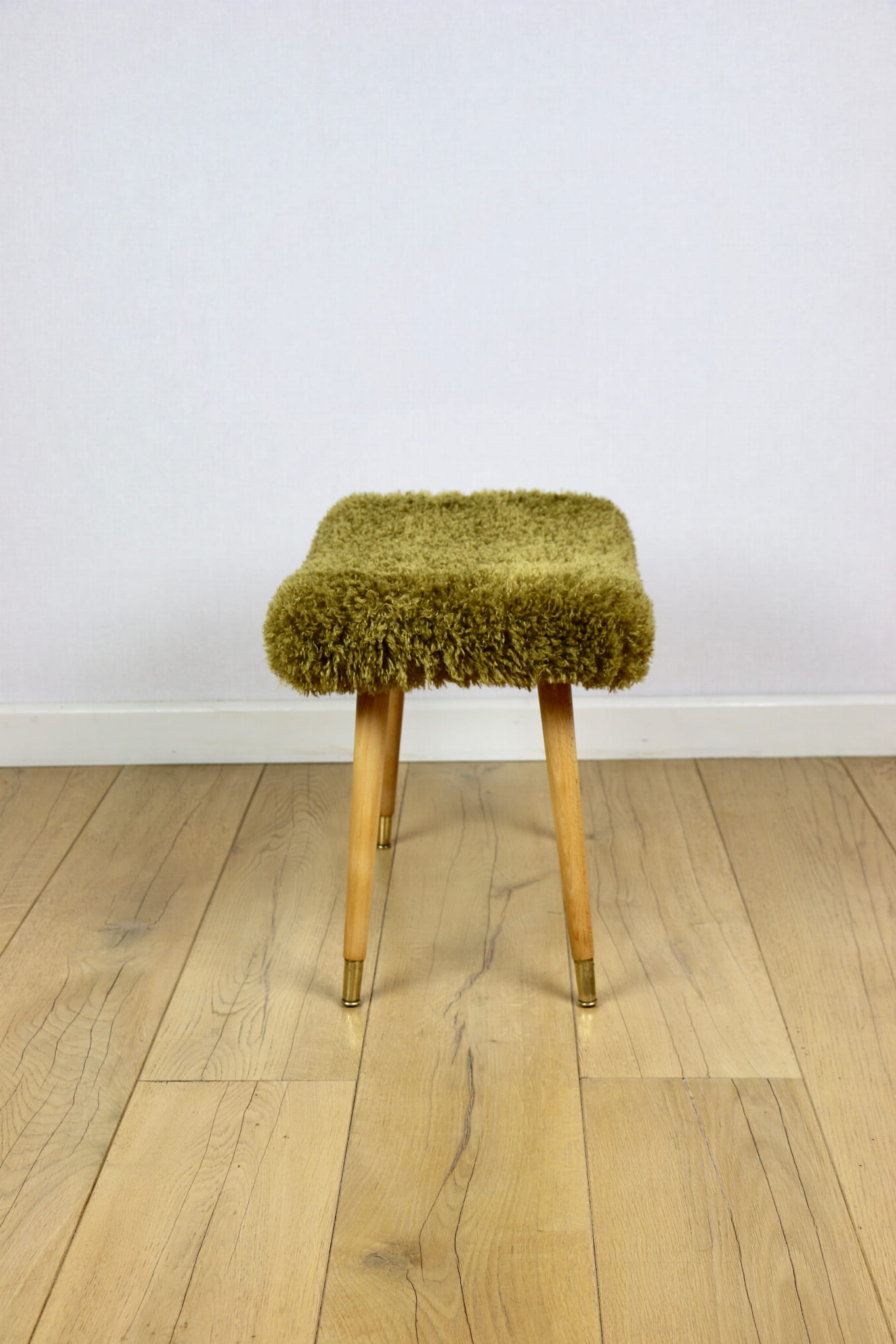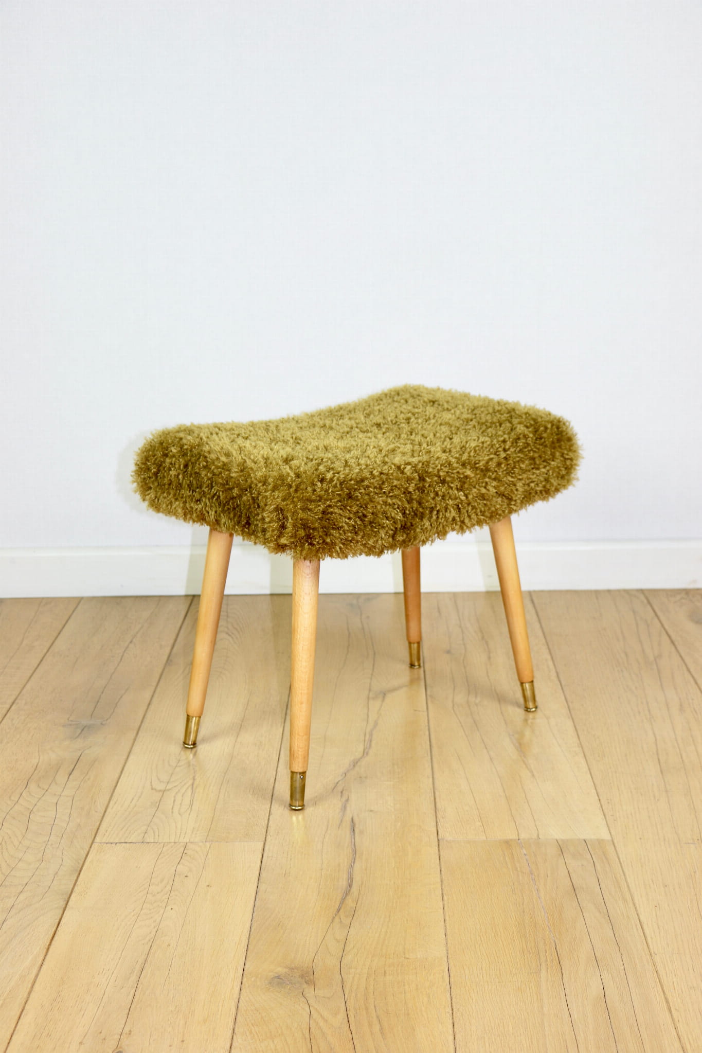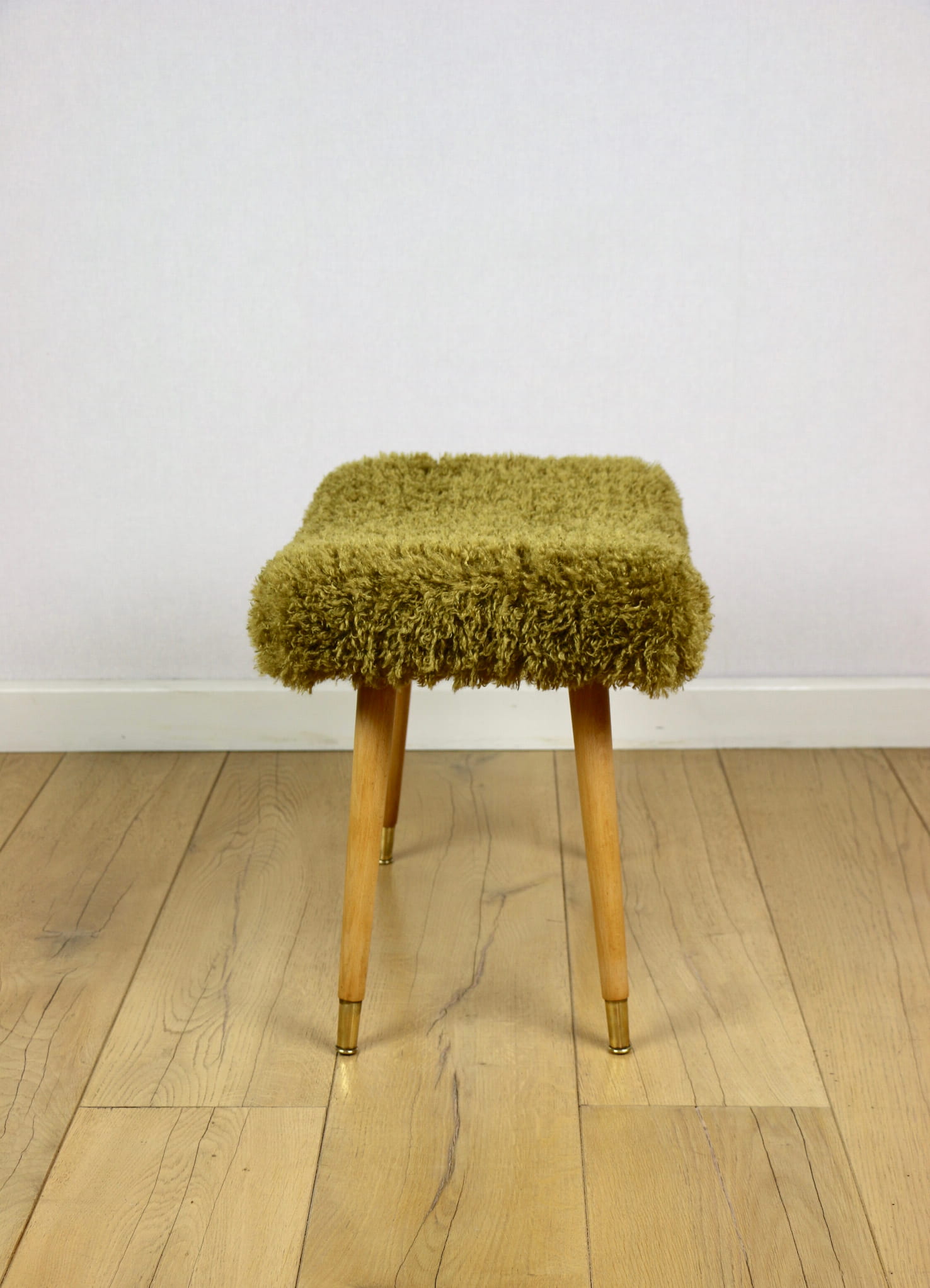 Taboret projektu Edmund Homa produkowany w lata 70tych. Całkowicie odnowiony, obicie w strukturalnej tkaninie z serii długie i miękkie włosie w kolorze khaki/ oliwkowym. Nóżki drewniane w naturalnym kolorze - woskowane - drewno bukowe zakończone złotymi elementami ozdobnymi na stopce