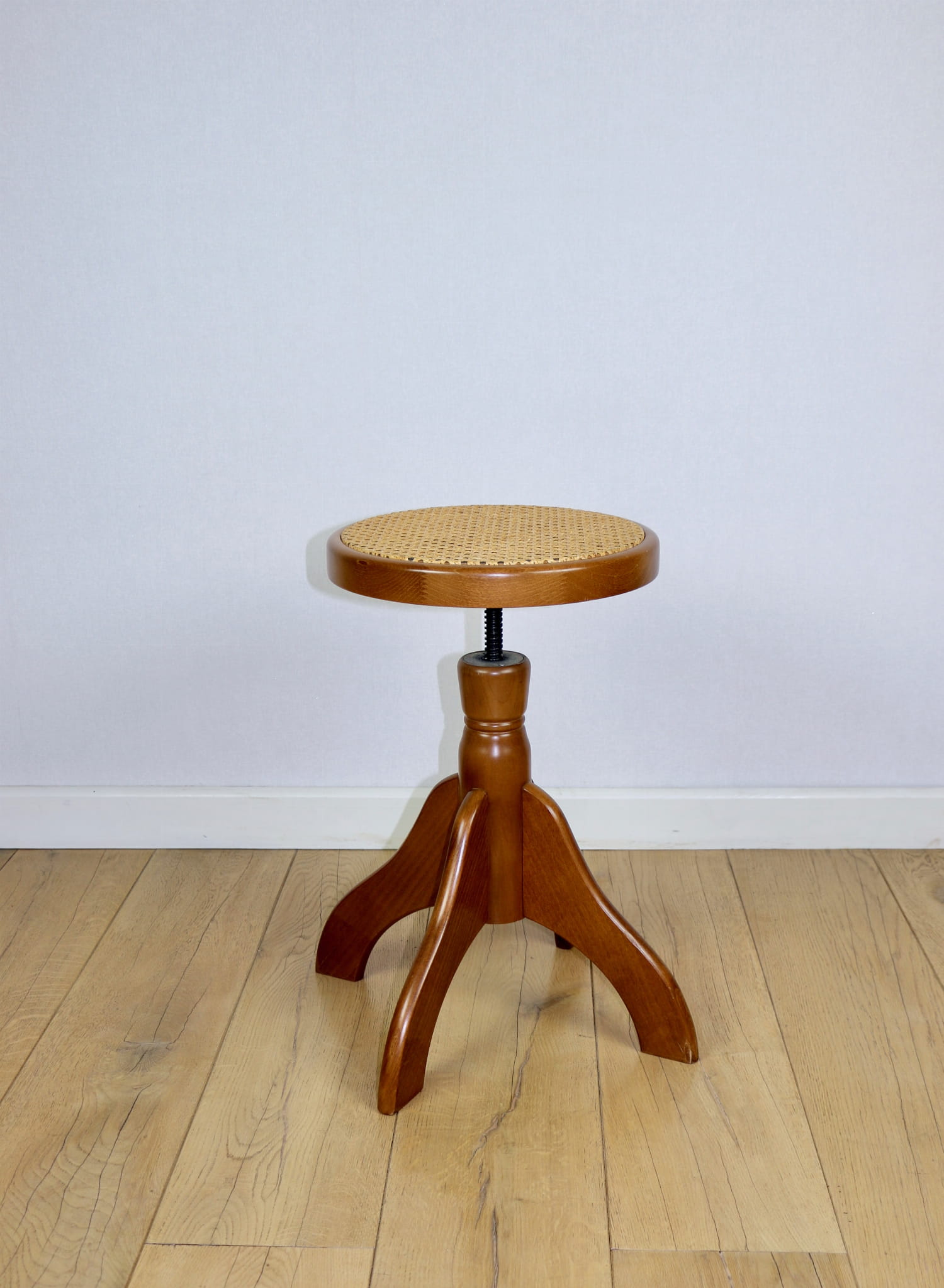 Taboret regulowany okrągły, stołek lata 80, Vintage, PRL, siedzisko z rafii do pianina